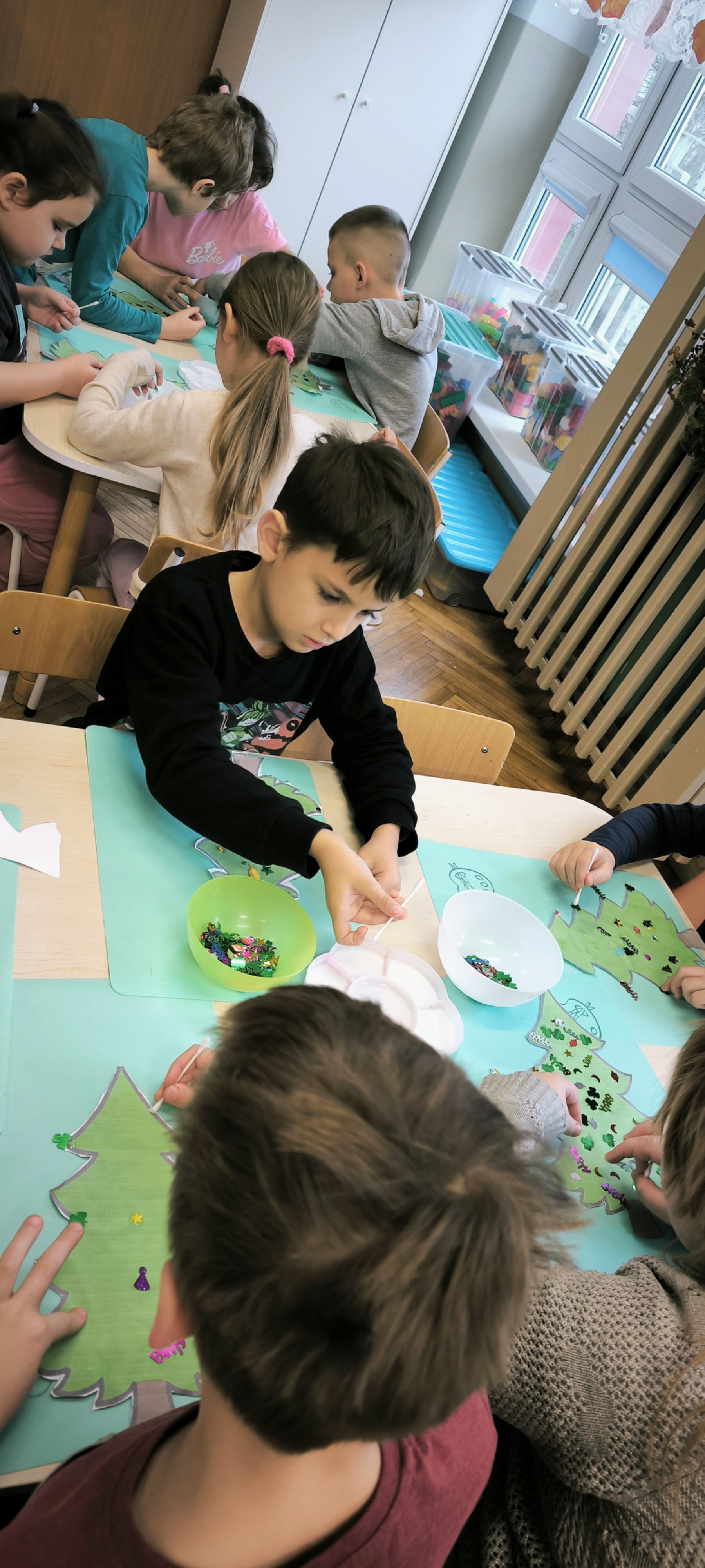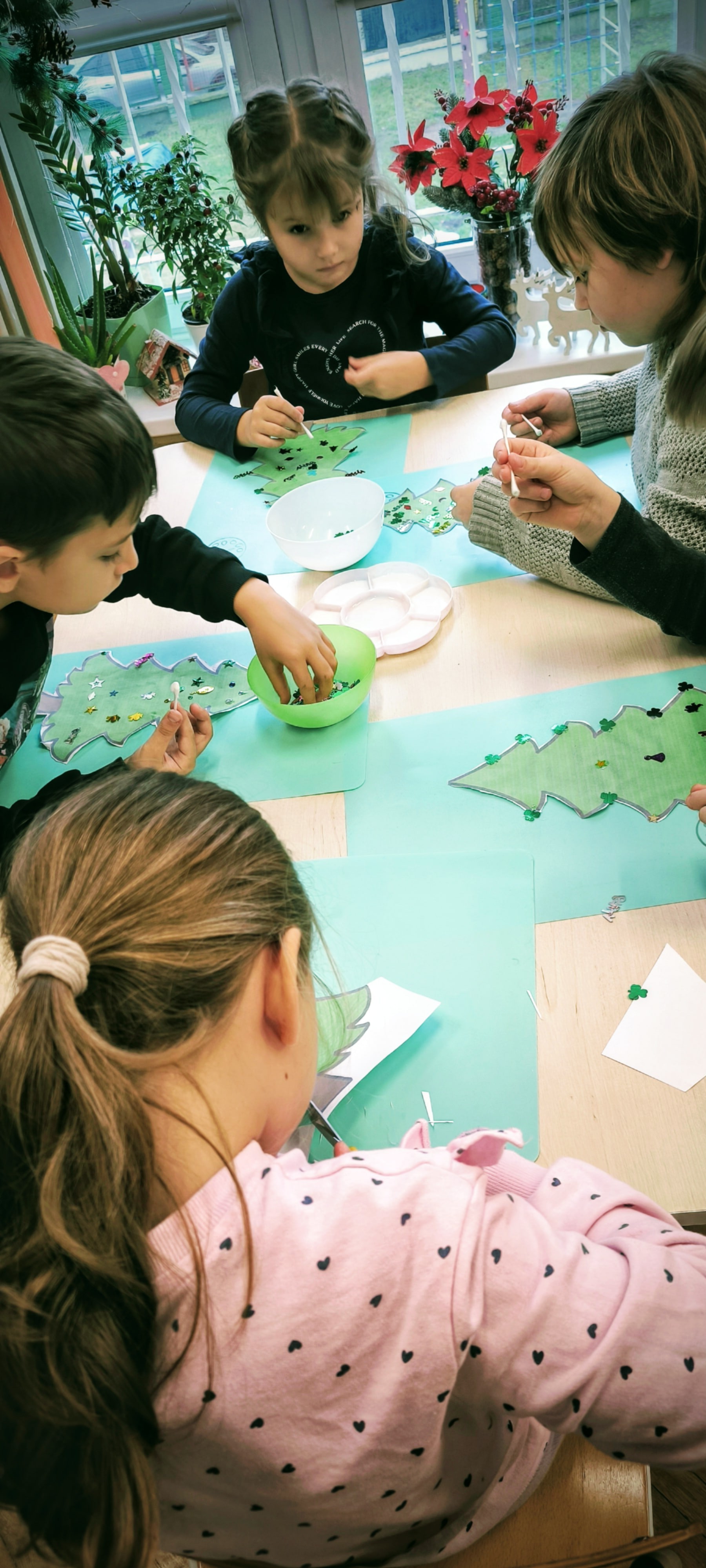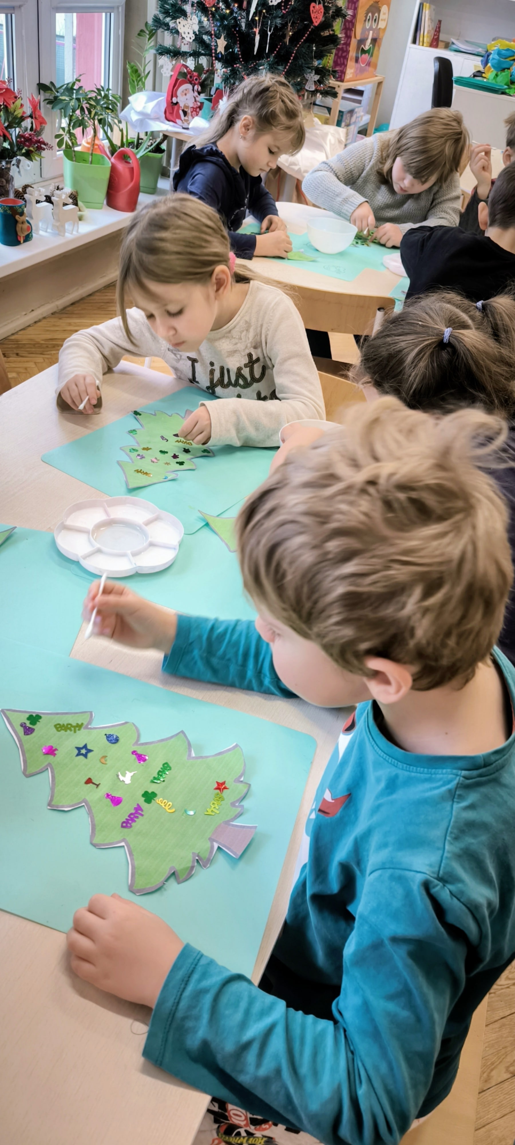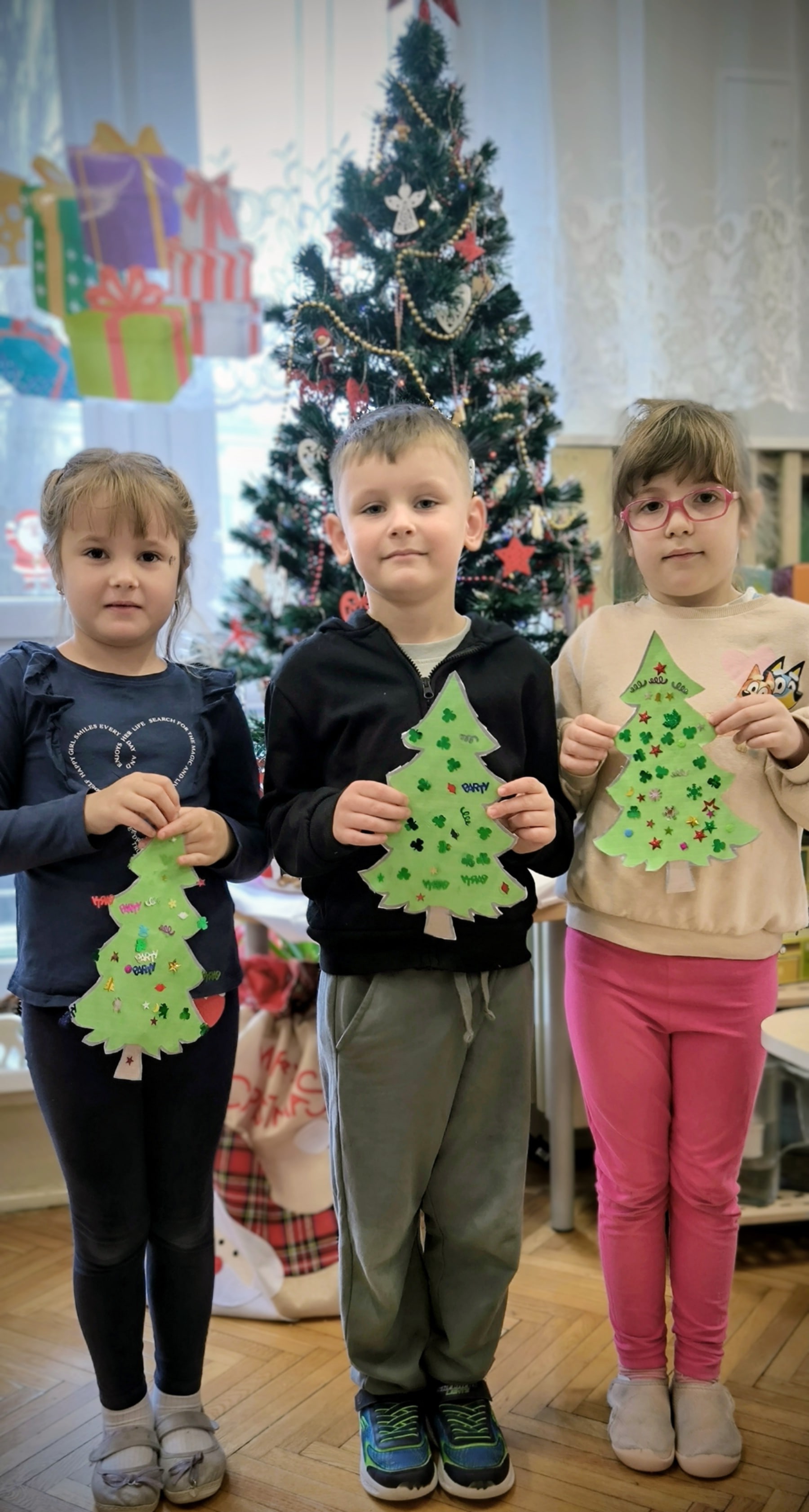 "Zielona choinka do nas zawitała. Święta się zbliżają, przystroić się chciała. Zrobimy ozdoby, ubierzemy drzewko, niech będzie wesoło, chodźcie dzieci prędko!!! Weźmiemy cekiny różnokolorowe, raz,dwa i bombeczki w mig będą gotowe!!!" Kreatywne choinki samodzielnie wycięte i udekorowane cekinami według indywidualnych pomysłów starszaków.