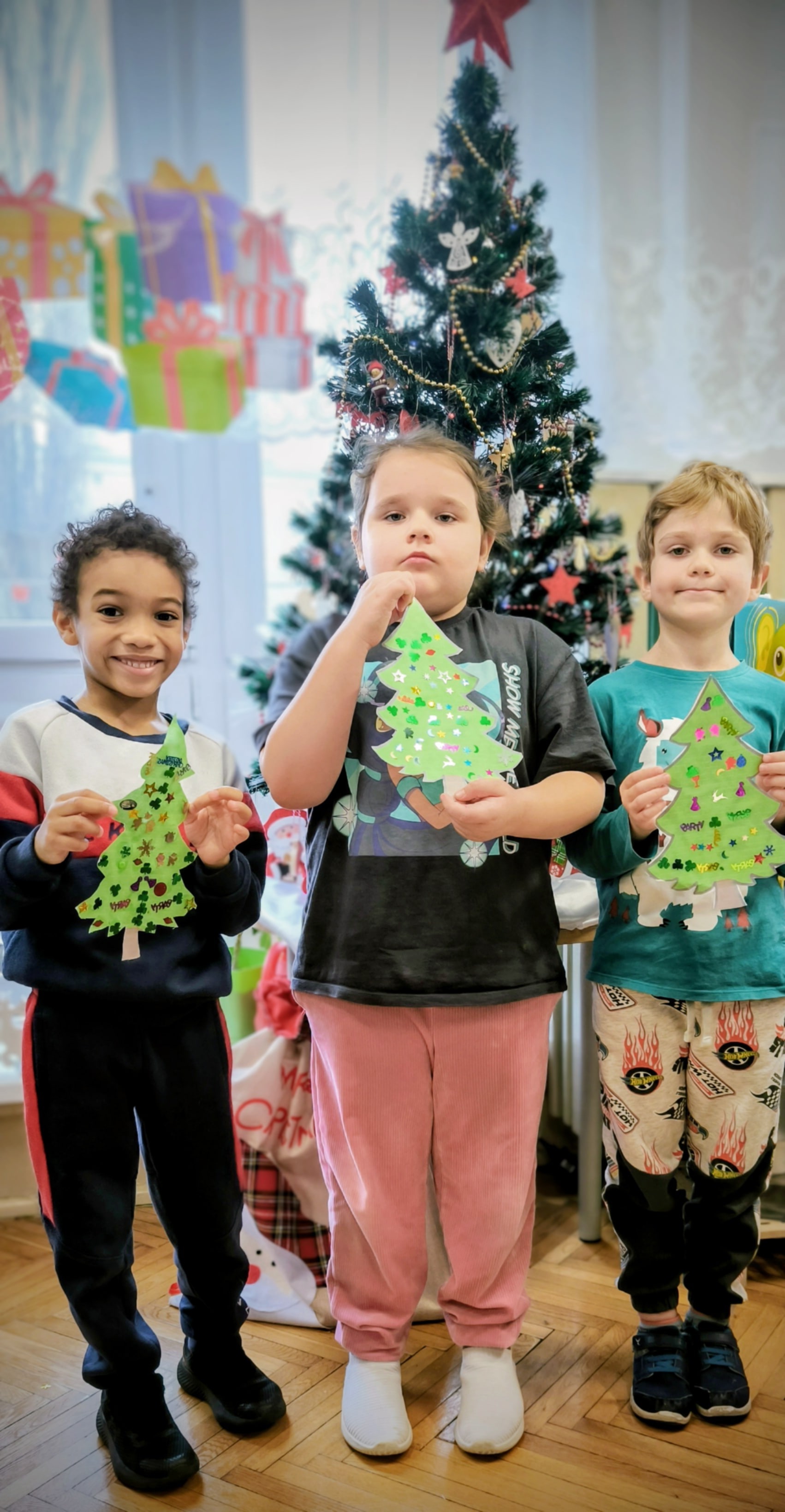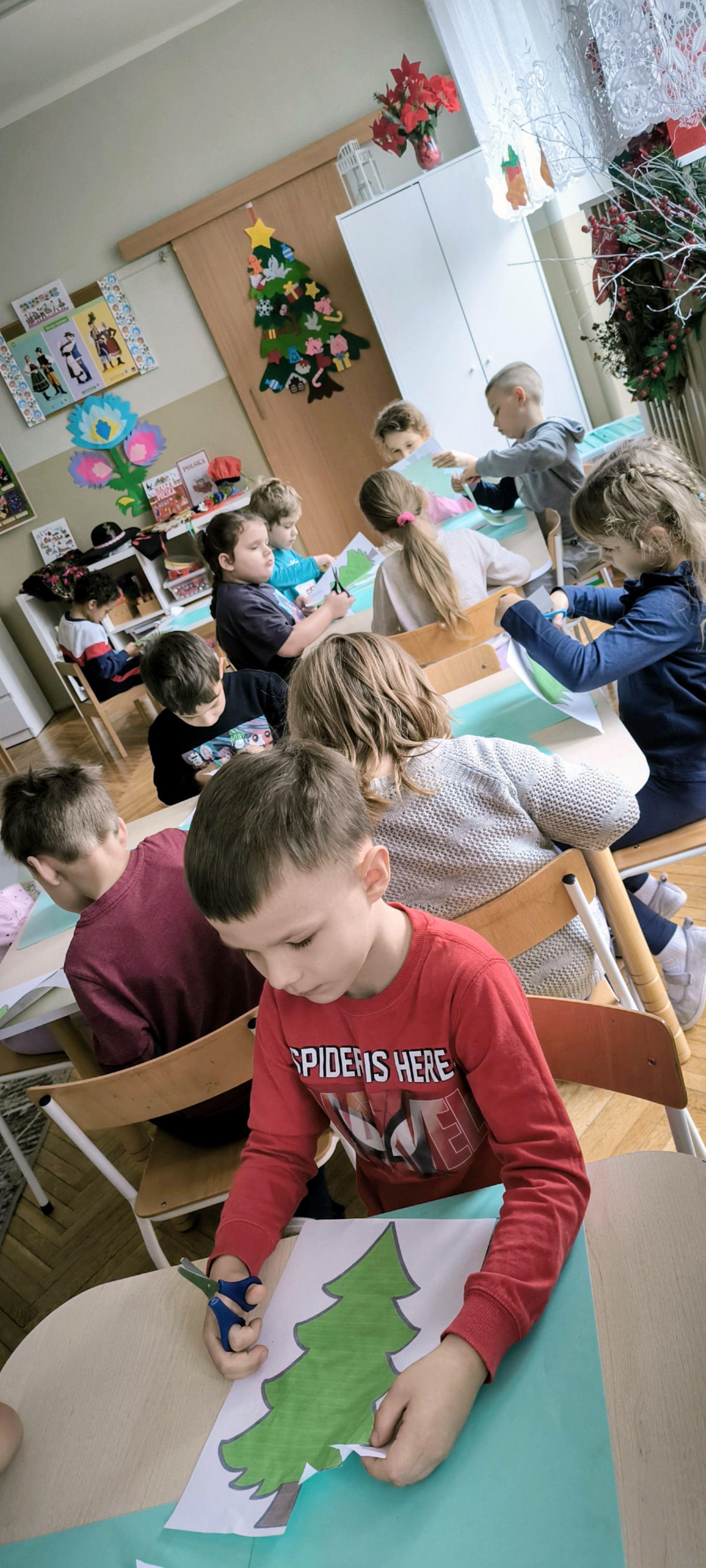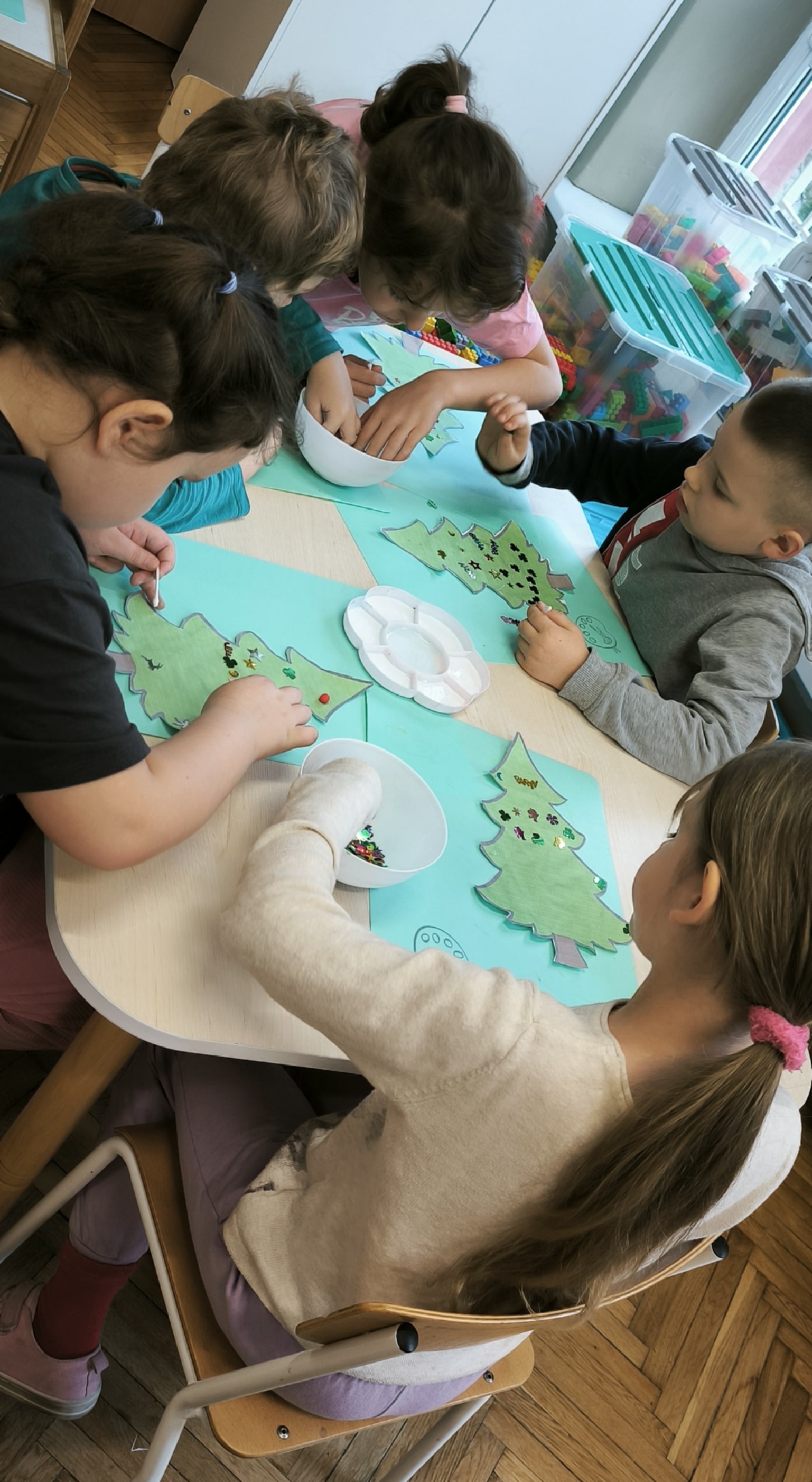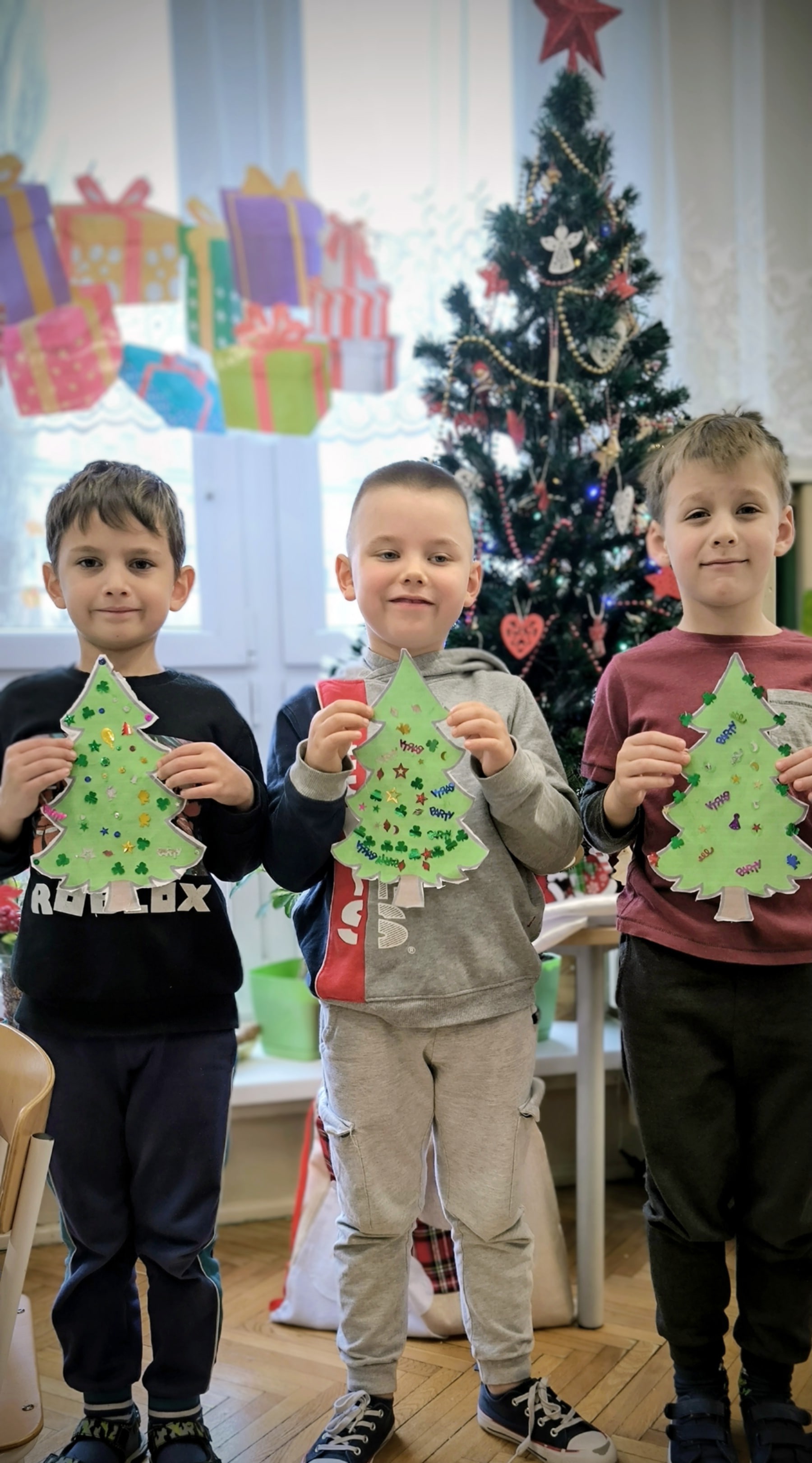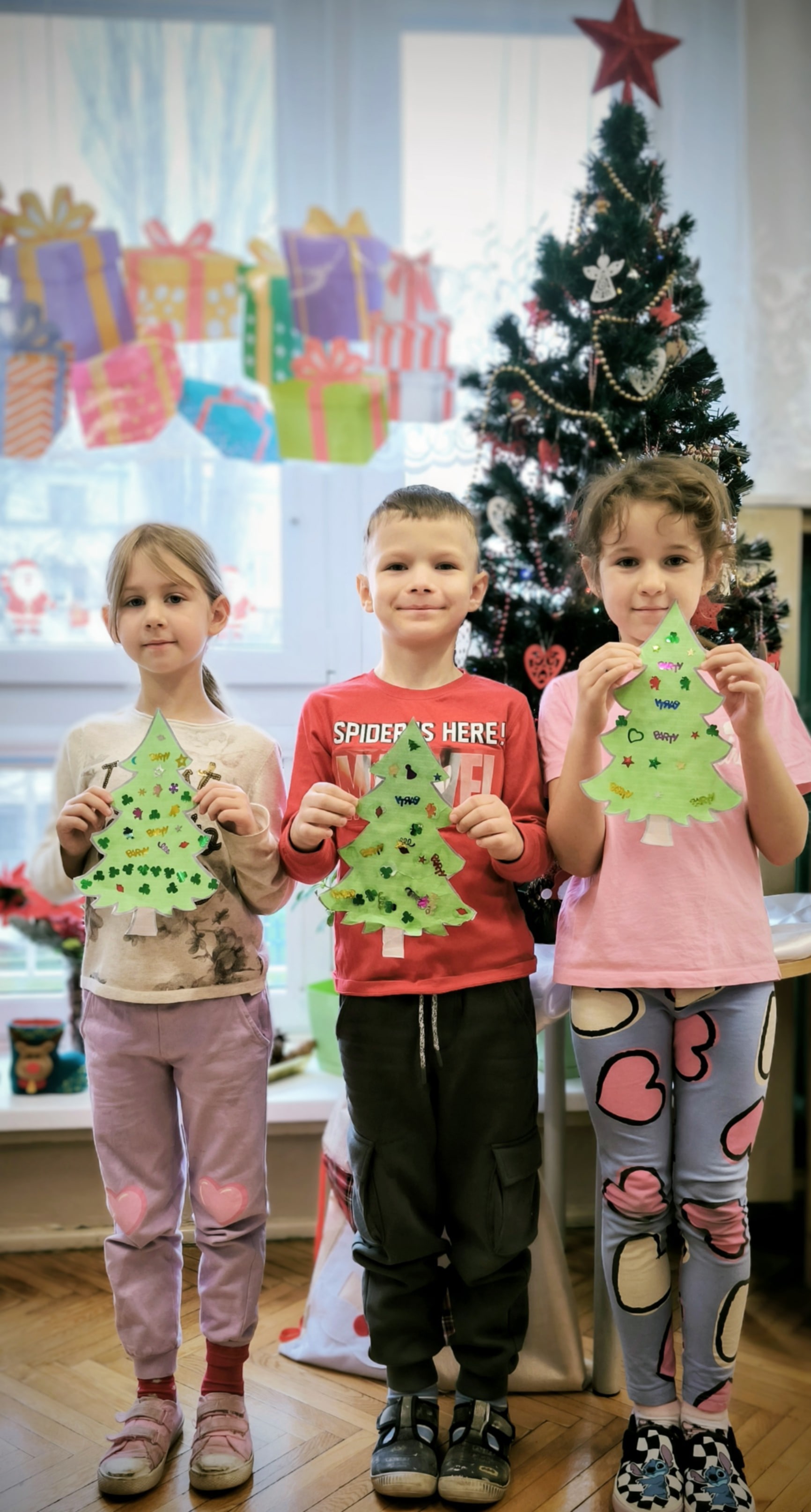 "Zielona choinka do nas zawitała. Święta się zbliżają, przystroić się chciała. Zrobimy ozdoby, ubierzemy drzewko, niech będzie wesoło, chodźcie dzieci prędko!!! Weźmiemy cekiny różnokolorowe, raz,dwa i bombeczki w mig będą gotowe!!!" Kreatywne choinki samodzielnie wycięte i udekorowane cekinami według indywidualnych pomysłów starszaków.