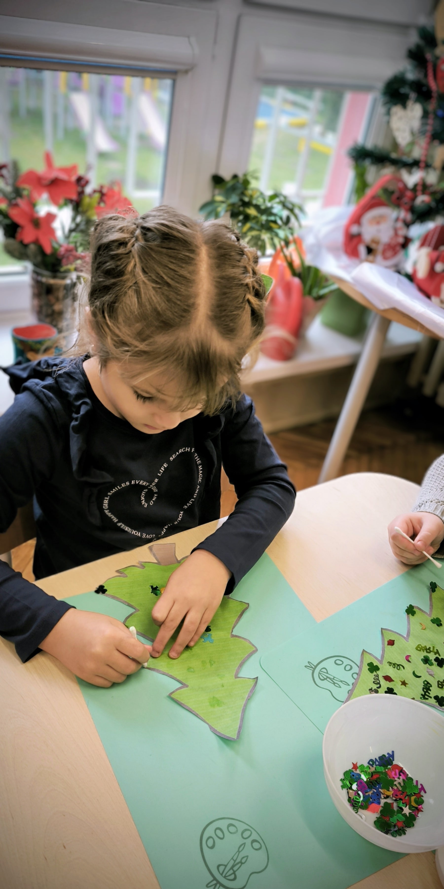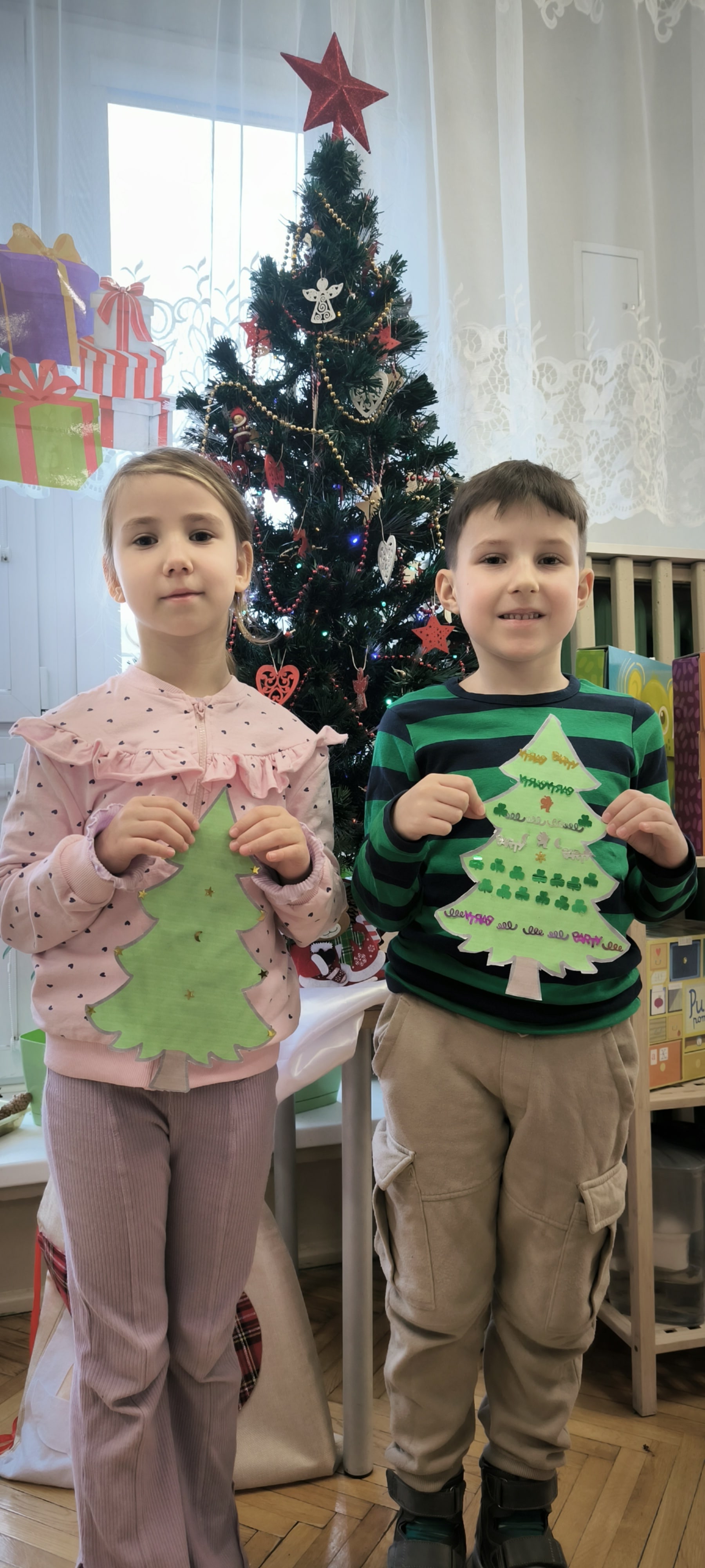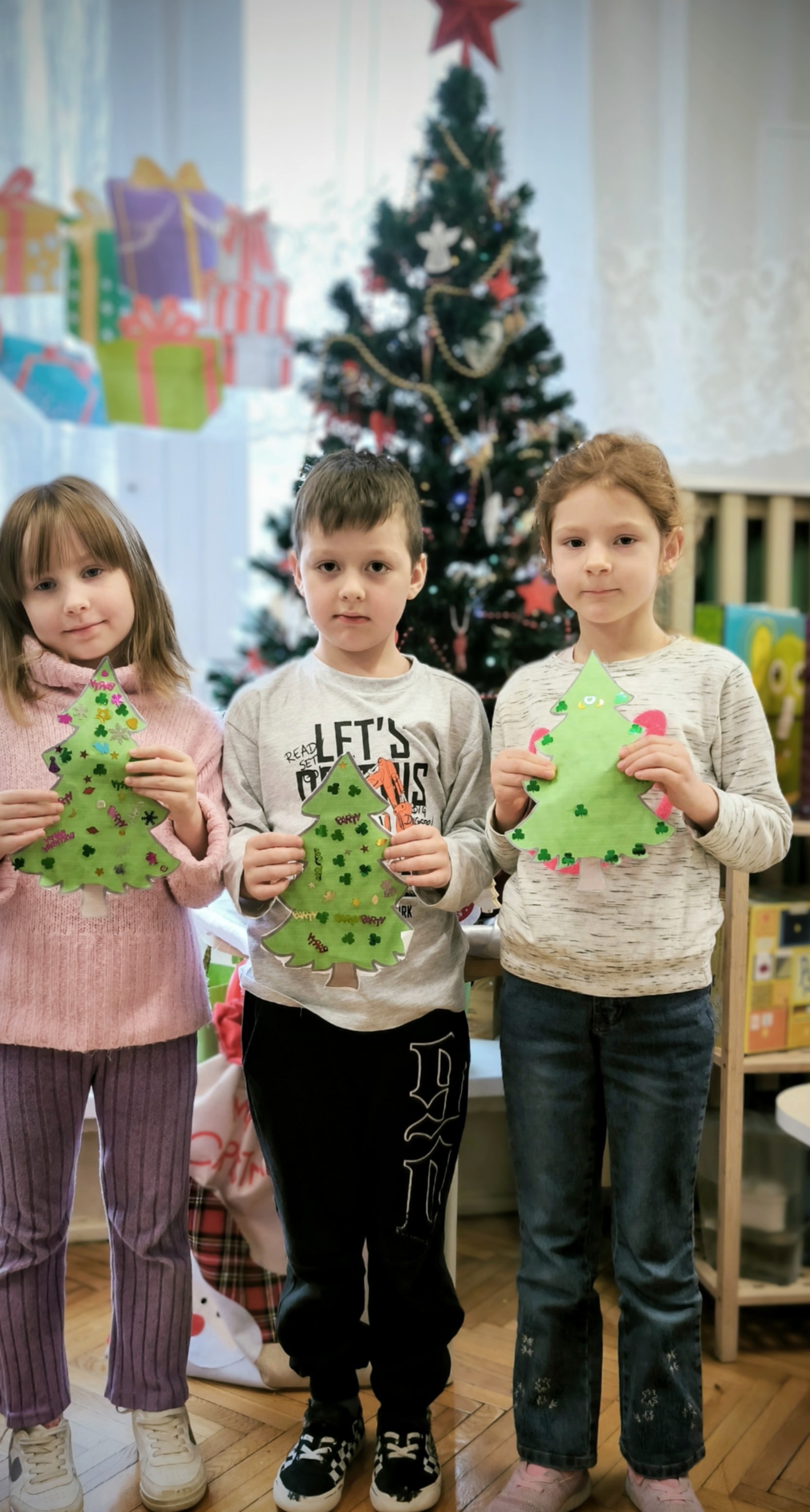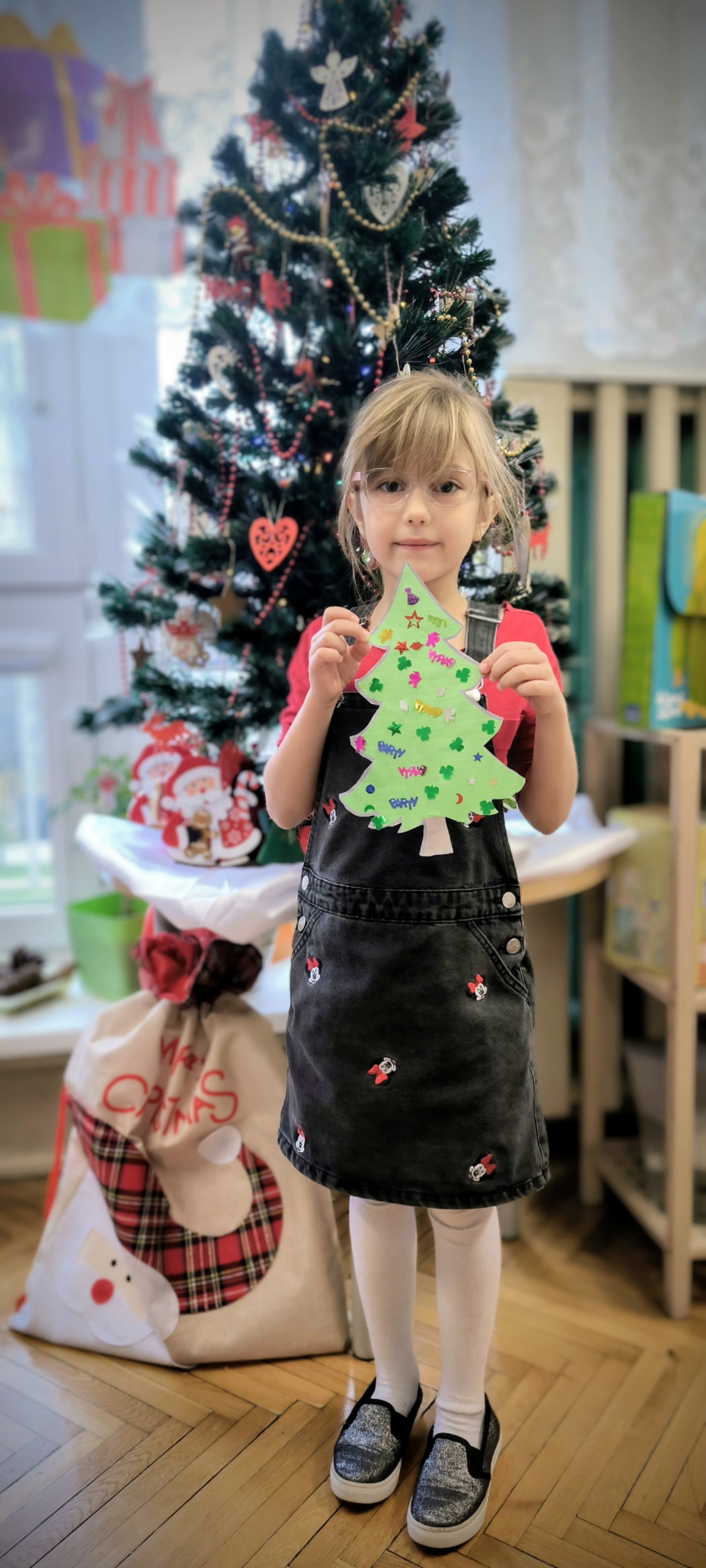 "Zielona choinka do nas zawitała. Święta się zbliżają, przystroić się chciała. Zrobimy ozdoby, ubierzemy drzewko, niech będzie wesoło, chodźcie dzieci prędko!!! Weźmiemy cekiny różnokolorowe, raz,dwa i bombeczki w mig będą gotowe!!!" Kreatywne choinki samodzielnie wycięte i udekorowane cekinami według indywidualnych pomysłów starszaków.