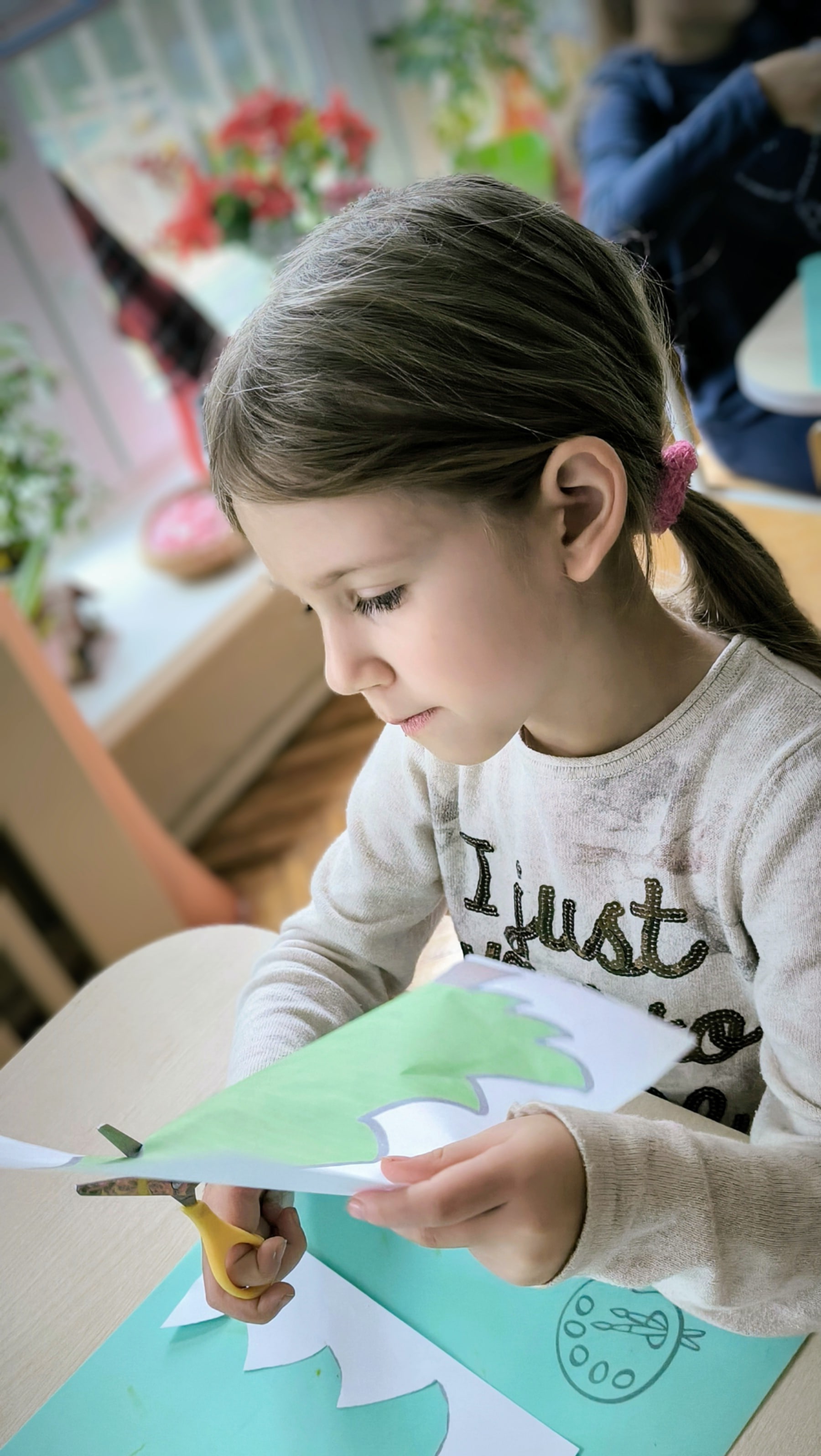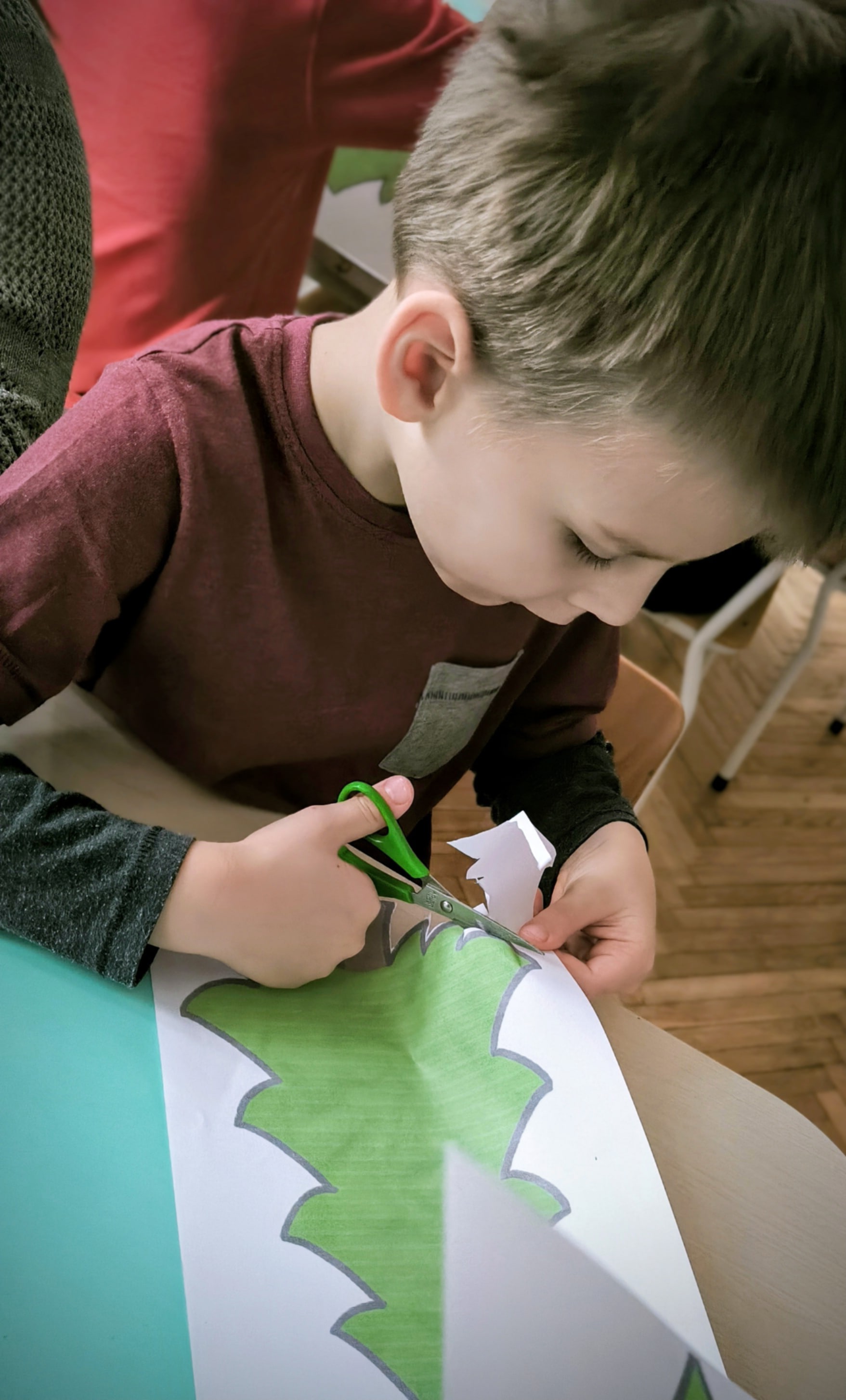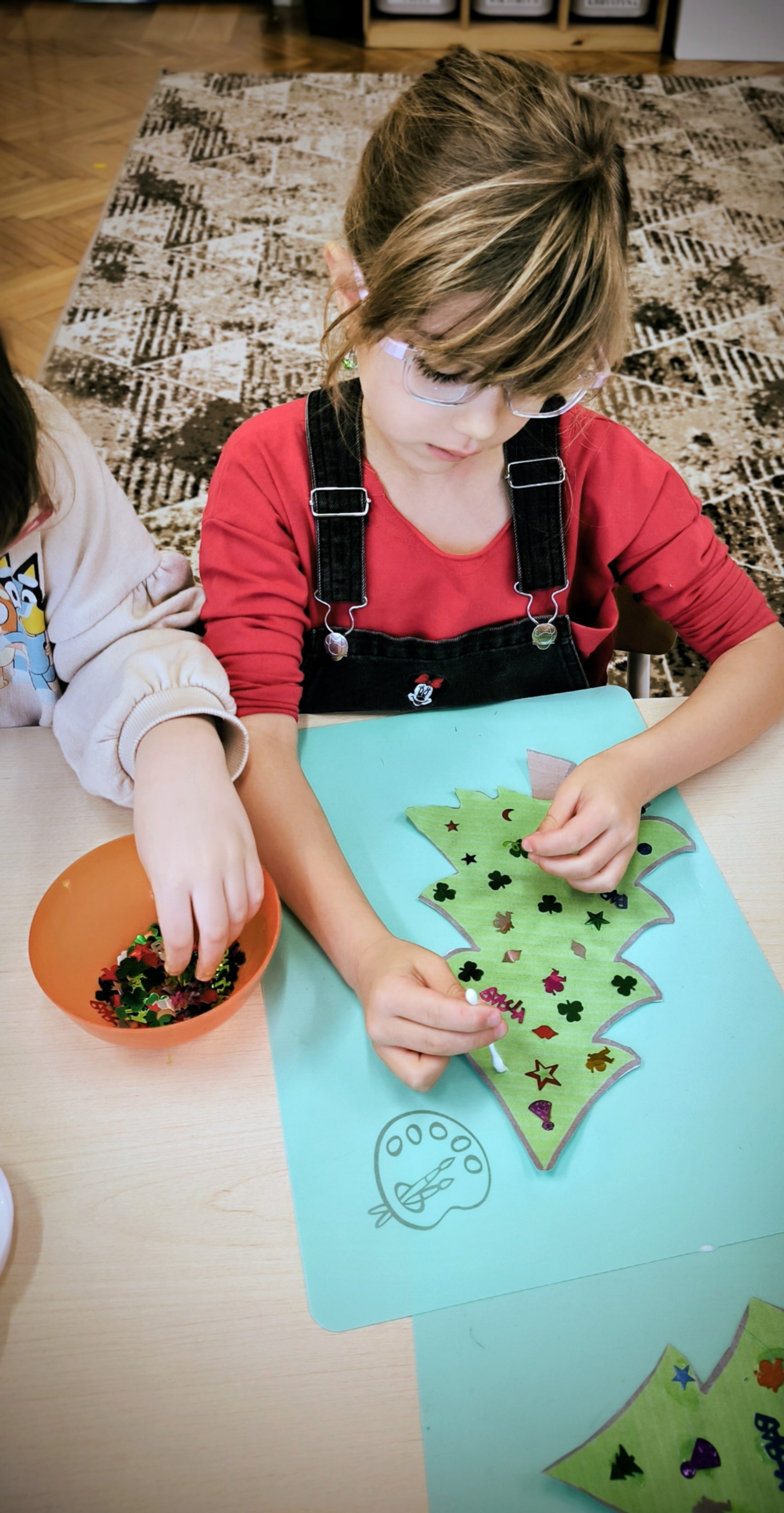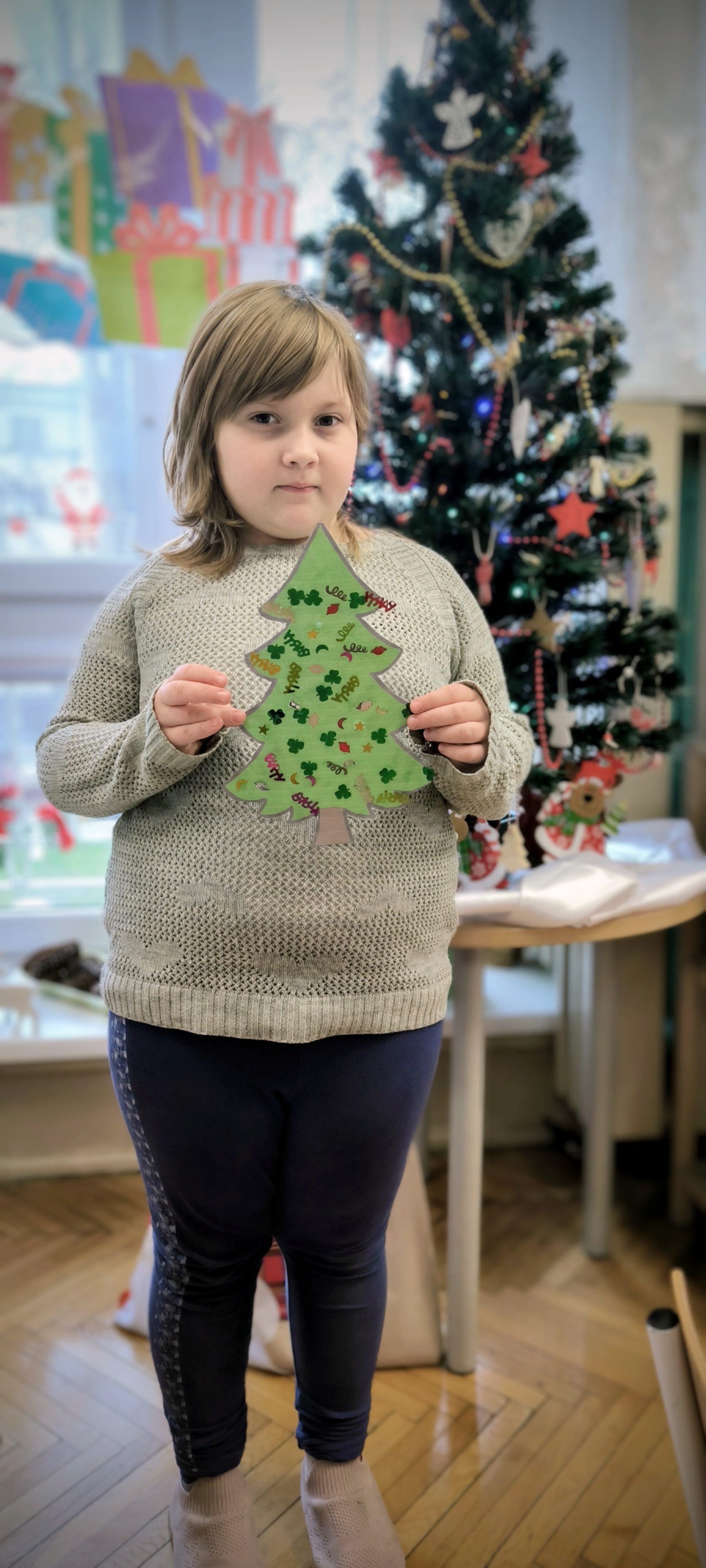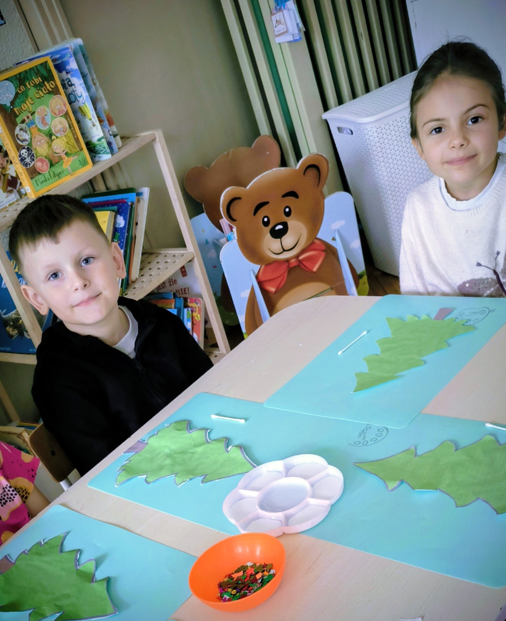 "Zielona choinka do nas zawitała. Święta się zbliżają, przystroić się chciała. Zrobimy ozdoby, ubierzemy drzewko, niech będzie wesoło, chodźcie dzieci prędko!!! Weźmiemy cekiny różnokolorowe, raz,dwa i bombeczki w mig będą gotowe!!!" Kreatywne choinki samodzielnie wycięte i udekorowane cekinami według indywidualnych pomysłów starszaków.
