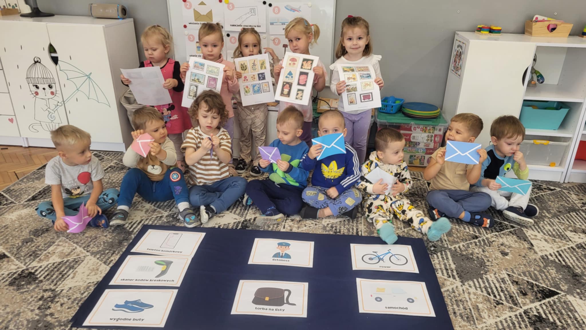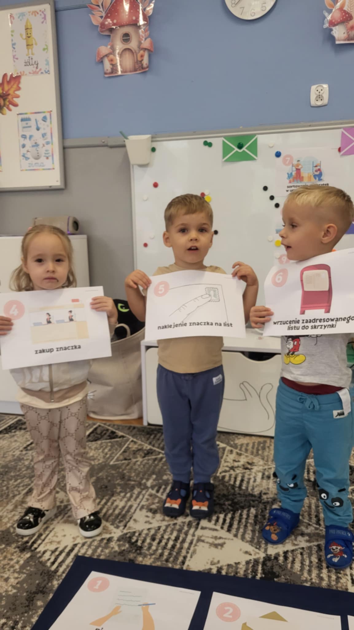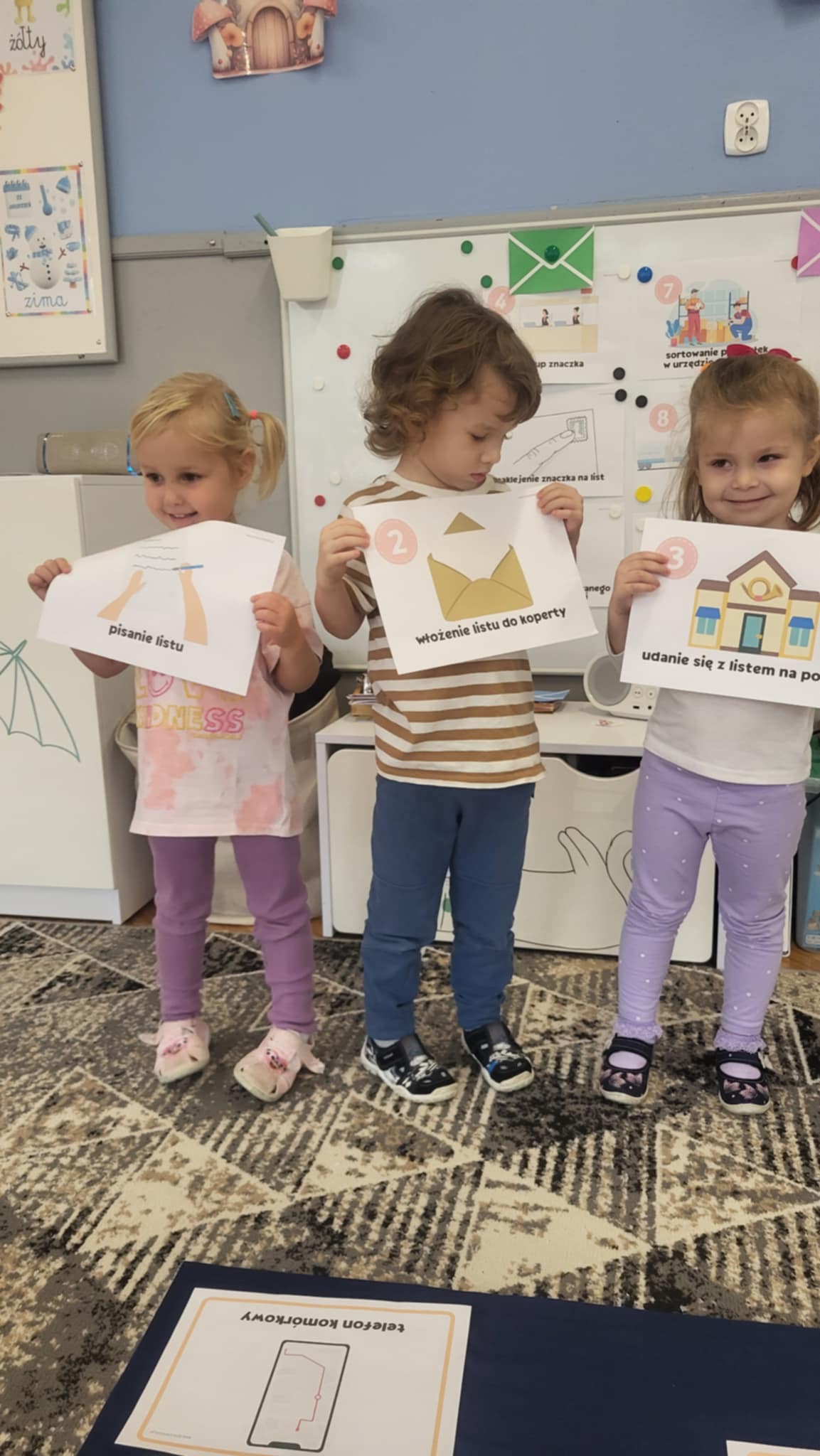 Nasze Maluszki wiedzą już, że listonosz to pracownik poczty, który każdego dnia doręcza listy, paczki i inne przesyłki. Chodzi pieszo lub jeździ rowerem, często pokonując wiele kilometrów, aby dostarczyć wszystko prosto do adresatów. Na swojej pracy nosi charakterystyczny uniform i ma wielką torbę, która jest wypełniona listami i przesyłkami. Poznały czego potrzebujemy, by nasz list został wysłany i doręczony oraz jaką drogę mus przebyć, by dotrzeć do odbiorcy. Wiedzą też, że praca listonosza jest dla nas ważna.