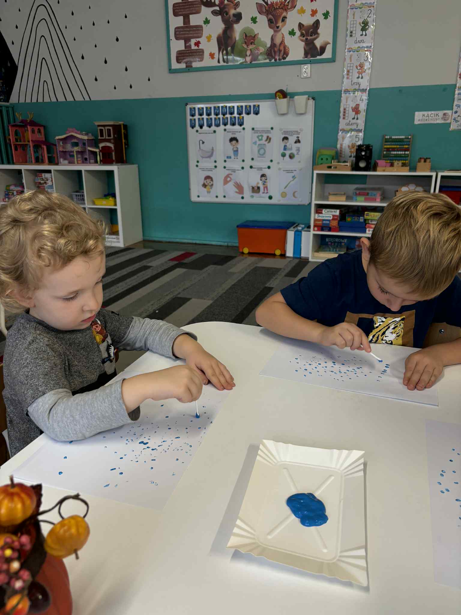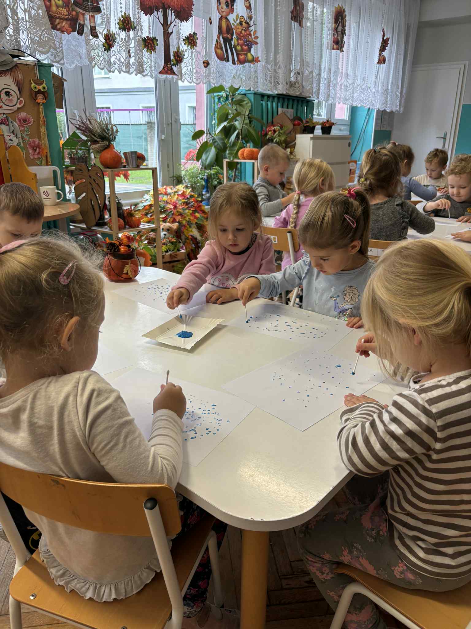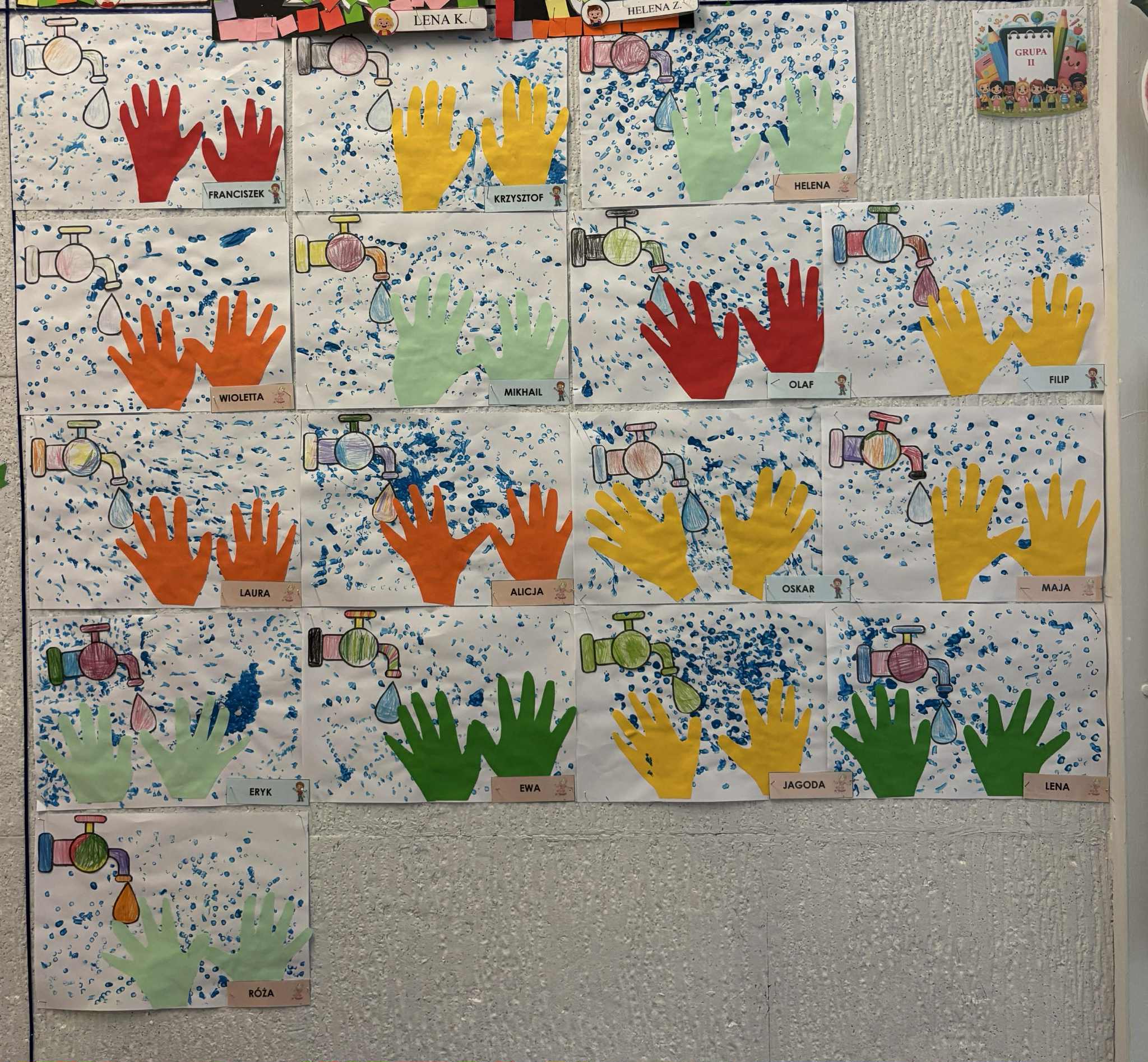 W grupie rozmawialiśmy o tym, jak ważne jest dbanie o czystość i zdrowie każdego dnia. Dzieci wzięły udział w quizie wiedzy o higienie, świetnie odpowiadając na pytania o mycie rąk, zębów i pielęgnację ciała. W części plastycznej powstały piękne prace- kolorowaliśmy krany, odrysowywaliśmy swoje dłonie i malowaliśmy krople wody patyczkami, tworząc wyjątkową, pełną barw kompozycję. Było edukacyjnie, kreatywnie i bardzo wesoło