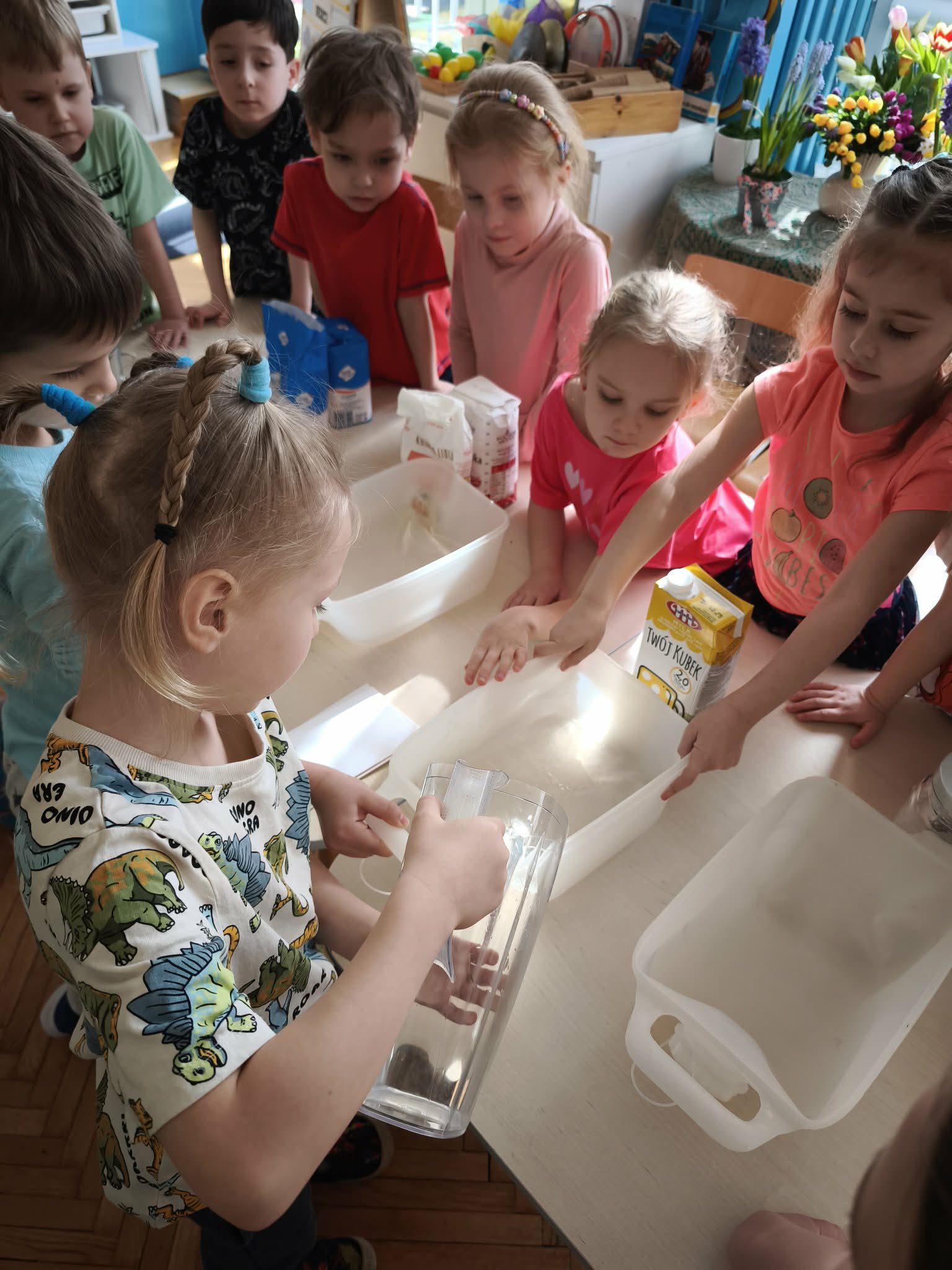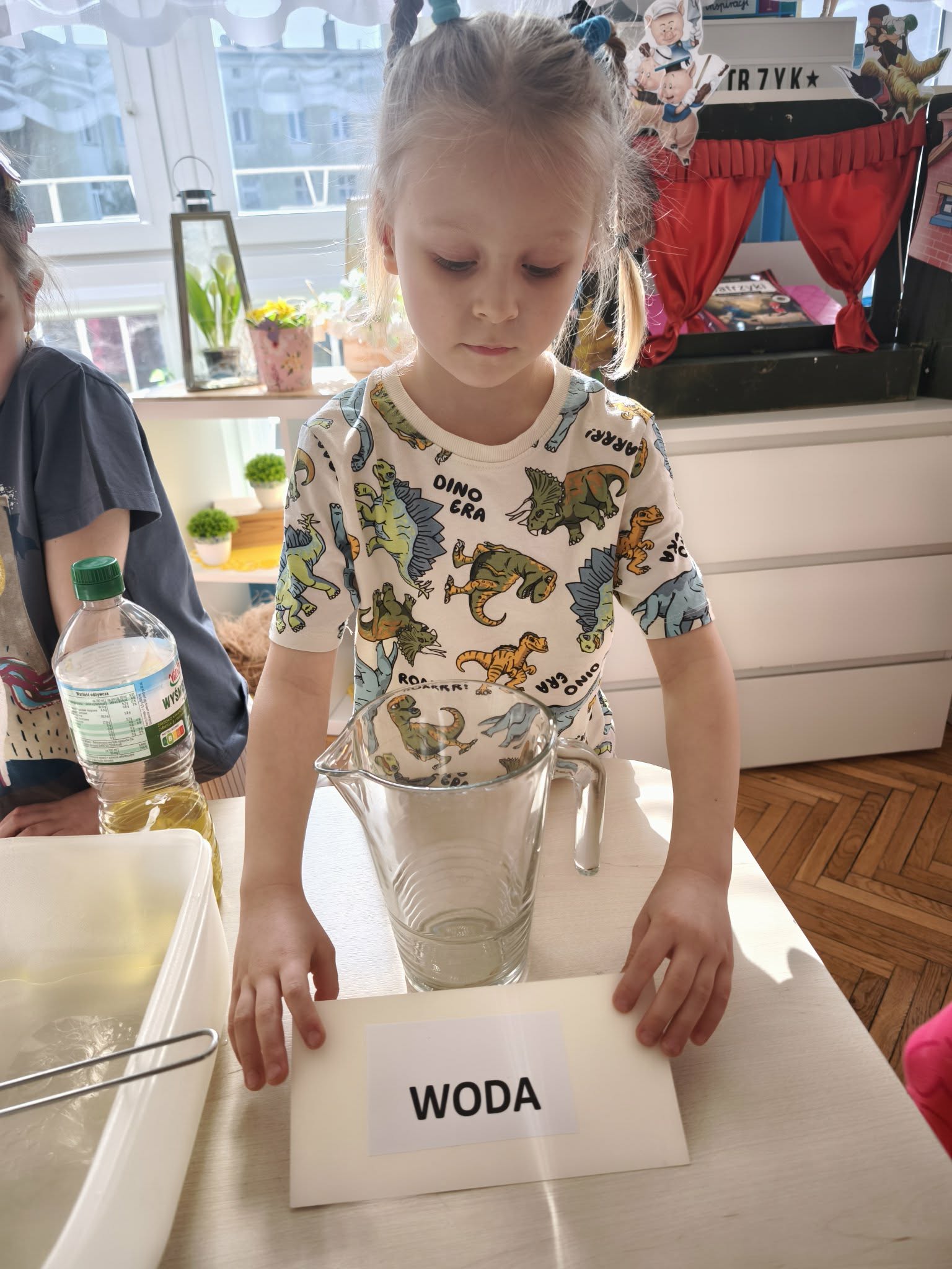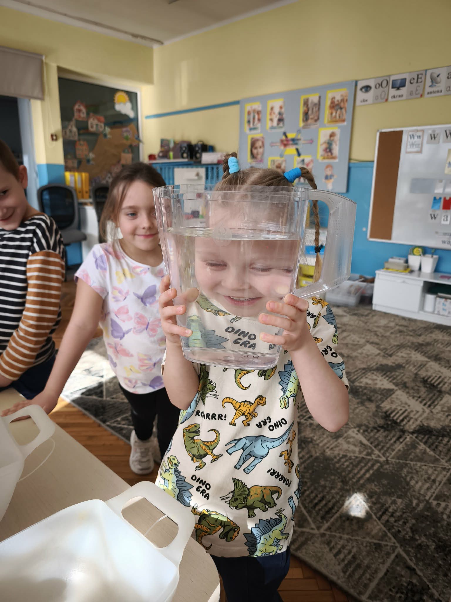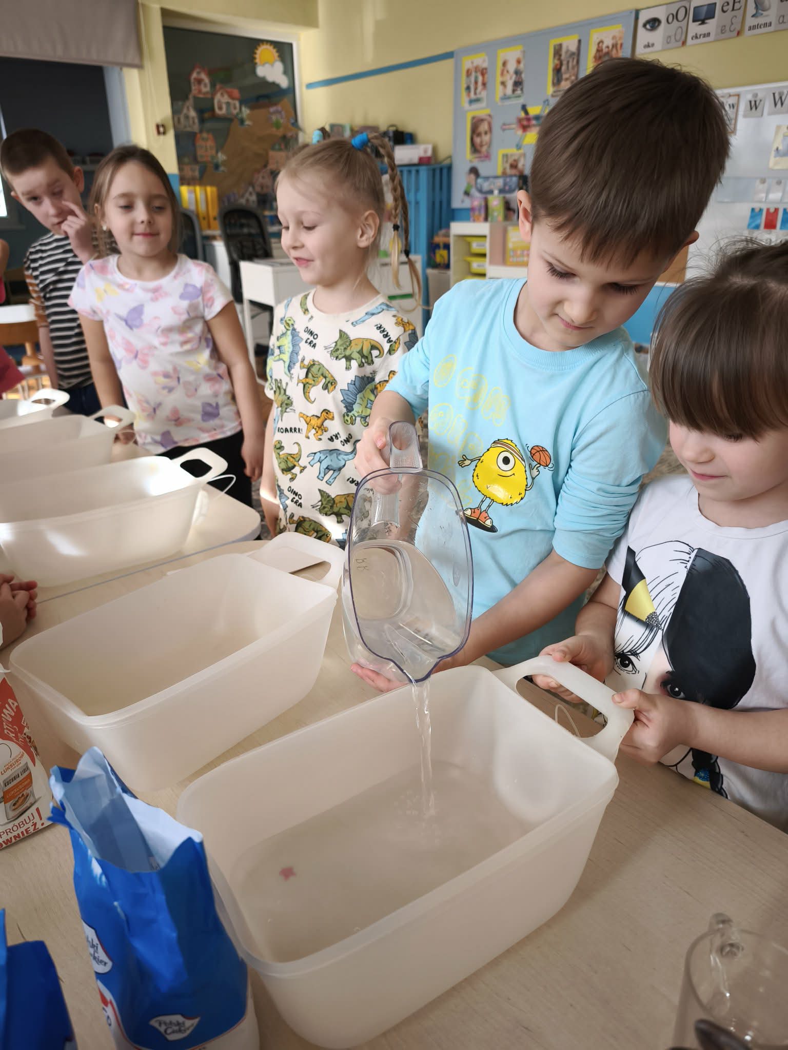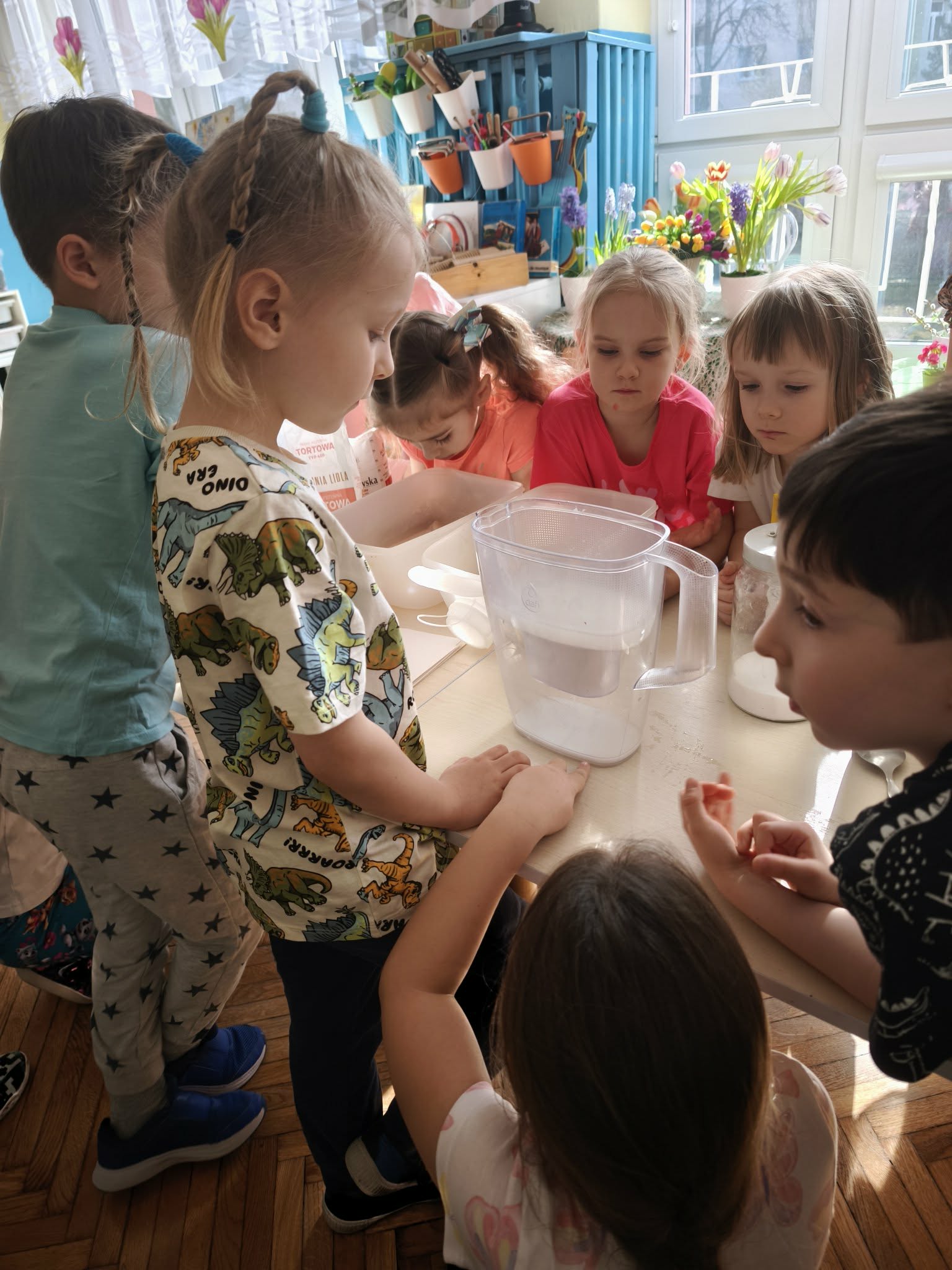 Grupa 3 przeprowadziła dzisiaj eksperymenty z wodą.Badaliśmy, co rozpuszcza się w wodzie. Wsypaliśmy cukier, sól, mąkę. Cukier i sól rozpuściła się. Mąka opadła na dno.Nastepnie do wody dodaliśmy olej i mleko. Woda stała się brudna i mętna.Bardzo łatwo ją zanieczyścić. Próbowaliśmy oczyścić zanieczyszczoną wodę. Użyliśmy sitka, oraz filtra węglowego. Woda nie była już tak czysta. Przekonaliśmy się, że oczyszczanie wody jest trudne i nie zawsze całkowicie skuteczne. Dlatego bardzo ważne jest, aby dbać o czystość wody .