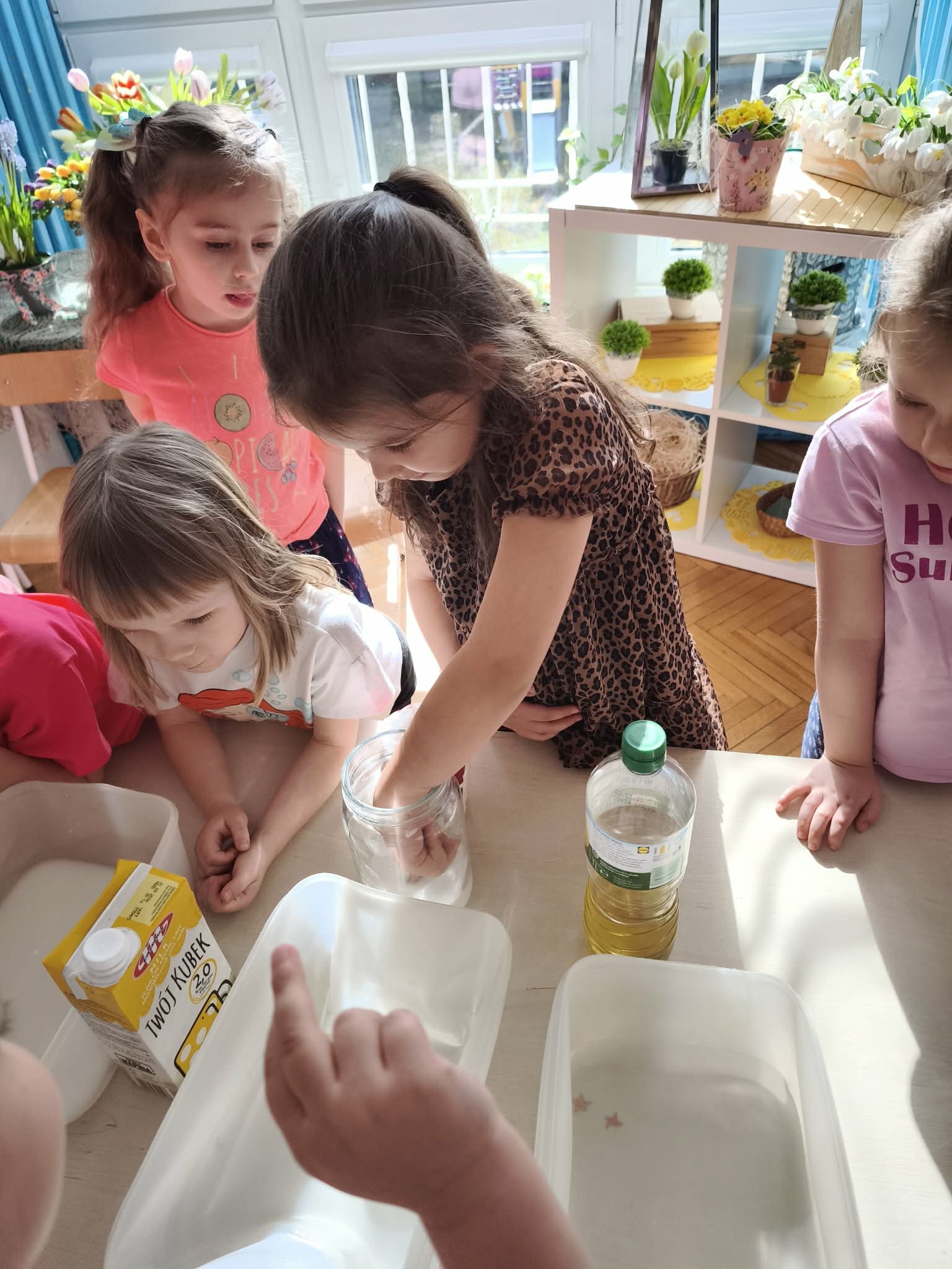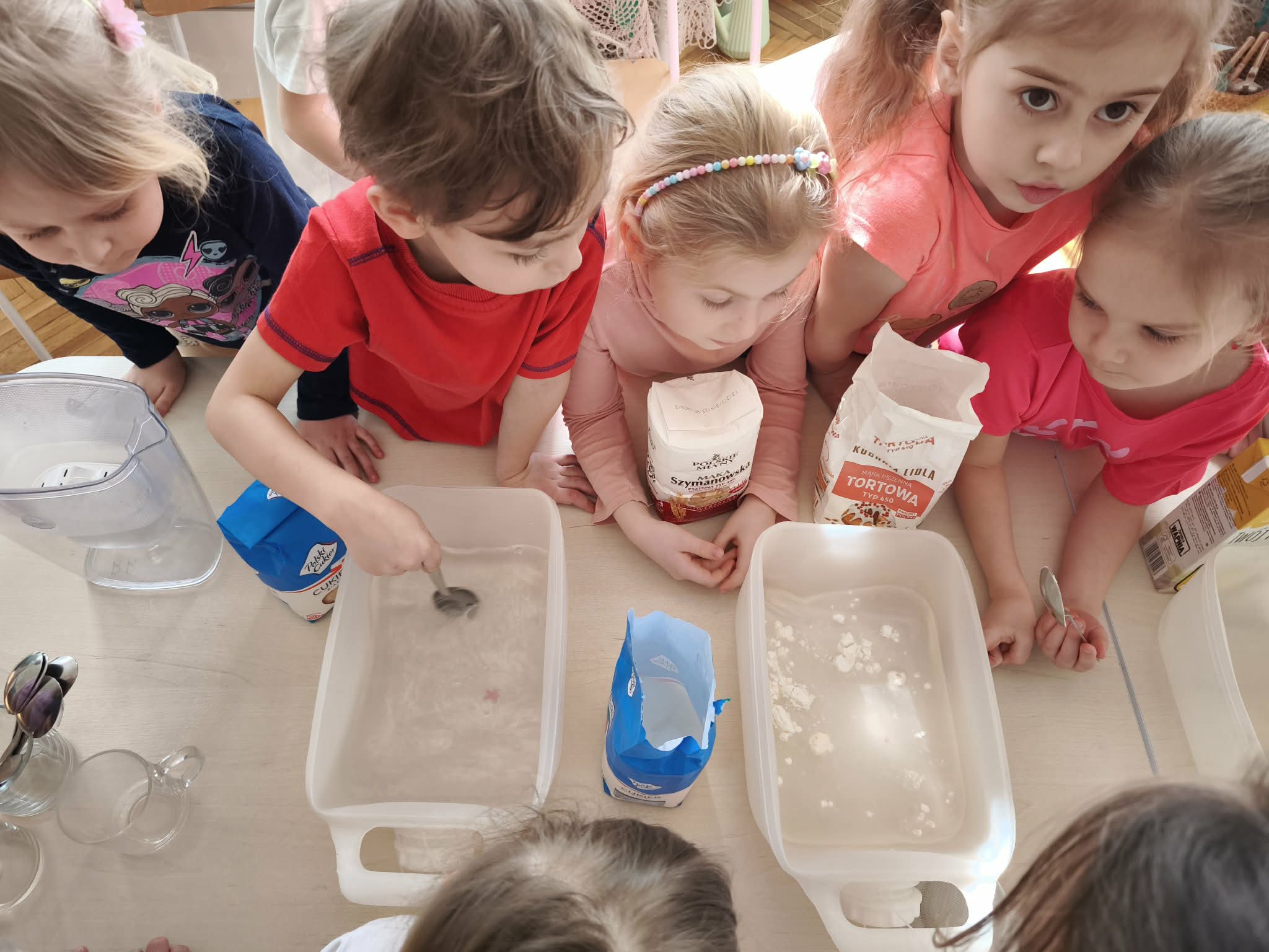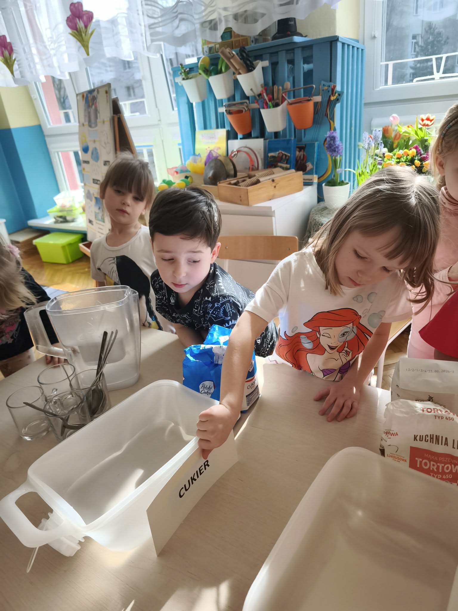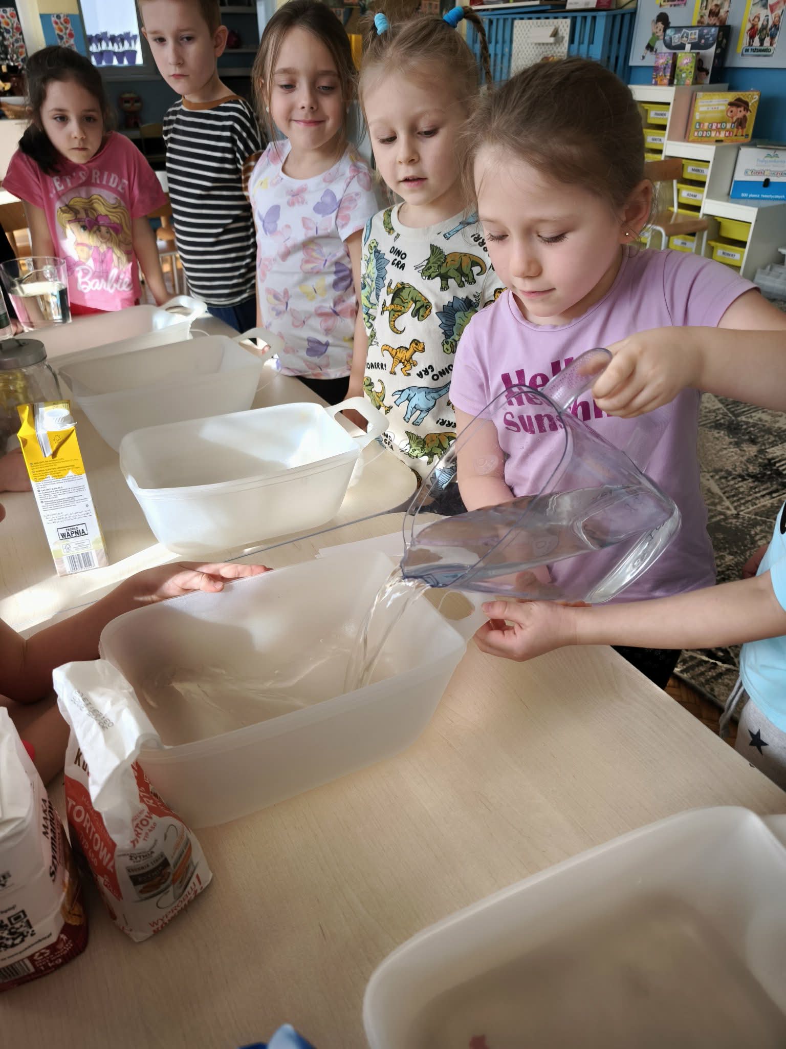 Grupa 3 przeprowadziła dzisiaj eksperymenty z wodą.Badaliśmy, co rozpuszcza się w wodzie. Wsypaliśmy cukier, sól, mąkę. Cukier i sól rozpuściła się. Mąka opadła na dno.Nastepnie do wody dodaliśmy olej i mleko. Woda stała się brudna i mętna.Bardzo łatwo ją zanieczyścić. Próbowaliśmy oczyścić zanieczyszczoną wodę. Użyliśmy sitka, oraz filtra węglowego. Woda nie była już tak czysta. Przekonaliśmy się, że oczyszczanie wody jest trudne i nie zawsze całkowicie skuteczne. Dlatego bardzo ważne jest, aby dbać o czystość wody .