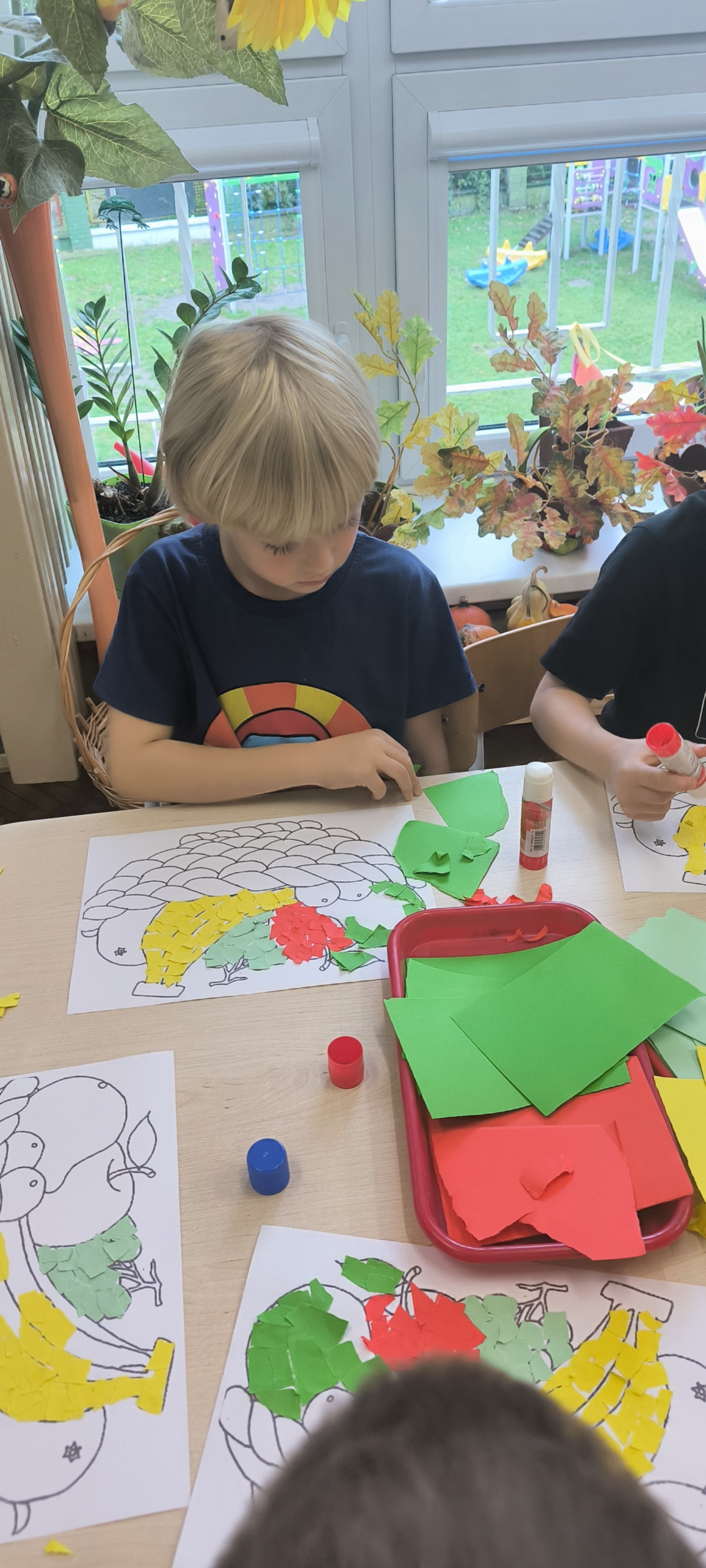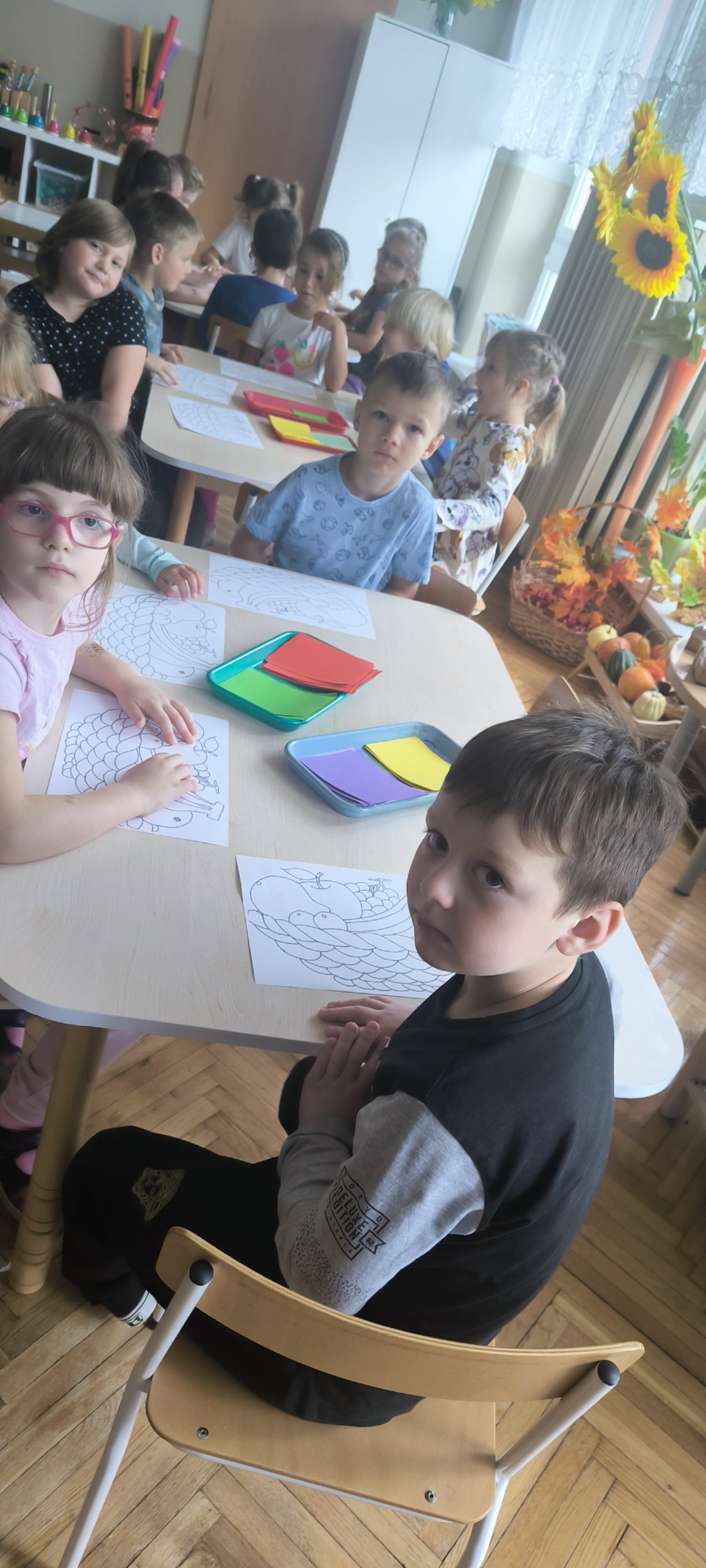 W tym tygodniu starszaki poznają sposoby dbania o własne zdrowie i samopoczucie jesienią. Wśród pomysłów dzieci znalazło się jedzenie warzyw i owoców. Nawet wymyśliły samodzielnie powiedzenie: " Hej chłopaki,hej dziewczyny jesienią jemy witaminy"
