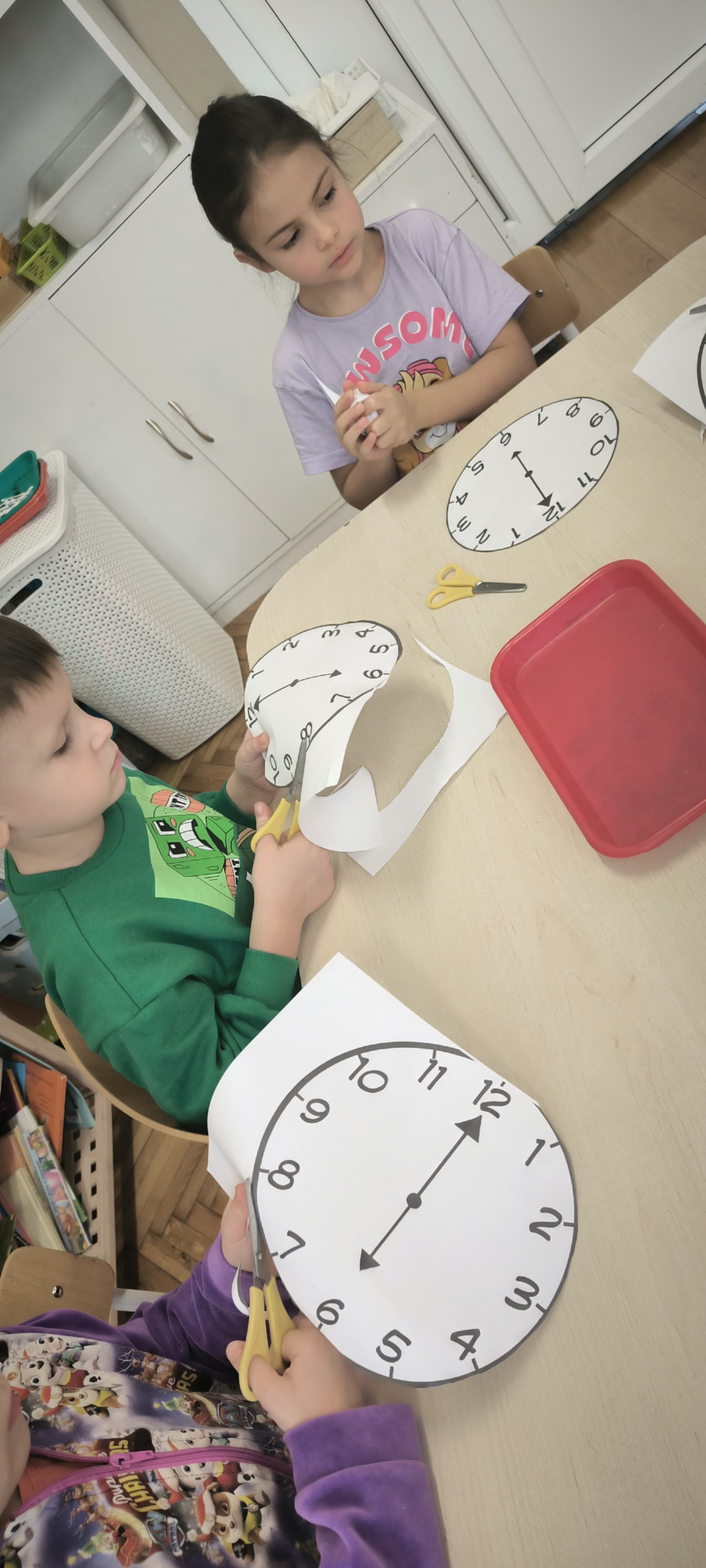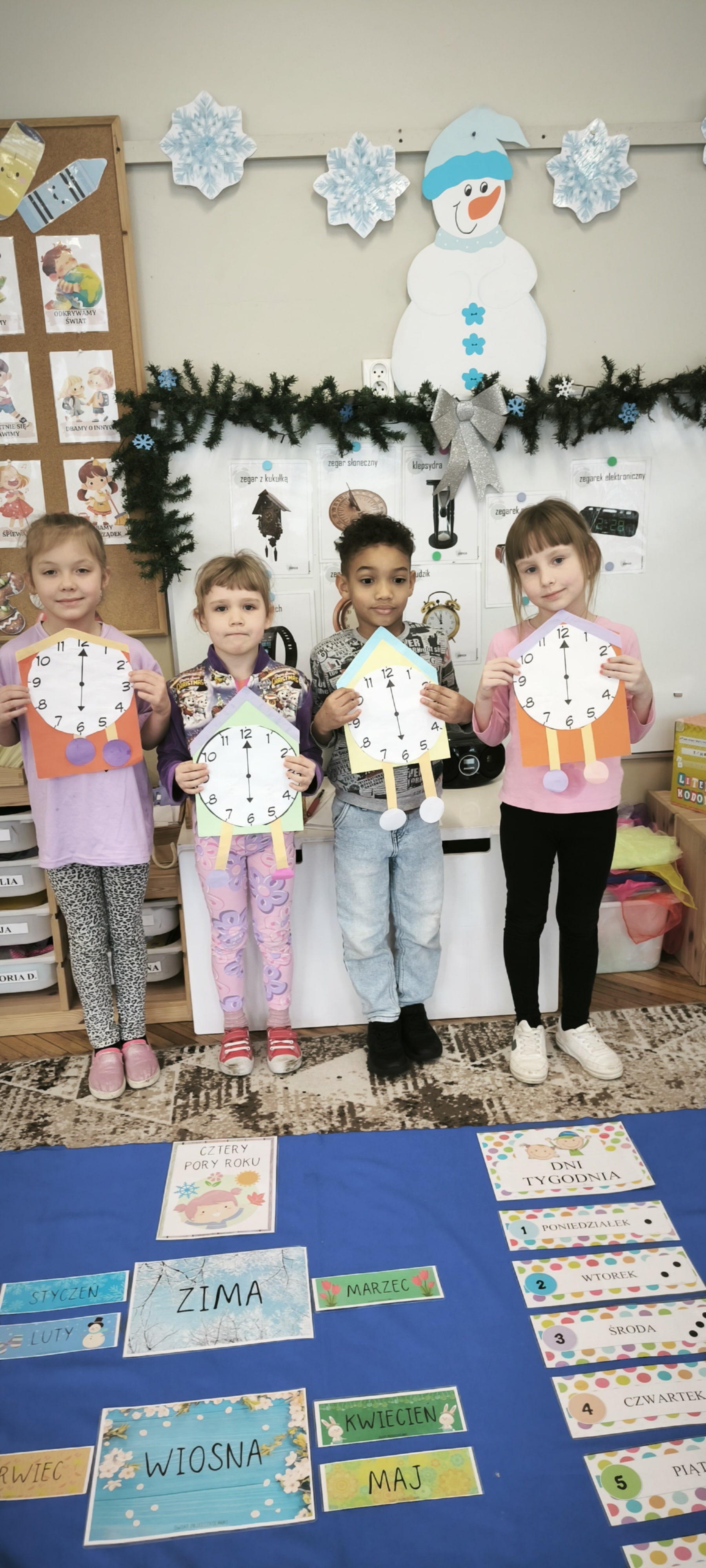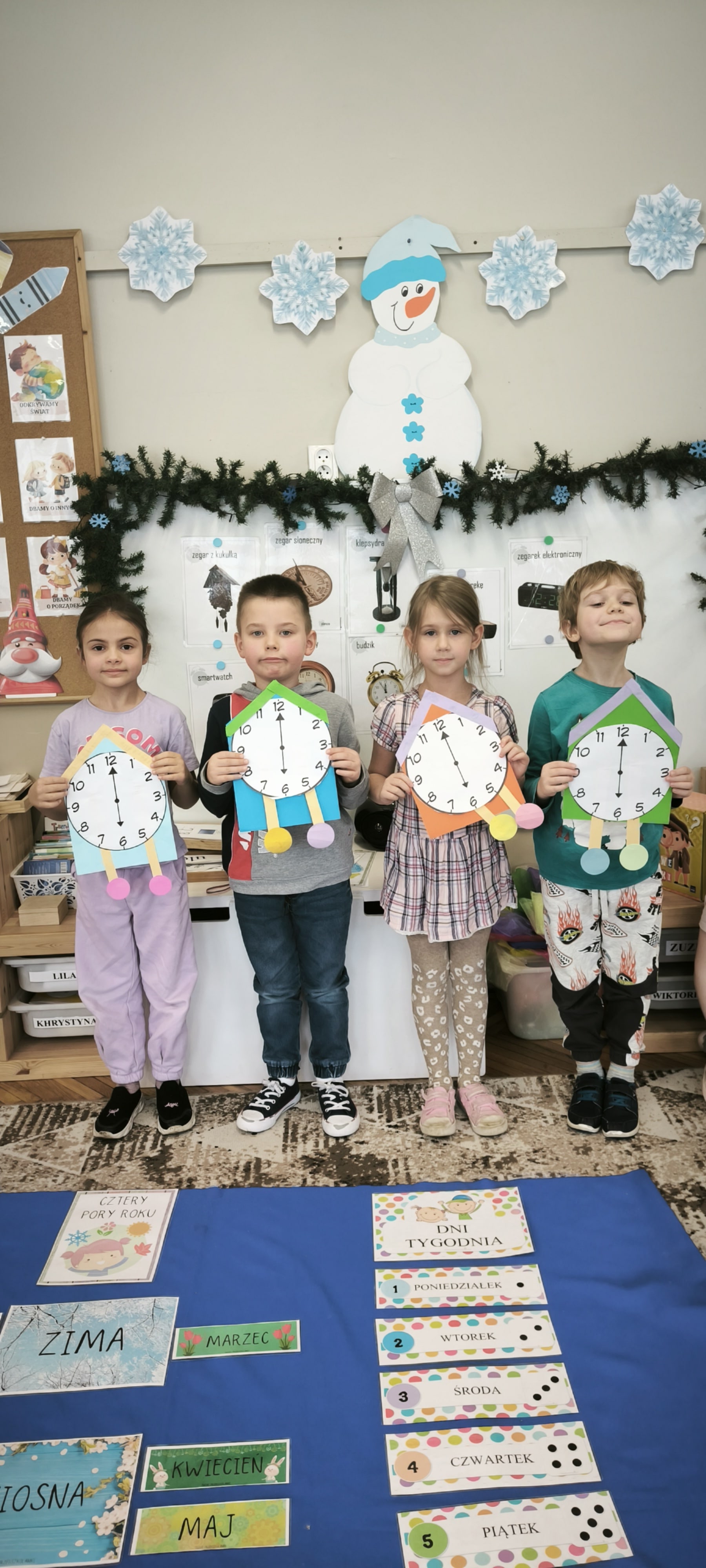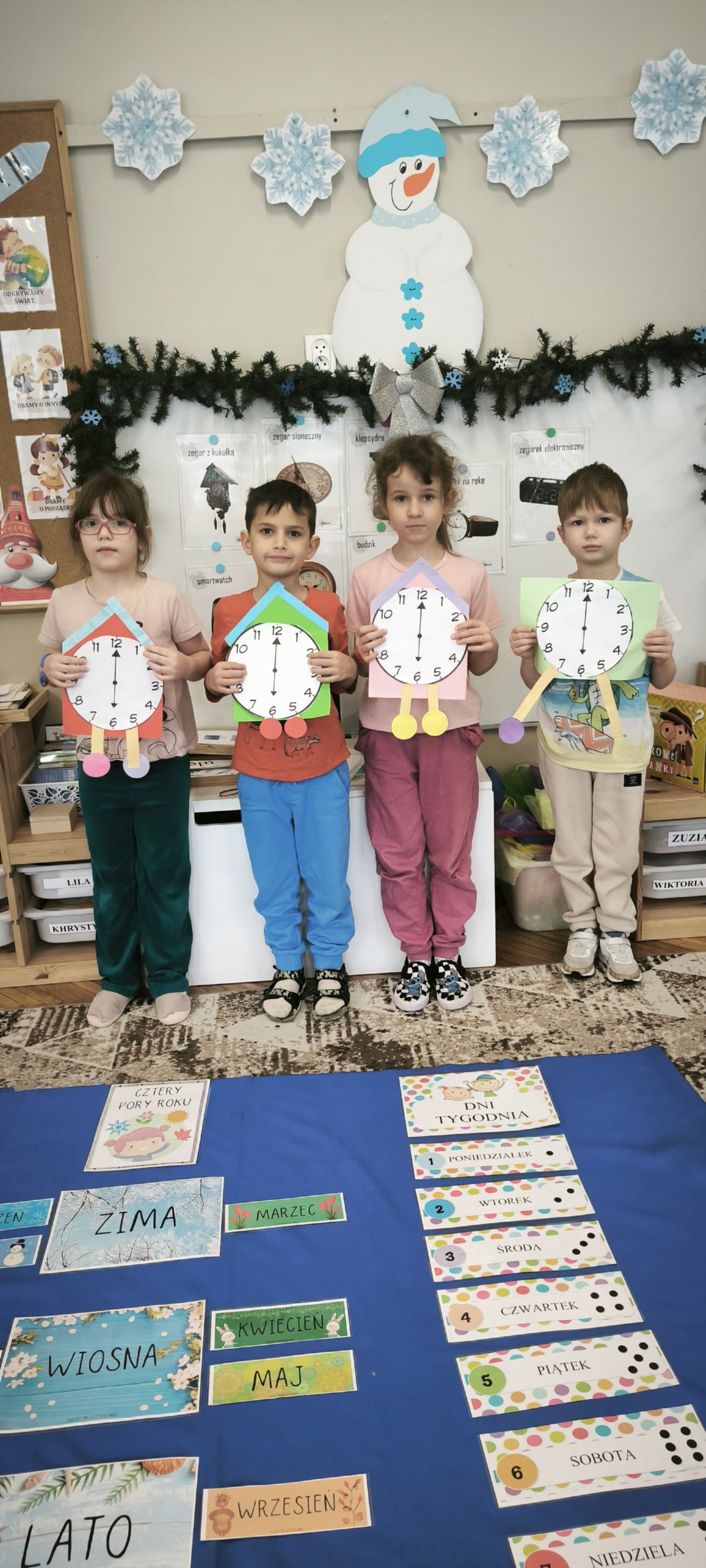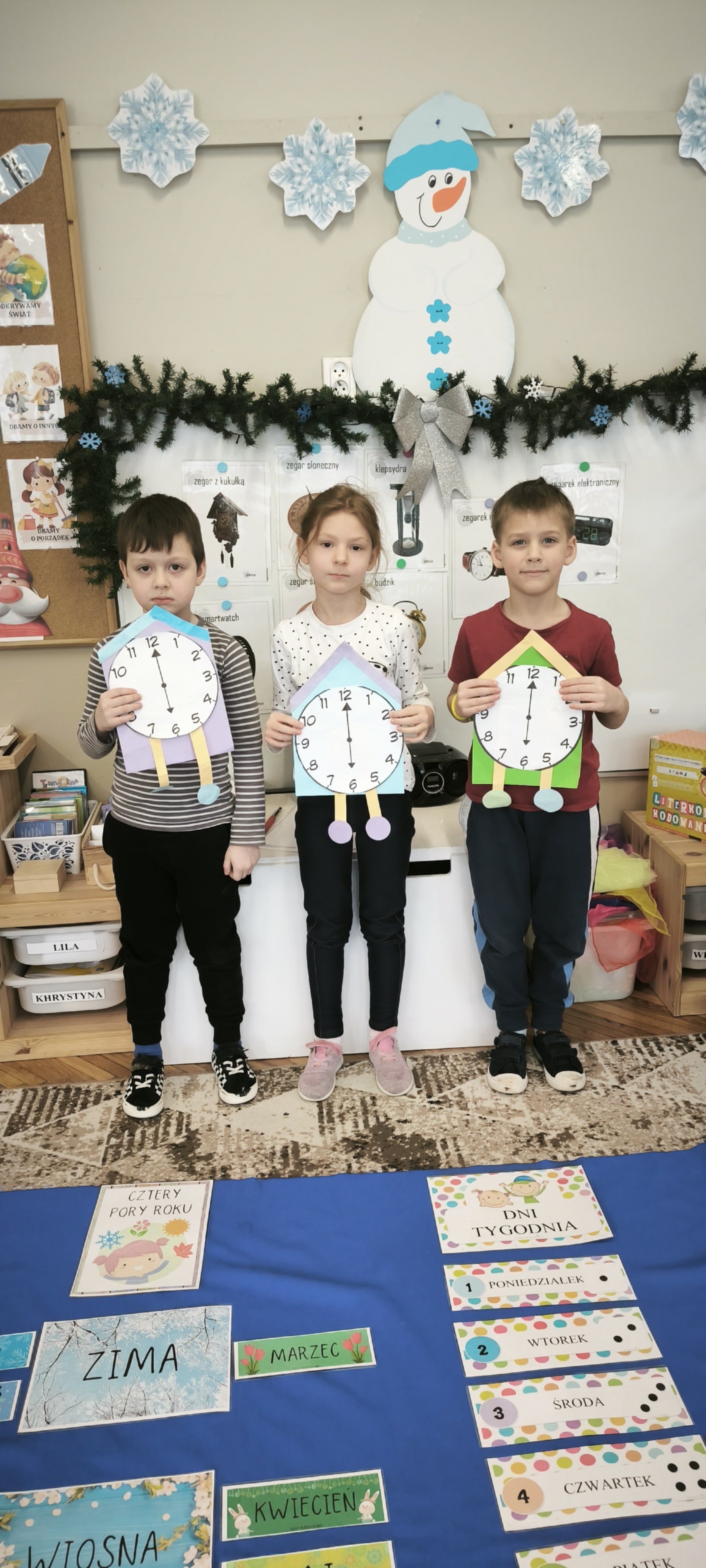 W tym tygodniu przed starszakami bardzo trudne zadanie bowiem muszą rozwiązać zagadkę upływającego czasu. Dzieci samodzielnie dzieliły rok na pory roku, miesiące i utrwalały dni tygodnia. Poznały różne sposoby mierzenia czasu za pomocą zegarów. Oglądały również kalendarze. Wykonały papierowe zegary. Wytężona praca umysłowa musi być przeplatana oczywiście ruchem. W tym tygodniu dzięki pięknej zimowej aurze starszaki mogły cieszyć się śniegiem podczas zabaw w ogrodzie.