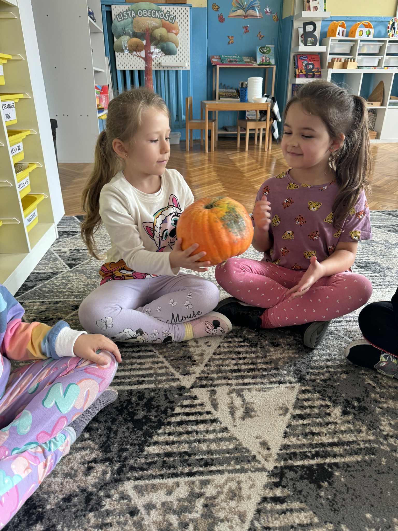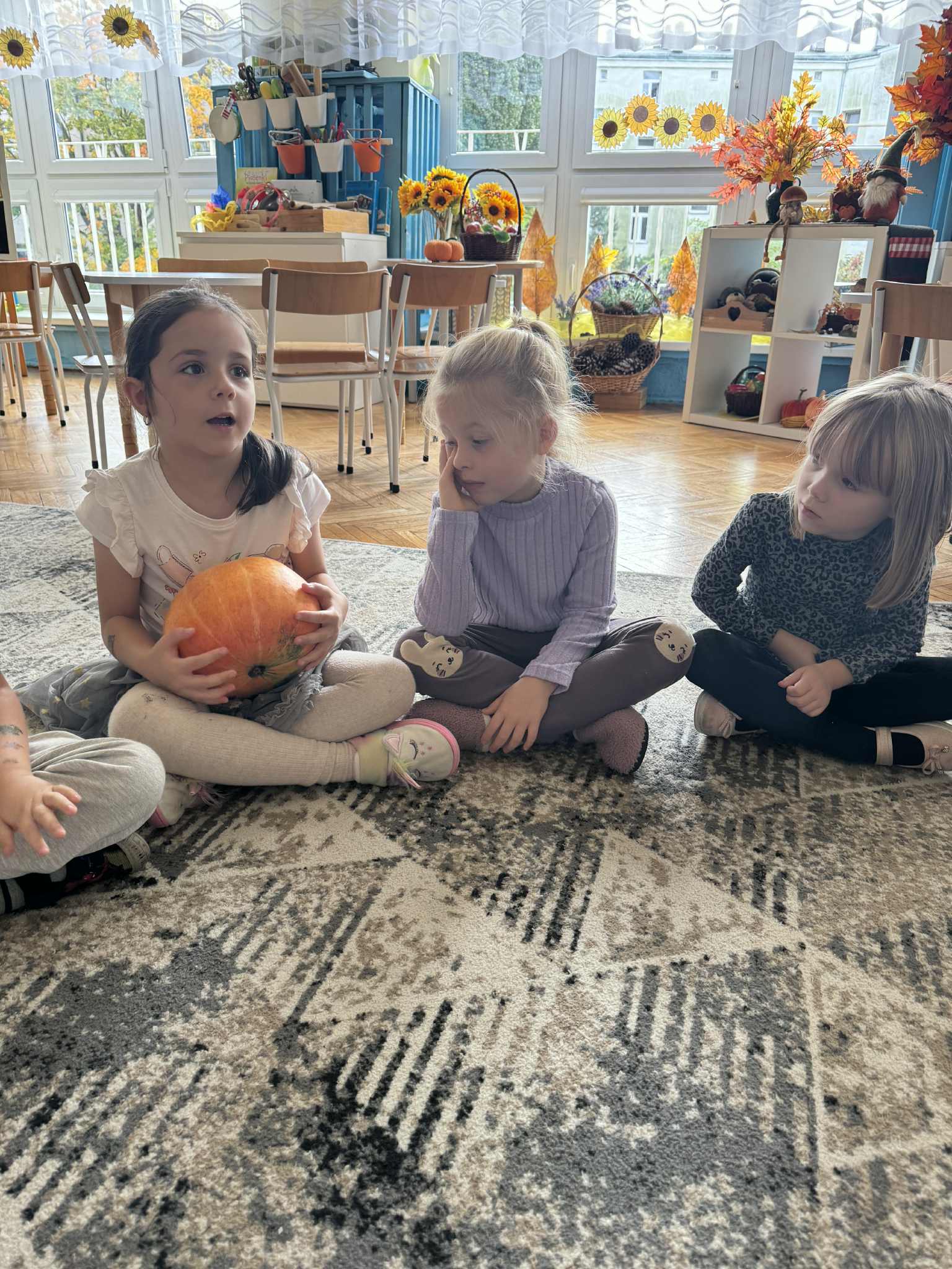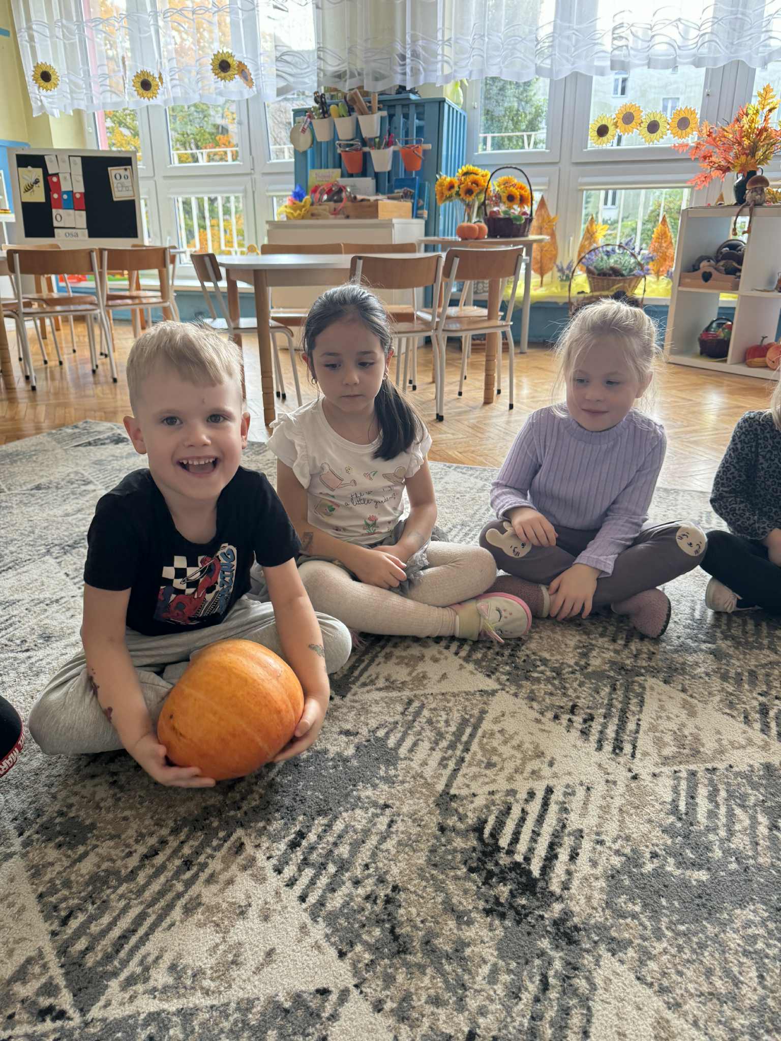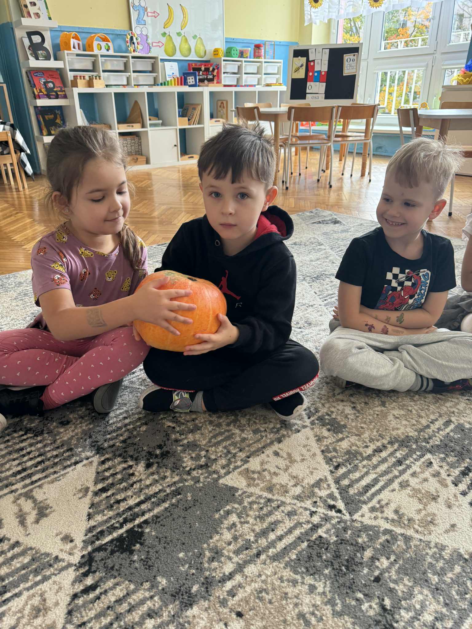 Nasze przedszkolaki uwielbiają zabawy jesiennymi skarbami. Poprzez zabawę uczyły się nazywać cyfry i przeliczać oraz utrwalały nazwy figur geometrycznych. Nie zabrakło również zabawy integrującej grupę pt. ,,Wędrująca dynia’’, której celem było wspólne działanie, wzmocnienie więzi, rozwijanie kreatywności i umiejętności współpracy