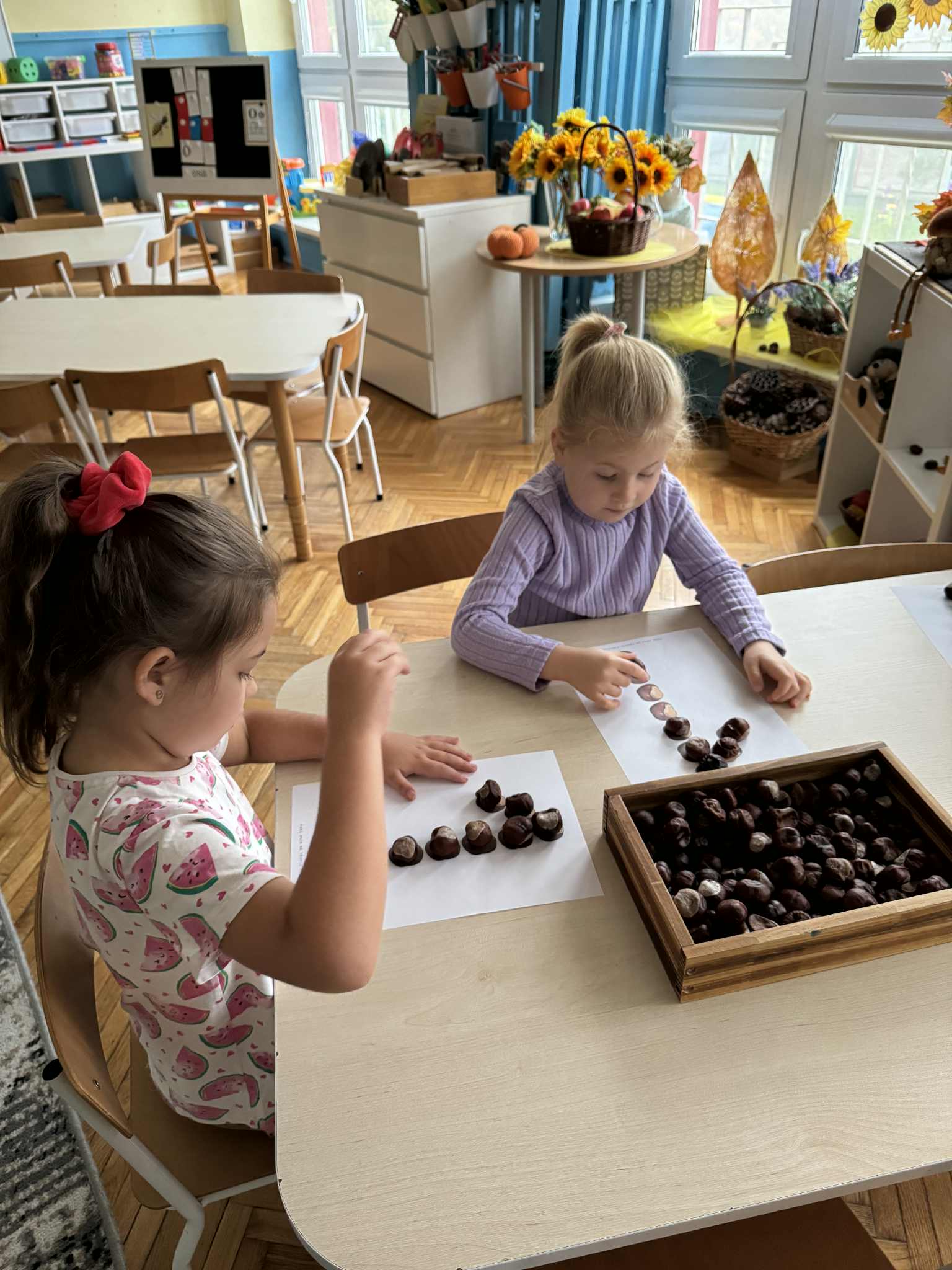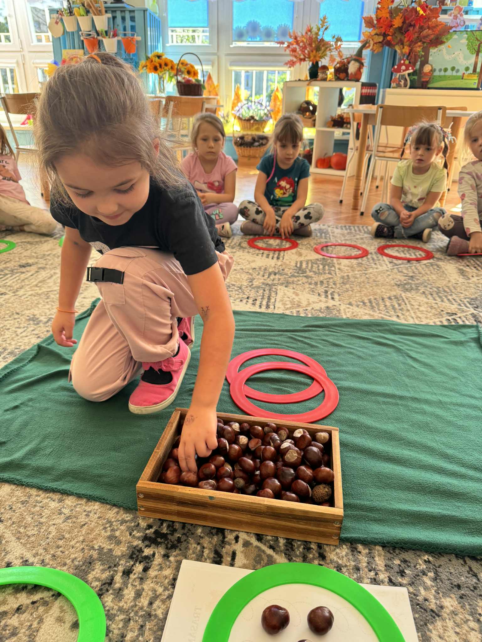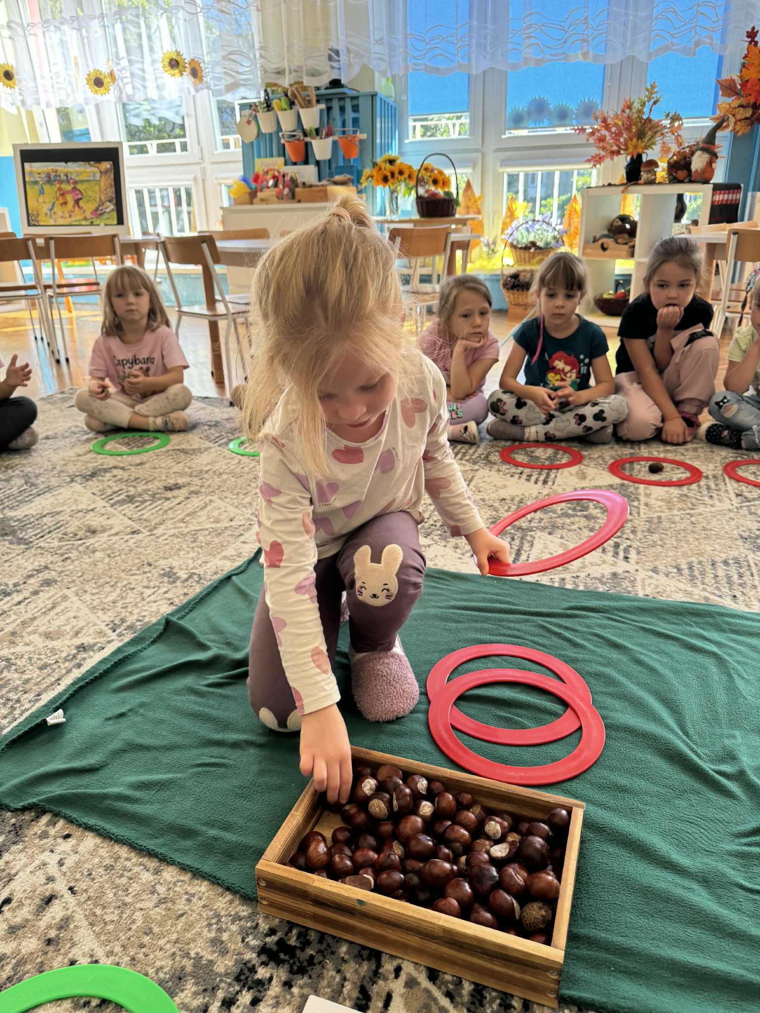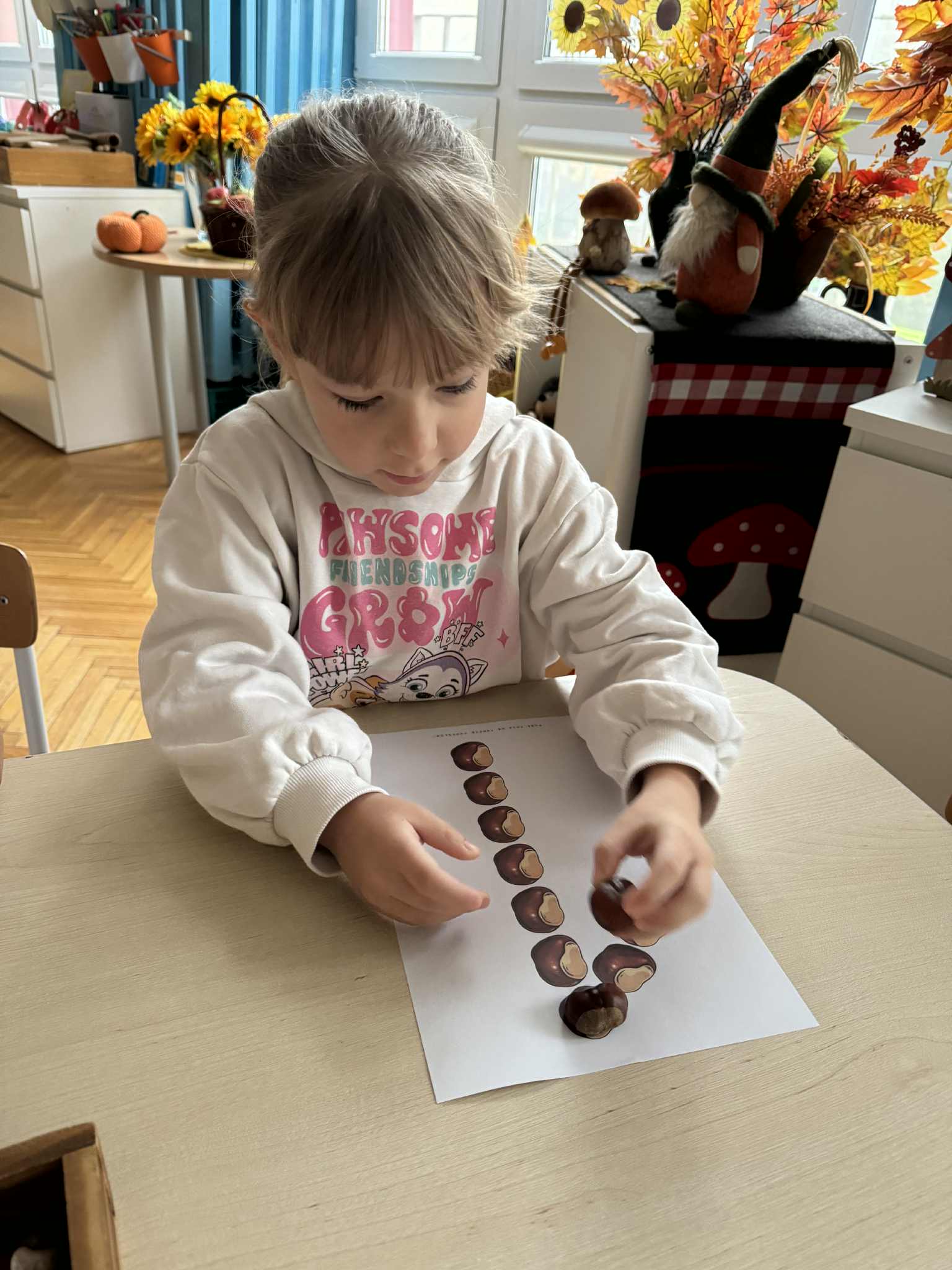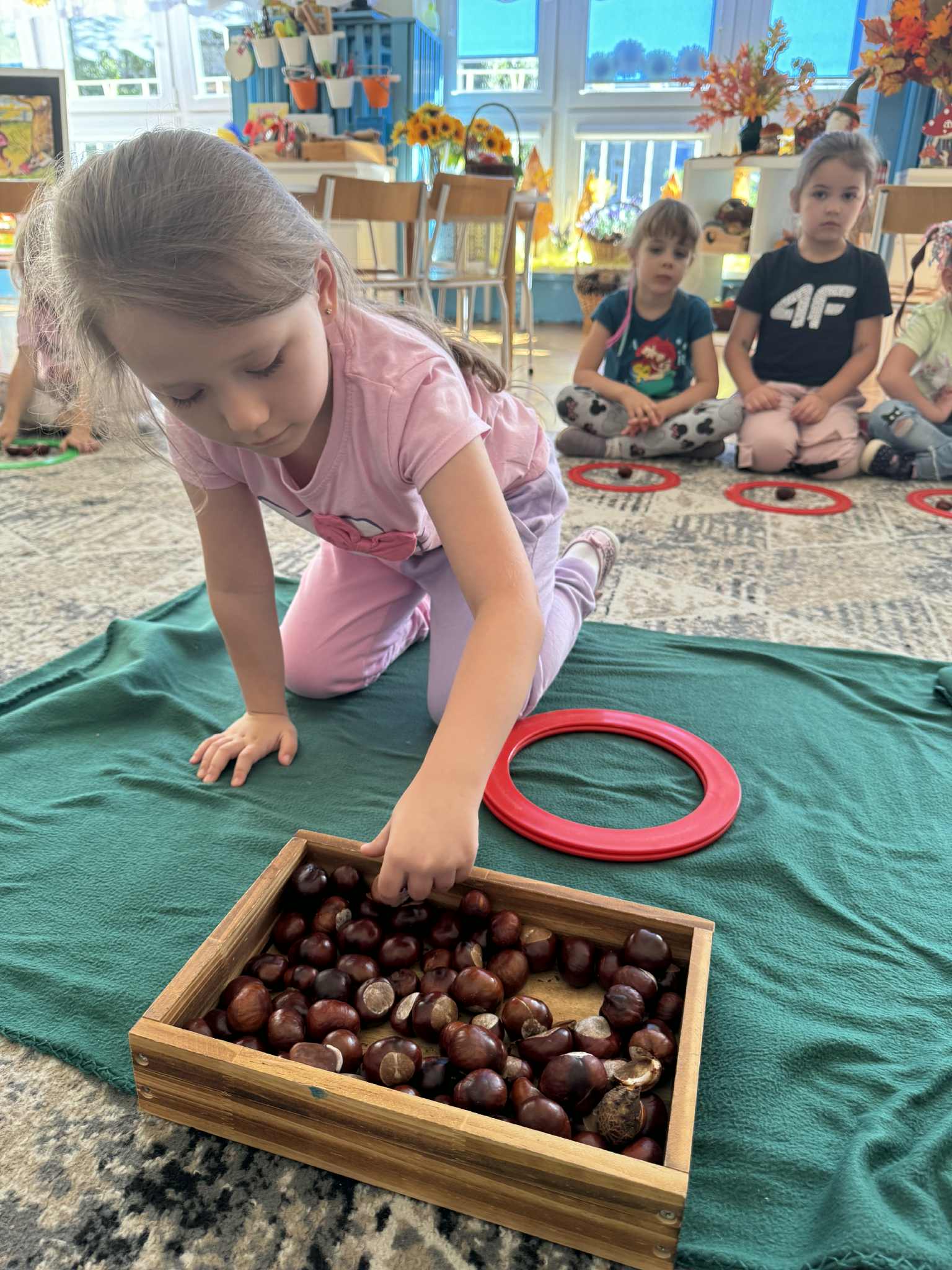 Nasze przedszkolaki uwielbiają zabawy jesiennymi skarbami. Poprzez zabawę uczyły się nazywać cyfry i przeliczać oraz utrwalały nazwy figur geometrycznych. Nie zabrakło również zabawy integrującej grupę pt. ,,Wędrująca dynia’’, której celem było wspólne działanie, wzmocnienie więzi, rozwijanie kreatywności i umiejętności współpracy