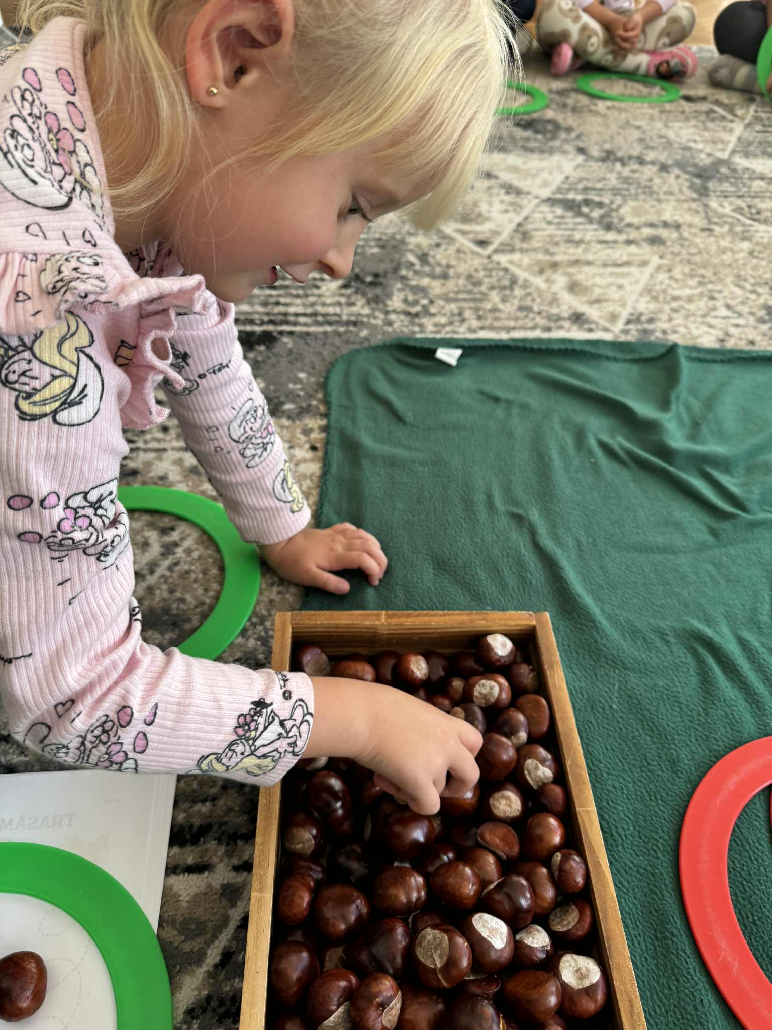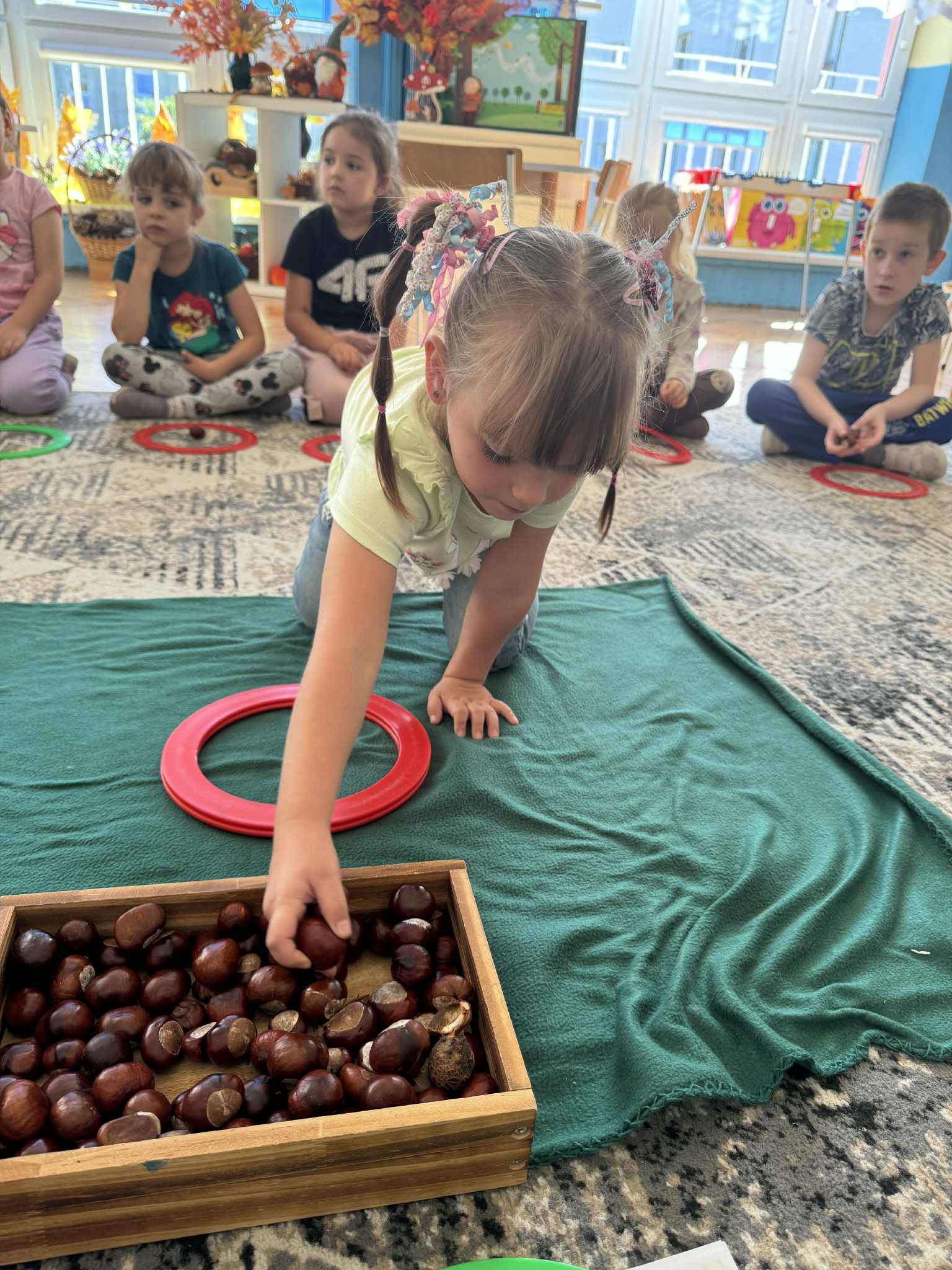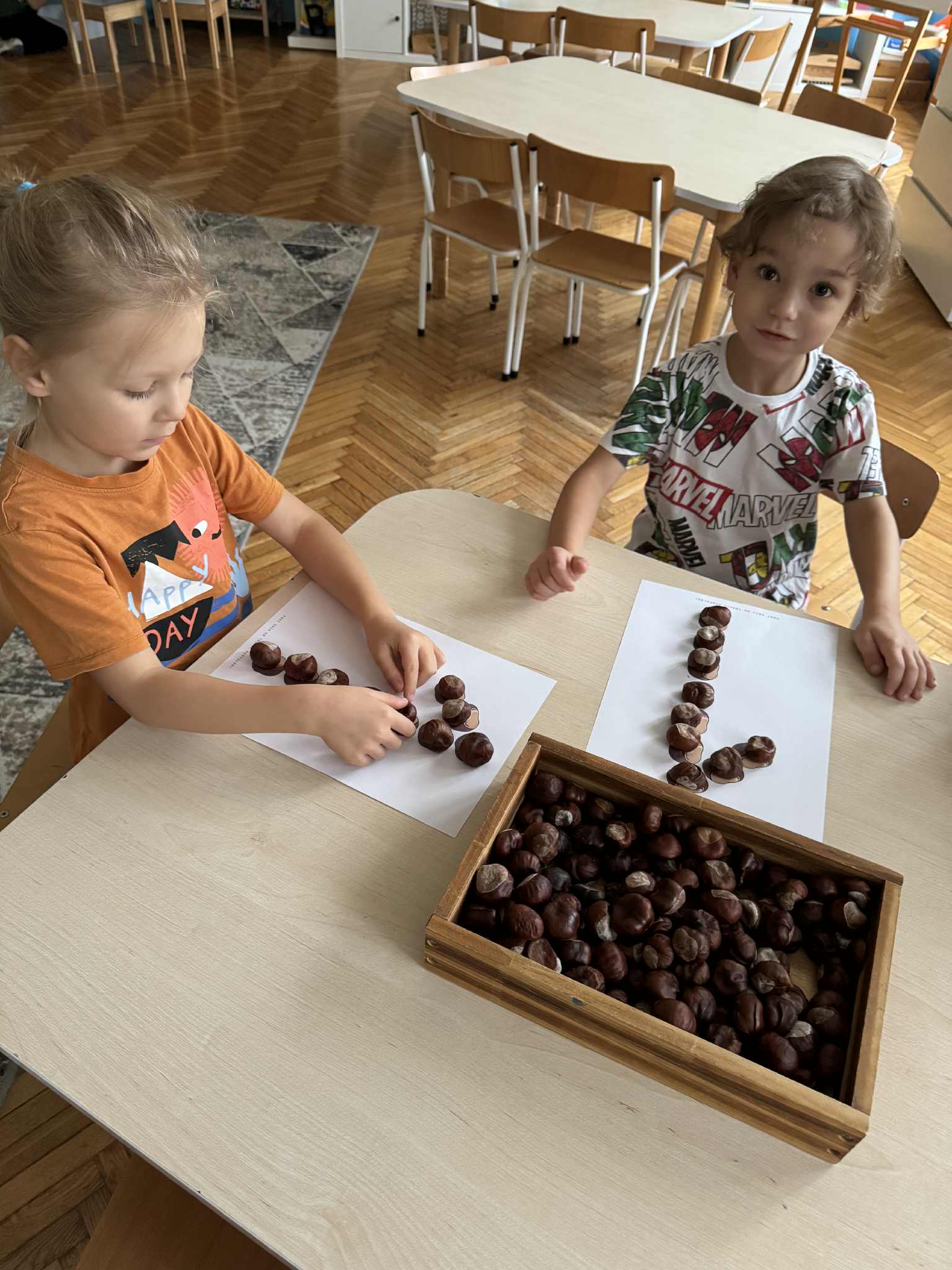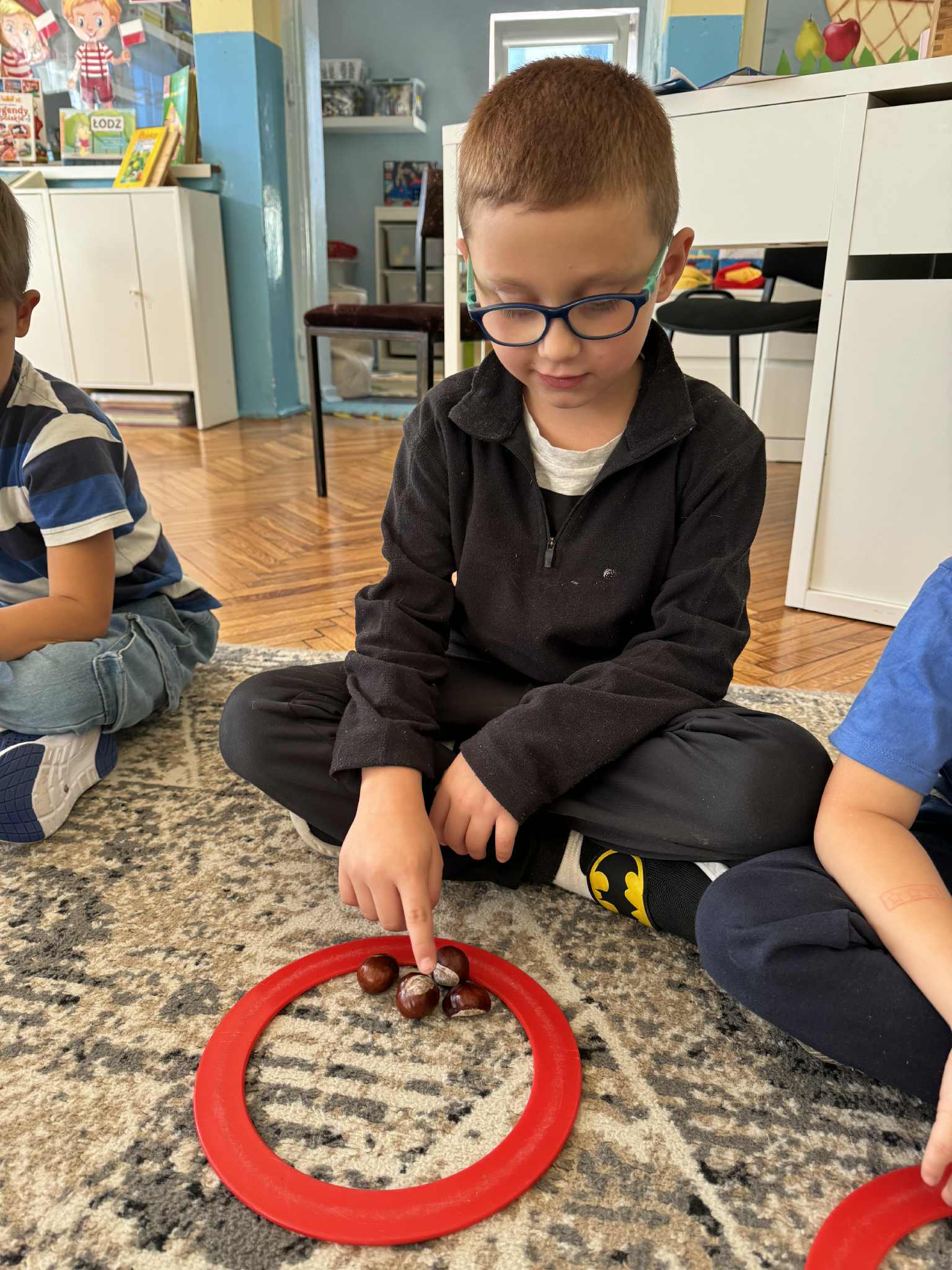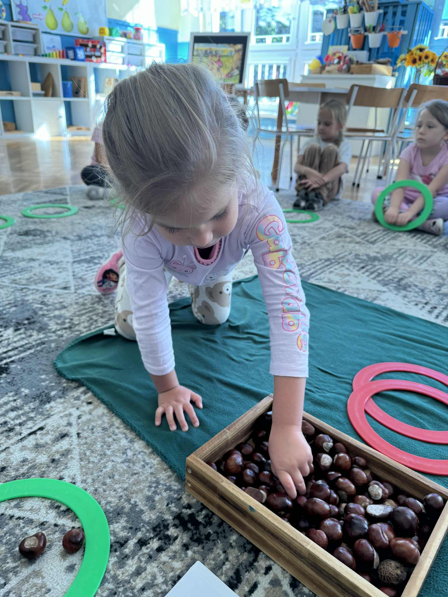 Nasze przedszkolaki uwielbiają zabawy jesiennymi skarbami. Poprzez zabawę uczyły się nazywać cyfry i przeliczać oraz utrwalały nazwy figur geometrycznych. Nie zabrakło również zabawy integrującej grupę pt. ,,Wędrująca dynia’’, której celem było wspólne działanie, wzmocnienie więzi, rozwijanie kreatywności i umiejętności współpracy