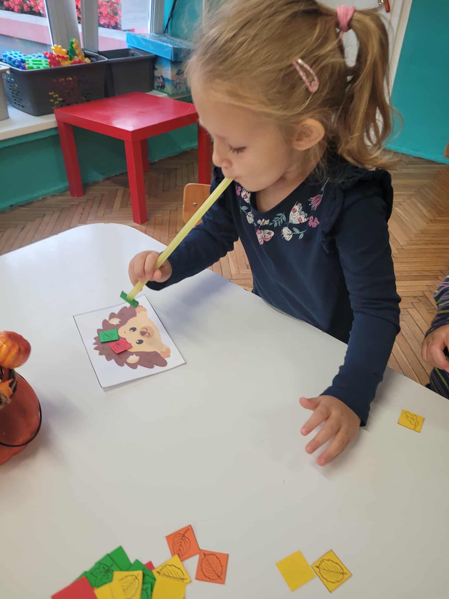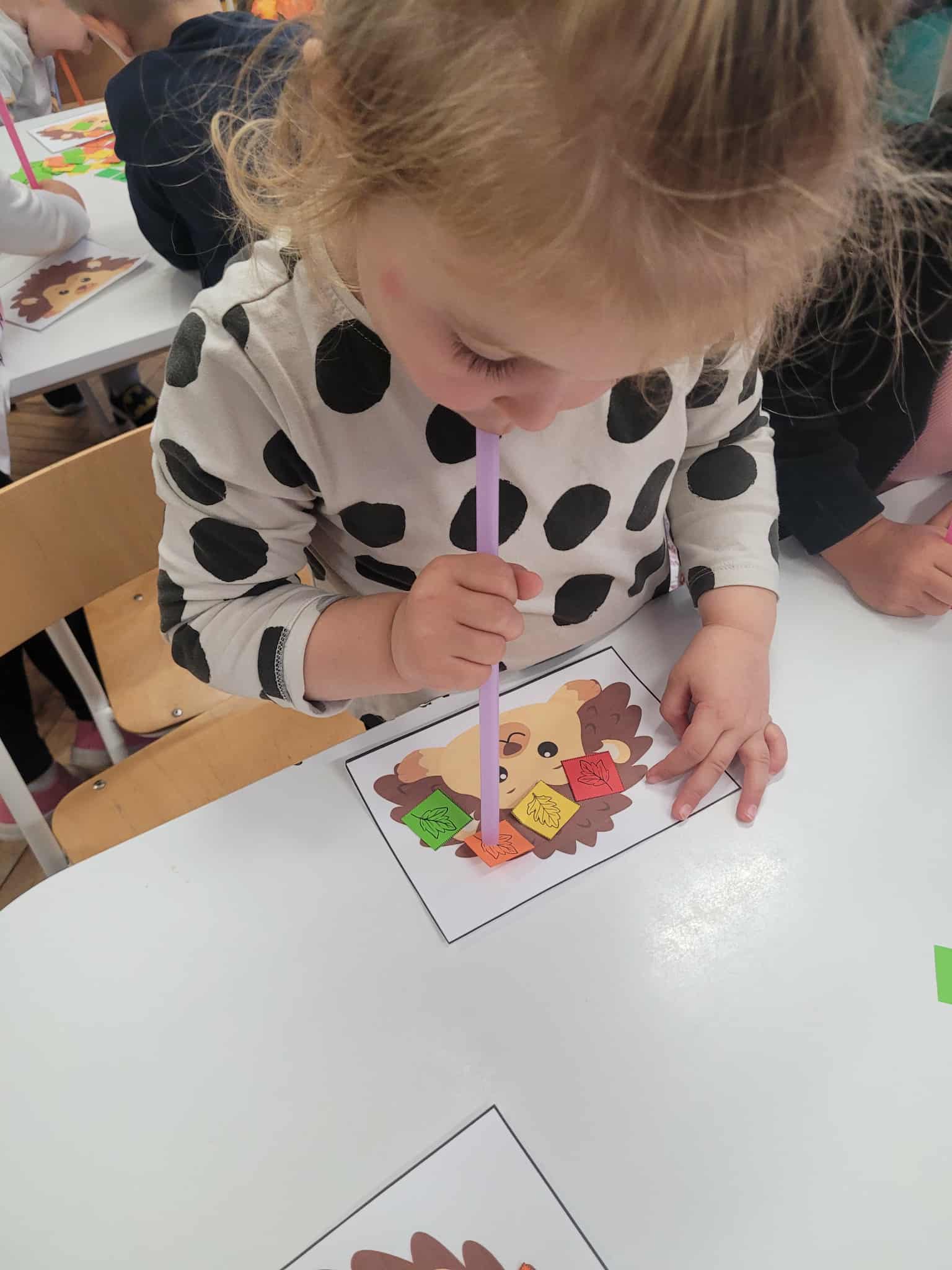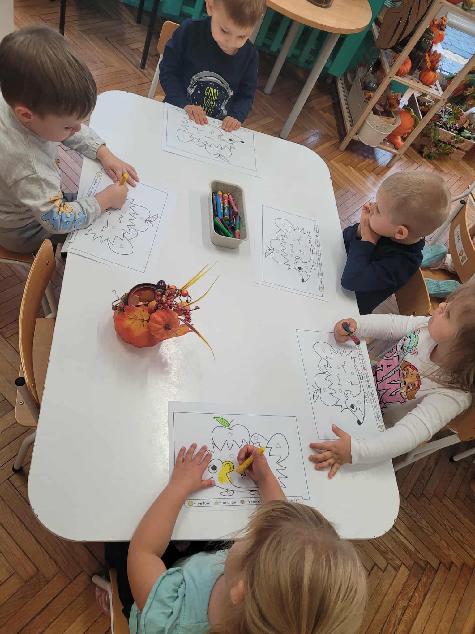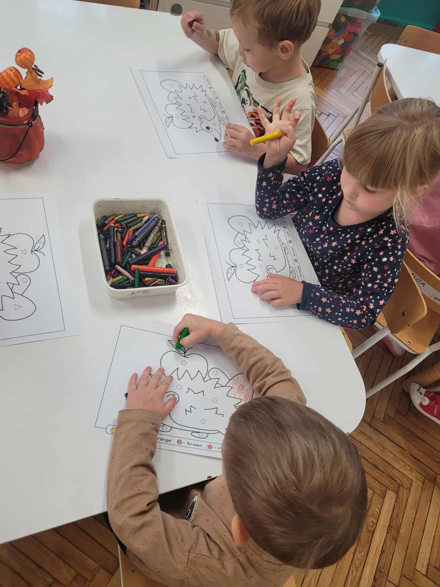 Jesień to przepiękna pora roku mieniąca się pięknymi barwami ale i dobrą słoneczną i ciepłą pogodą. Dlatego dzieci za pomocą ilustracji odkrywały czym różni się lato od jesieni. Nazywają zwiastuny jesieni i potrafia podzielic wyrazy na sylaby. Znają wybrane nazwy drzew parkowych oraz ich owoce. Wiedzą, że nie tylko jeż potrafi kłuć i na podstawie historyjki obrazkowej znają zwyczaje jeży w okresie jesiennym. Poprzez zabawę logopedyczną przykrywały kołderką z liści zasypiającego jeża. Odkodowywały róznież rysunek kolczastego przyjaciela.