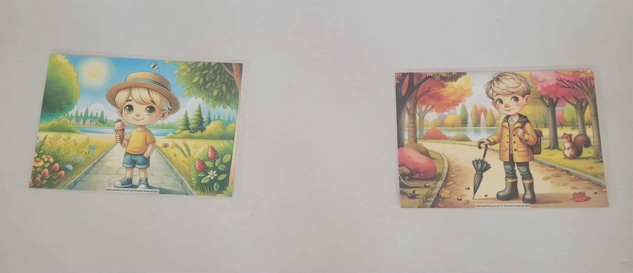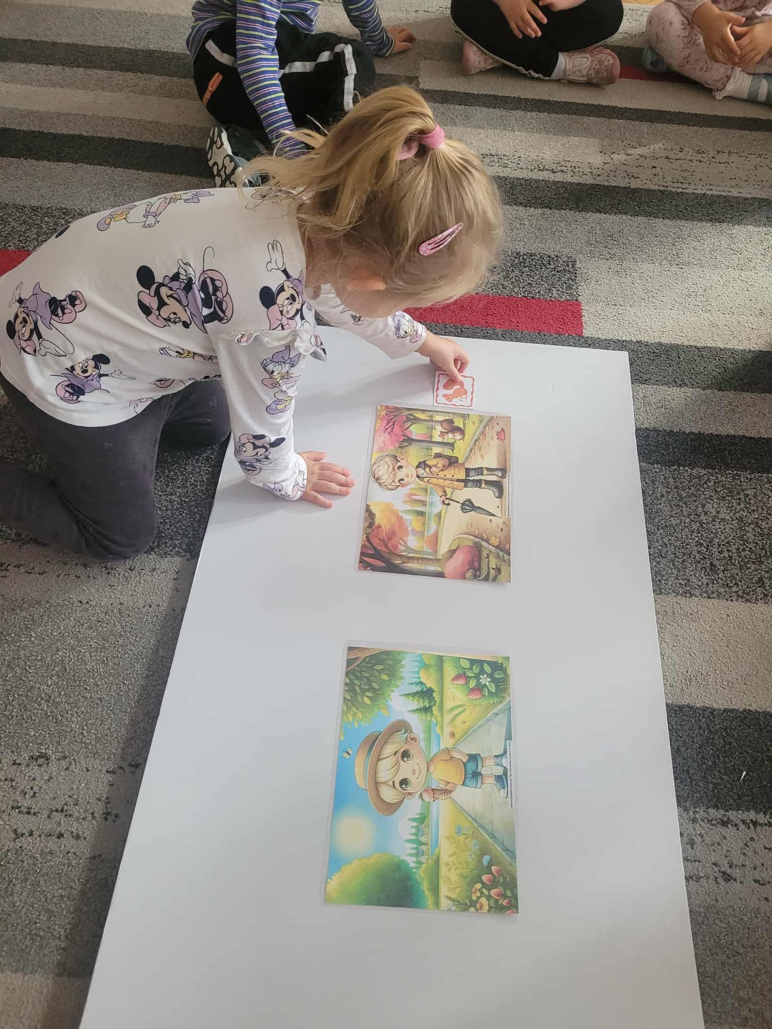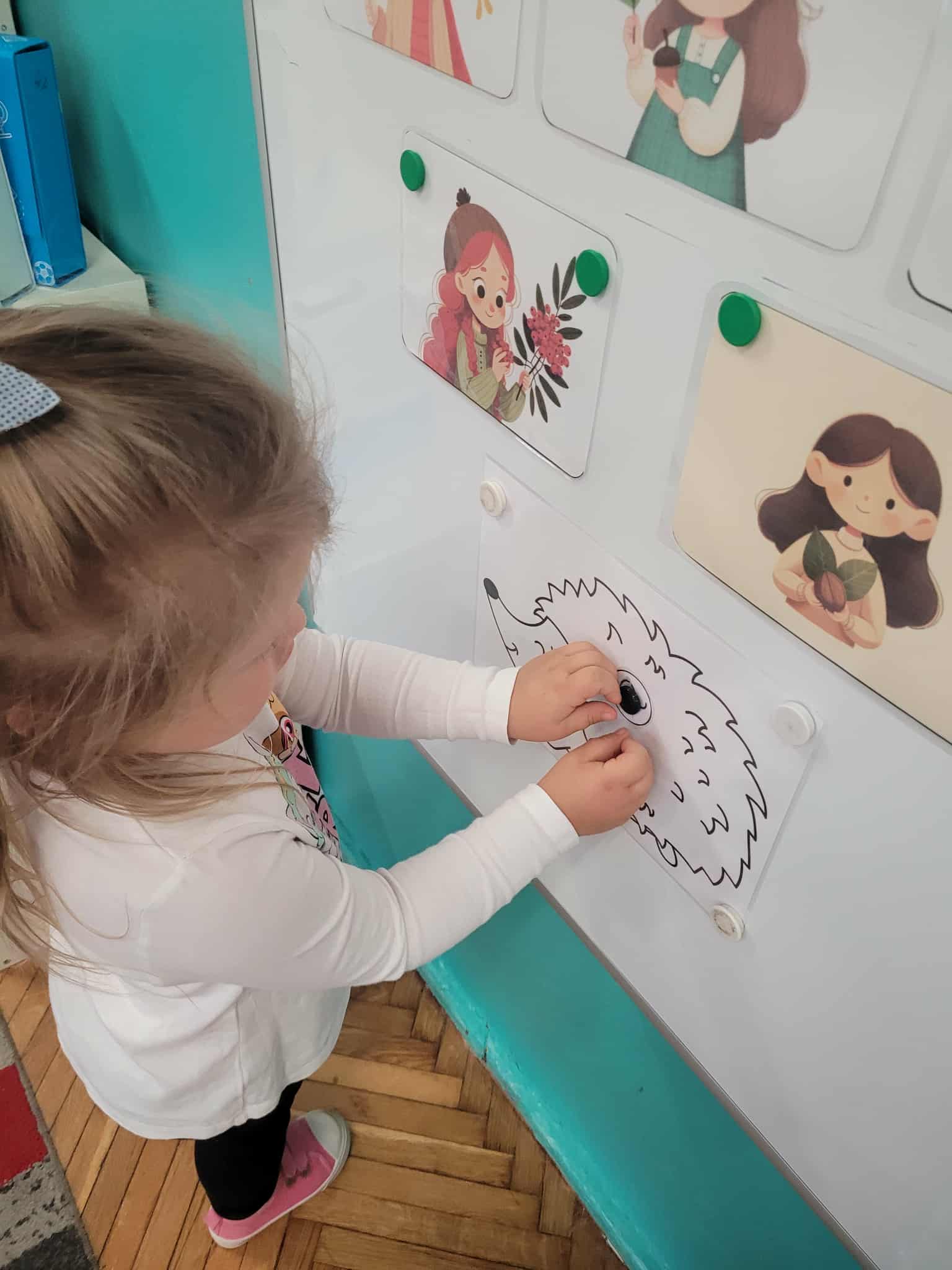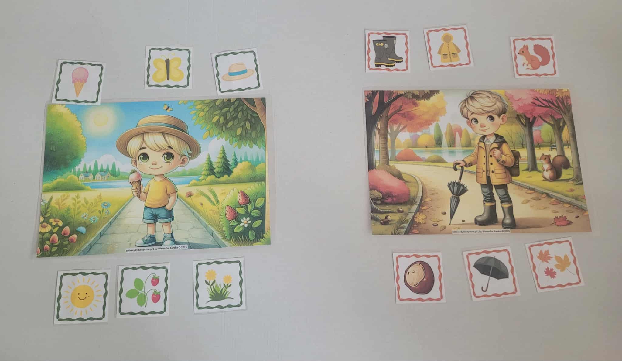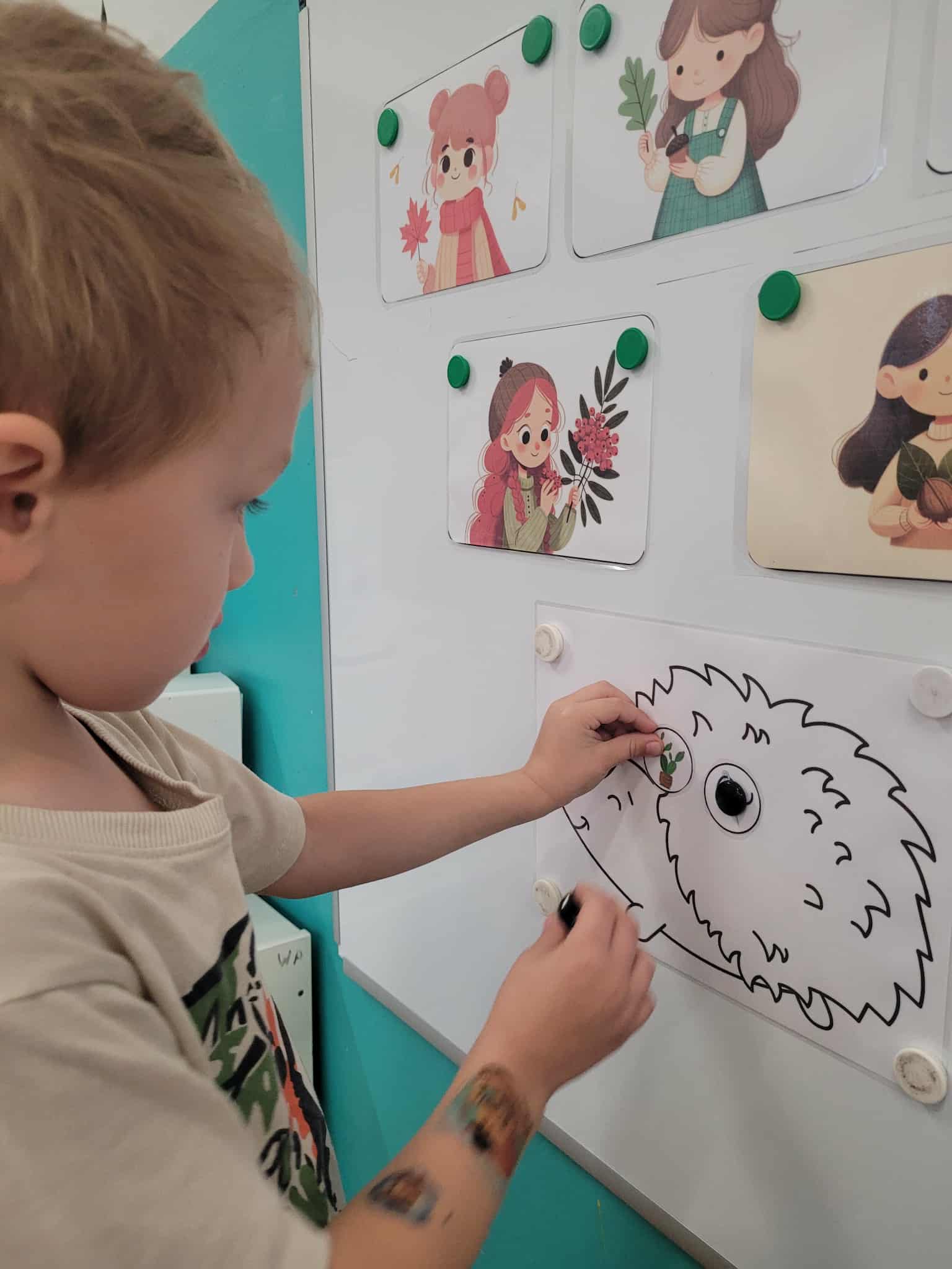 Jesień to przepiękna pora roku mieniąca się pięknymi barwami ale i dobrą słoneczną i ciepłą pogodą. Dlatego dzieci za pomocą ilustracji odkrywały czym różni się lato od jesieni. Nazywają zwiastuny jesieni i potrafia podzielic wyrazy na sylaby. Znają wybrane nazwy drzew parkowych oraz ich owoce. Wiedzą, że nie tylko jeż potrafi kłuć i na podstawie historyjki obrazkowej znają zwyczaje jeży w okresie jesiennym. Poprzez zabawę logopedyczną przykrywały kołderką z liści zasypiającego jeża. Odkodowywały róznież rysunek kolczastego przyjaciela.