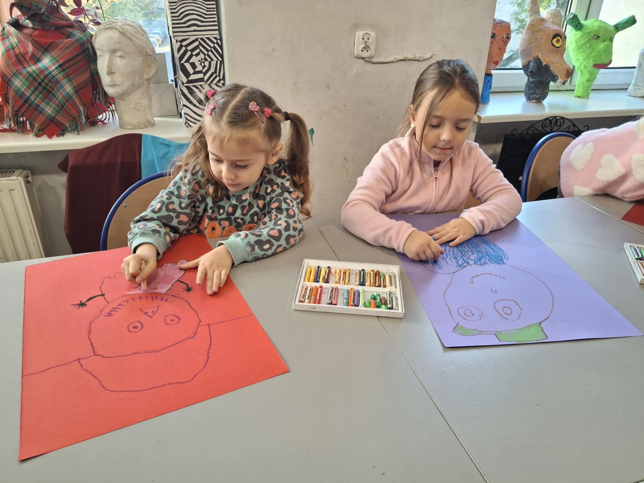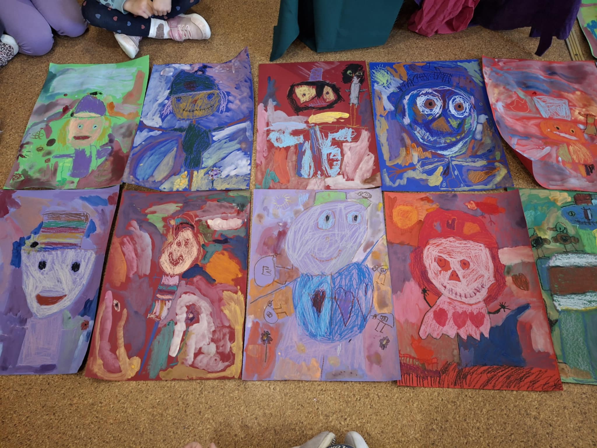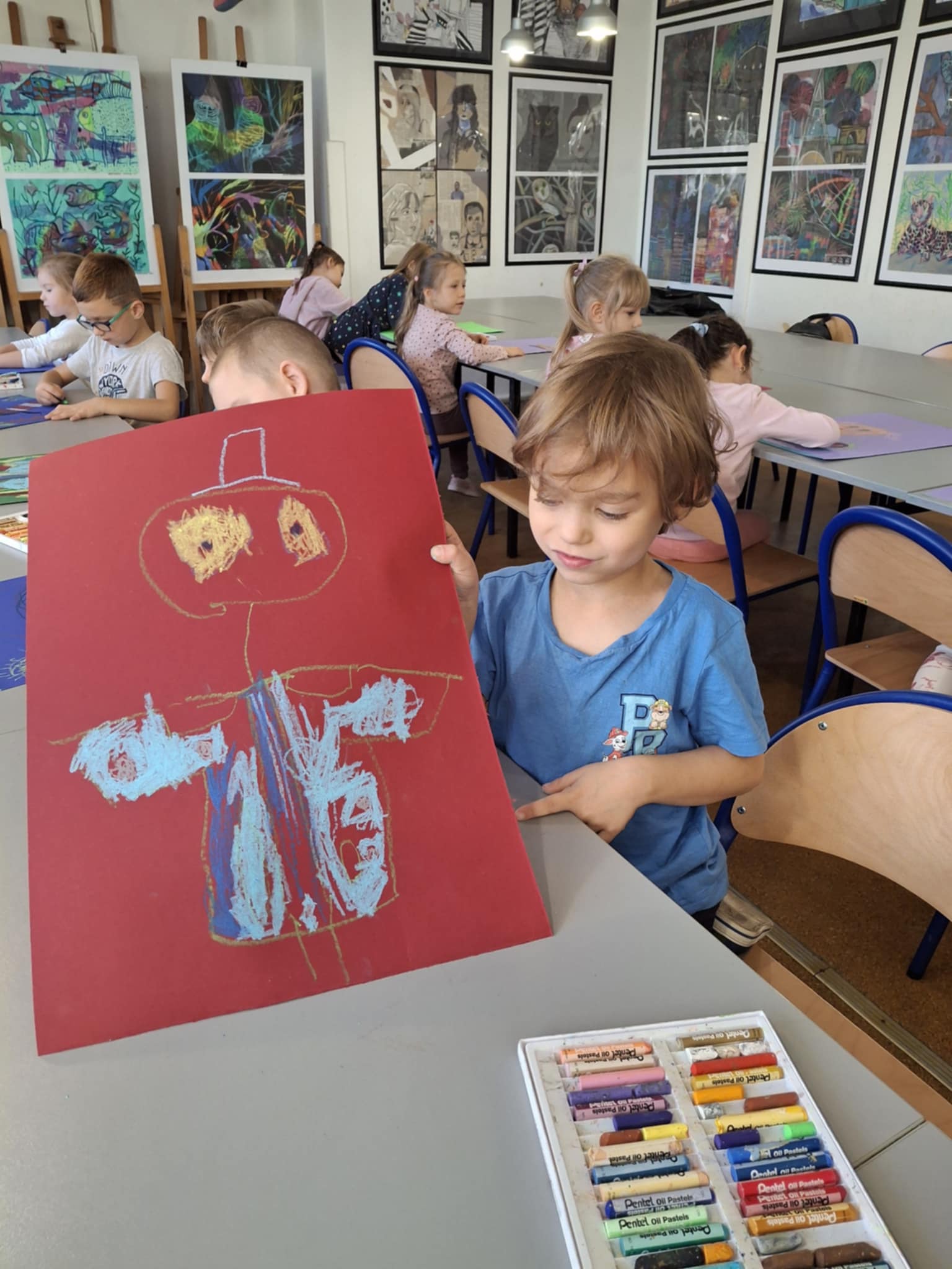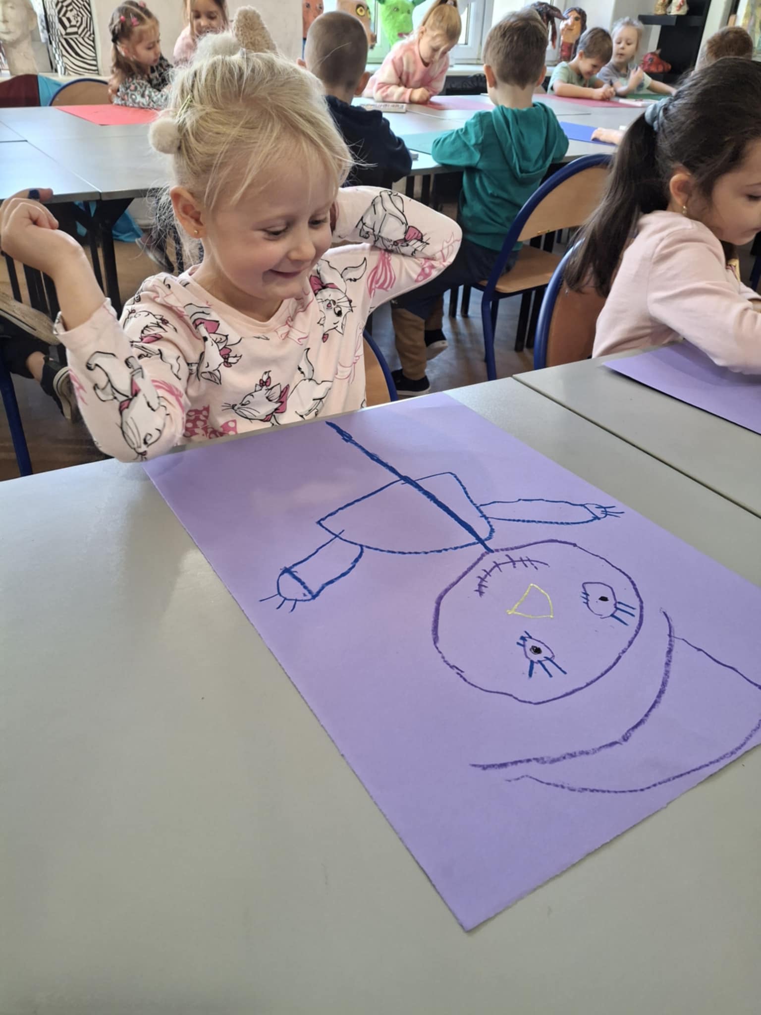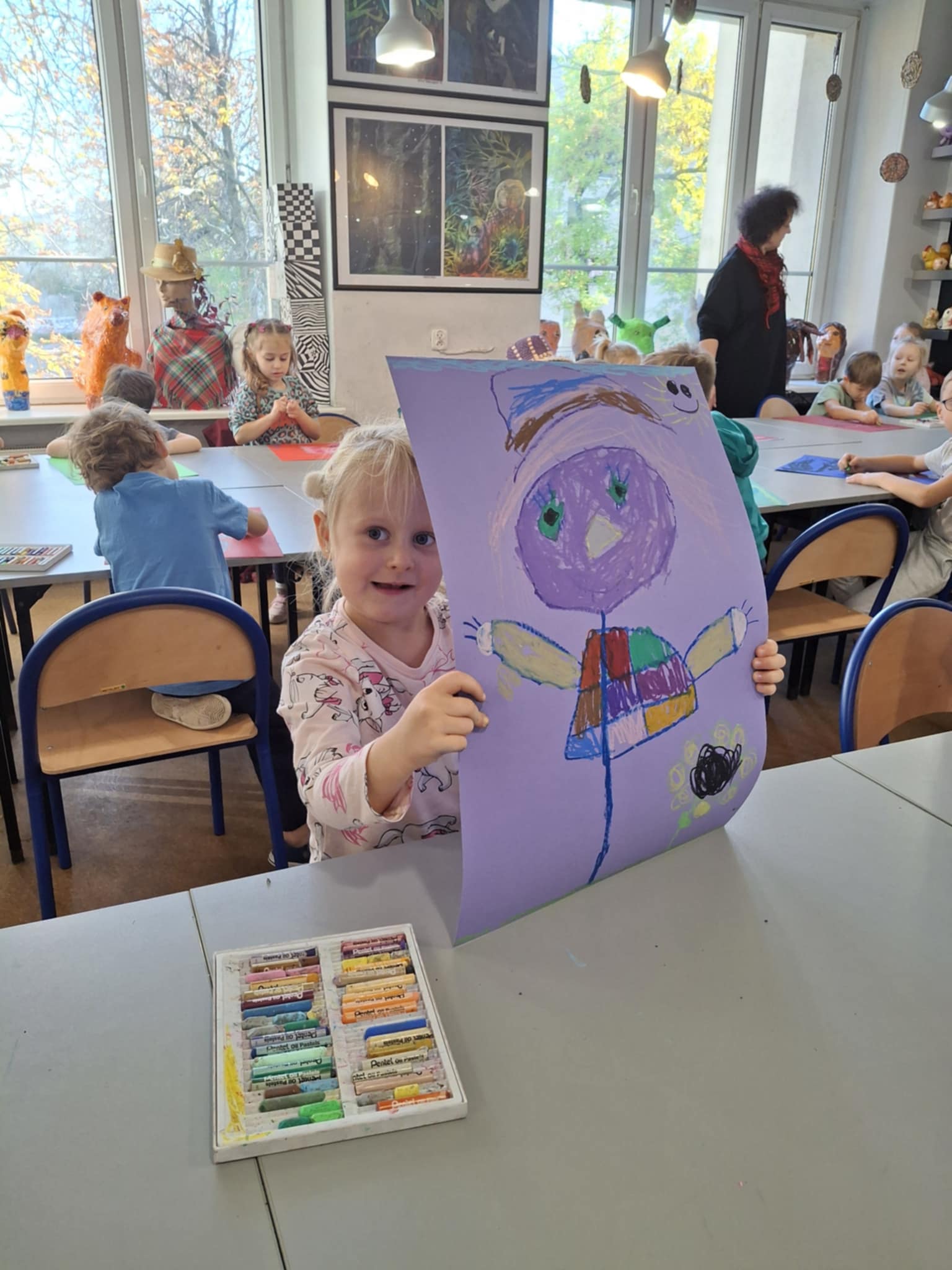 Pewien kolorowy strach na wróble stał w polu,odstraszał wróble i szpaki przez całą wiosnę i lato. Ale nadeszła już jesień. Plony zostały zebrane i strach zaczynał się nudzić. Szukał i znalazł przyjaciół wśród dzieci.Tak wyobraziły sobie dzieci ,,Kolorowego stracha na wróble,,.