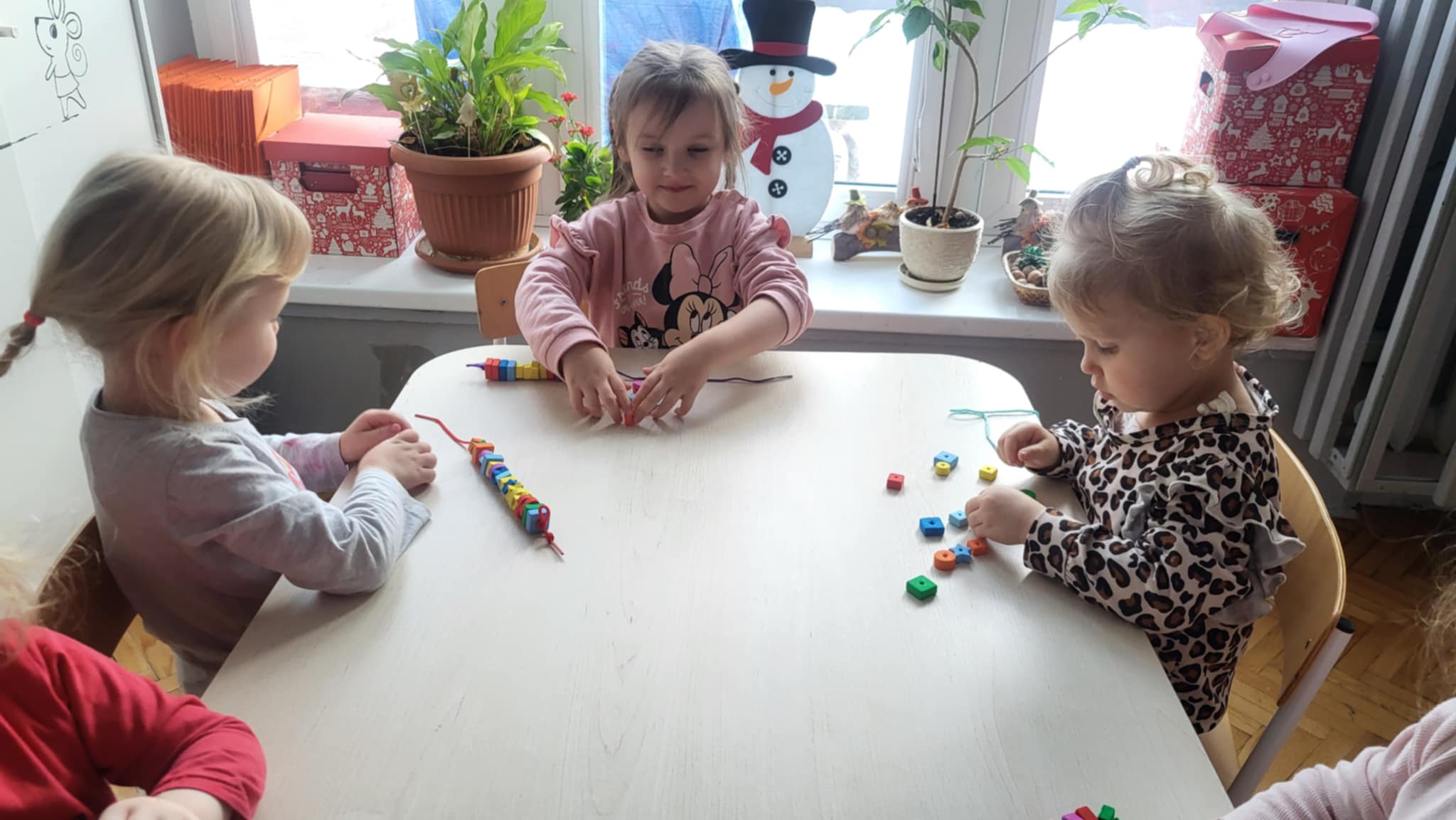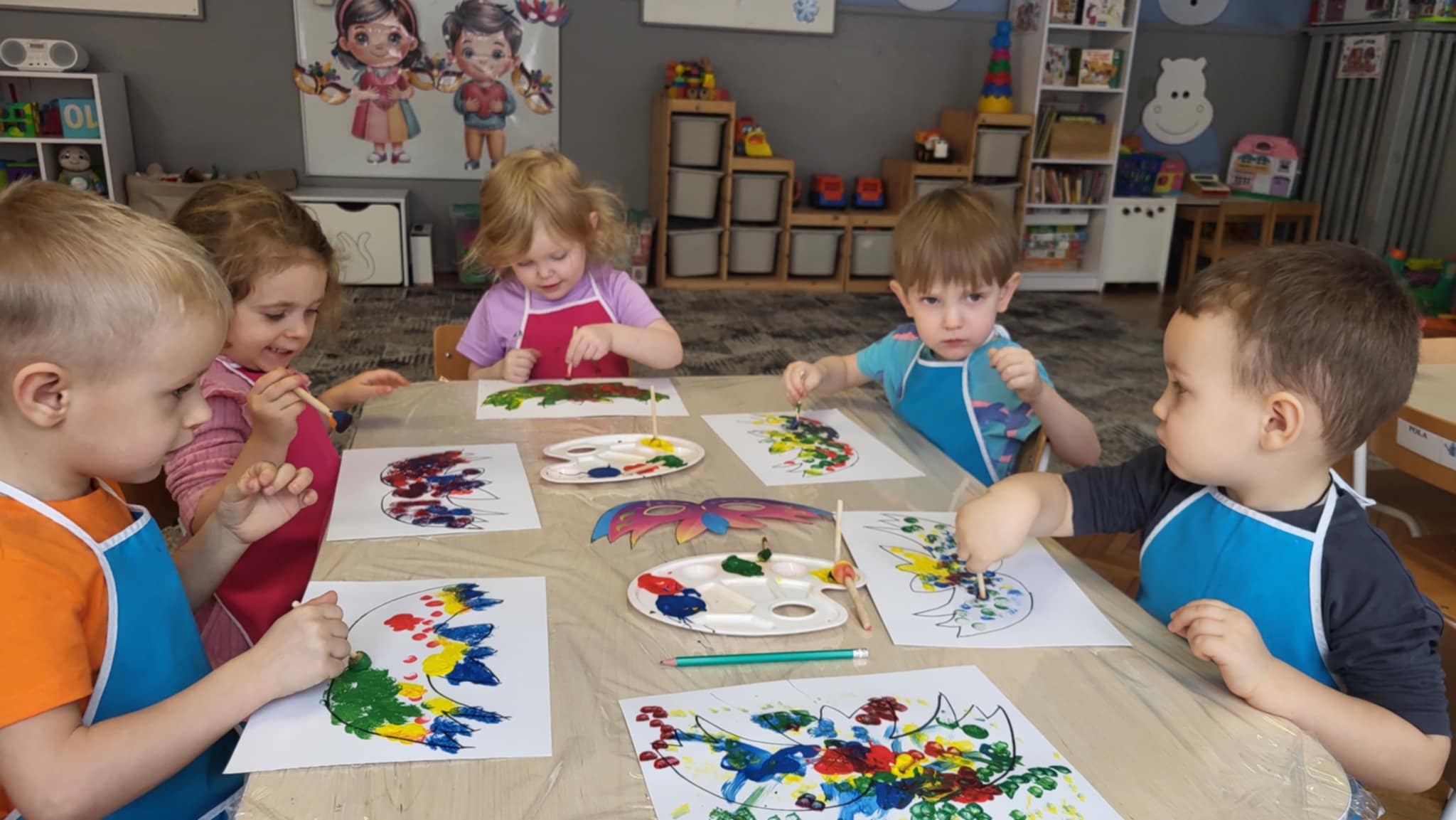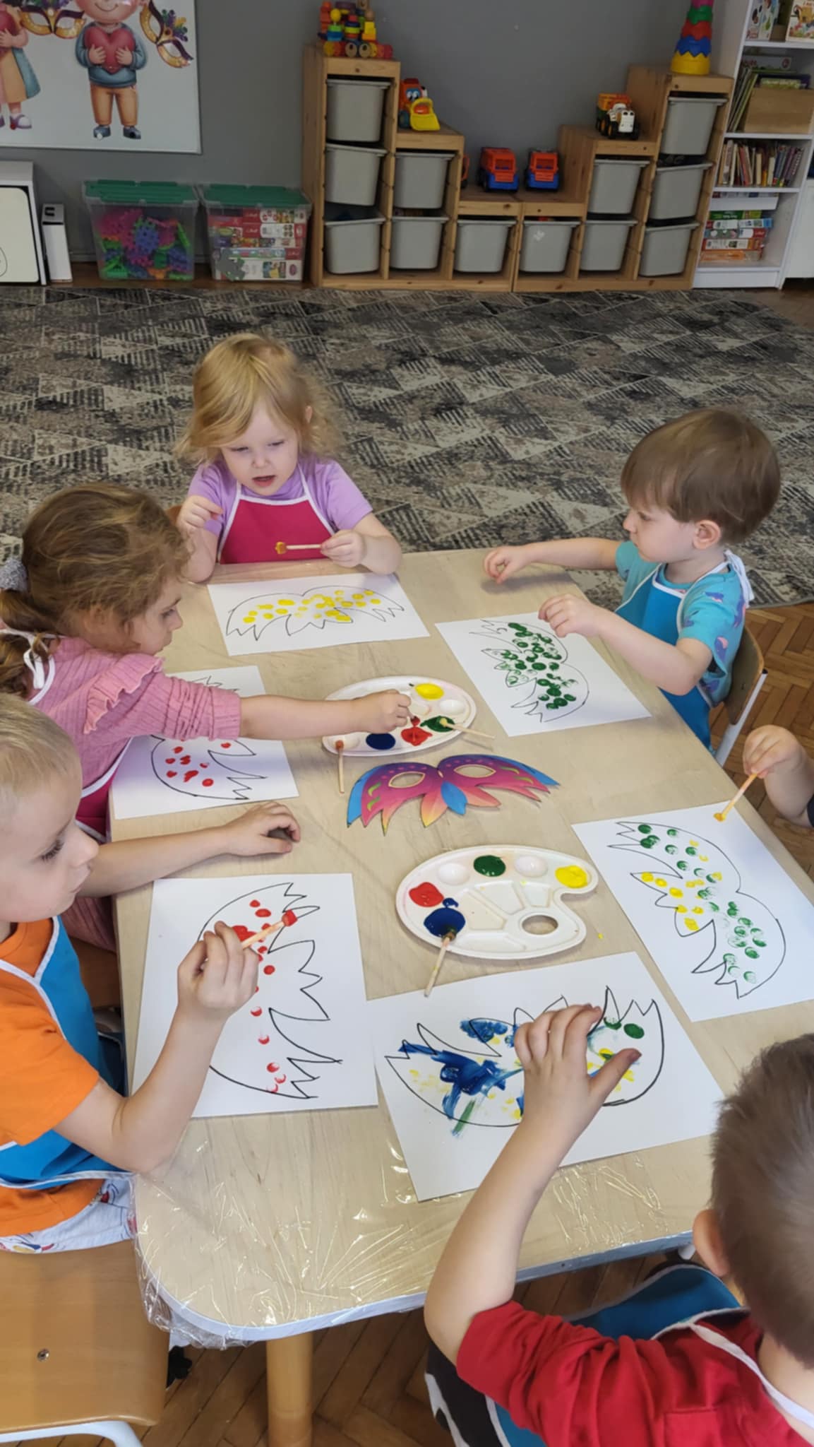 Dzieci z pierwszej grupy szykują się do balu karnawałowego przygotowując maski oraz korale