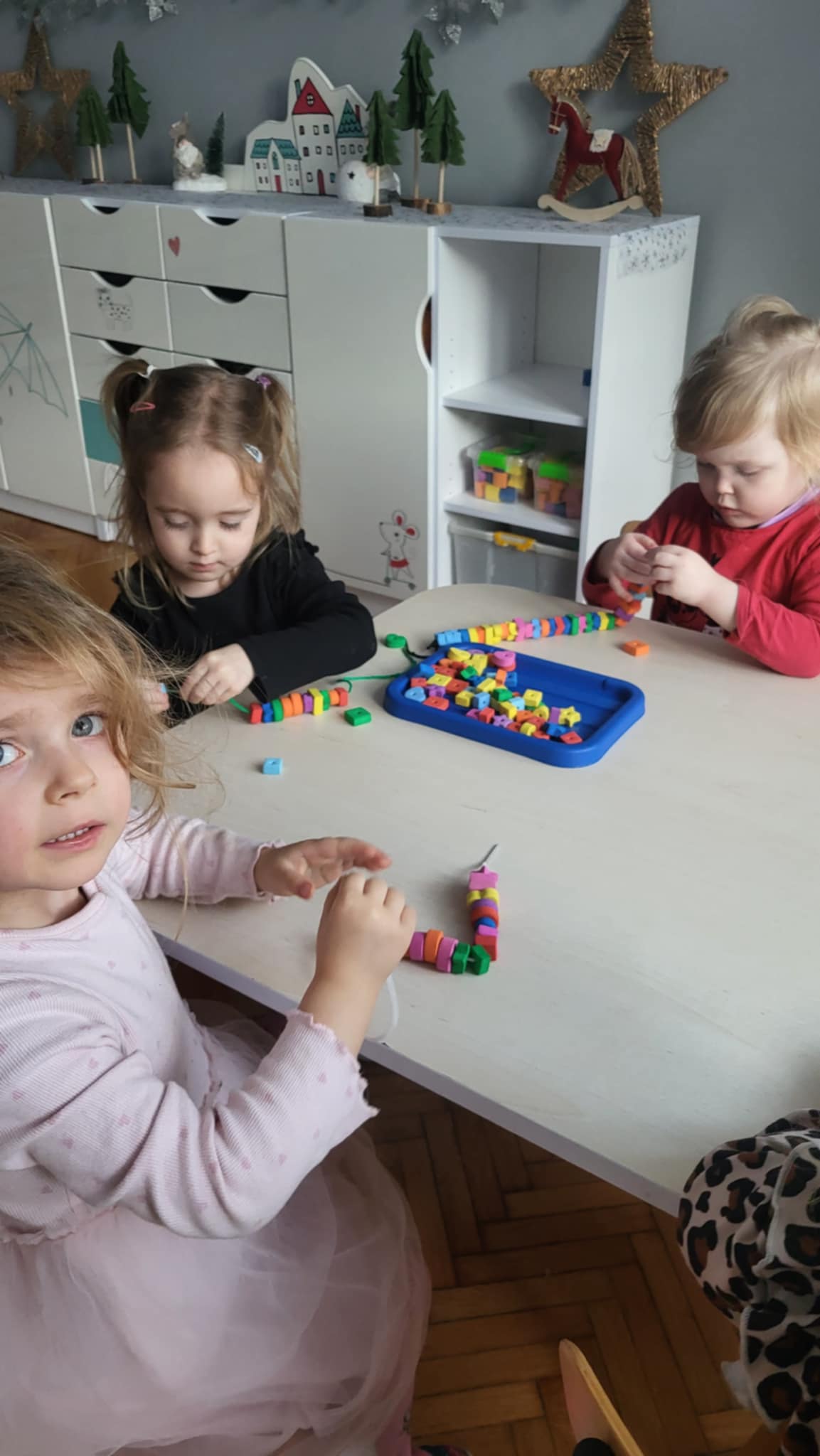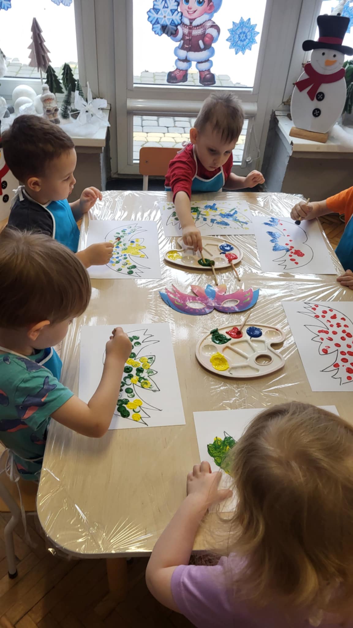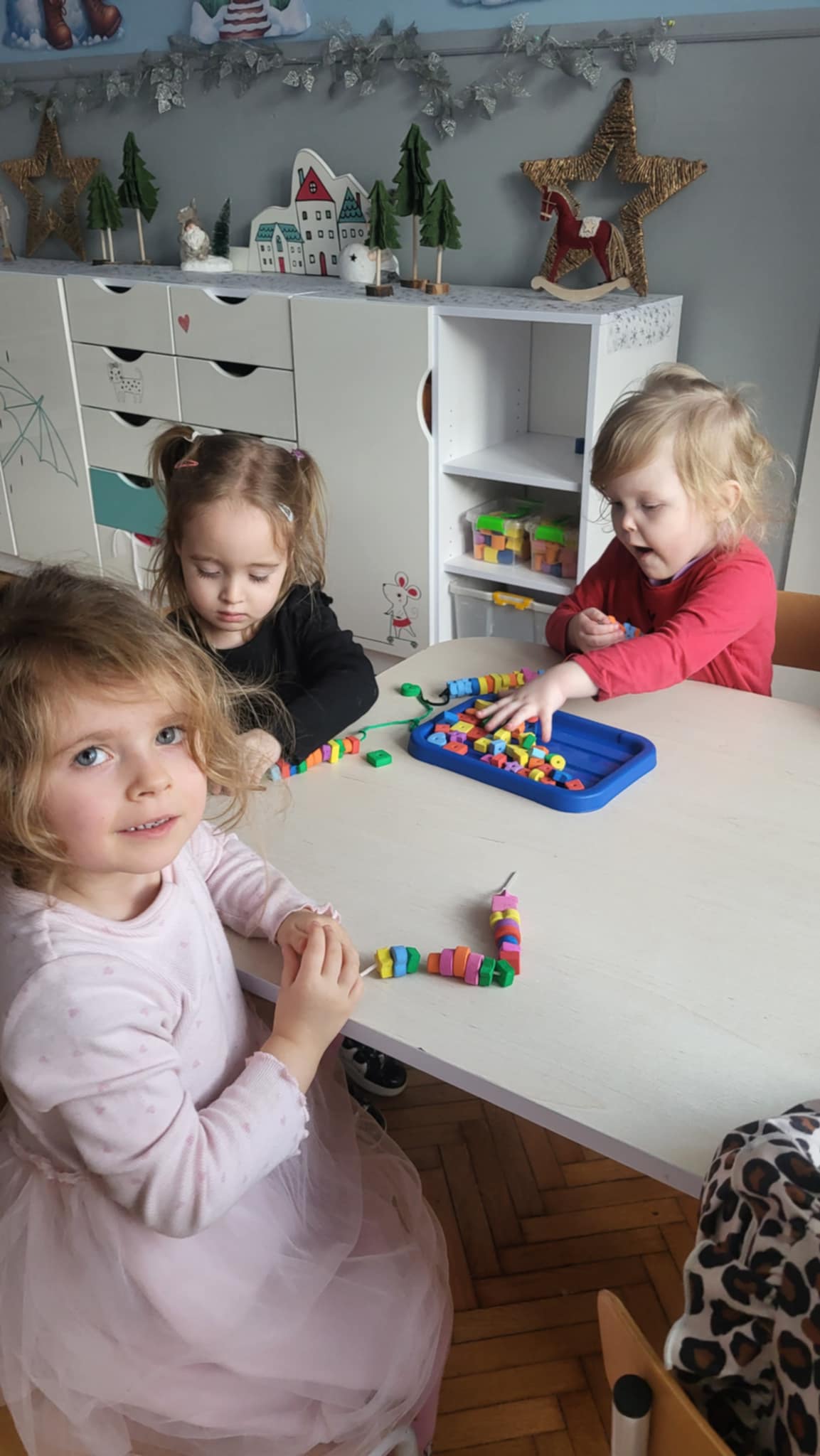 Dzieci z pierwszej grupy szykują się do balu karnawałowego przygotowując maski oraz korale