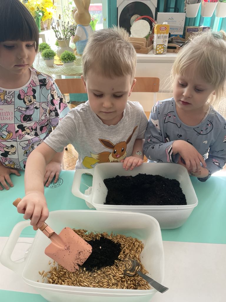 Lepienie z masy solnej to wspaniała rozrywka, która wspomaga rozwój dziecka. Zabawy ciastem solnym wpływają na doskonalenie sprawności rąk, pobudzają wyobraźnię, kształtują twórcze myślenie i wrażliwość zmysłową oraz kształtują umiejętności plastyczne i motorykę małą przedszkolaków. Dzieci poznały przepis na masę solną,wyrabiały ciasto oraz wykonały piękne koguty. Następnie zamieniając się w ogrodników - sadziły owies.