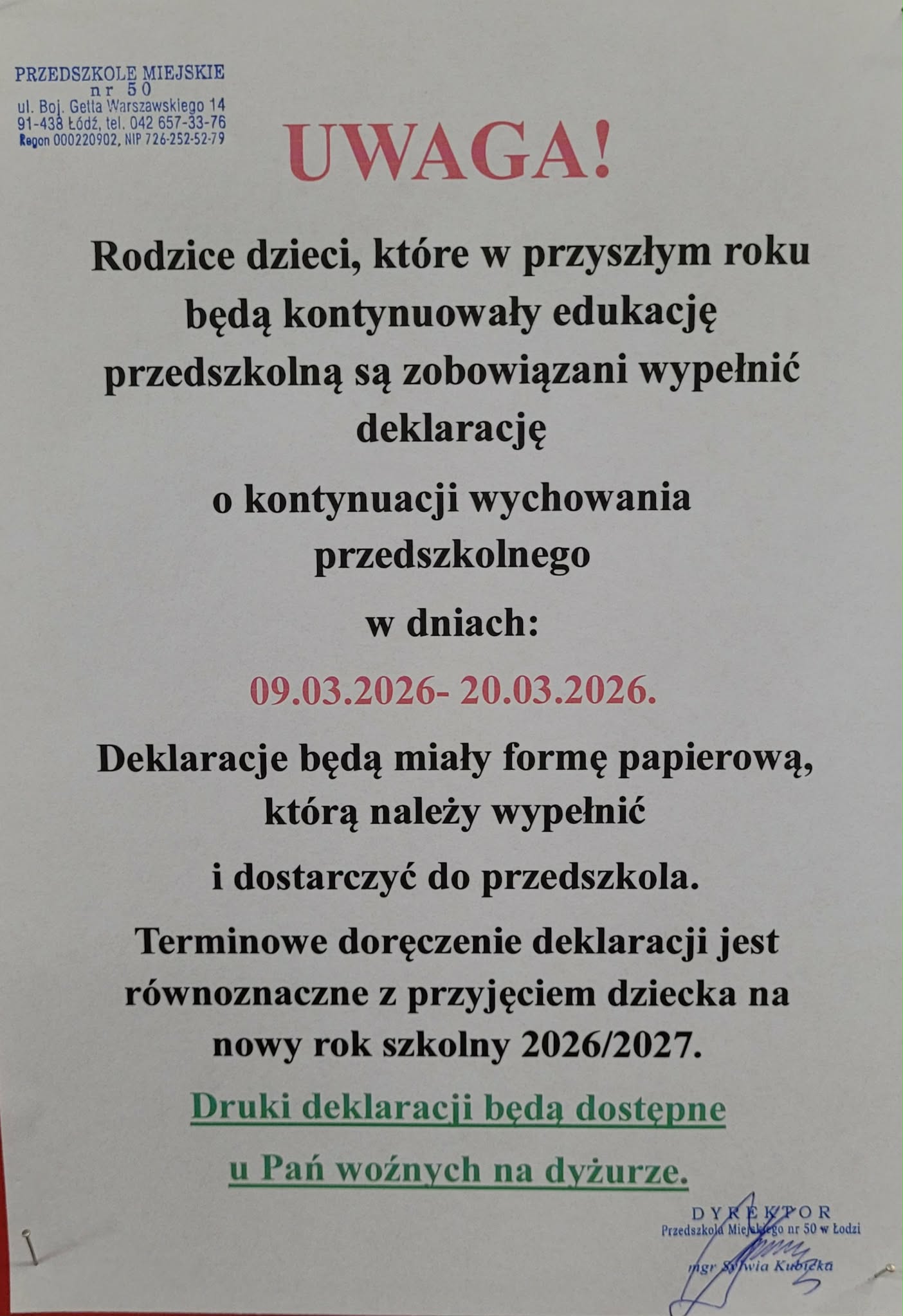 Rodzice dzieci, które w przyszłym roku będą kontynuowały edukację przedszkolną sa zobowiazani wypełnić deklarację o kontynuacji wychowania przedszkolnego w dniach 09.03.2026 - 20.03.2026. Deklarację bedą miały formę papierową, którą należy wypełnić i dostarczyć do przedszkola. Terminowe dostarczenie deklaracji jest równoznaczne z przyjęciem dziecka na nowy rok szkolny 2026/2027. Druki deklaracji będą dostępne u Pań woźnych w szatni na dyżurze.