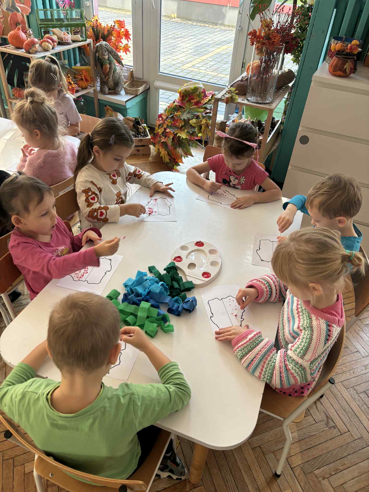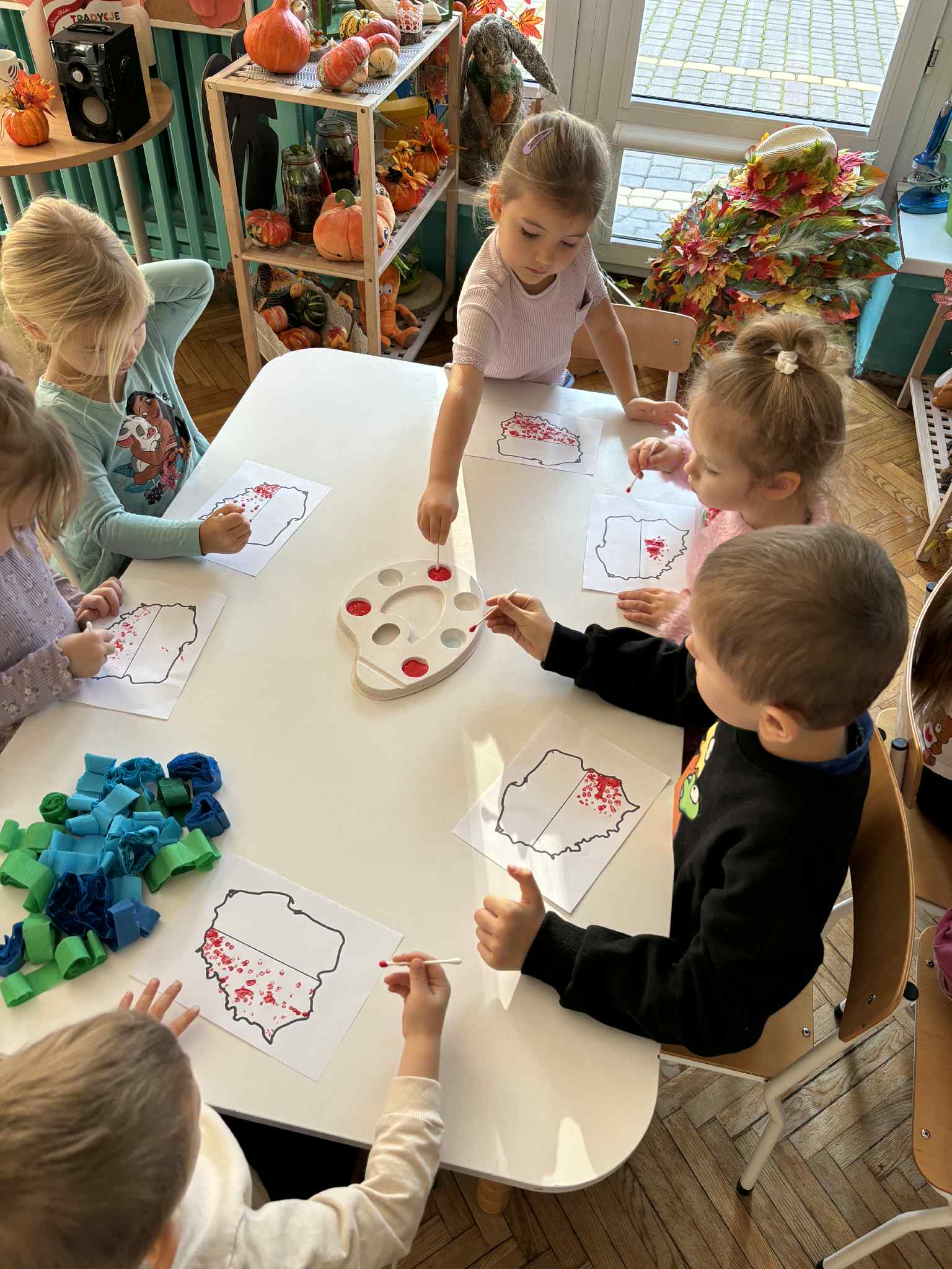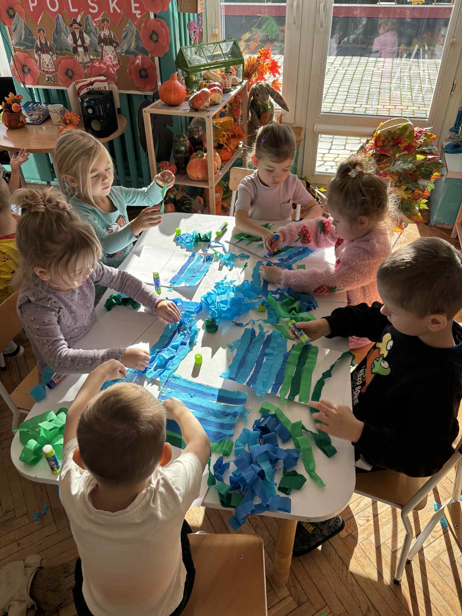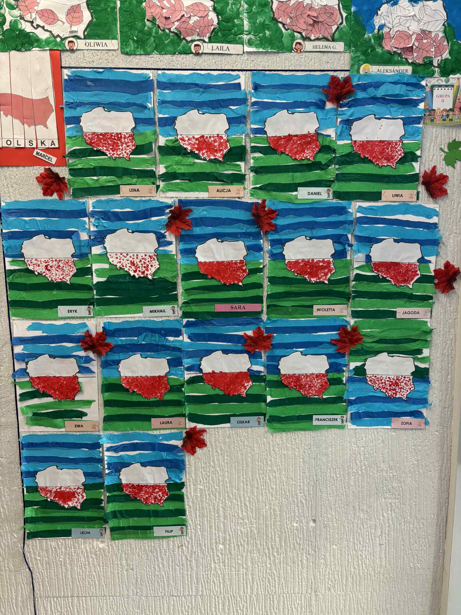 Na zajęciach plastycznych tworzyliśmy krajobraz naszego kraju-od błękitnego morza aż po zielone łąki. Dzieci wyklejały tło paskami bibuły, tworząc barwna mapę. Na środku pojawiła się biało-czerwona mapa Polski. To była wspaniała lekcja patriotyzmu przez sztukę- pełna zaangażowania, emocji i kreatywności