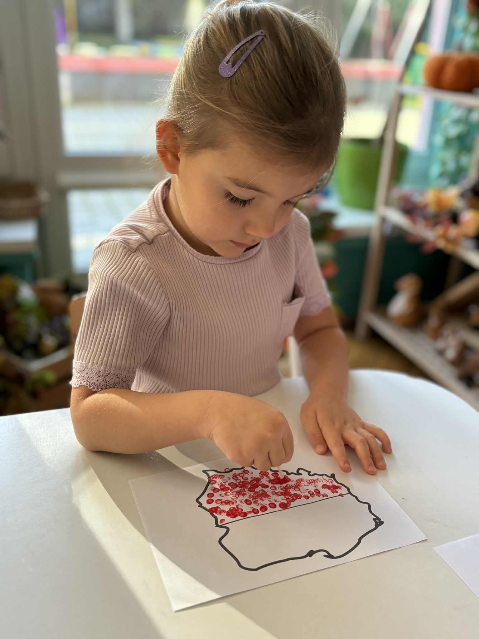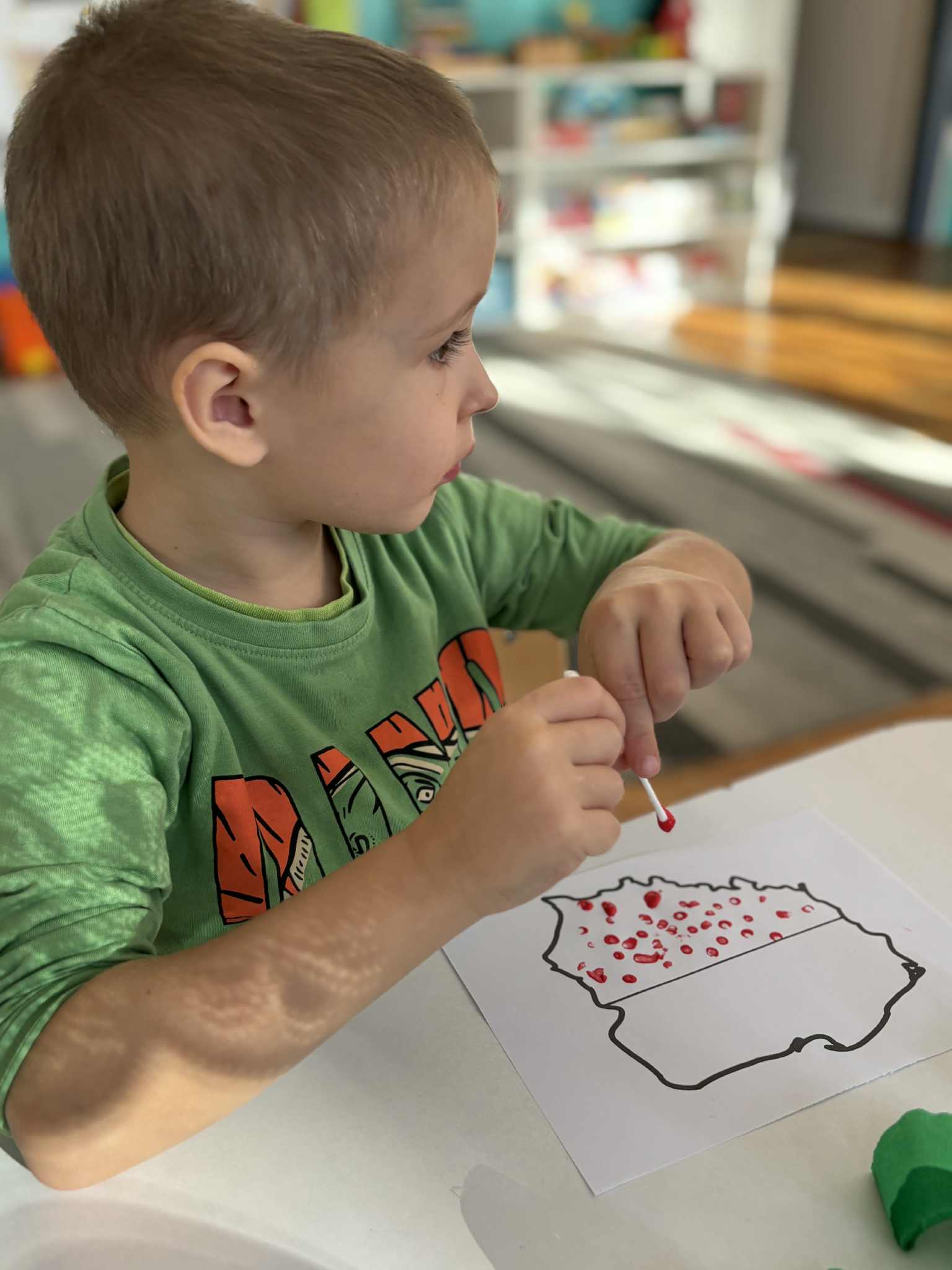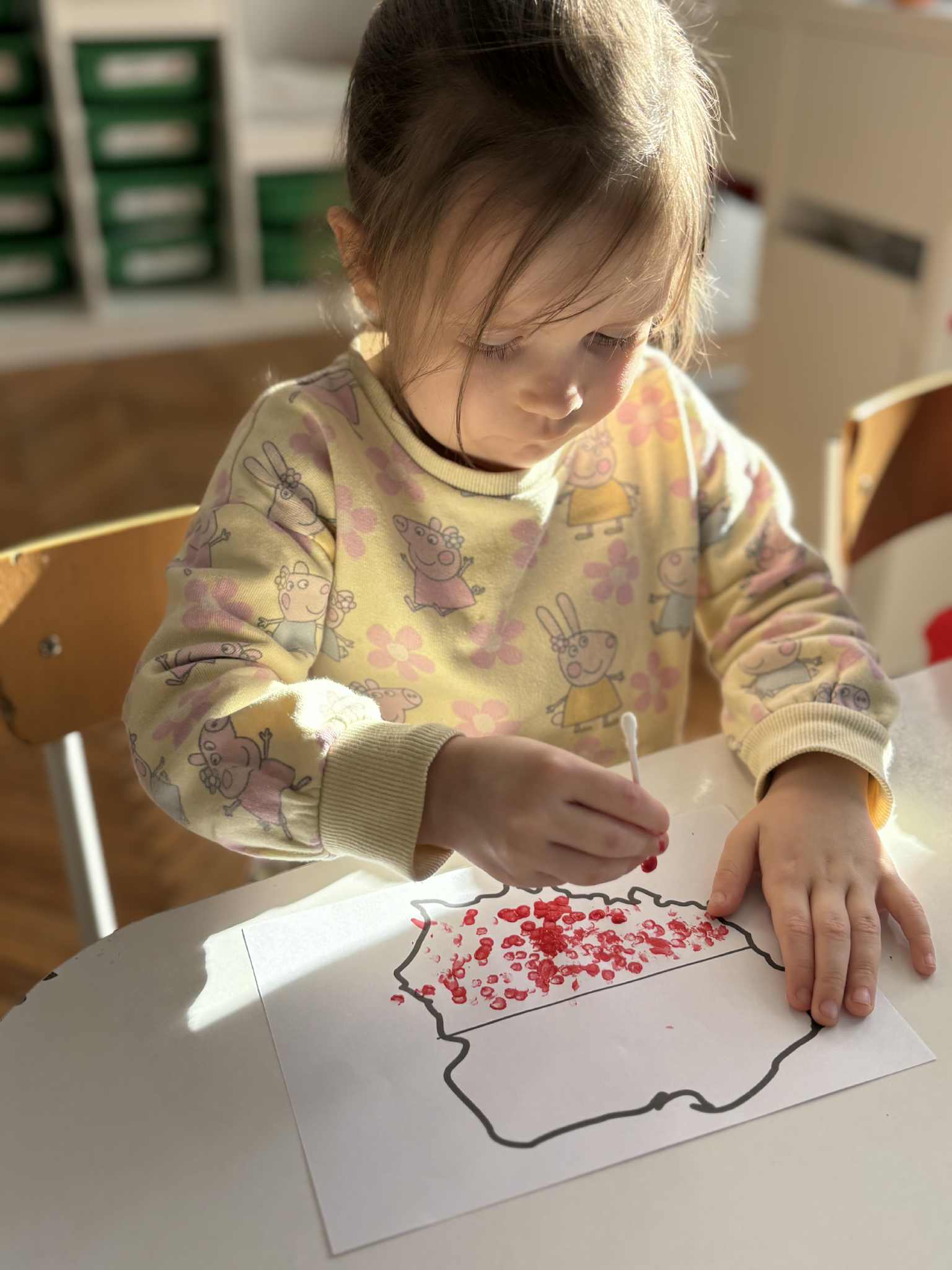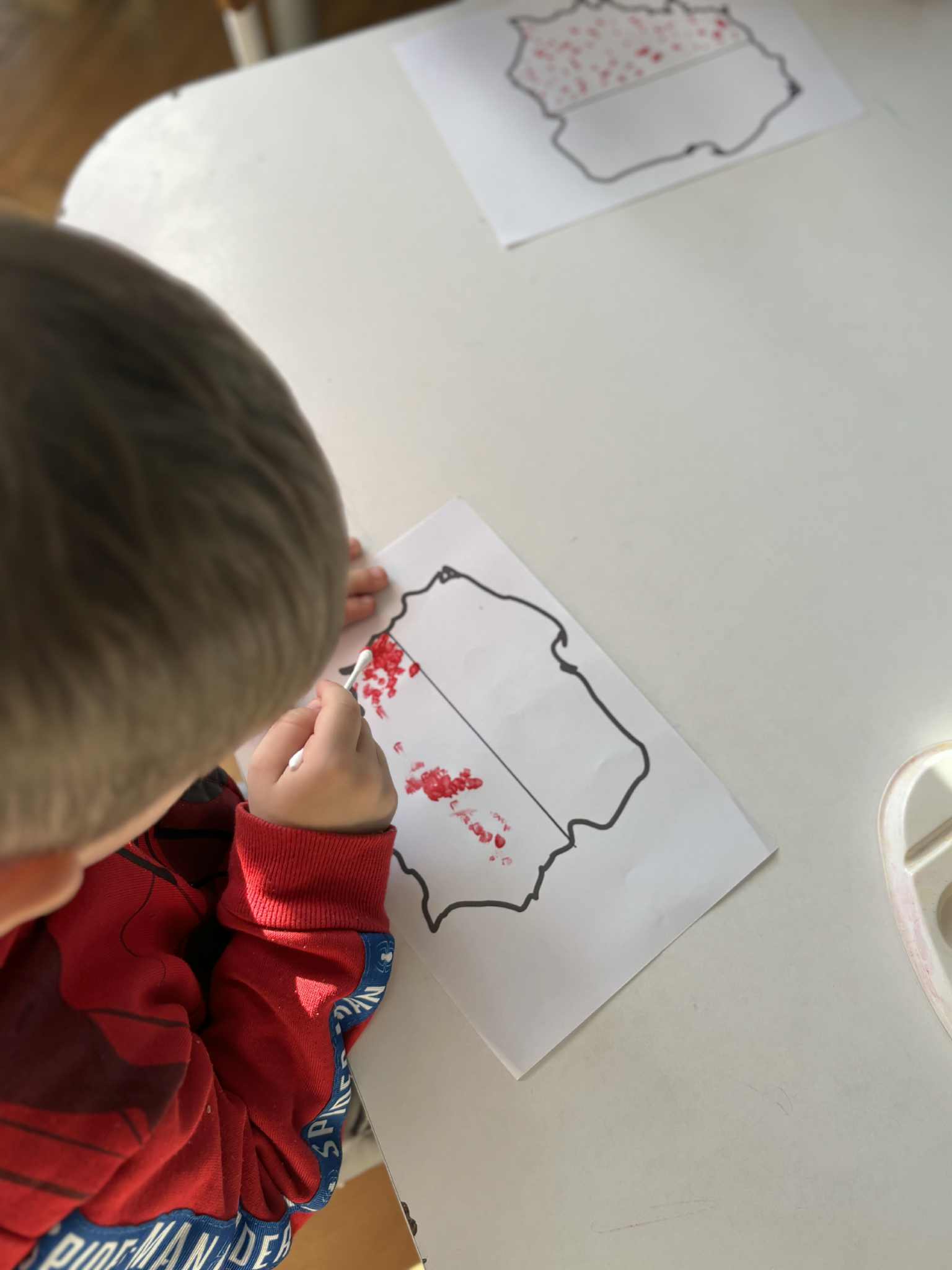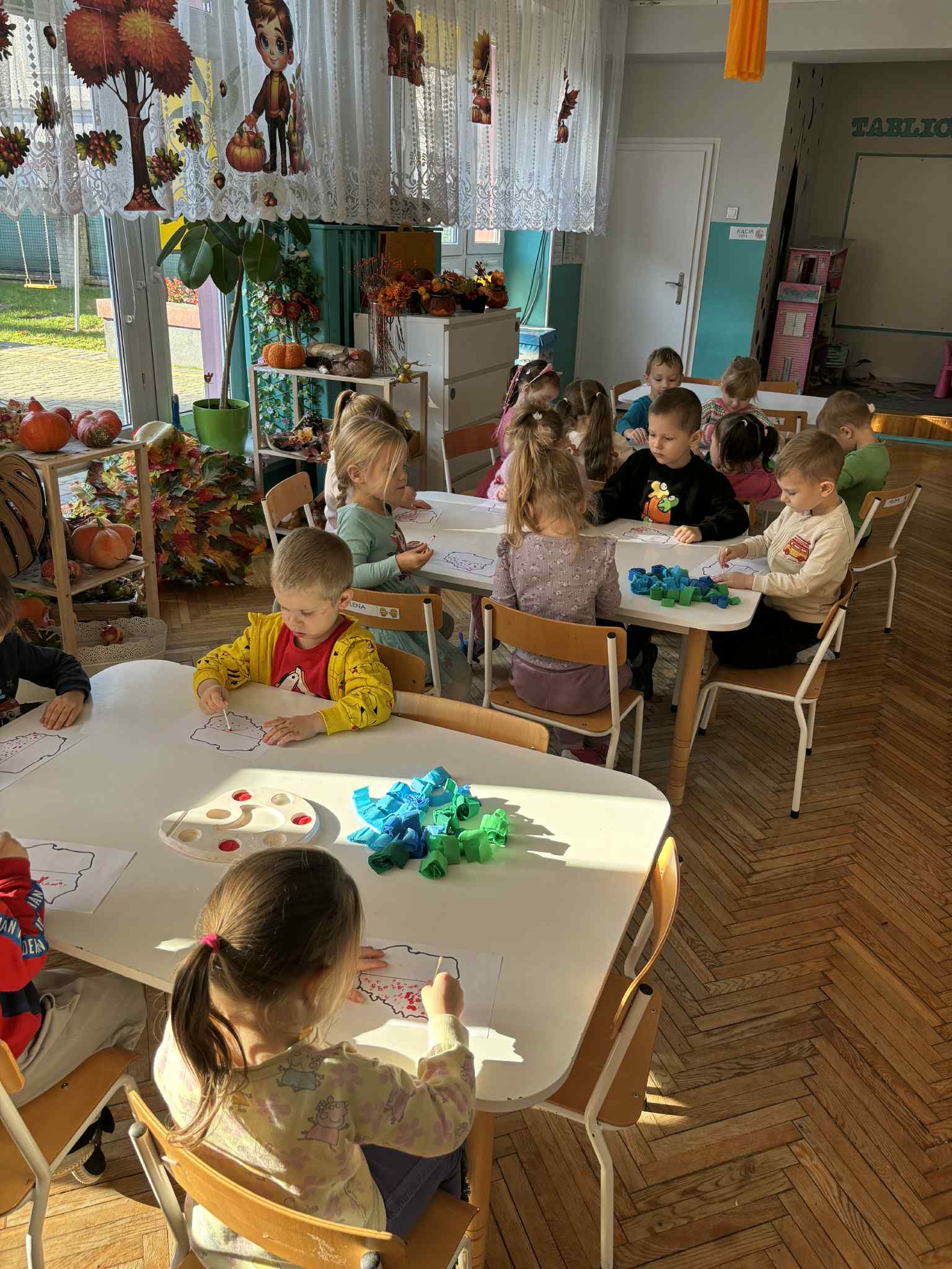 Na zajęciach plastycznych tworzyliśmy krajobraz naszego kraju-od błękitnego morza aż po zielone łąki. Dzieci wyklejały tło paskami bibuły, tworząc barwna mapę. Na środku pojawiła się biało-czerwona mapa Polski. To była wspaniała lekcja patriotyzmu przez sztukę- pełna zaangażowania, emocji i kreatywności