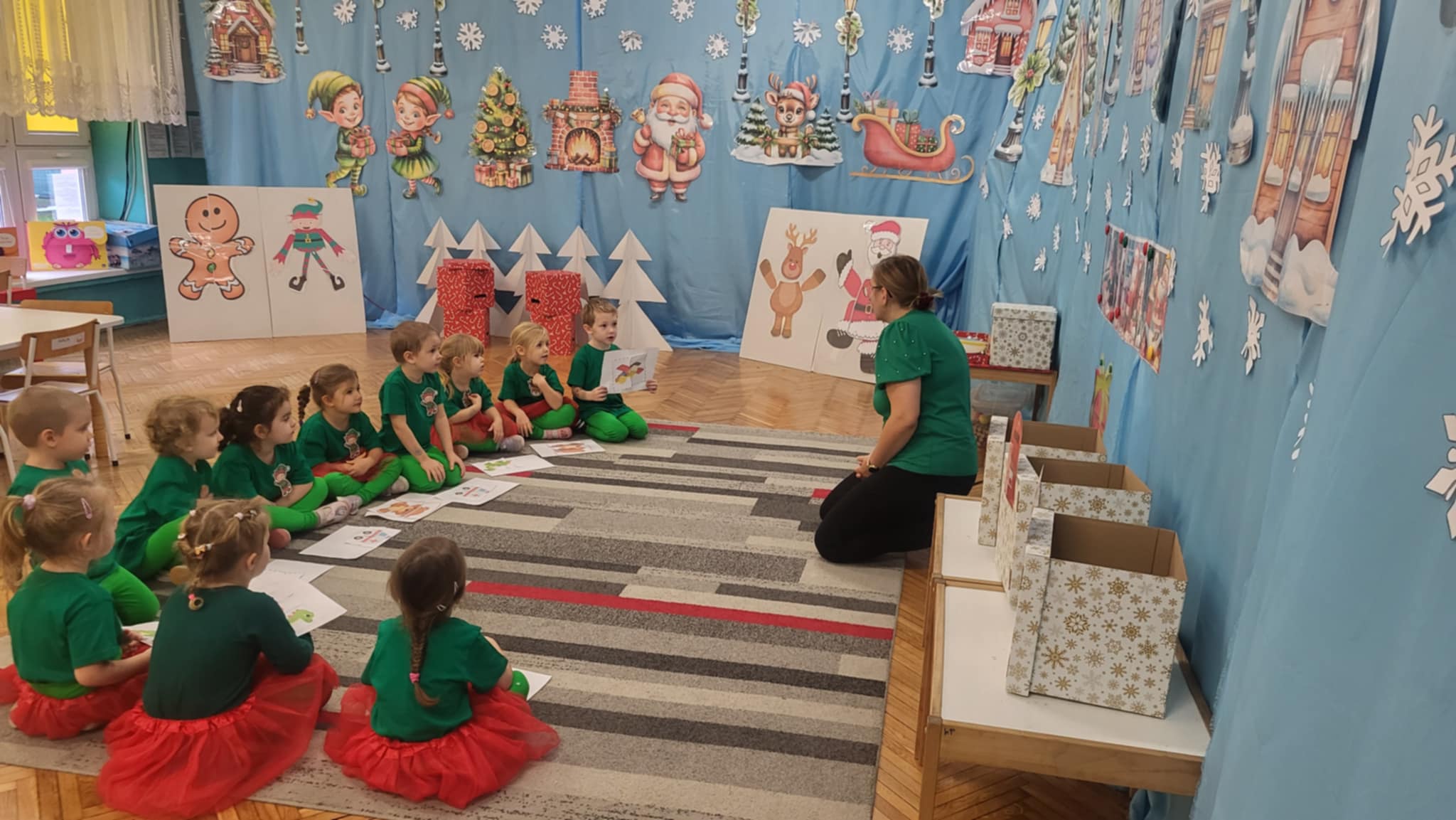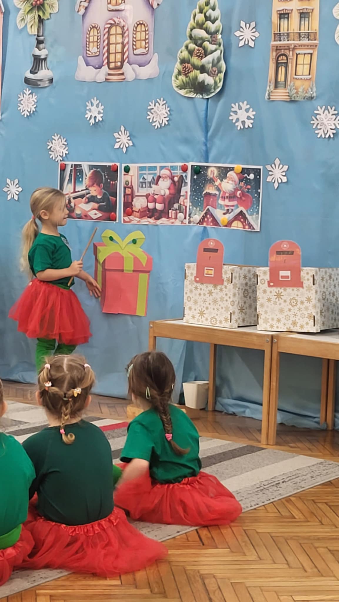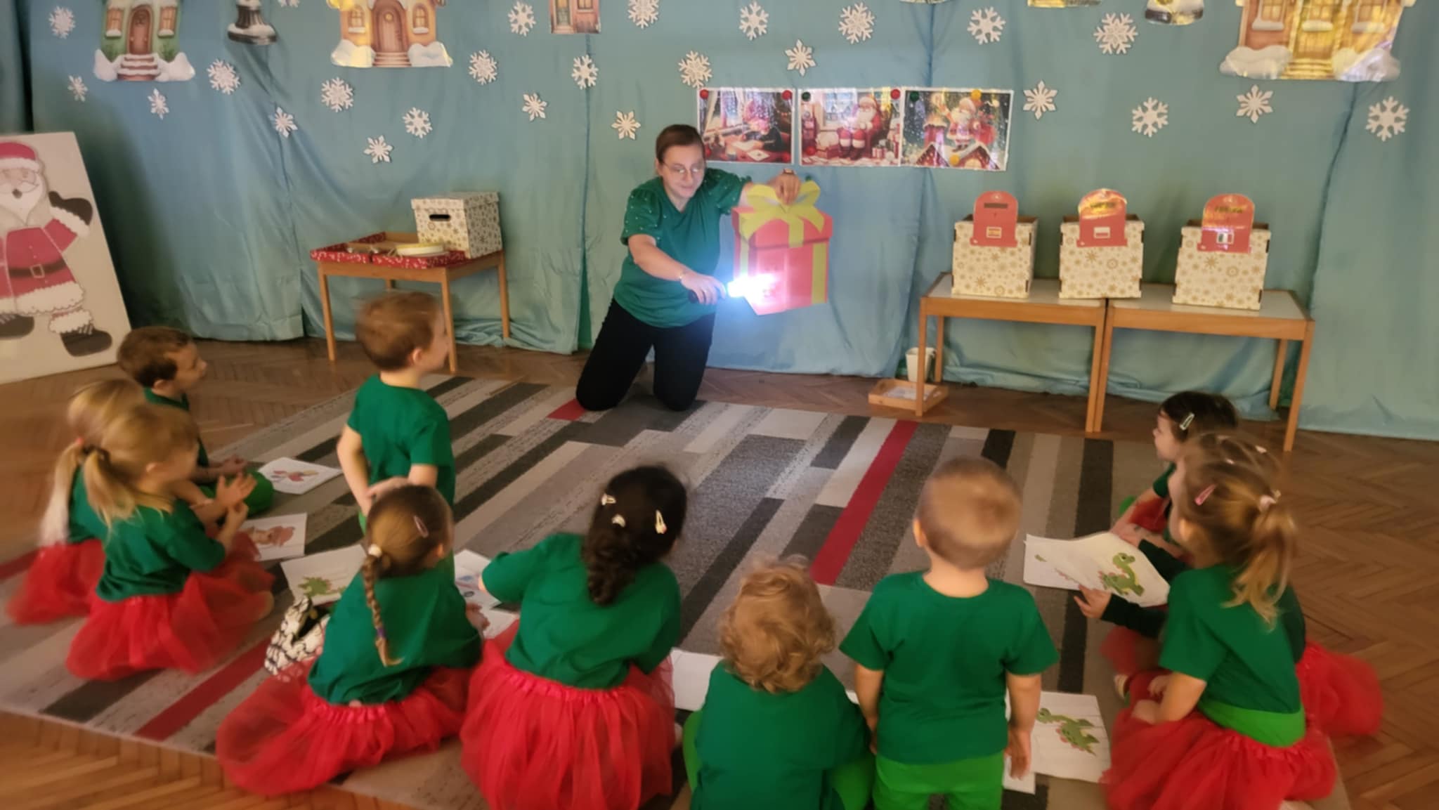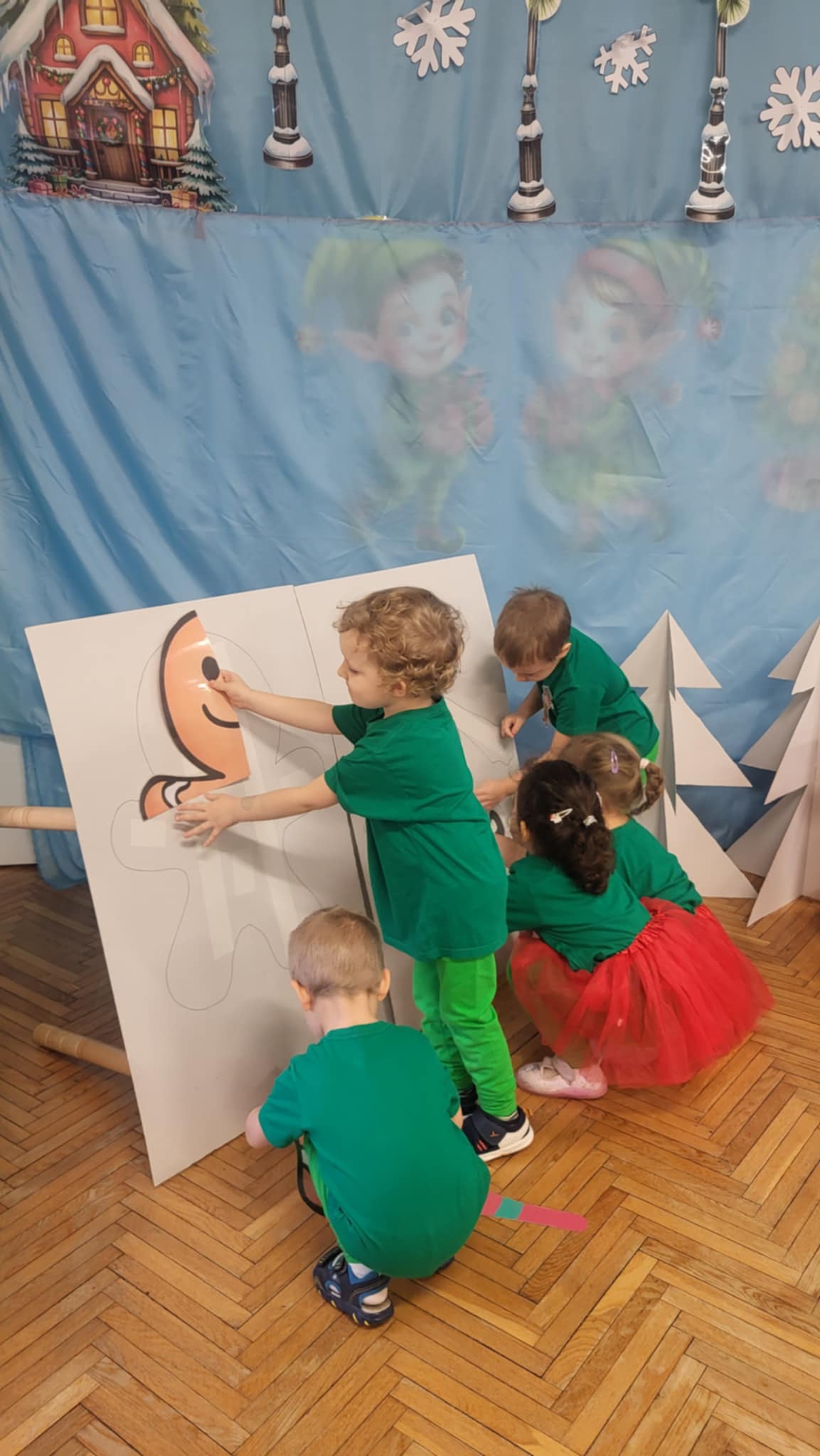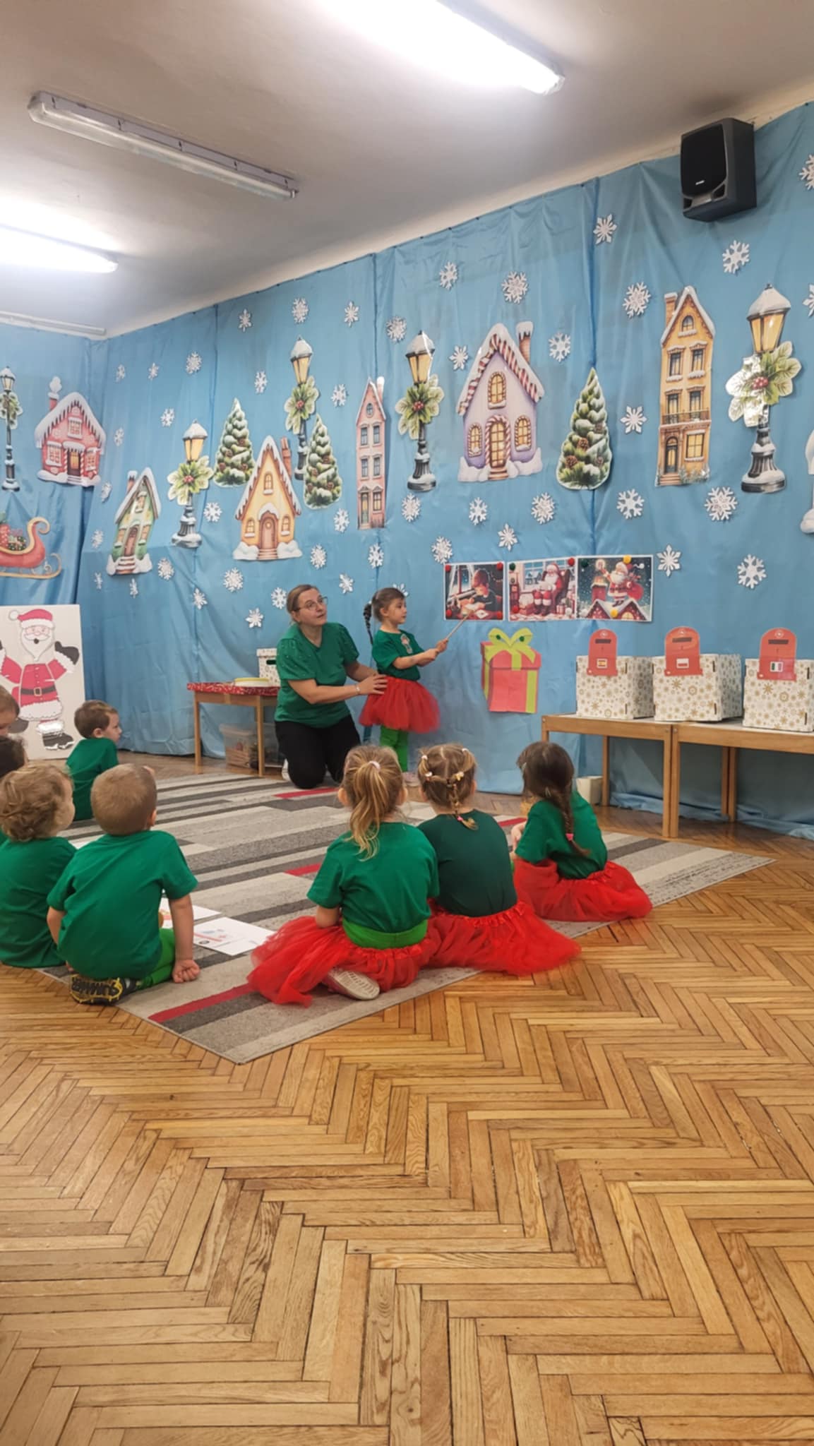 W grupie na jeden dzień dzieci zamieniły się w pomocników Mikołaja-Elfów. Wysłuchały historyjki obrazkowej o pewnym chłopcu Olku, który napisał list od Świętego Mikołaja. A o co poprosił?- tego dowiedziały się elfy rozwiązując zagadki. Segregowały listy do odpowiednich skrzynek pocztowych, potem wybrały się do wioski Mikolaja na daleką północ. Tam odkryły jakieś postacie, które musiały dopasować do cienia. Okazałao się, że to sam Mikołaj, elfy, renifer i piernikowy ludek ukryły się na ilustracjach. Grały również na instrumentach do piosenki "Mikołaju, chodź". Na końcu układały puzzle, by dowiedzieć się w końcu o czym marzył Olek. Okazało się, że jego marzeniem był pluszowy miś, klocki, dinozaur oraz samochodzi. Na zakończenie wybrane dzieci same spróbowały opowiedziec historyjkę obrazkową. Zaspiewały również piosenkę o Mikołaju, żeby nie zapomniał i onich i przybył w najbliższych dniach do przedszkola. Zajęcie pokazowe i obserwowane przez dyrektora oraz rade pedagogiczną.