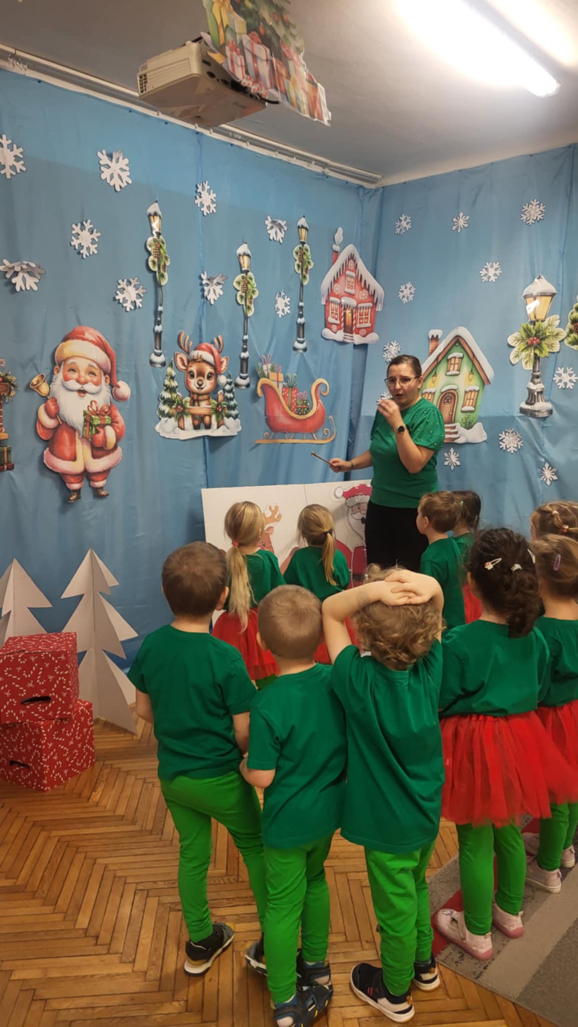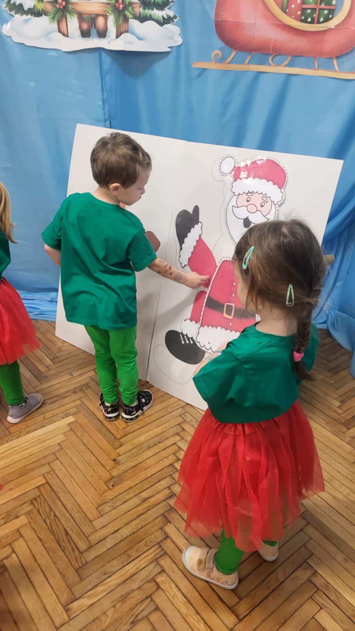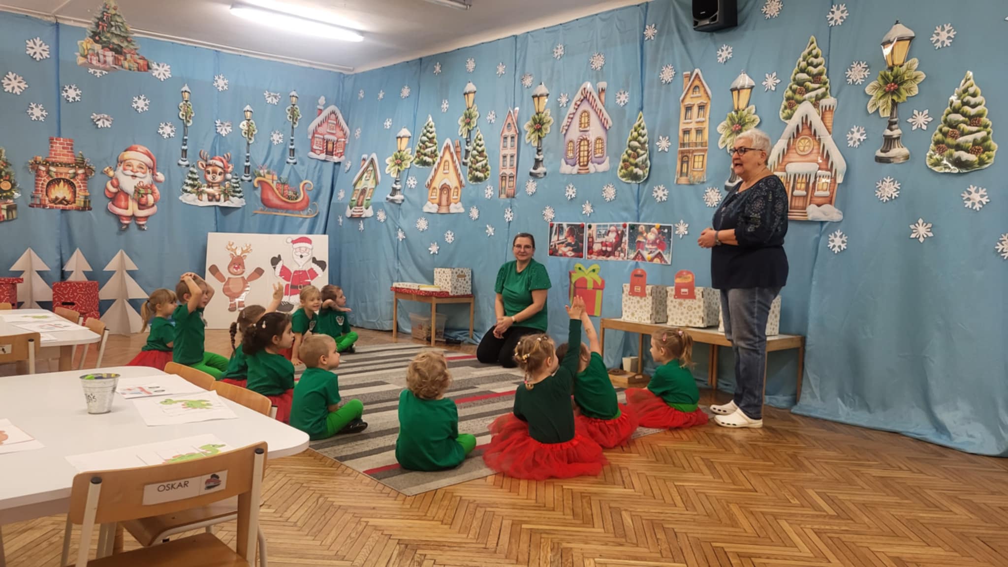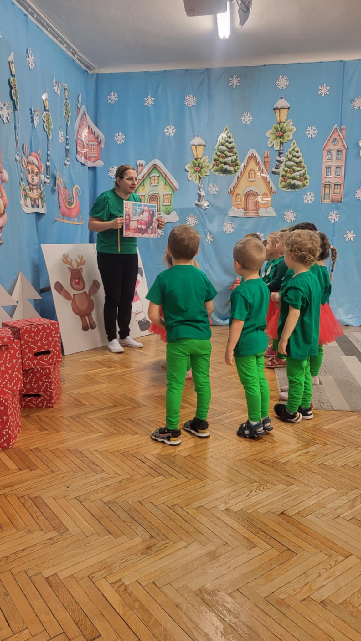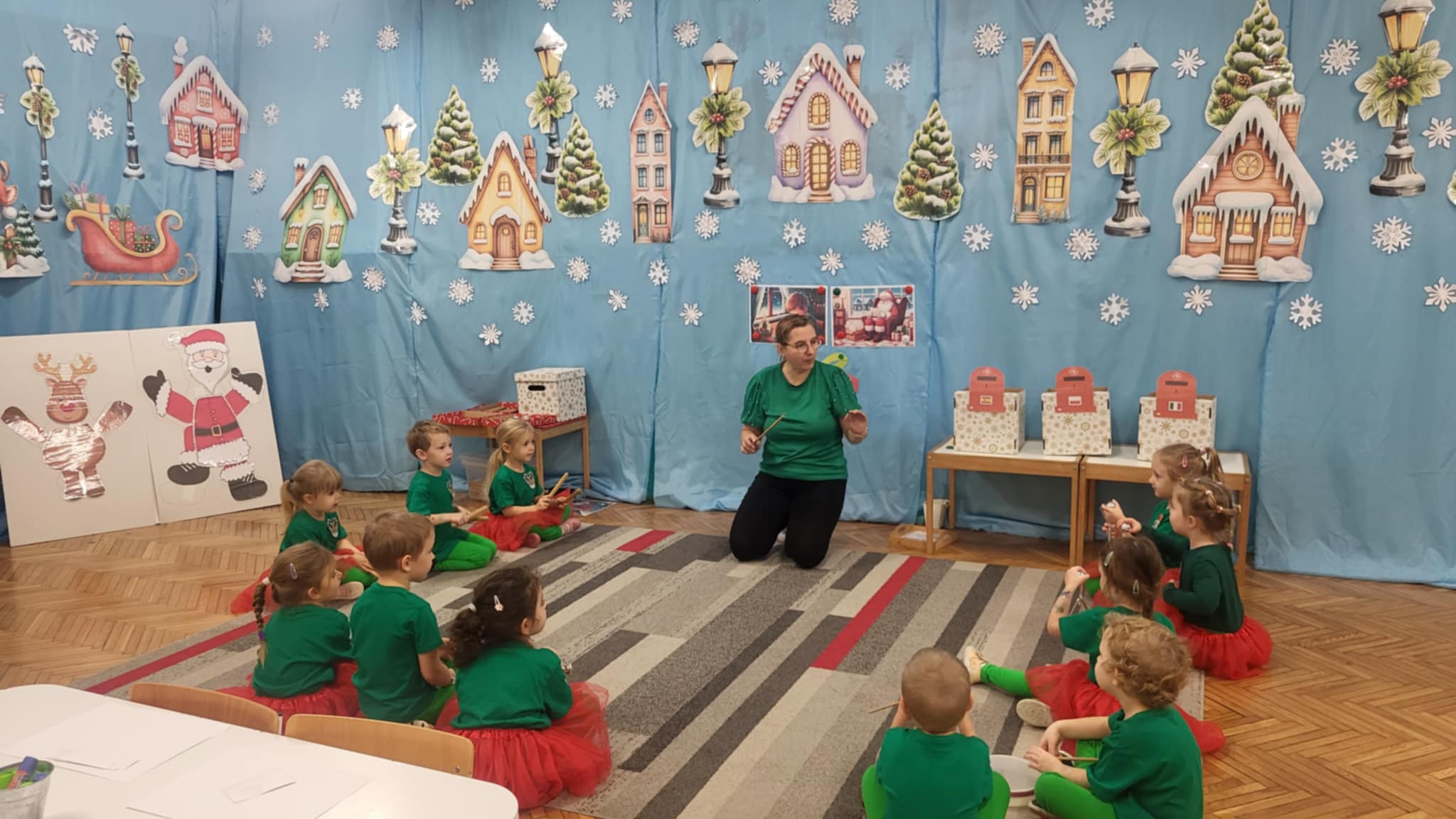 W grupie na jeden dzień dzieci zamieniły się w pomocników Mikołaja-Elfów. Wysłuchały historyjki obrazkowej o pewnym chłopcu Olku, który napisał list od Świętego Mikołaja. A o co poprosił?- tego dowiedziały się elfy rozwiązując zagadki. Segregowały listy do odpowiednich skrzynek pocztowych, potem wybrały się do wioski Mikolaja na daleką północ. Tam odkryły jakieś postacie, które musiały dopasować do cienia. Okazałao się, że to sam Mikołaj, elfy, renifer i piernikowy ludek ukryły się na ilustracjach. Grały również na instrumentach do piosenki "Mikołaju, chodź". Na końcu układały puzzle, by dowiedzieć się w końcu o czym marzył Olek. Okazało się, że jego marzeniem był pluszowy miś, klocki, dinozaur oraz samochodzi. Na zakończenie wybrane dzieci same spróbowały opowiedziec historyjkę obrazkową. Zaspiewały również piosenkę o Mikołaju, żeby nie zapomniał i onich i przybył w najbliższych dniach do przedszkola. Zajęcie pokazowe i obserwowane przez dyrektora oraz rade pedagogiczną.