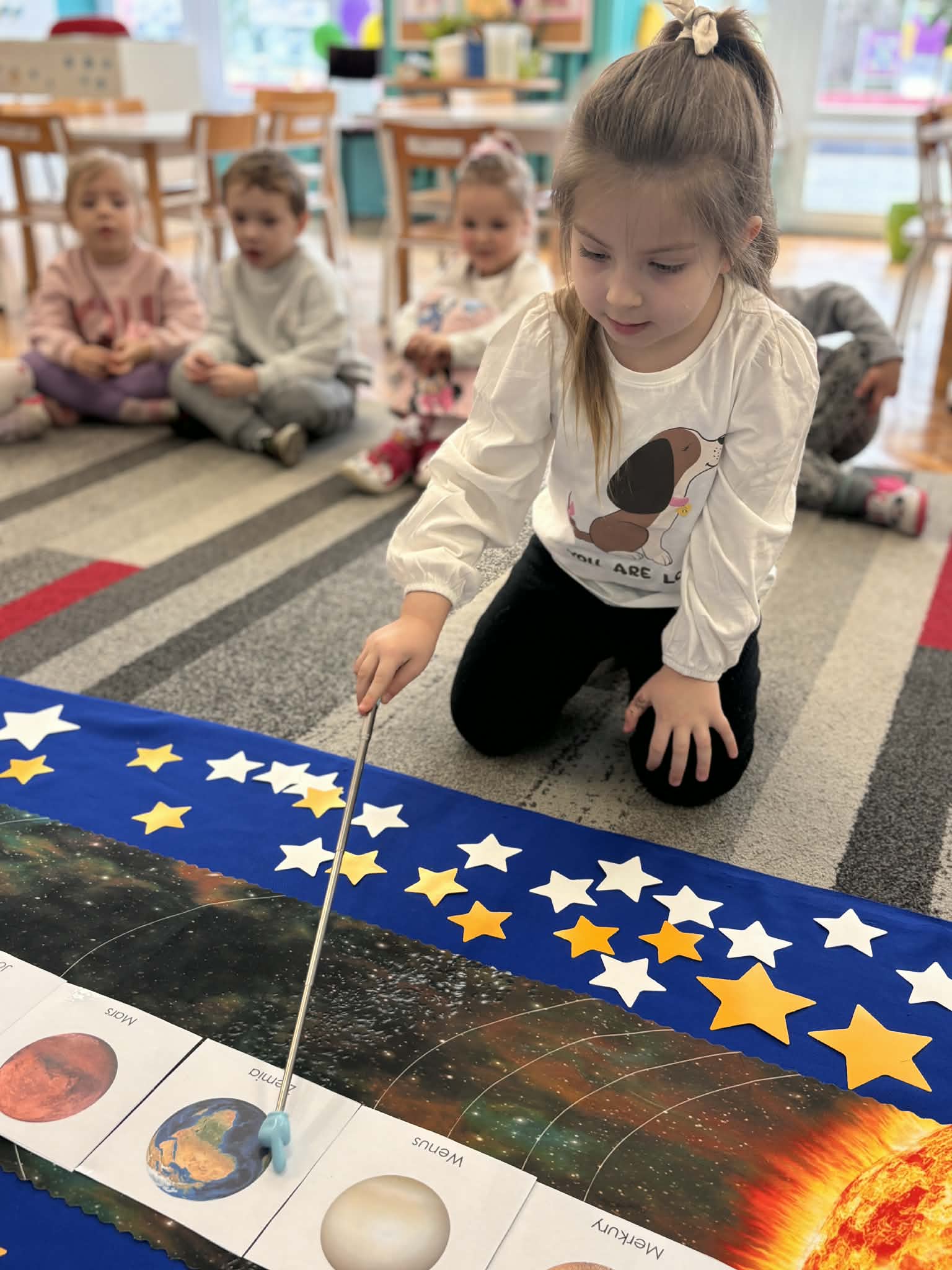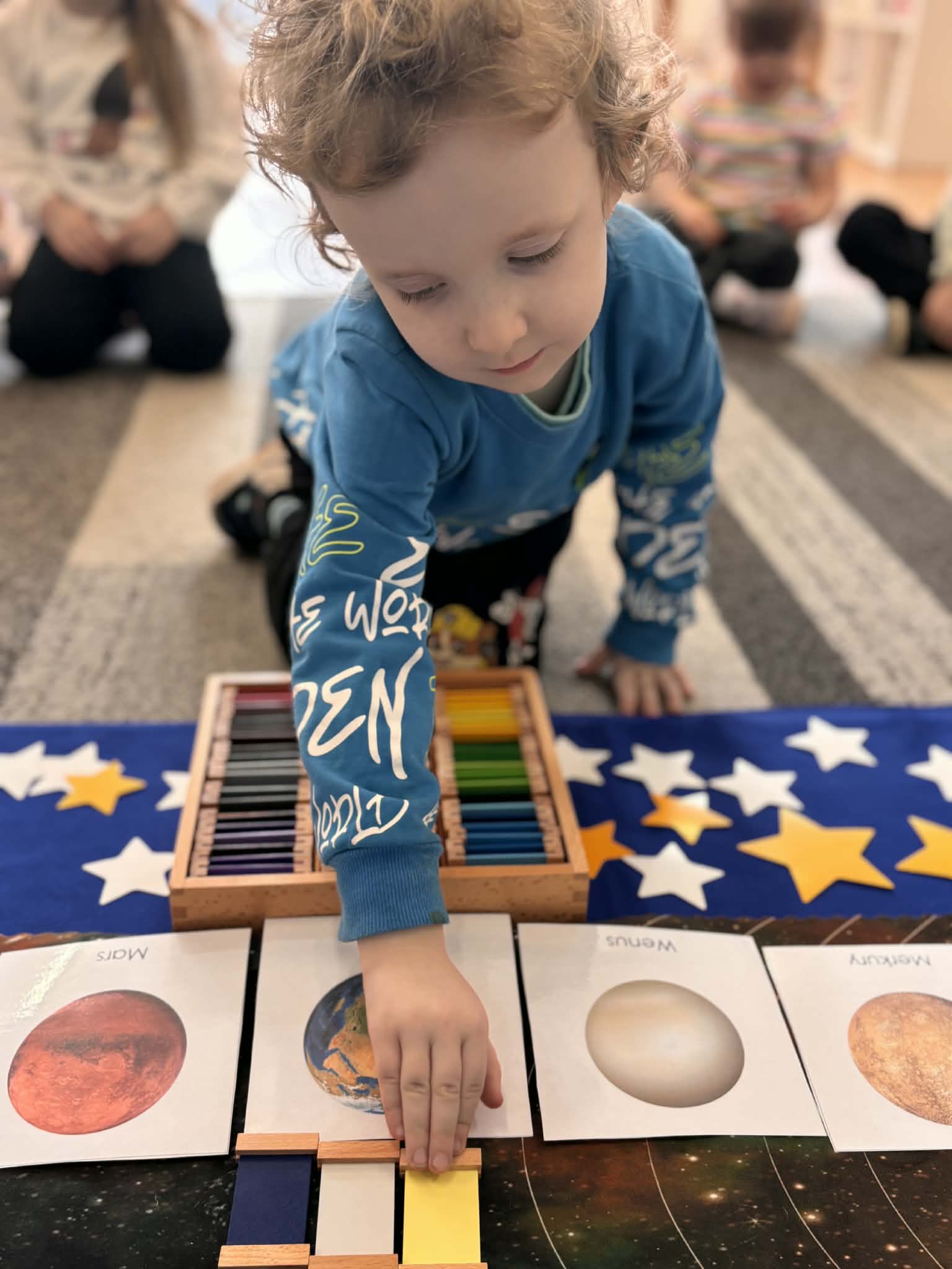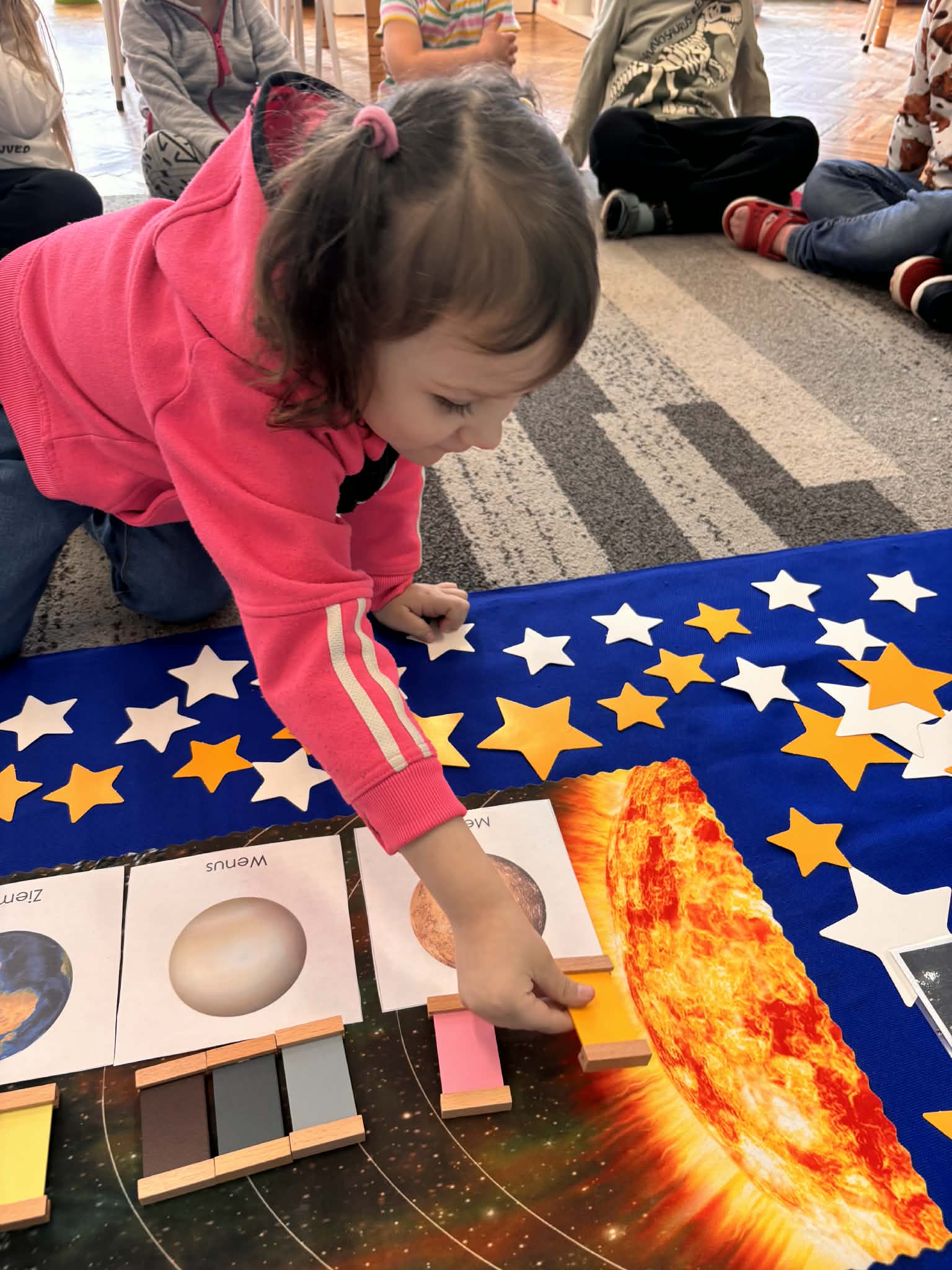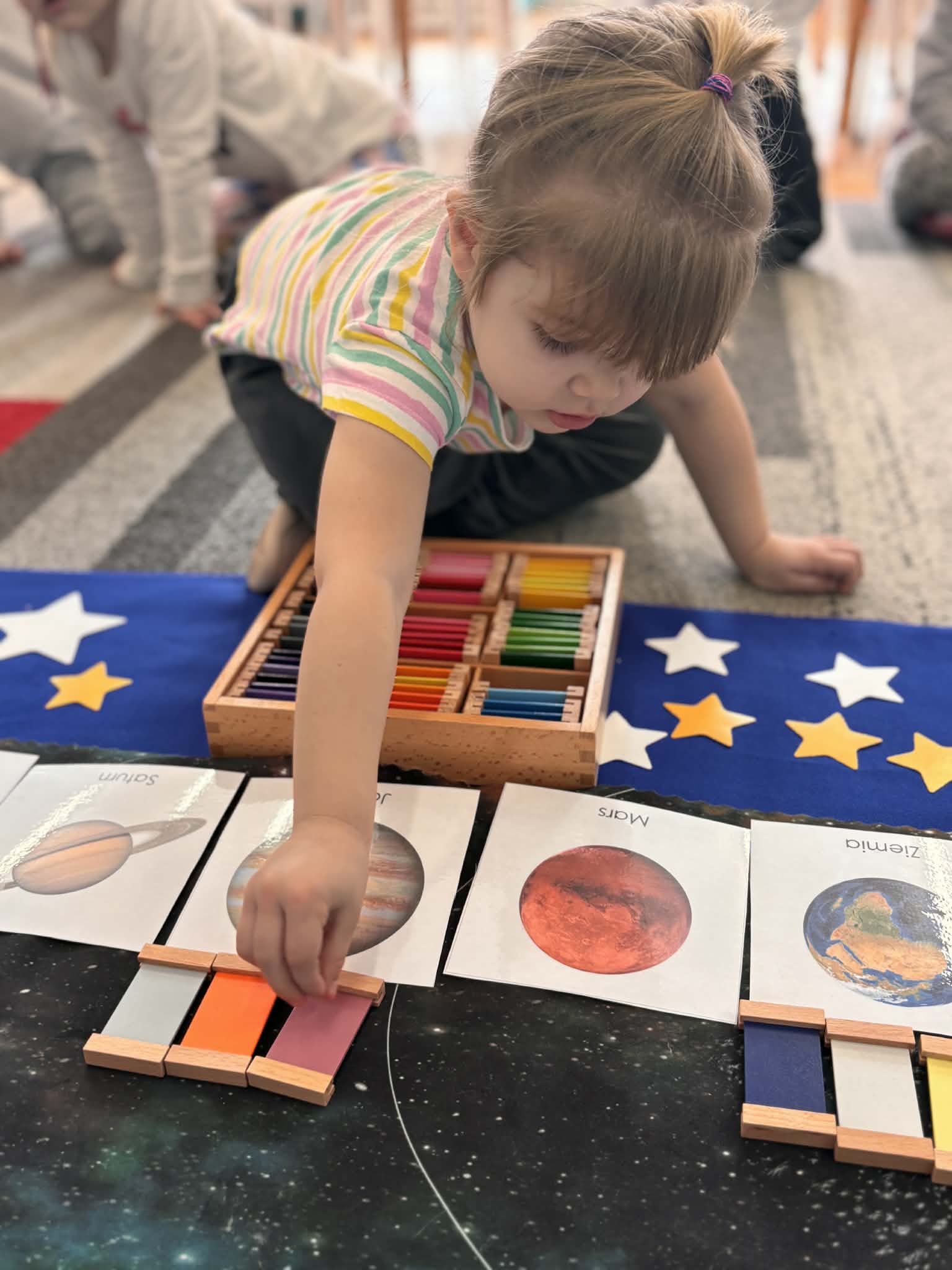 W tym tygodniu w grupie 2 poznawaliśmy Układ Słoneczny. Dzieci pracowały z kartami Montessori, dzięki którym utrwaliły nazwy i cechy planet: Merkury, Wenus, Ziemia, Mars, Jowisz, Saturn, Uran i Neptun. Rozmawialiśmy o ich wyglądzie, wielkości i ciekawostkach. Korzystając z tabliczek gradacji kolorów, dzieci ćwiczyły rozróżnianie i układanie odcieni. Na zakończenie powstała praca plastyczna „Ufoludek”– odcisk rączki w statku kosmicznym. To był tydzień pełen kosmicznych odkryć