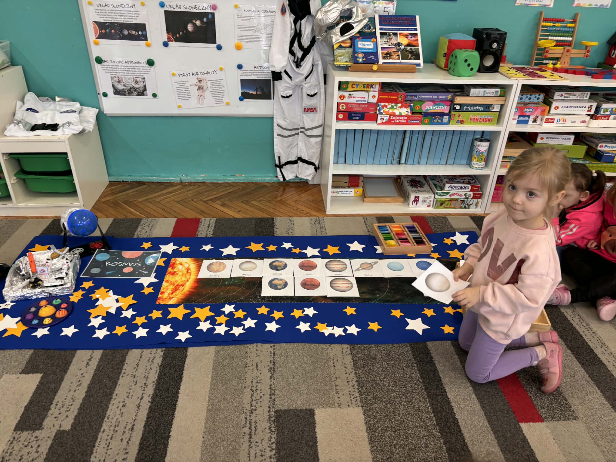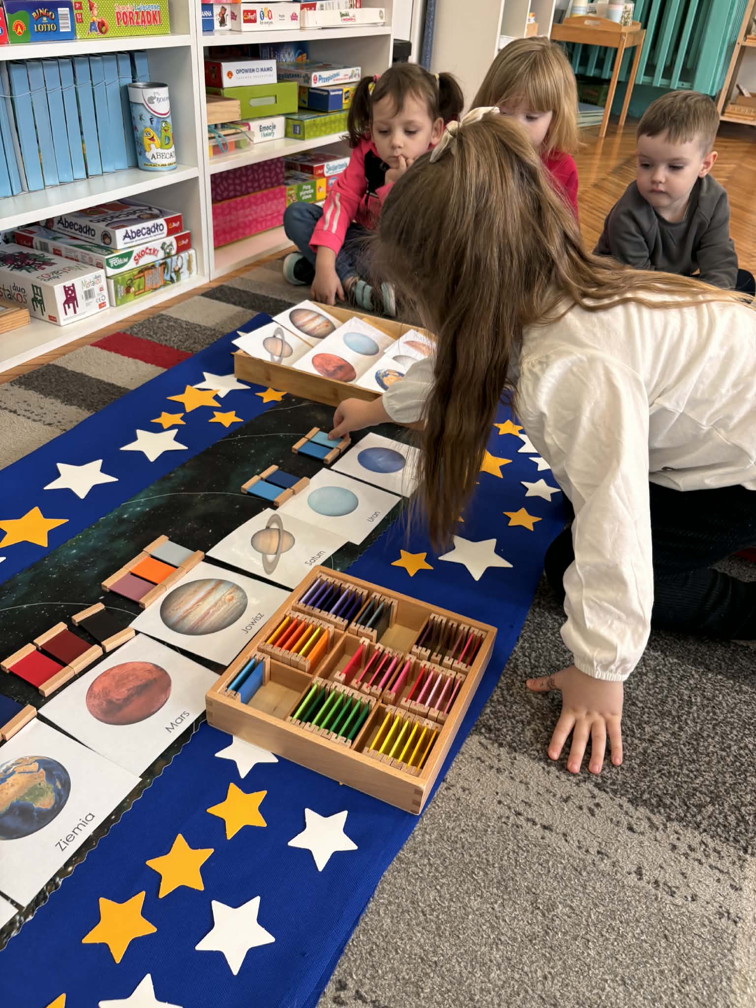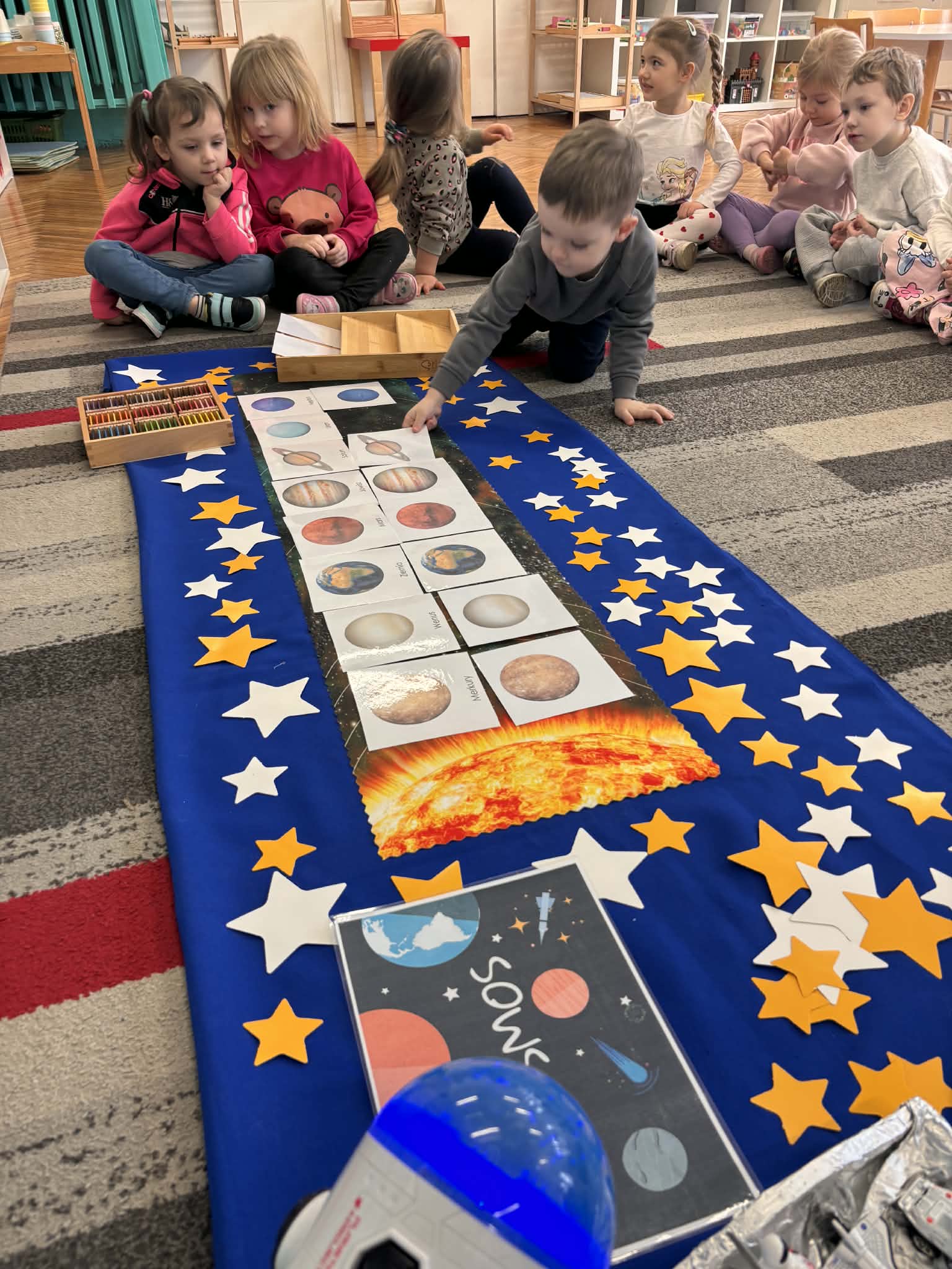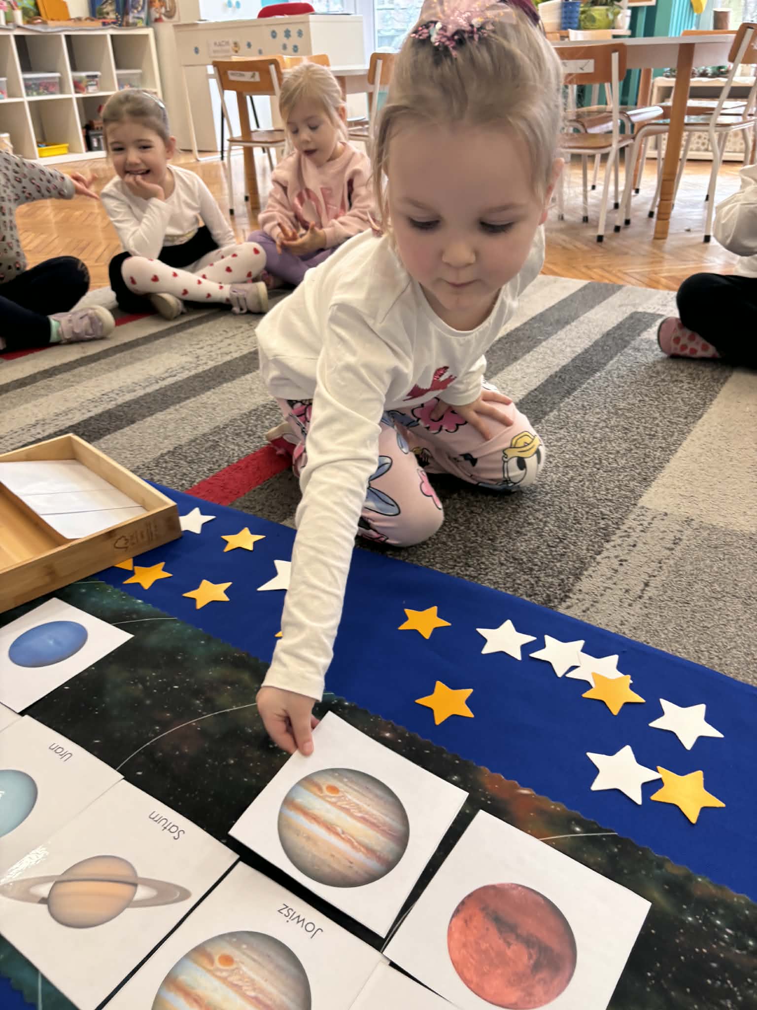 W tym tygodniu w grupie 2 poznawaliśmy Układ Słoneczny. Dzieci pracowały z kartami Montessori, dzięki którym utrwaliły nazwy i cechy planet: Merkury, Wenus, Ziemia, Mars, Jowisz, Saturn, Uran i Neptun. Rozmawialiśmy o ich wyglądzie, wielkości i ciekawostkach. Korzystając z tabliczek gradacji kolorów, dzieci ćwiczyły rozróżnianie i układanie odcieni. Na zakończenie powstała praca plastyczna „Ufoludek”– odcisk rączki w statku kosmicznym. To był tydzień pełen kosmicznych odkryć