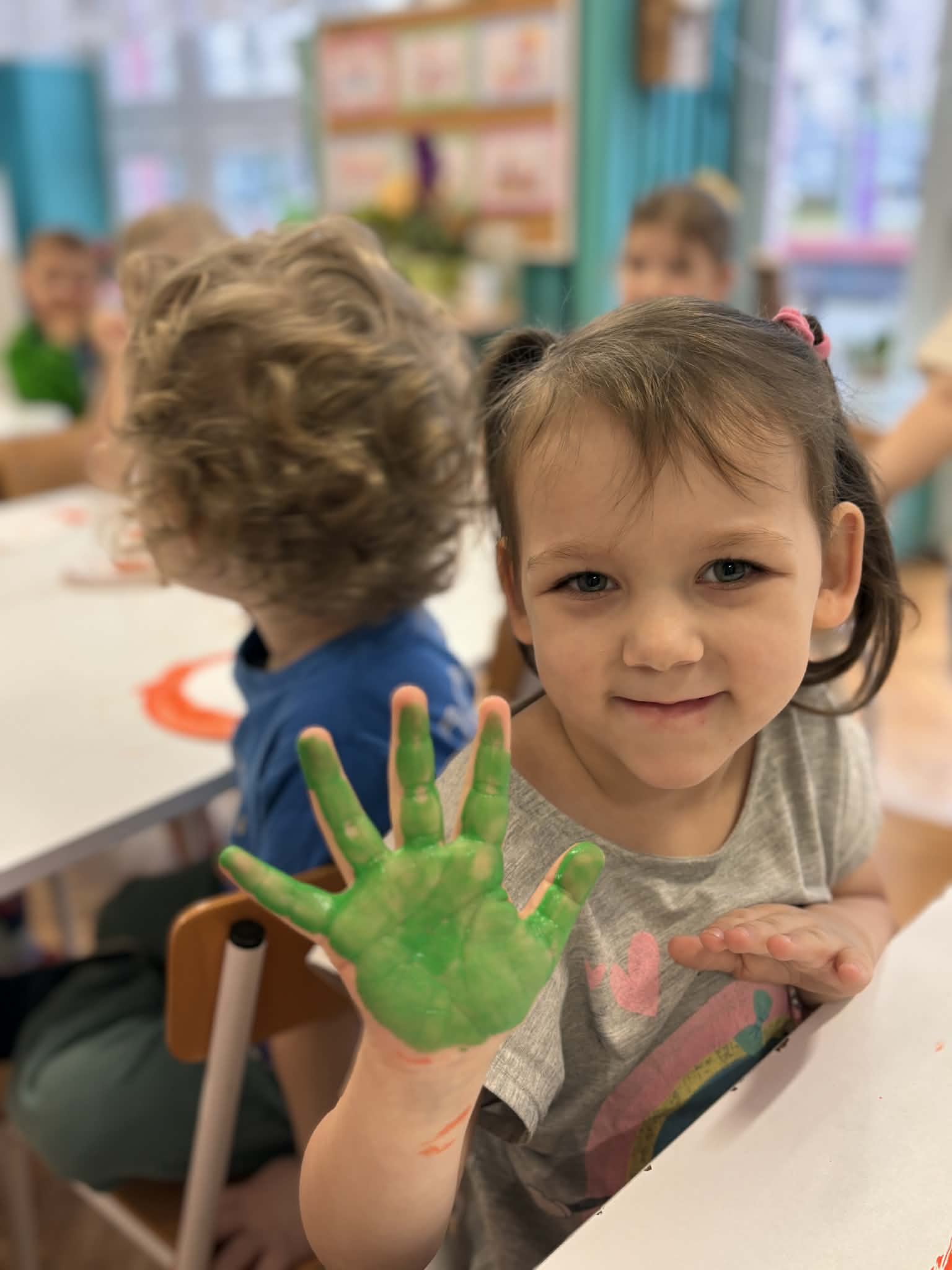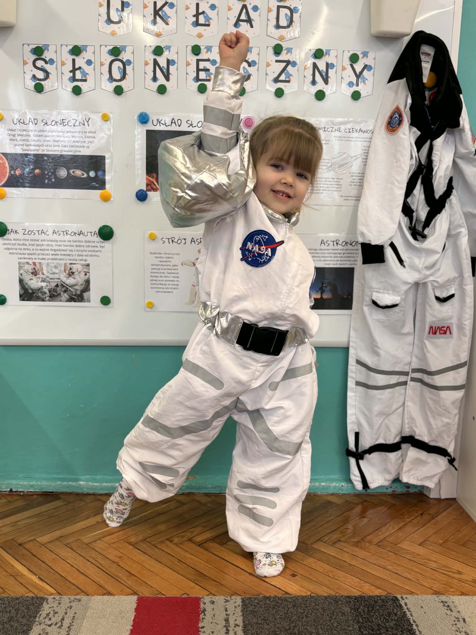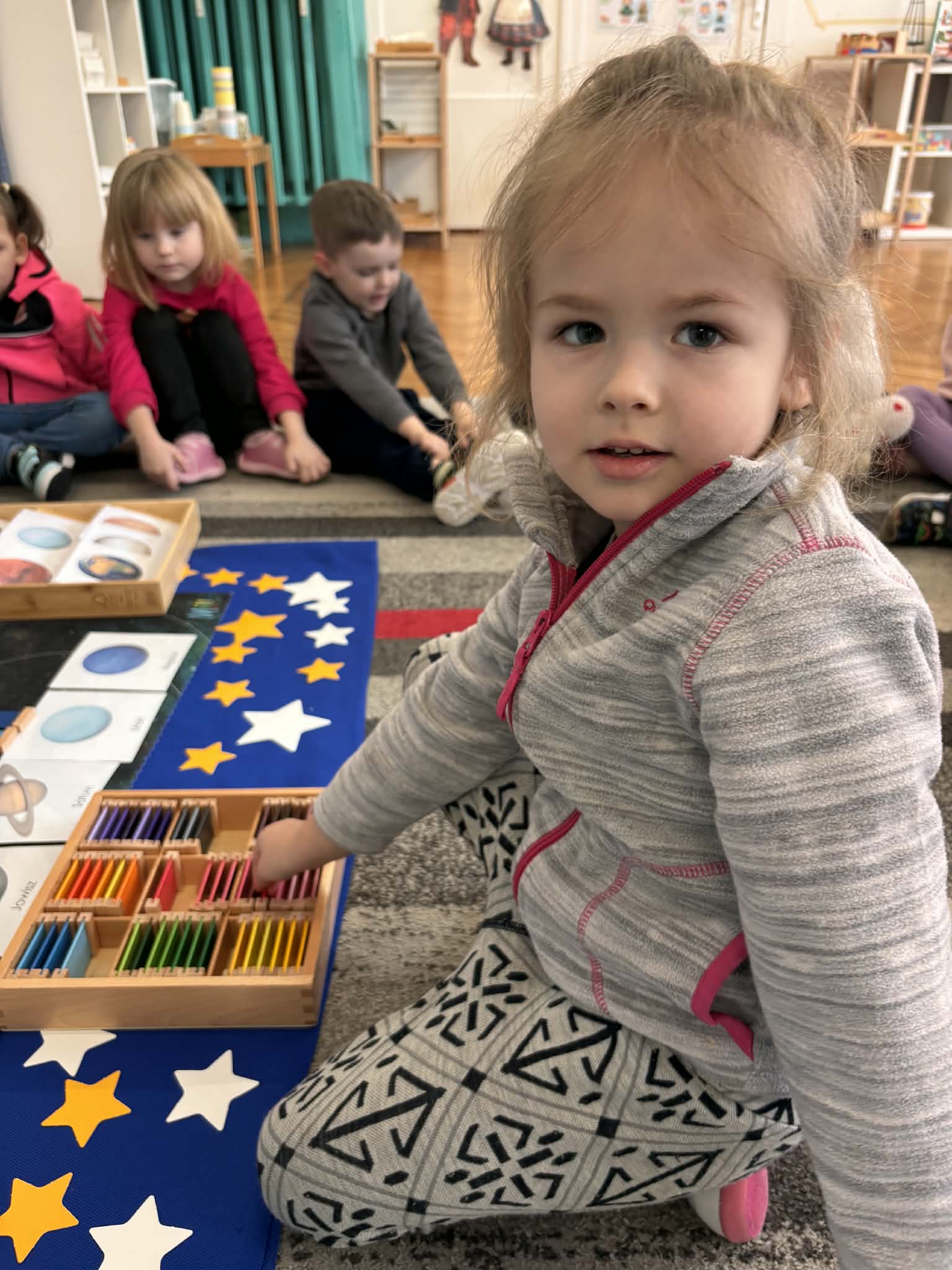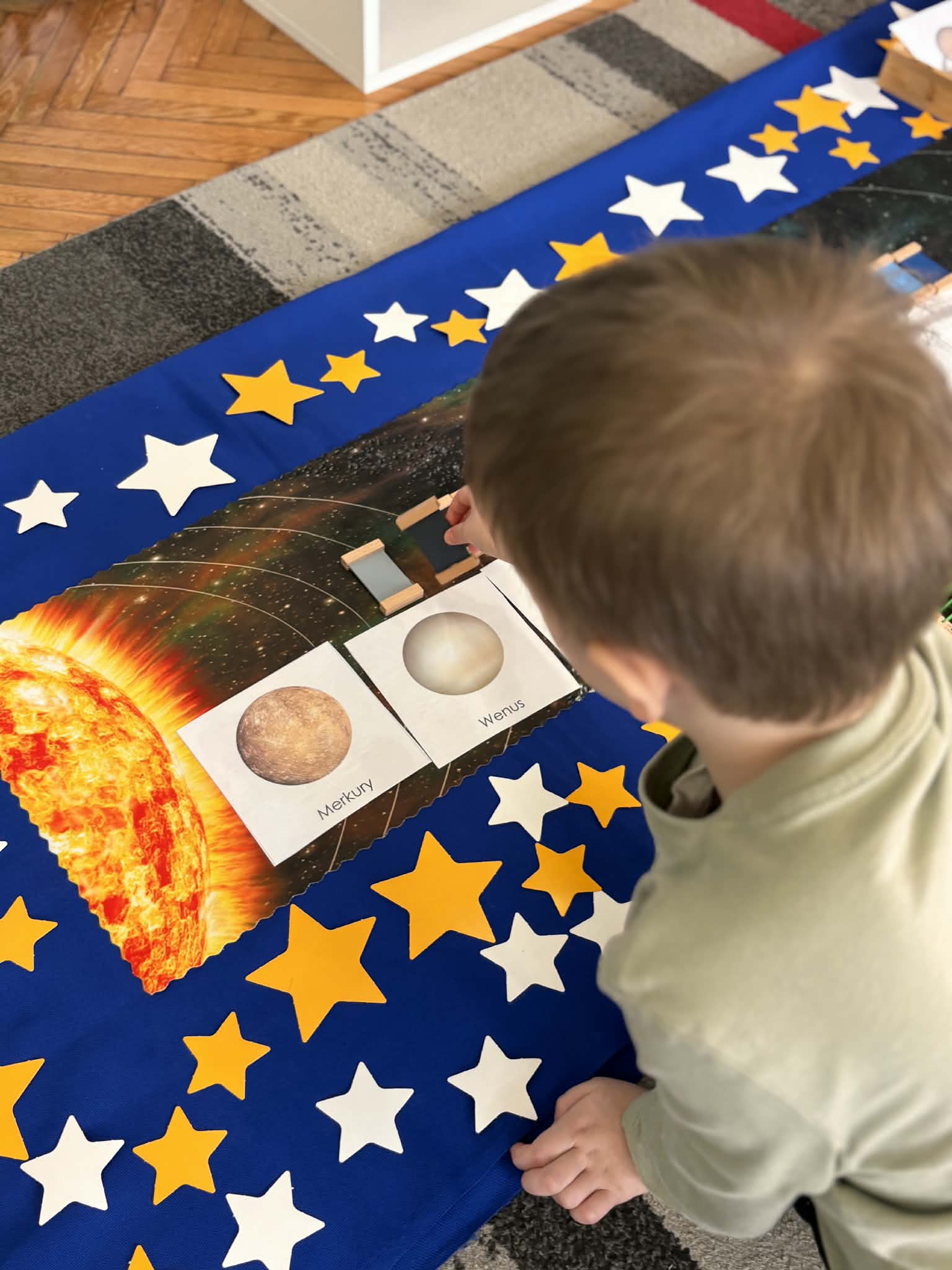 W tym tygodniu w grupie 2 poznawaliśmy Układ Słoneczny. Dzieci pracowały z kartami Montessori, dzięki którym utrwaliły nazwy i cechy planet: Merkury, Wenus, Ziemia, Mars, Jowisz, Saturn, Uran i Neptun. Rozmawialiśmy o ich wyglądzie, wielkości i ciekawostkach. Korzystając z tabliczek gradacji kolorów, dzieci ćwiczyły rozróżnianie i układanie odcieni. Na zakończenie powstała praca plastyczna „Ufoludek”– odcisk rączki w statku kosmicznym. To był tydzień pełen kosmicznych odkryć