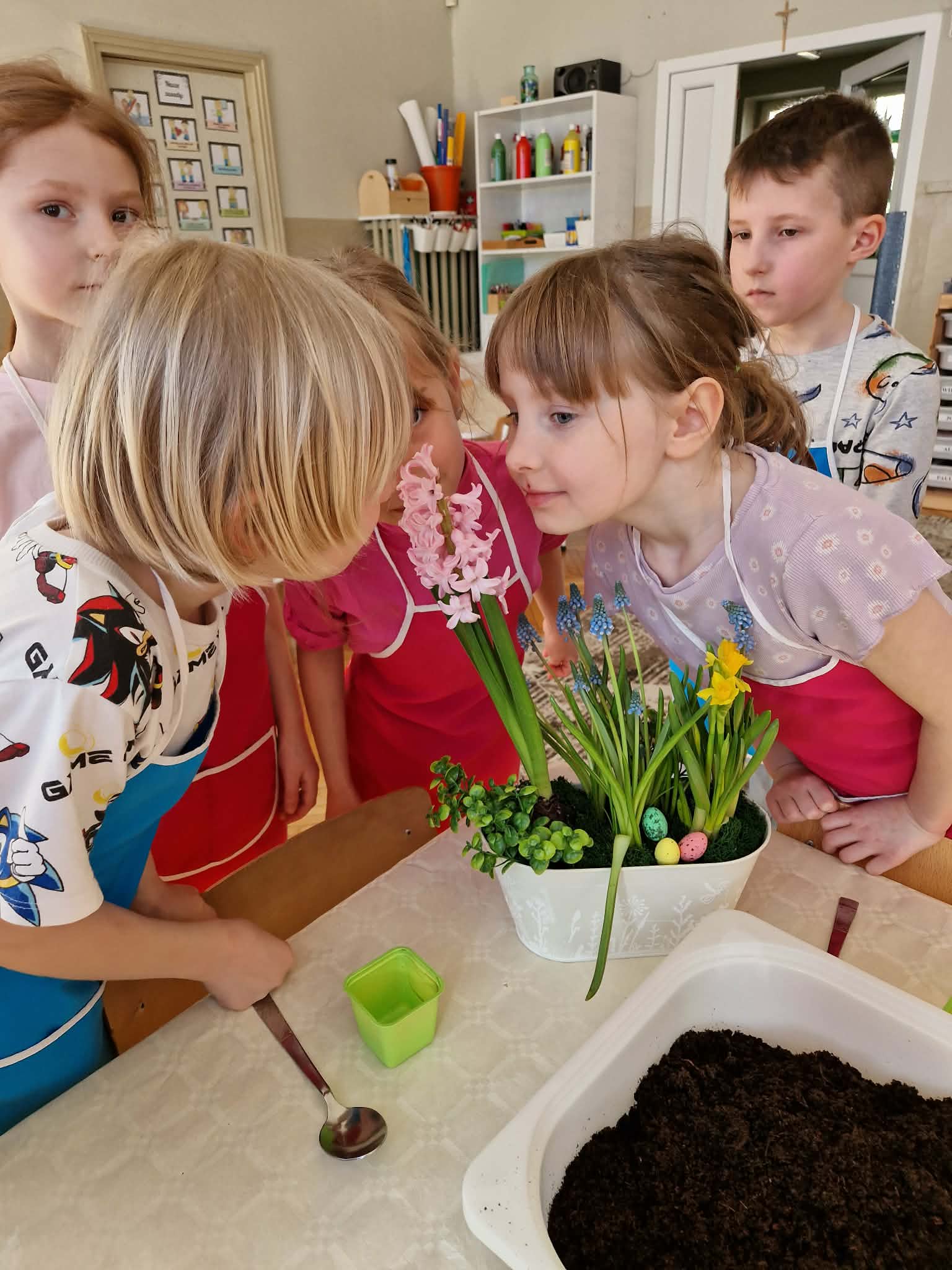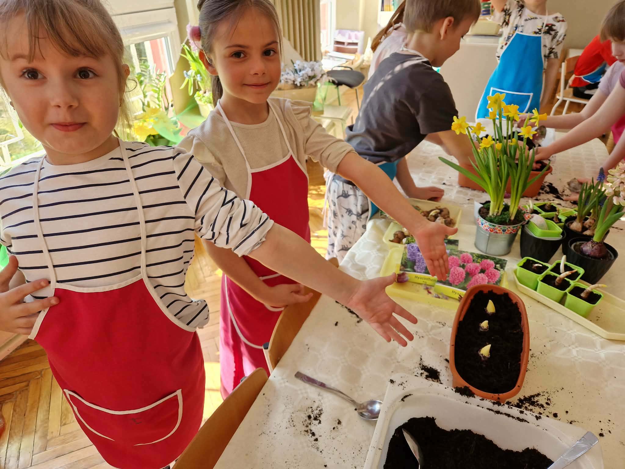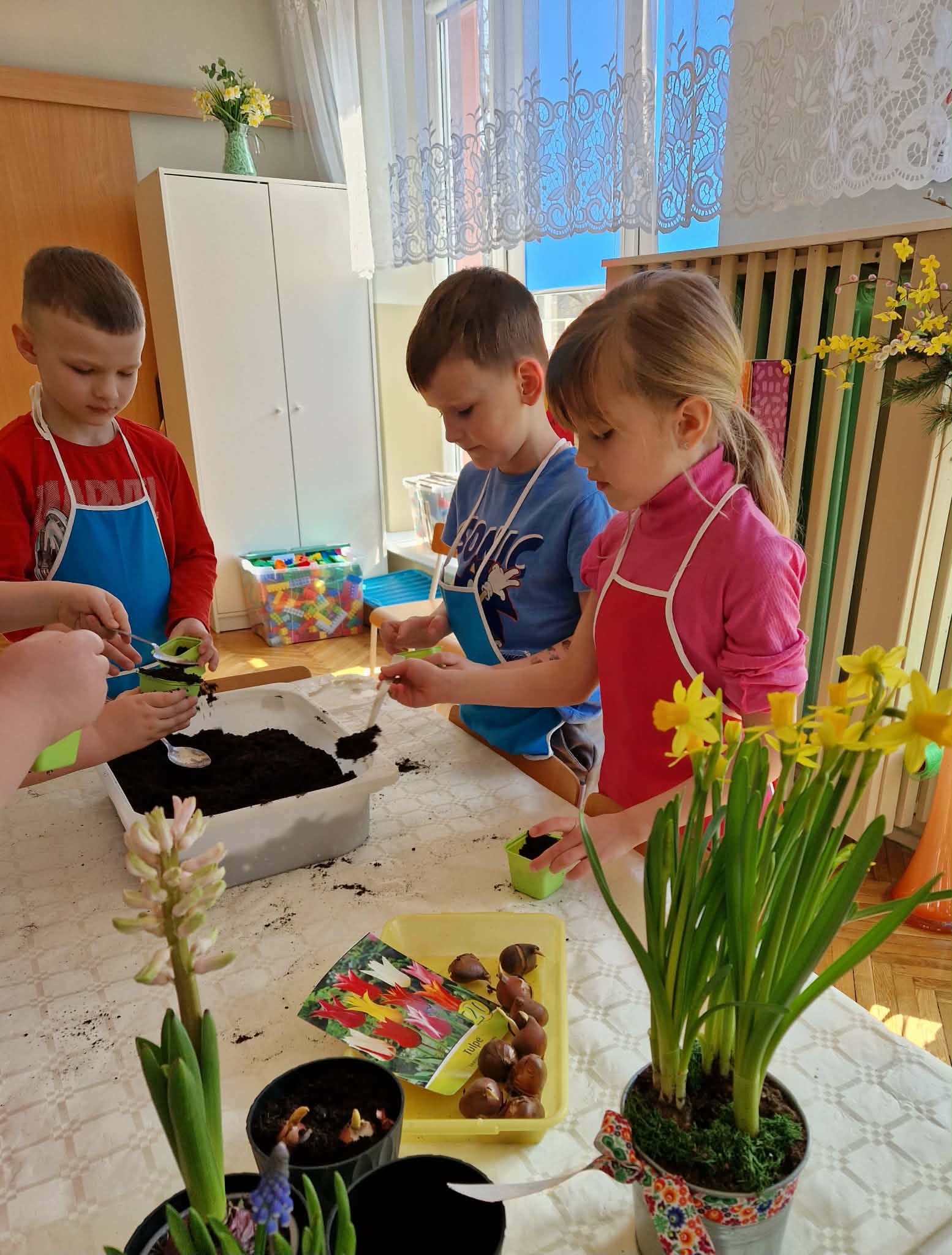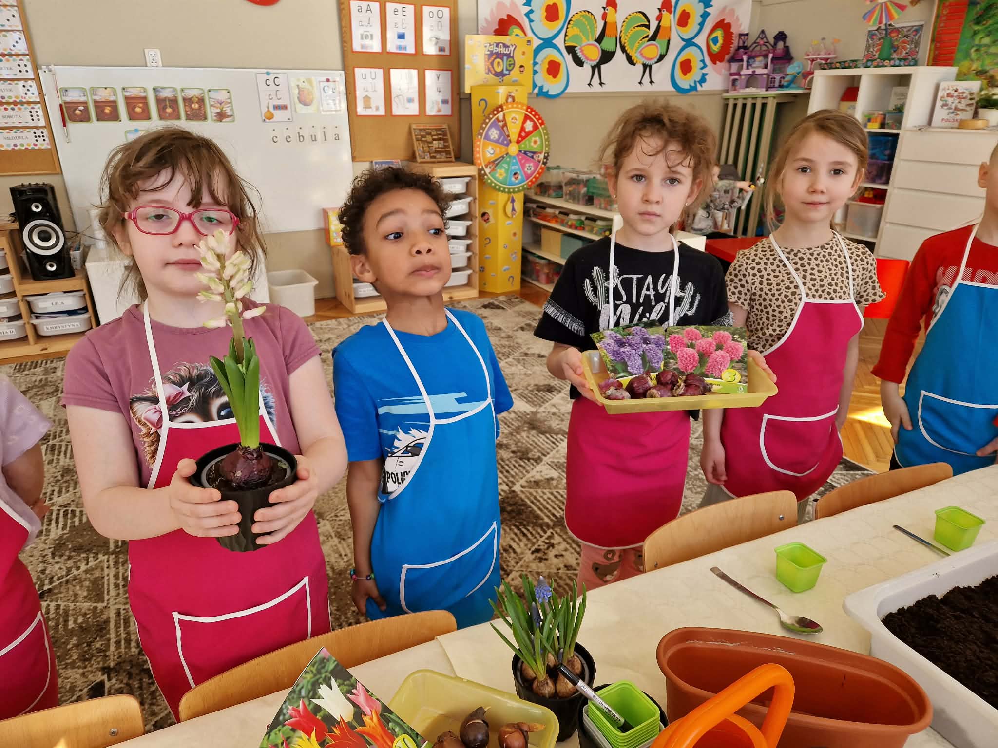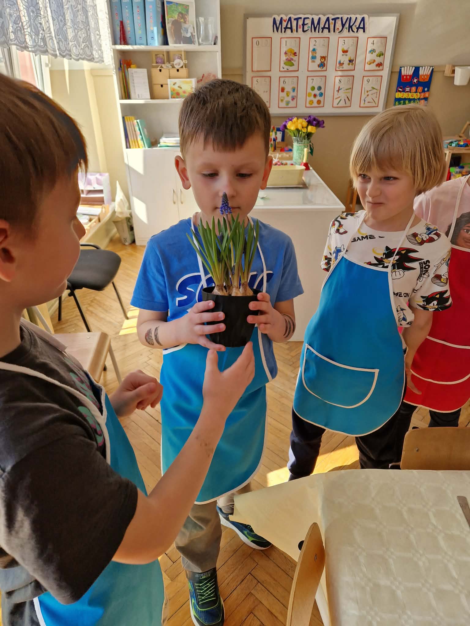 Starszaki tym razem zamieniły się w małych ogrodników. Na podstawie historyjki obrazkowej o "Małej cebulce krokusa" dowiedziały się co jest potrzebne roślinom do życia. Zapoznały się z budową kwiatów cebulowych. Następnie zasadziły cebule żonkili, hiacyntów i tulipanów. Wykonały również pracę plastyczną "Hiacynt"