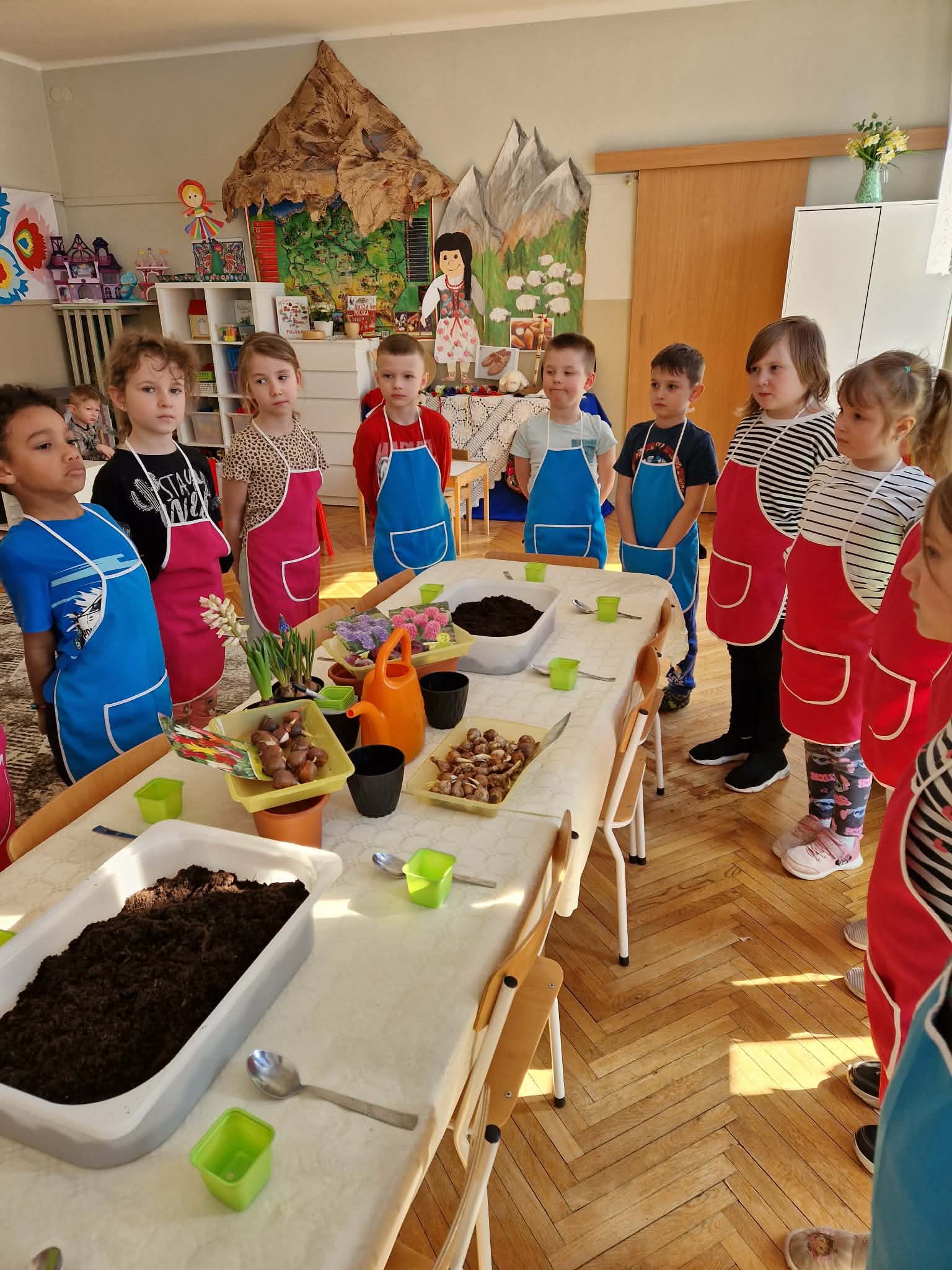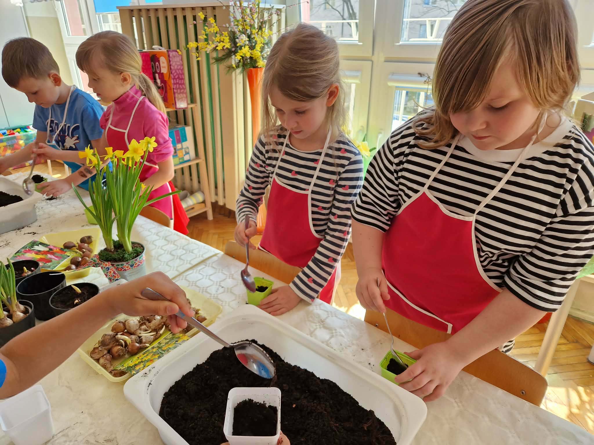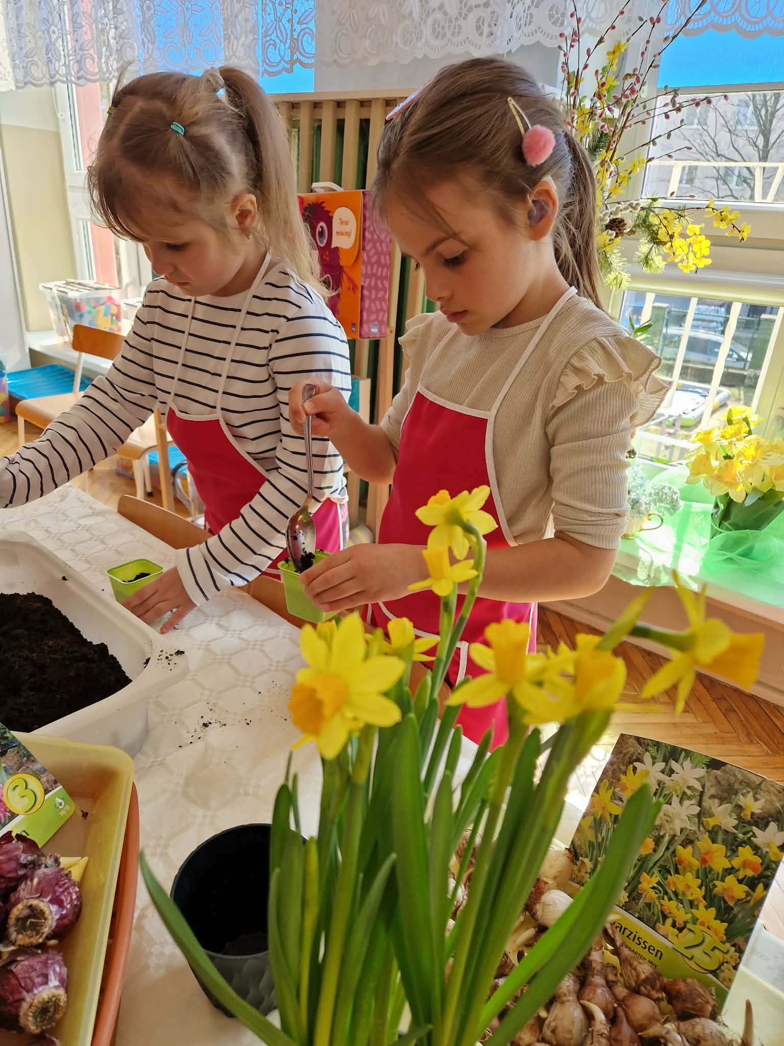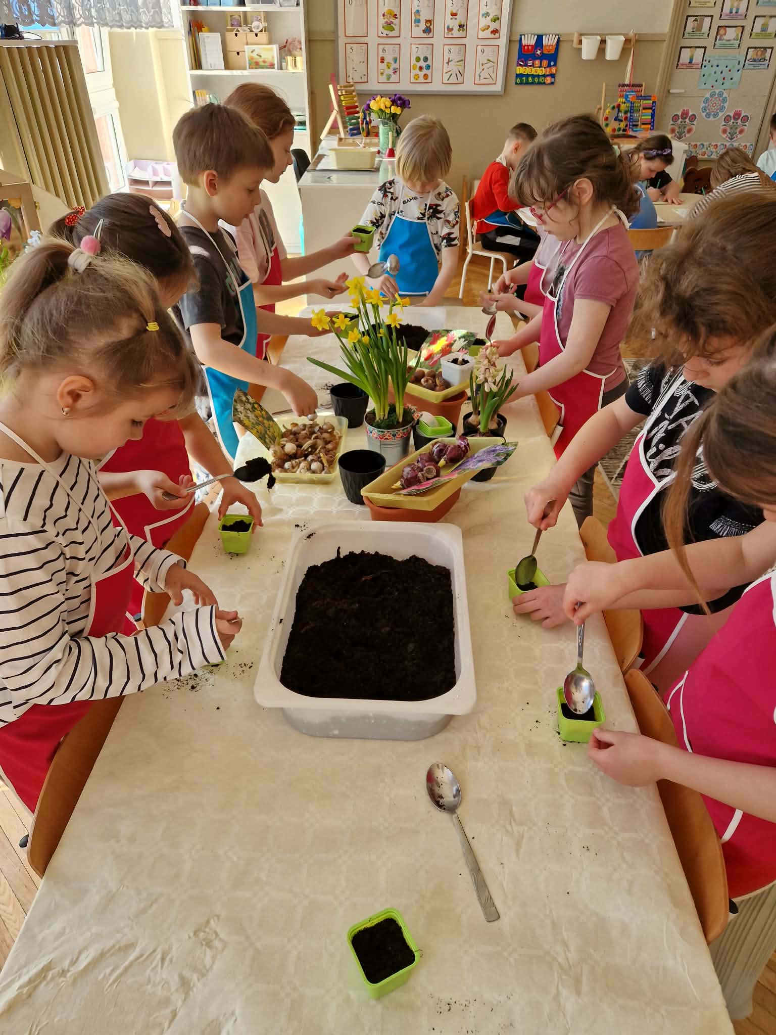 Starszaki tym razem zamieniły się w małych ogrodników. Na podstawie historyjki obrazkowej o "Małej cebulce krokusa" dowiedziały się co jest potrzebne roślinom do życia. Zapoznały się z budową kwiatów cebulowych. Następnie zasadziły cebule żonkili, hiacyntów i tulipanów. Wykonały również pracę plastyczną "Hiacynt"