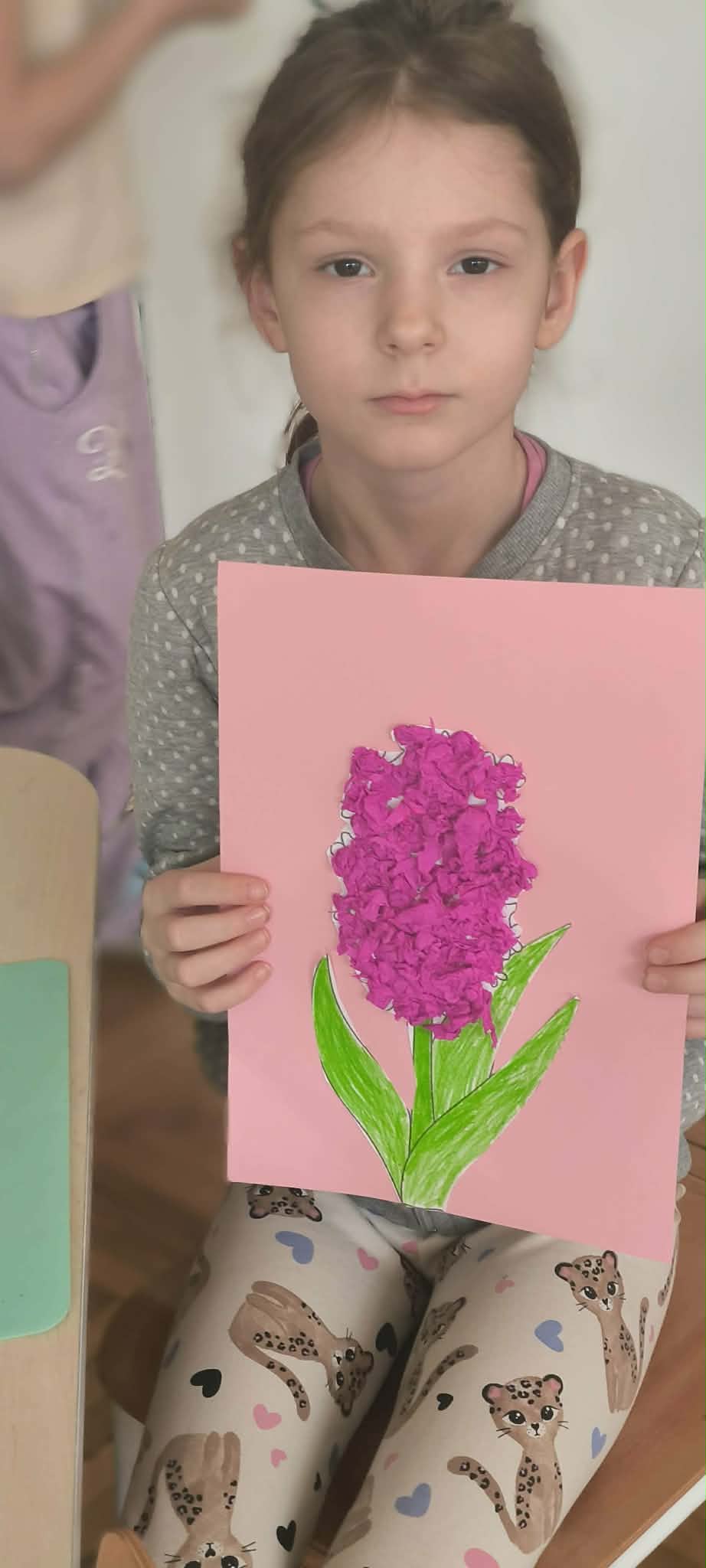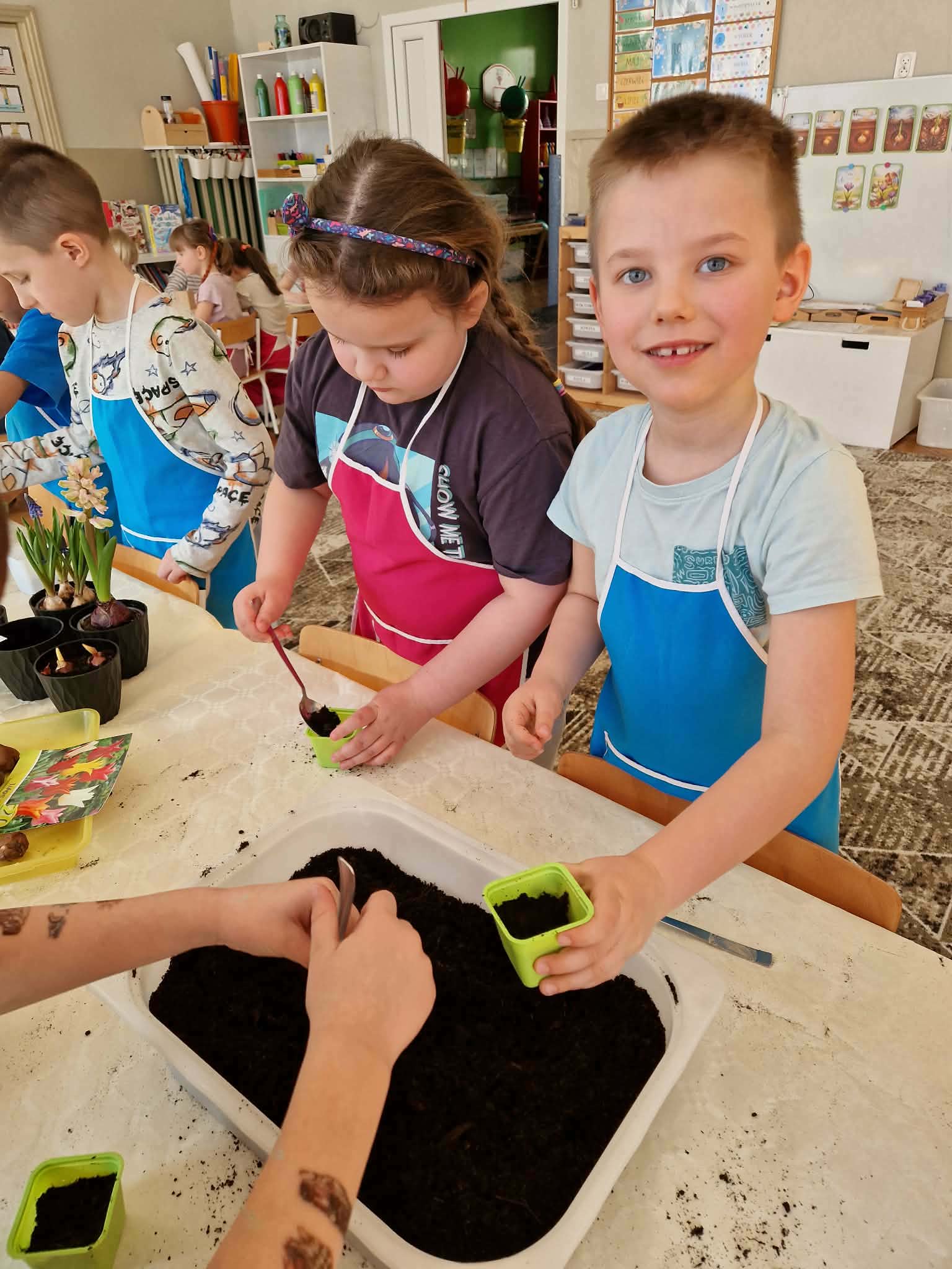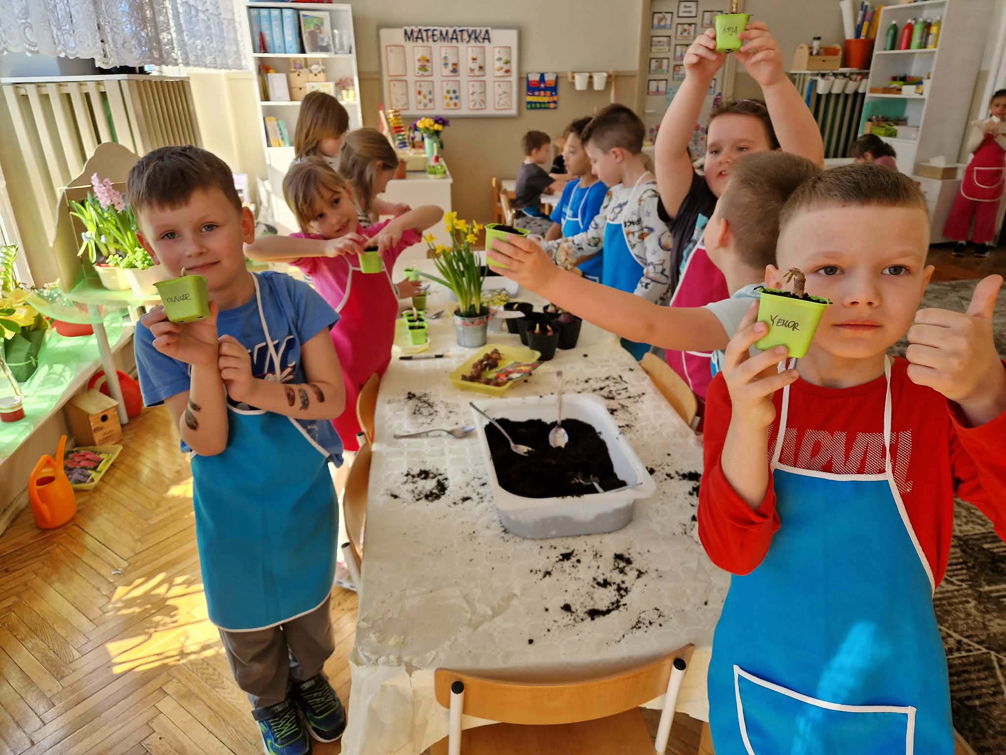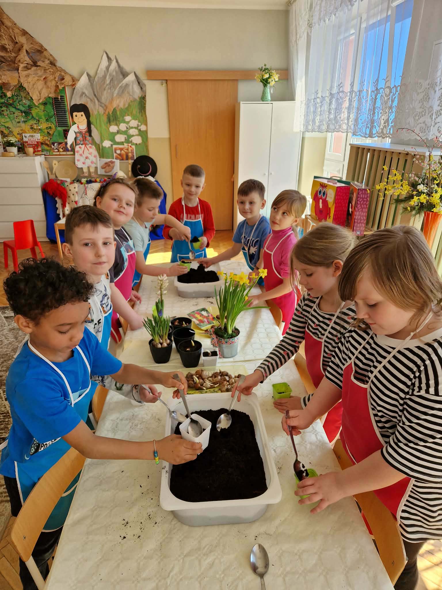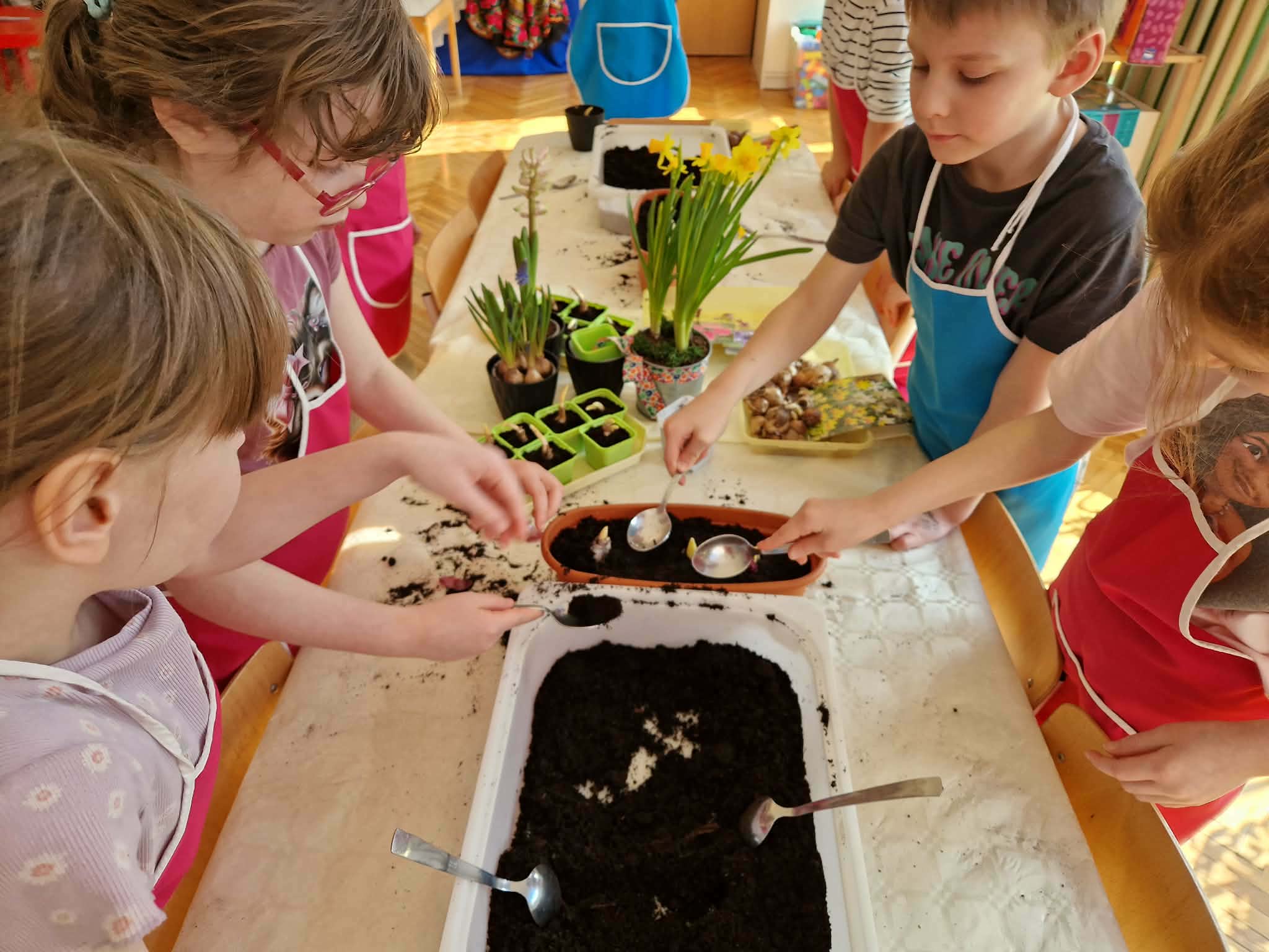 Starszaki tym razem zamieniły się w małych ogrodników. Na podstawie historyjki obrazkowej o "Małej cebulce krokusa" dowiedziały się co jest potrzebne roślinom do życia. Zapoznały się z budową kwiatów cebulowych. Następnie zasadziły cebule żonkili, hiacyntów i tulipanów. Wykonały również pracę plastyczną "Hiacynt"