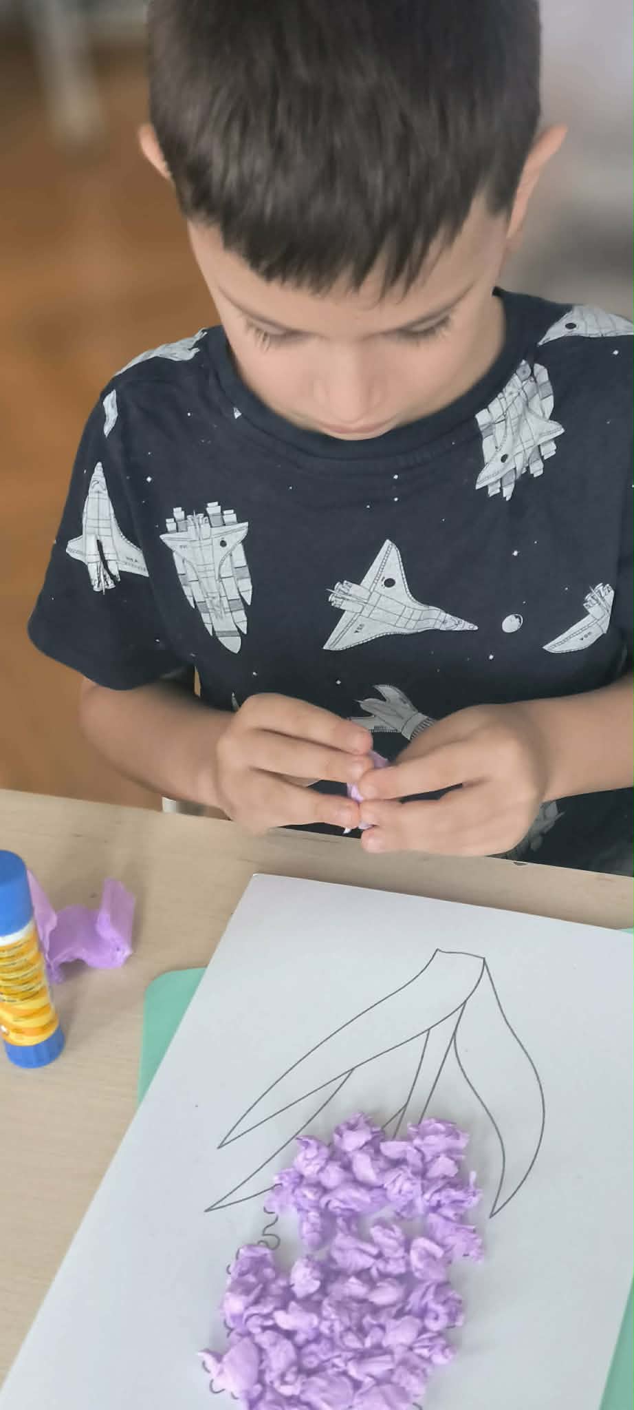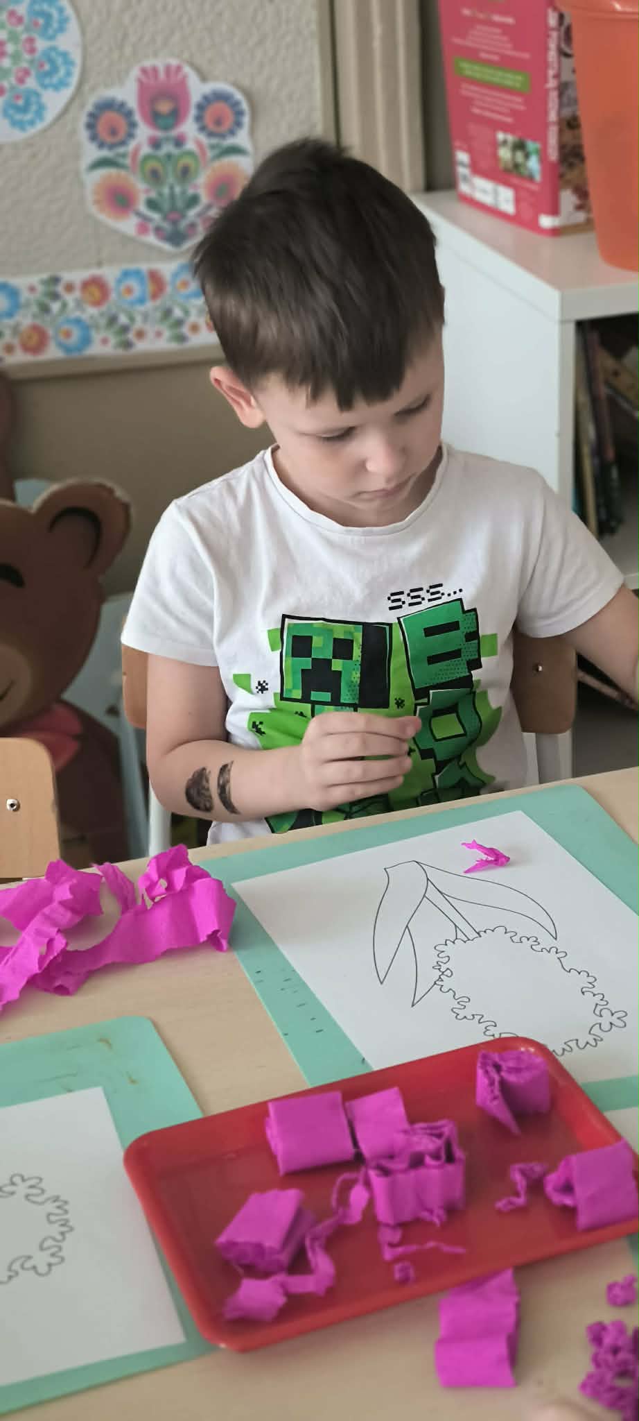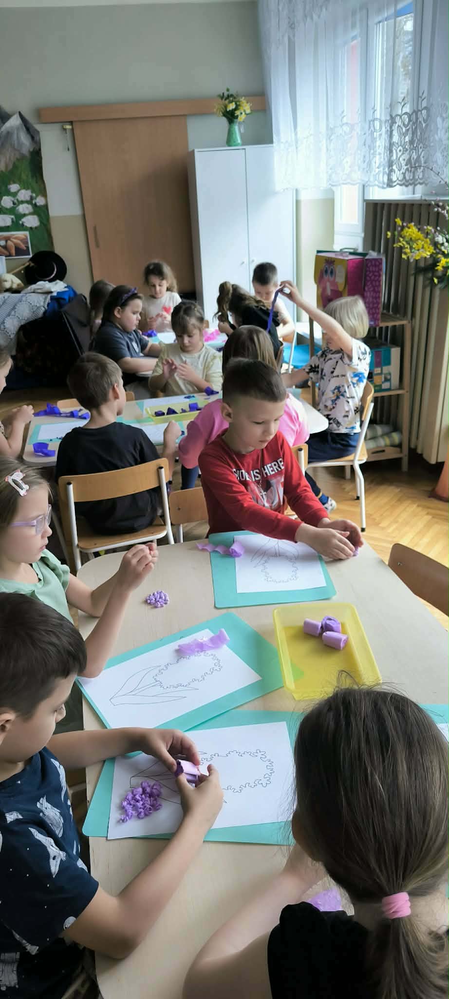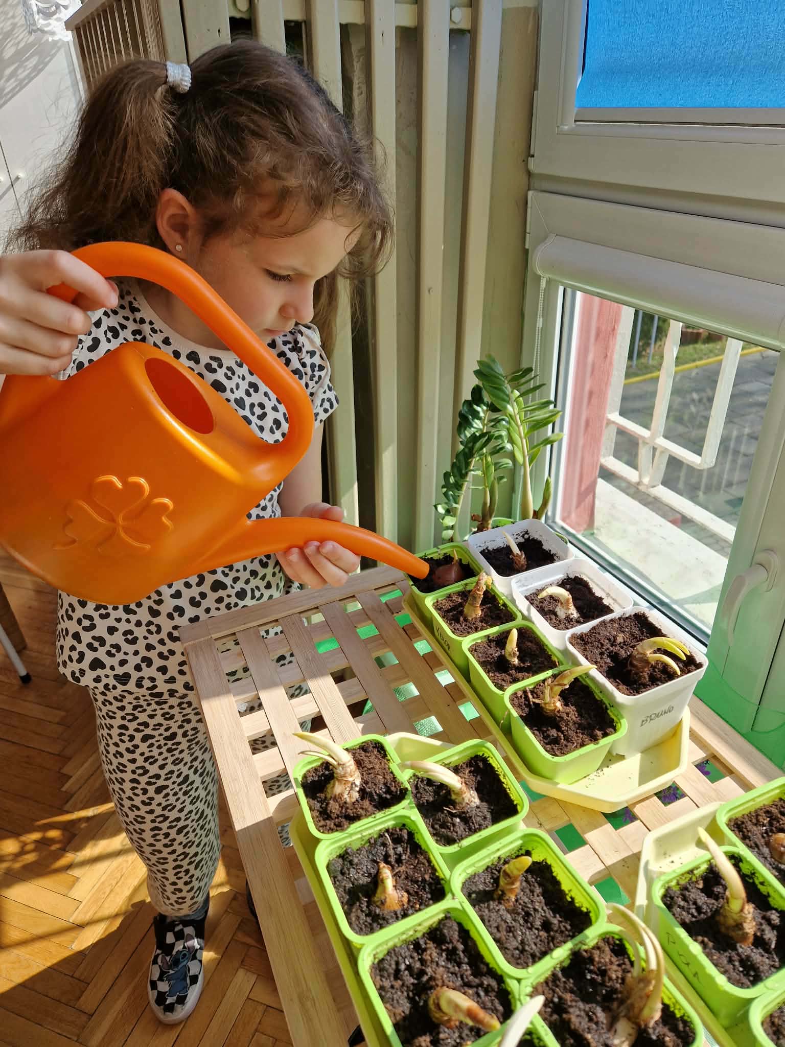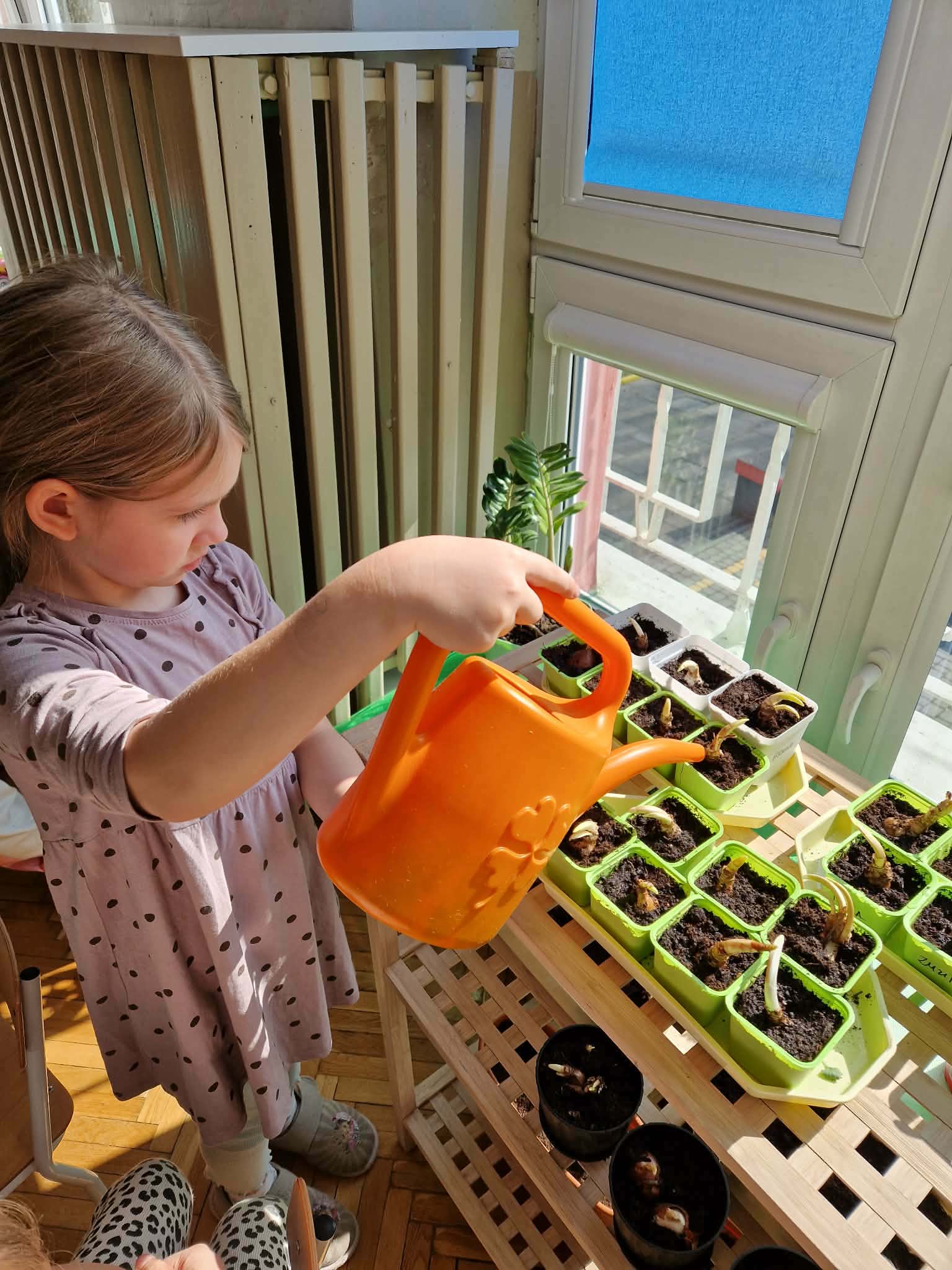 Starszaki tym razem zamieniły się w małych ogrodników. Na podstawie historyjki obrazkowej o "Małej cebulce krokusa" dowiedziały się co jest potrzebne roślinom do życia. Zapoznały się z budową kwiatów cebulowych. Następnie zasadziły cebule żonkili, hiacyntów i tulipanów. Wykonały również pracę plastyczną "Hiacynt"