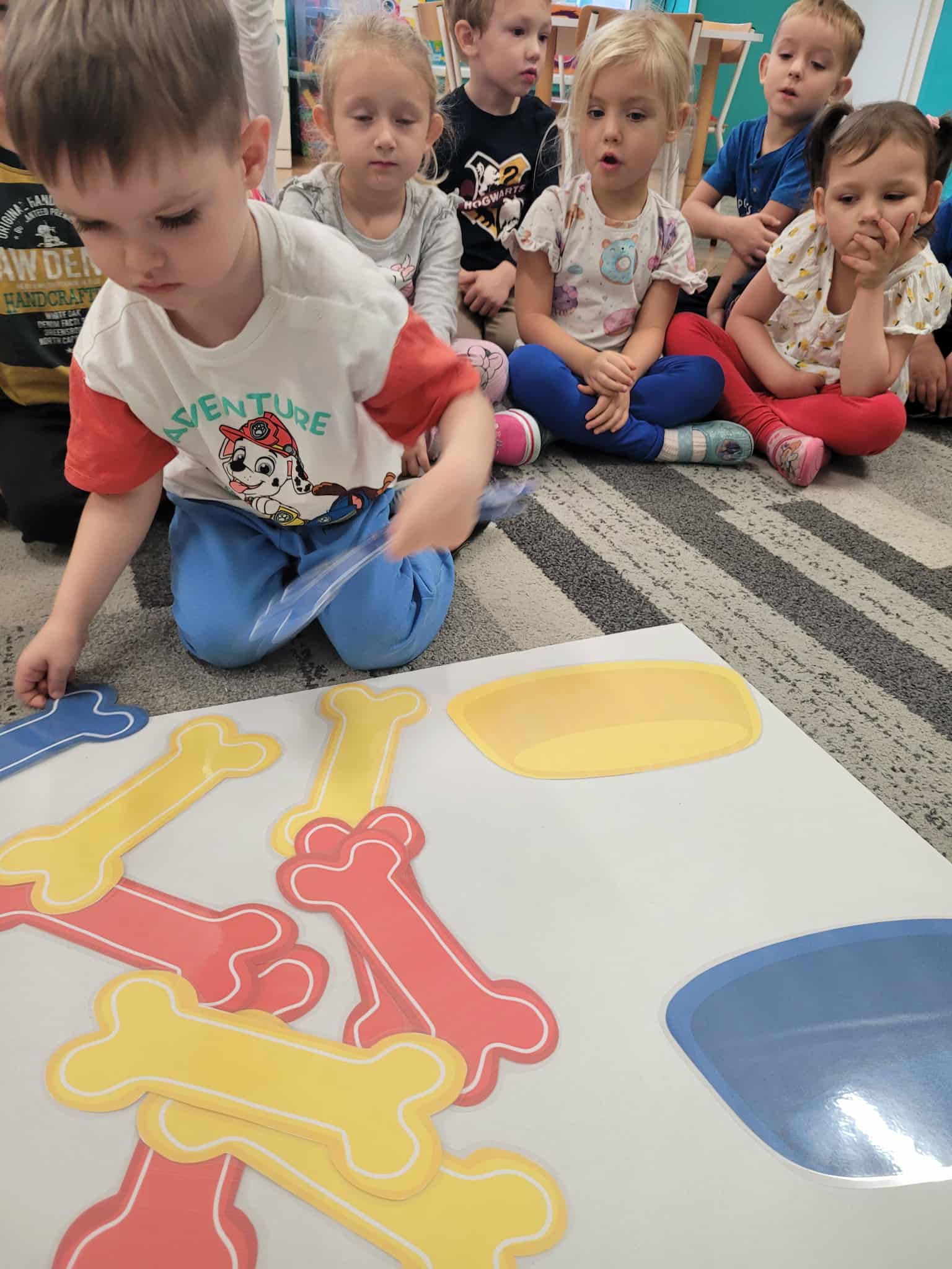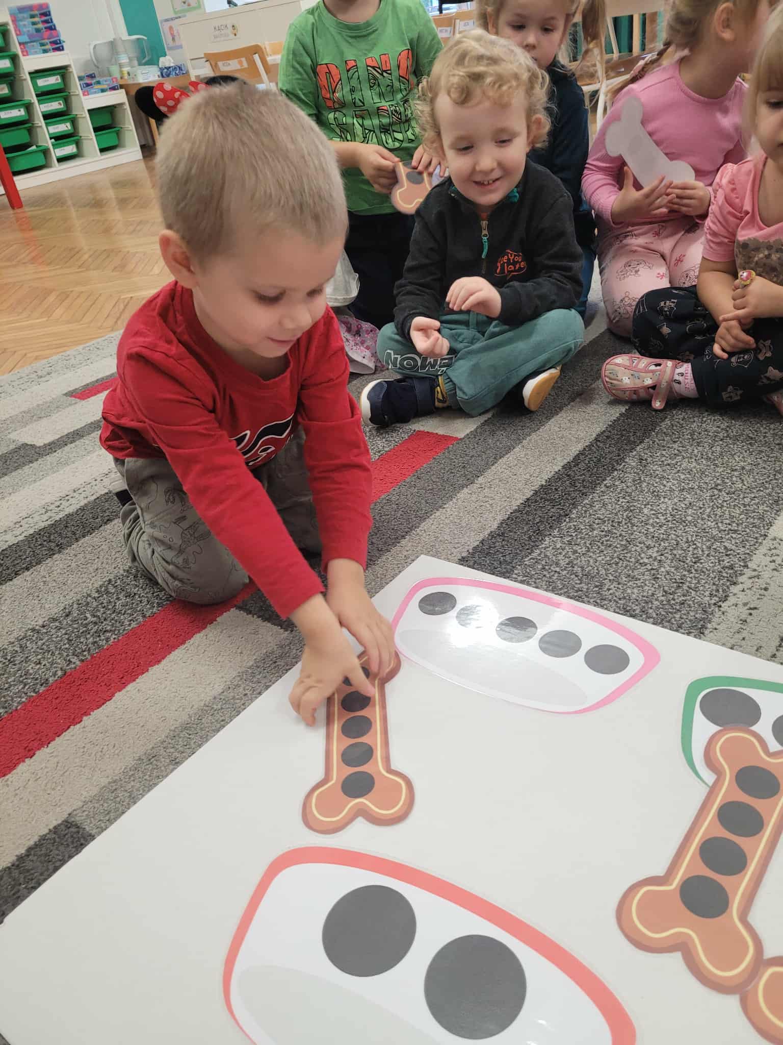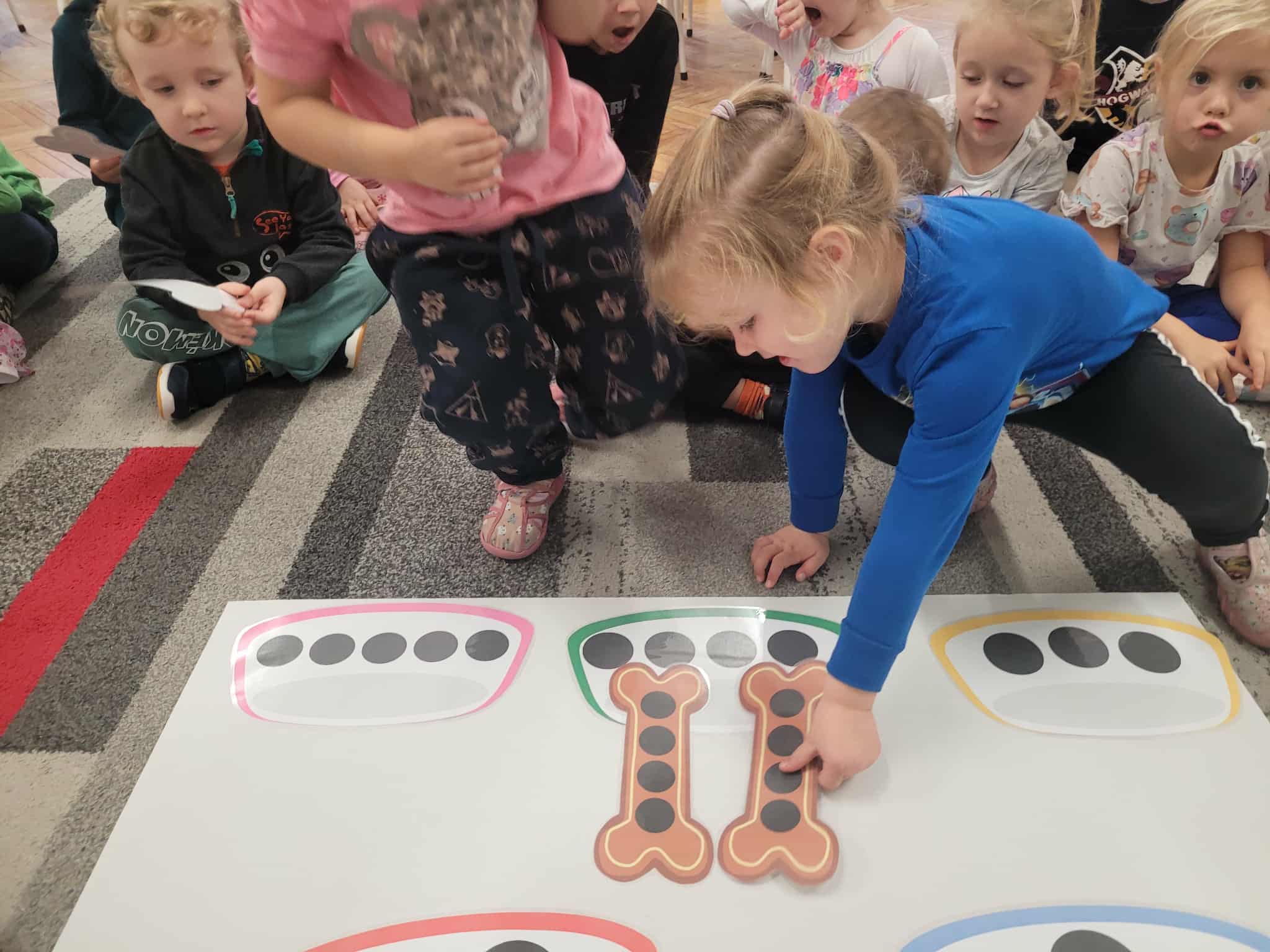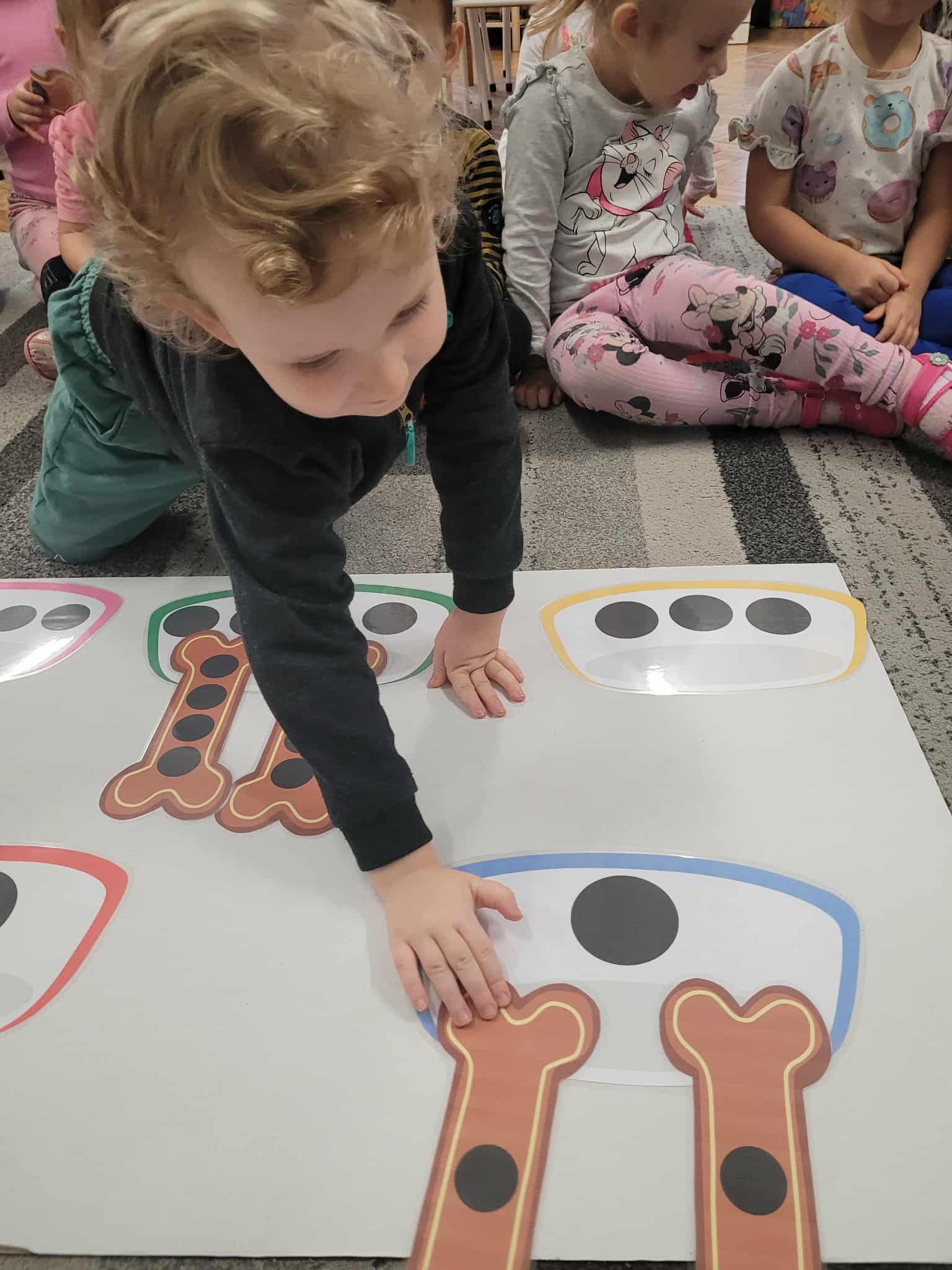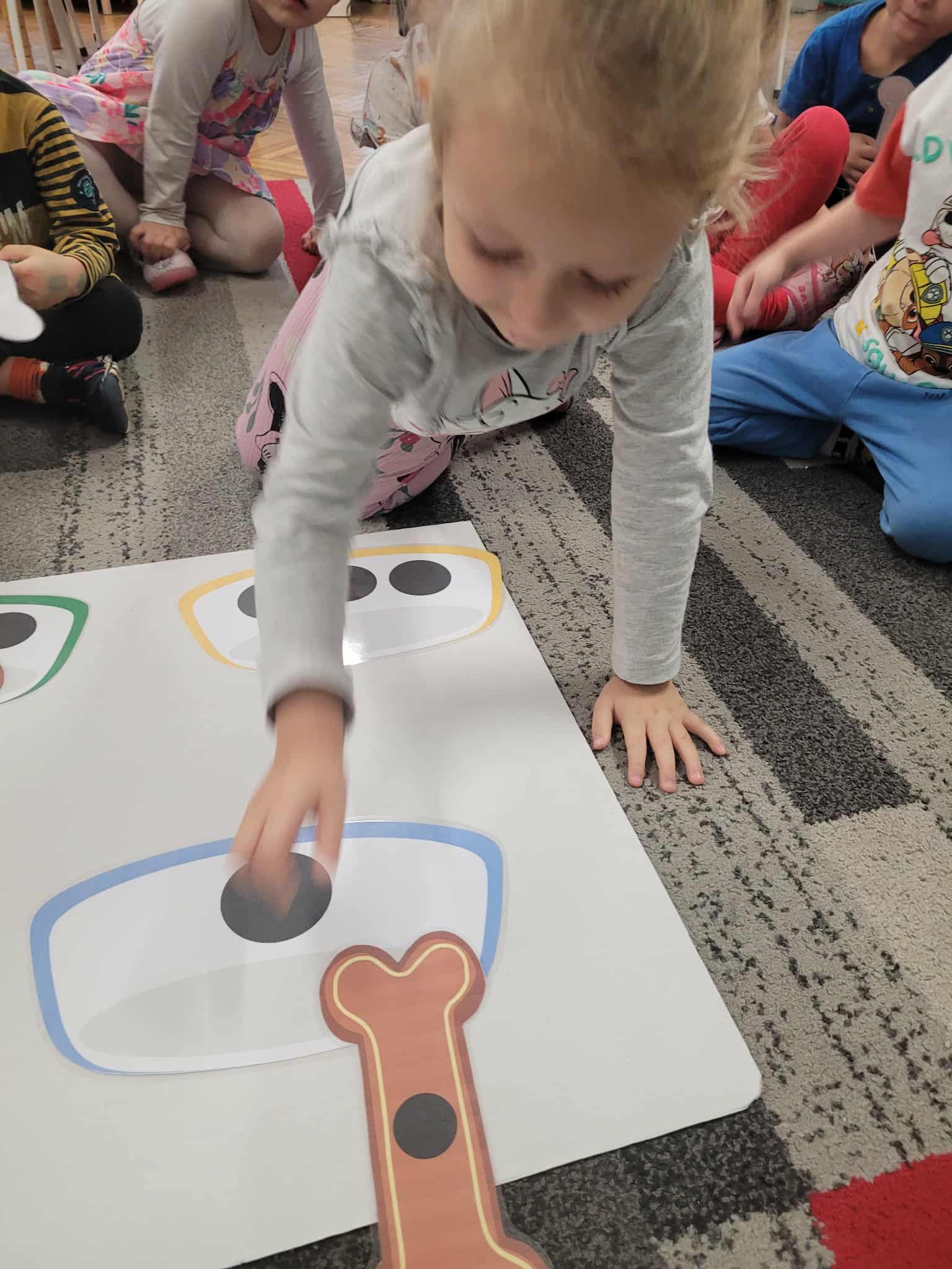 Dzieci bawiły się matematyką razem z pieskiem Borysem. Segregowały jego kości do odpowiednich miseczek i przeliczały ile ich jest. Losowały kostki z ilością kropek i dokładały to takich samych misek z taką samą ilościa kropek. Przeliczały elementy. Wiedziały, w której miseczce jest najmniej kostek, najwięcej, a w których jest tyle samo. Rozszyfrowywały zakodowany wzór kota Mruczka. wyszukiwały i przyklejały jego przysmaki. Na koniec najtrudniejsze zadanie wykonały bezblędnie. Dopasowywały elementy zwierząt, ich wyglądu, koloru do ich naturalmnych przedstawicieli. Ukladały puzzle i kolorowały obrazek swojego bajkowego lub domowego pieska.