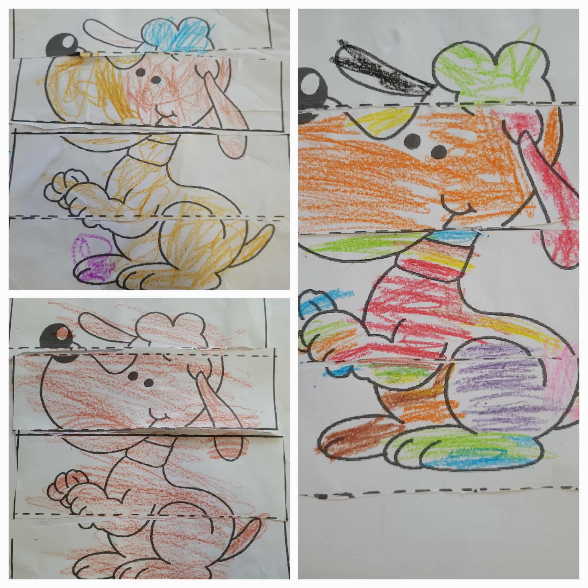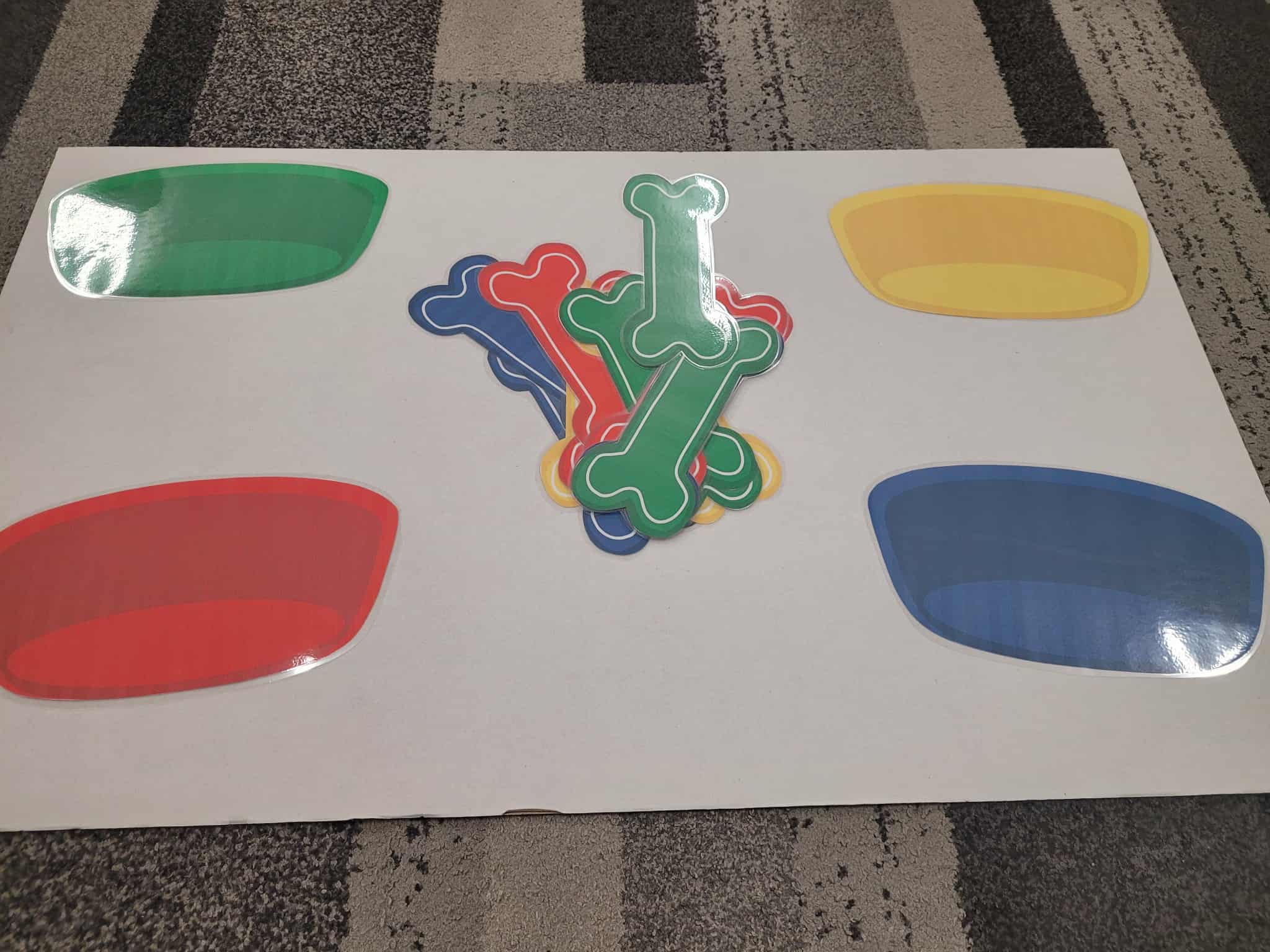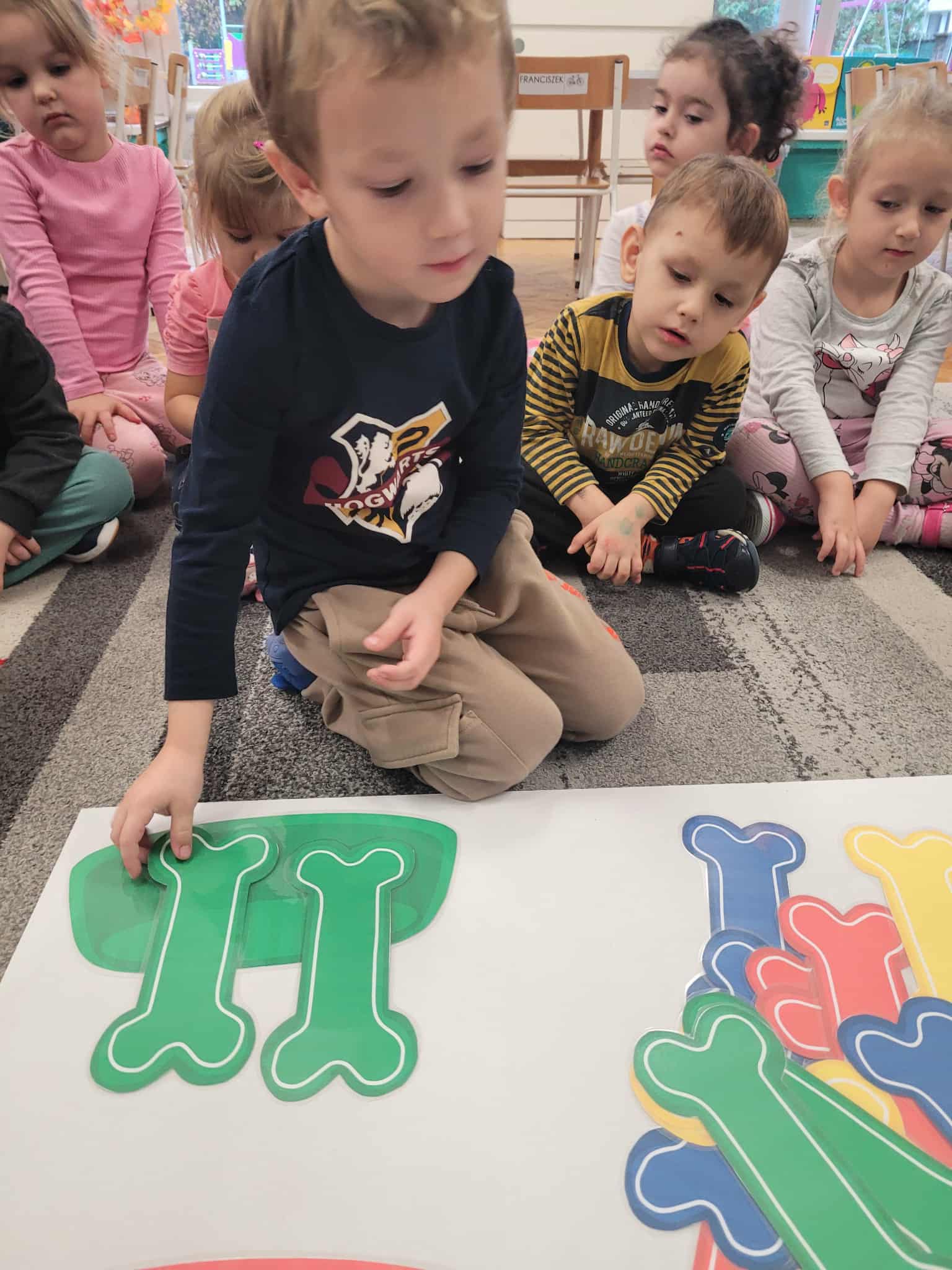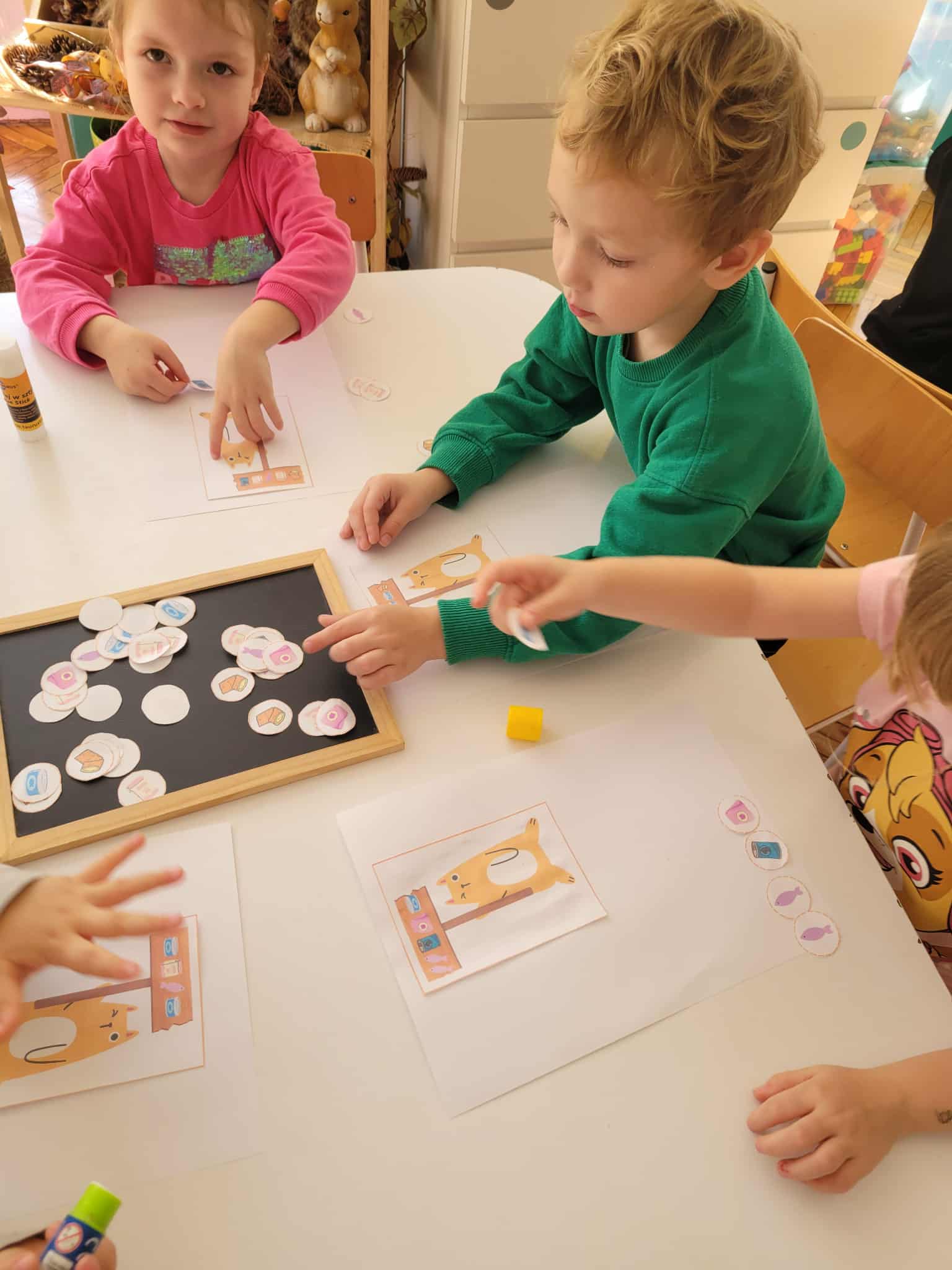 Dzieci bawiły się matematyką razem z pieskiem Borysem. Segregowały jego kości do odpowiednich miseczek i przeliczały ile ich jest. Losowały kostki z ilością kropek i dokładały to takich samych misek z taką samą ilościa kropek. Przeliczały elementy. Wiedziały, w której miseczce jest najmniej kostek, najwięcej, a w których jest tyle samo. Rozszyfrowywały zakodowany wzór kota Mruczka. wyszukiwały i przyklejały jego przysmaki. Na koniec najtrudniejsze zadanie wykonały bezblędnie. Dopasowywały elementy zwierząt, ich wyglądu, koloru do ich naturalmnych przedstawicieli. Ukladały puzzle i kolorowały obrazek swojego bajkowego lub domowego pieska.