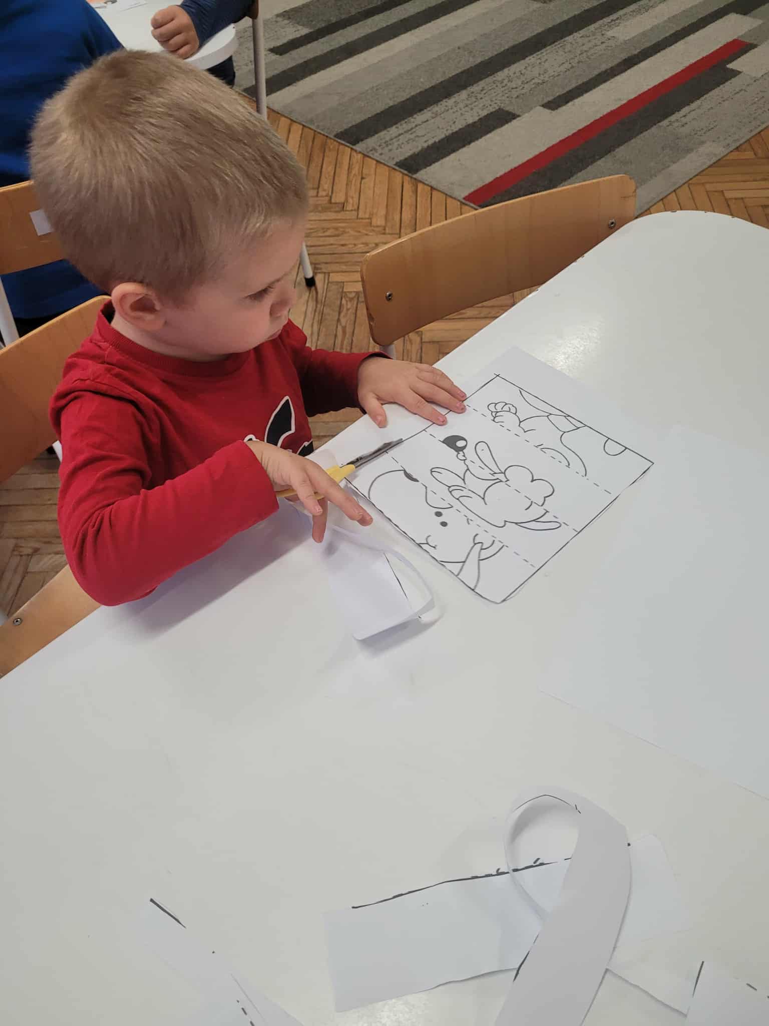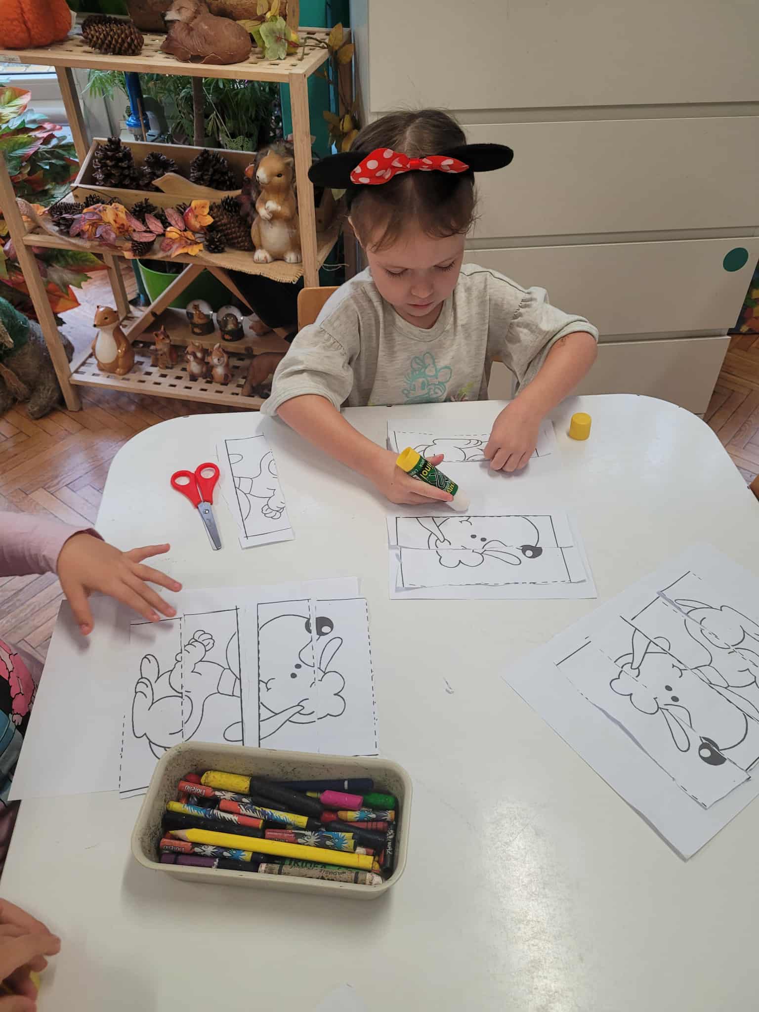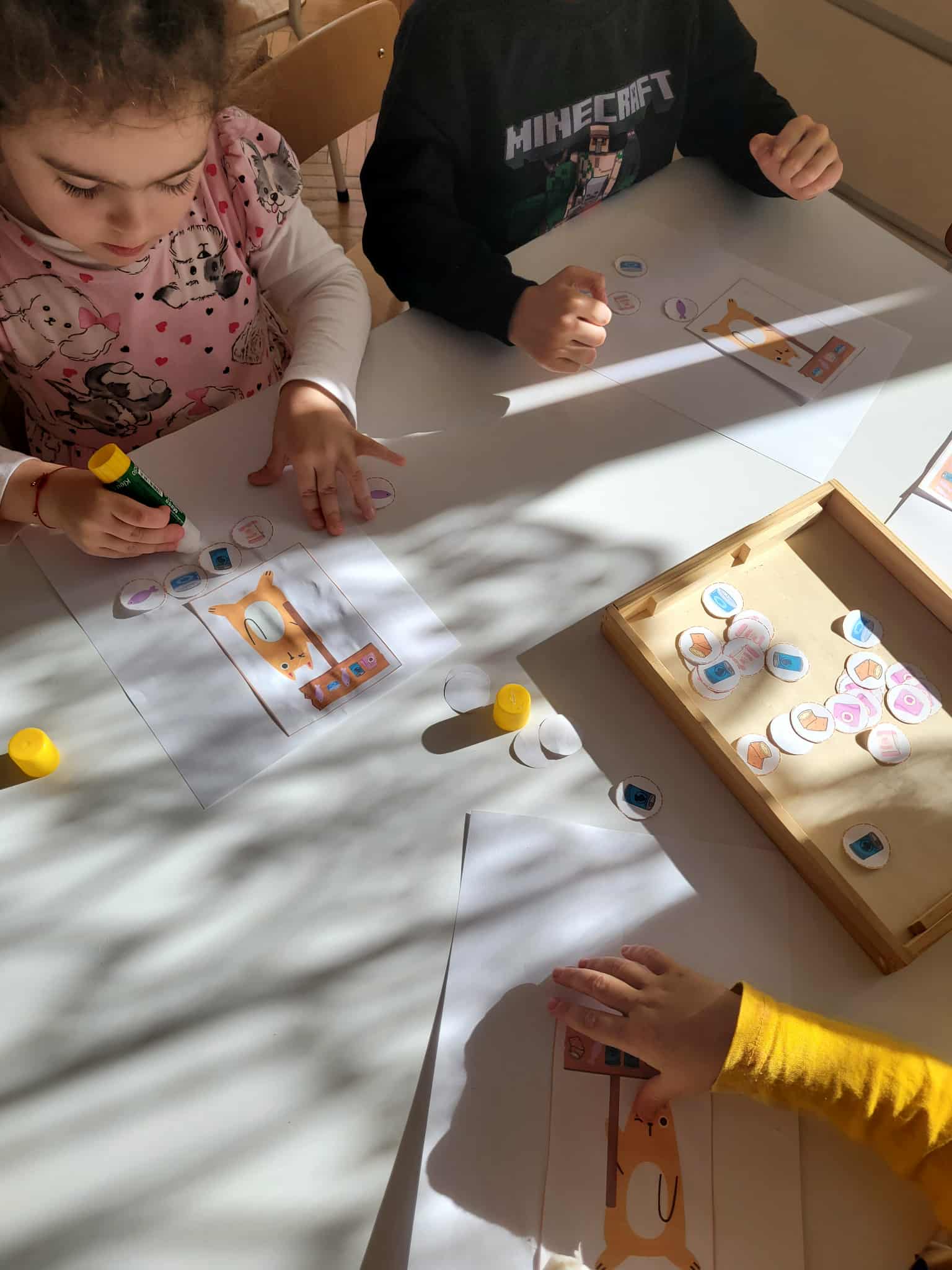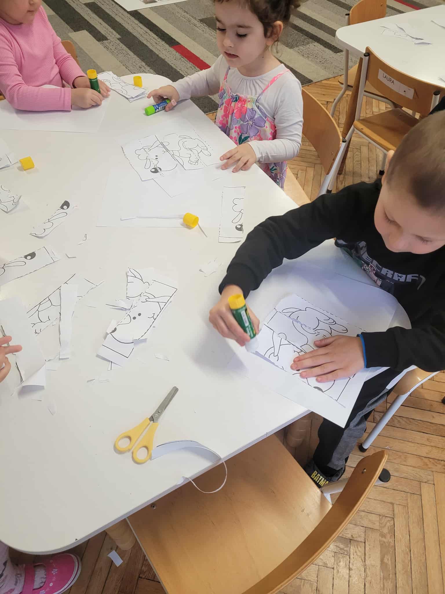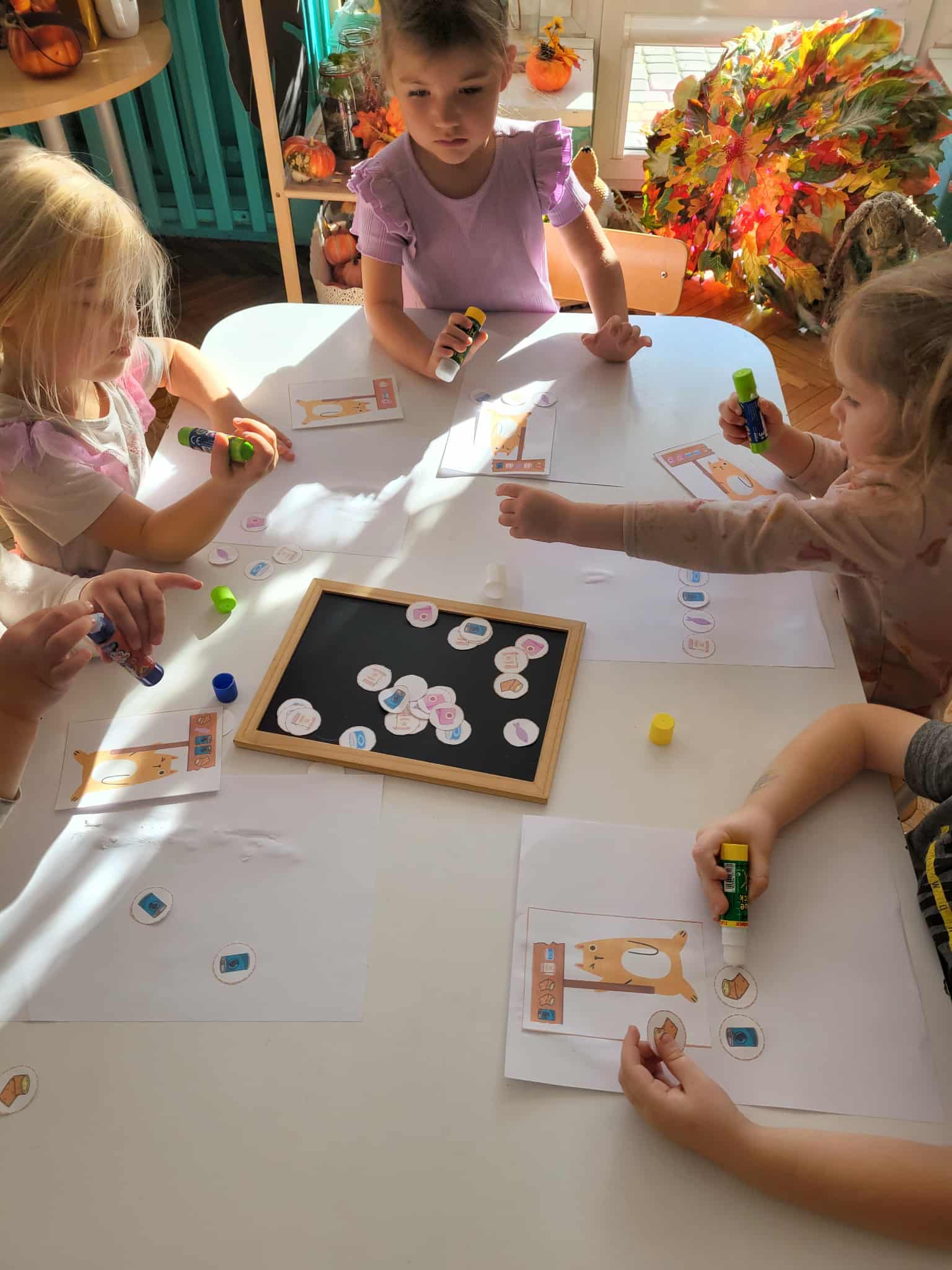 Dzieci bawiły się matematyką razem z pieskiem Borysem. Segregowały jego kości do odpowiednich miseczek i przeliczały ile ich jest. Losowały kostki z ilością kropek i dokładały to takich samych misek z taką samą ilościa kropek. Przeliczały elementy. Wiedziały, w której miseczce jest najmniej kostek, najwięcej, a w których jest tyle samo. Rozszyfrowywały zakodowany wzór kota Mruczka. wyszukiwały i przyklejały jego przysmaki. Na koniec najtrudniejsze zadanie wykonały bezblędnie. Dopasowywały elementy zwierząt, ich wyglądu, koloru do ich naturalmnych przedstawicieli. Ukladały puzzle i kolorowały obrazek swojego bajkowego lub domowego pieska.