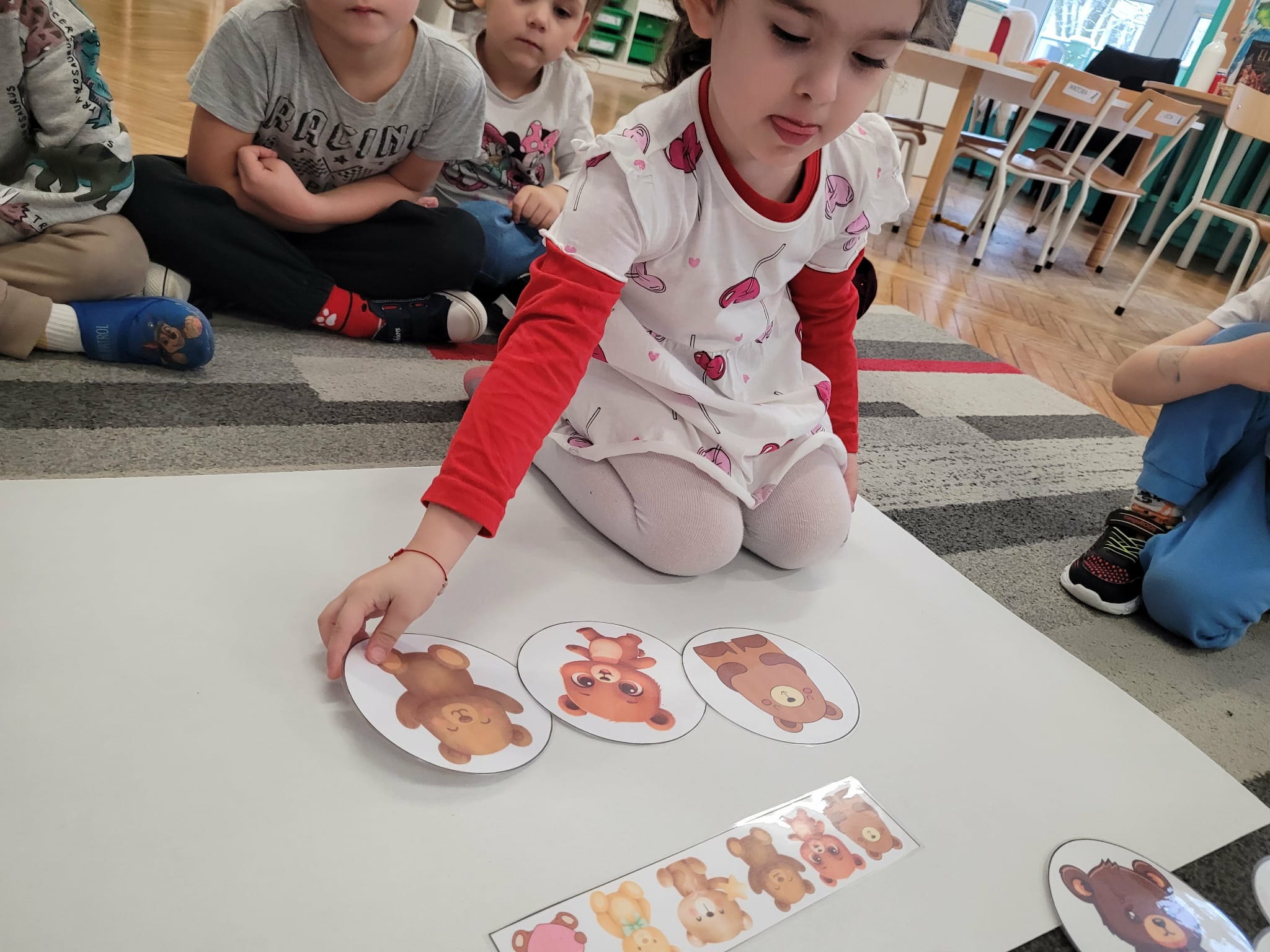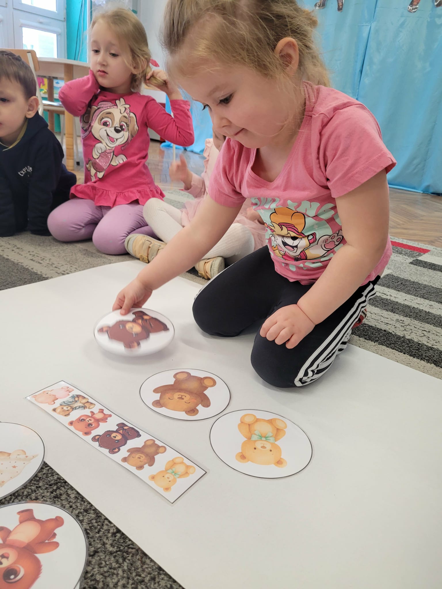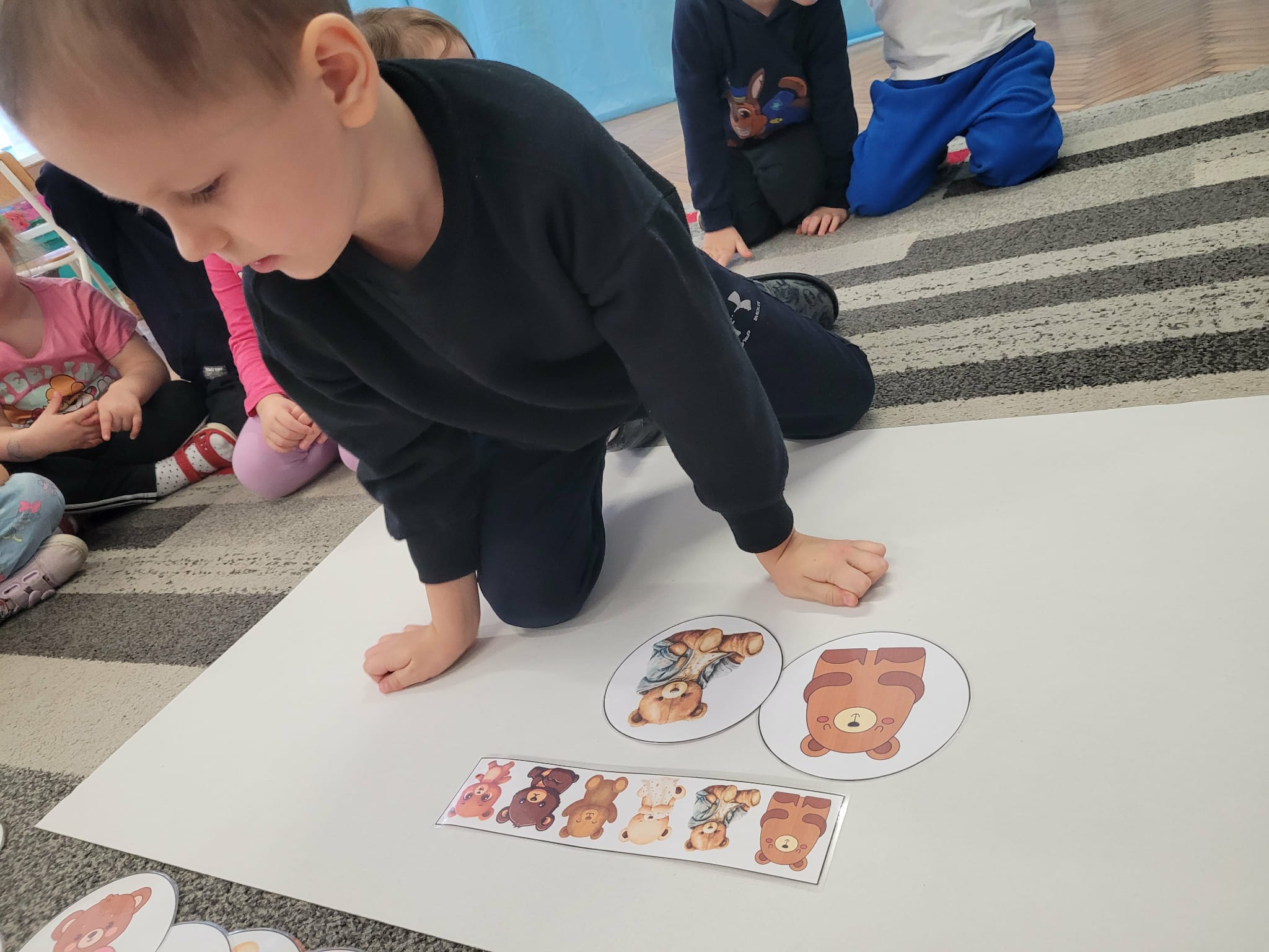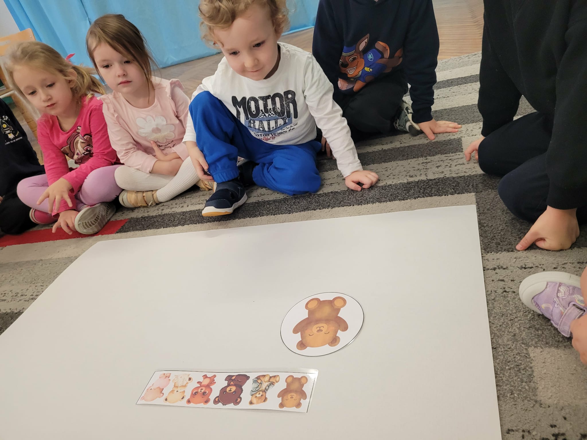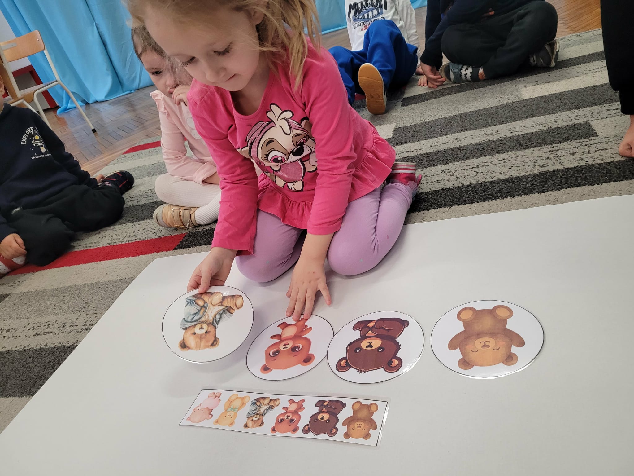 Matematyka wcale nie mjusi być trudna a z taką postacia jak pluszowy miś to wręcz łatwizna. Przekonaly się o tym dzieci, wykonując różnorodne zadania matematyczne. Dopasowywały cienie oraz szaliki do misiów. Ćwiczyliśmy percepcję wzrokową i wyszukiwaliśmy w zespołach misia zgodnego z opisem słownym. Potem na czas ukladaliśmy misie według kodu. Na zakończenie zajęć kazde dziecko wykonalo swojego misia i wkleiło go w ramkę.