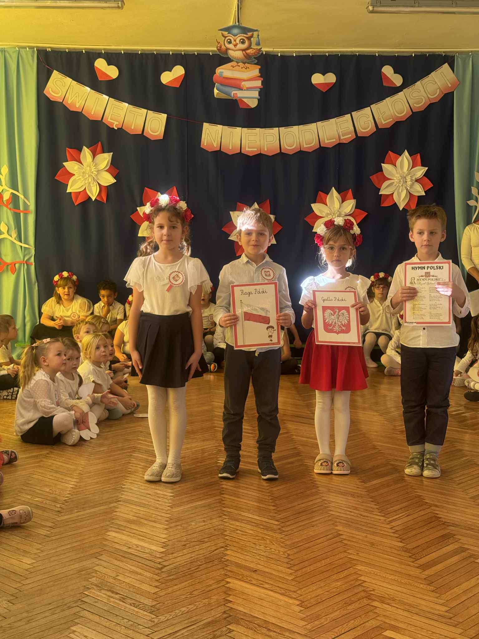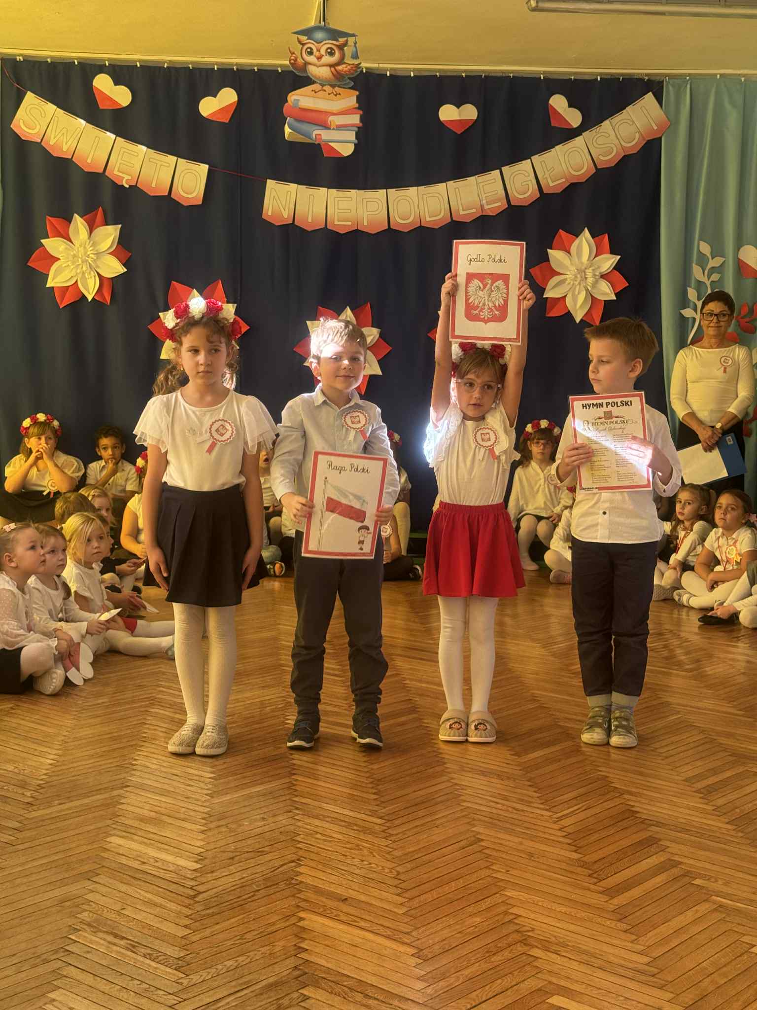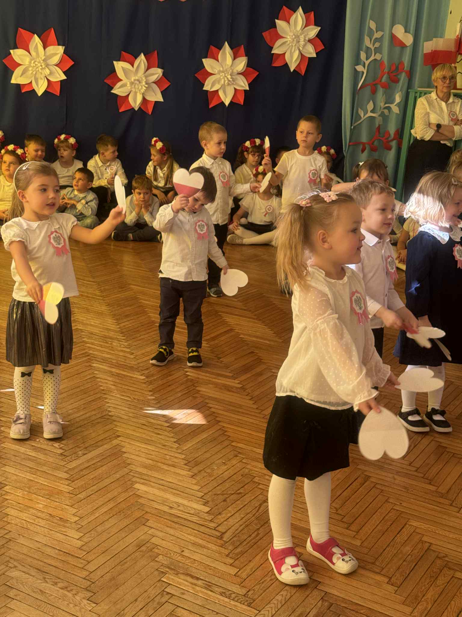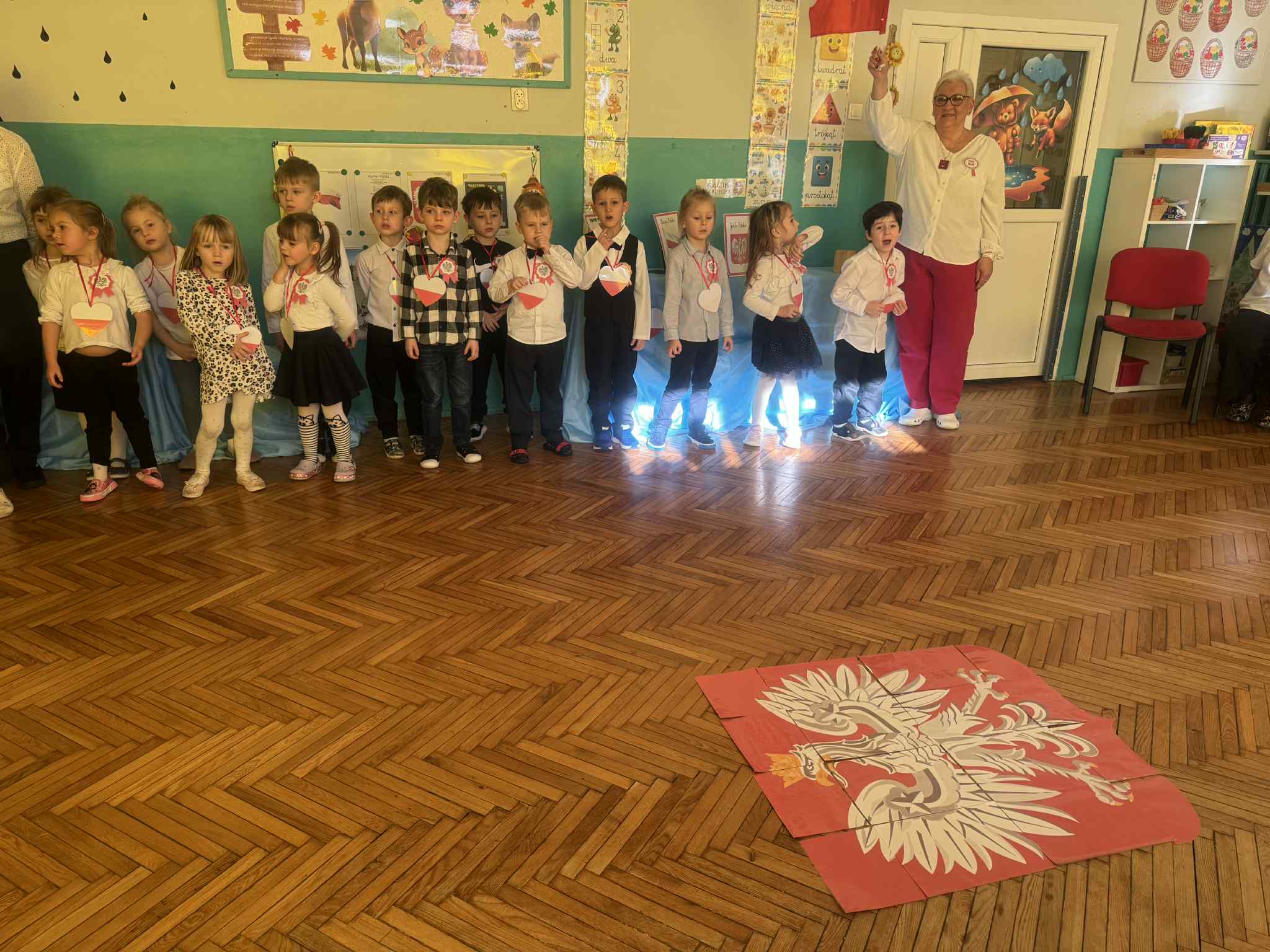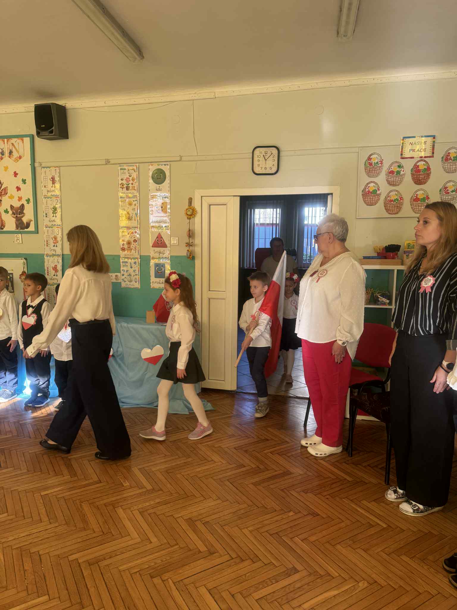 Odświętne stroje (kotyliony, wianuszki biało- czerwone), piękna kolorystyka sprawiła, że w tym dniu towarzyszyła nam niesamowita atmosfera.