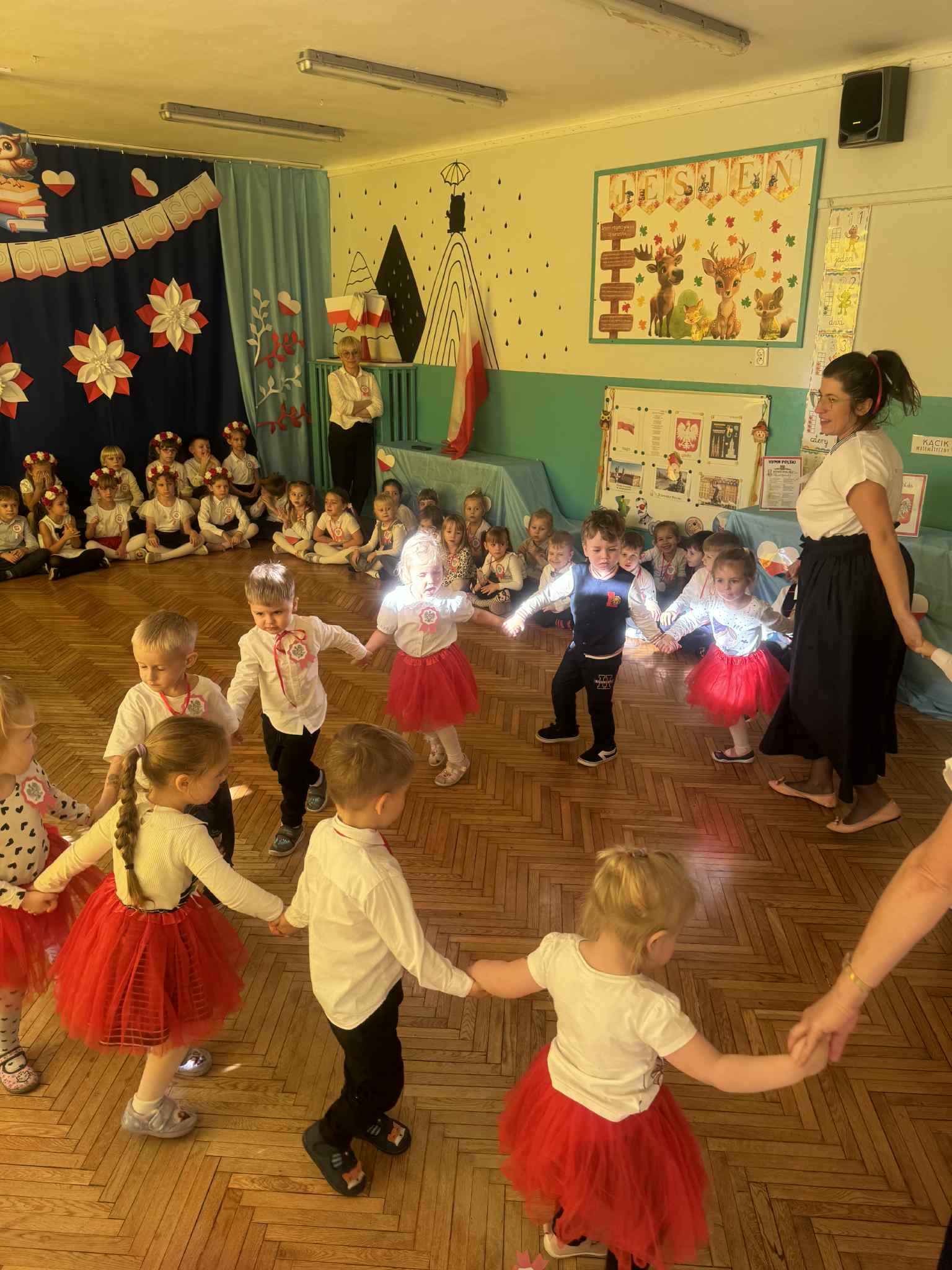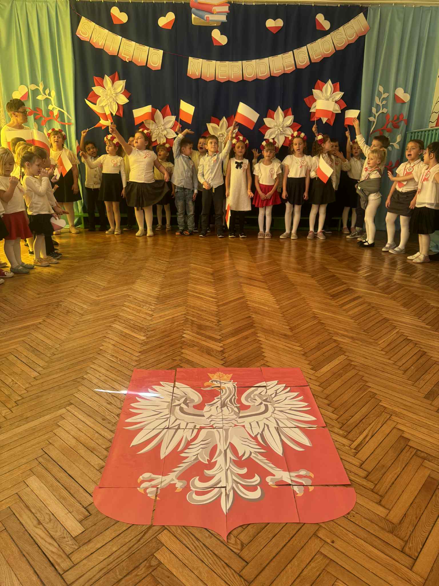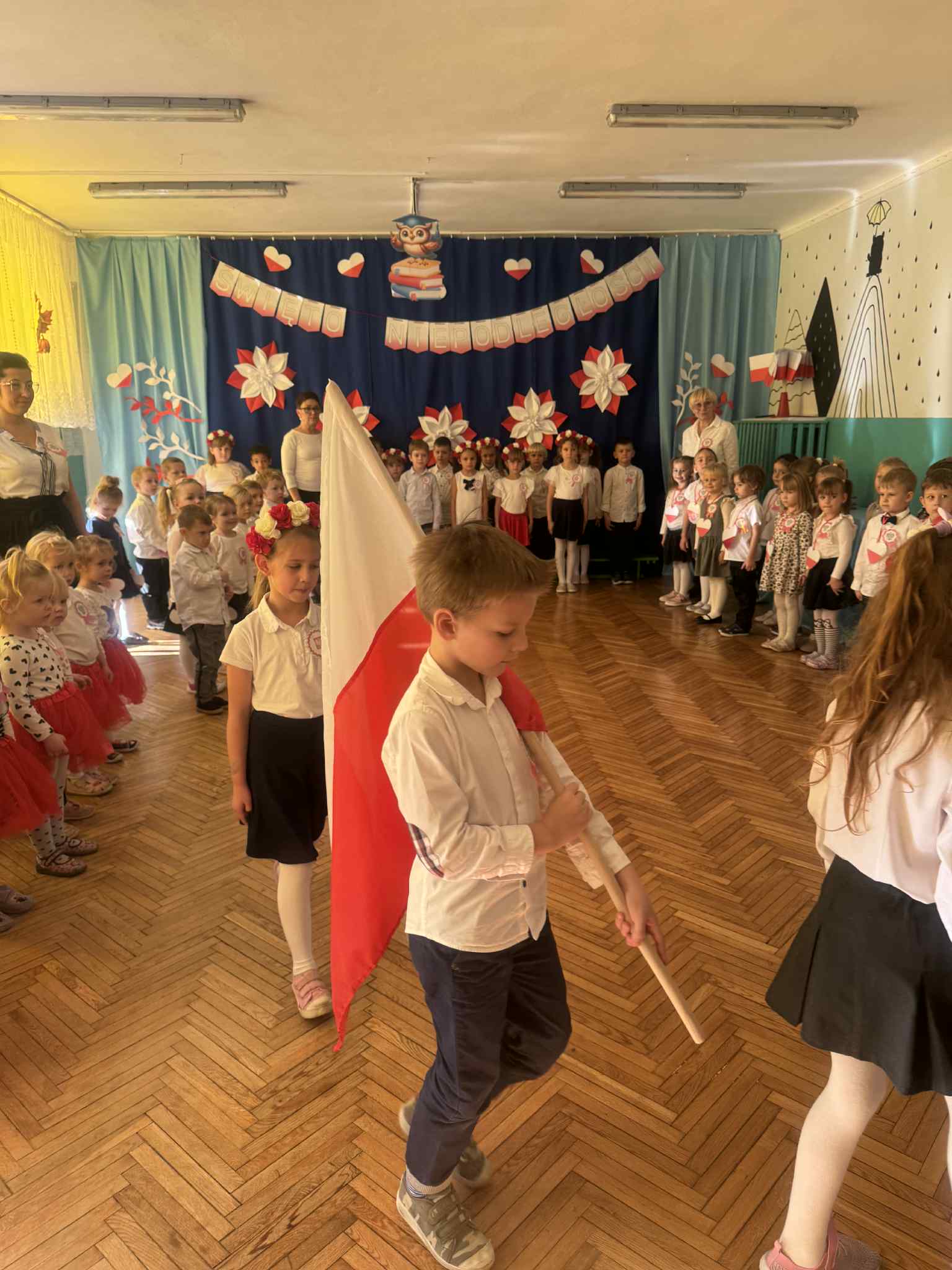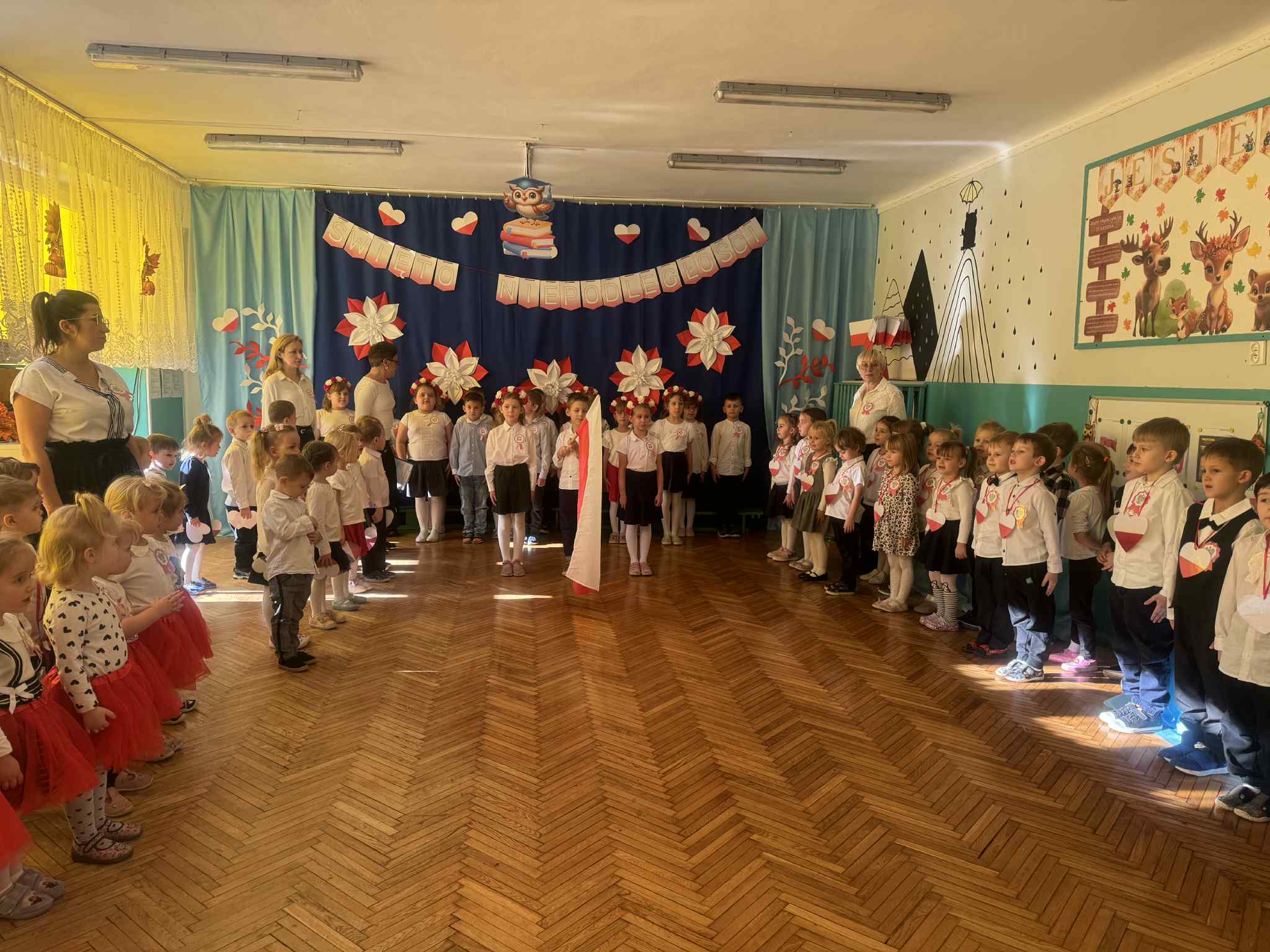 07 listopada 2025r w naszym przedszkolu odbyła się uroczystość upamiętniająca 107 rocznicę odzyskania niepodległości przez Polskę. Z tej okazji dzieci ze wszystkich grup oraz pracownicy przedszkola zebrali się, aby uroczyście świętować ten wyjątkowy dla Polaków czas. Wszyscy z powagą i w dużym skupieniu oglądali program artystyczny przygotowany przez dzieci ze starszych i młodszych grup przedszkolnych.