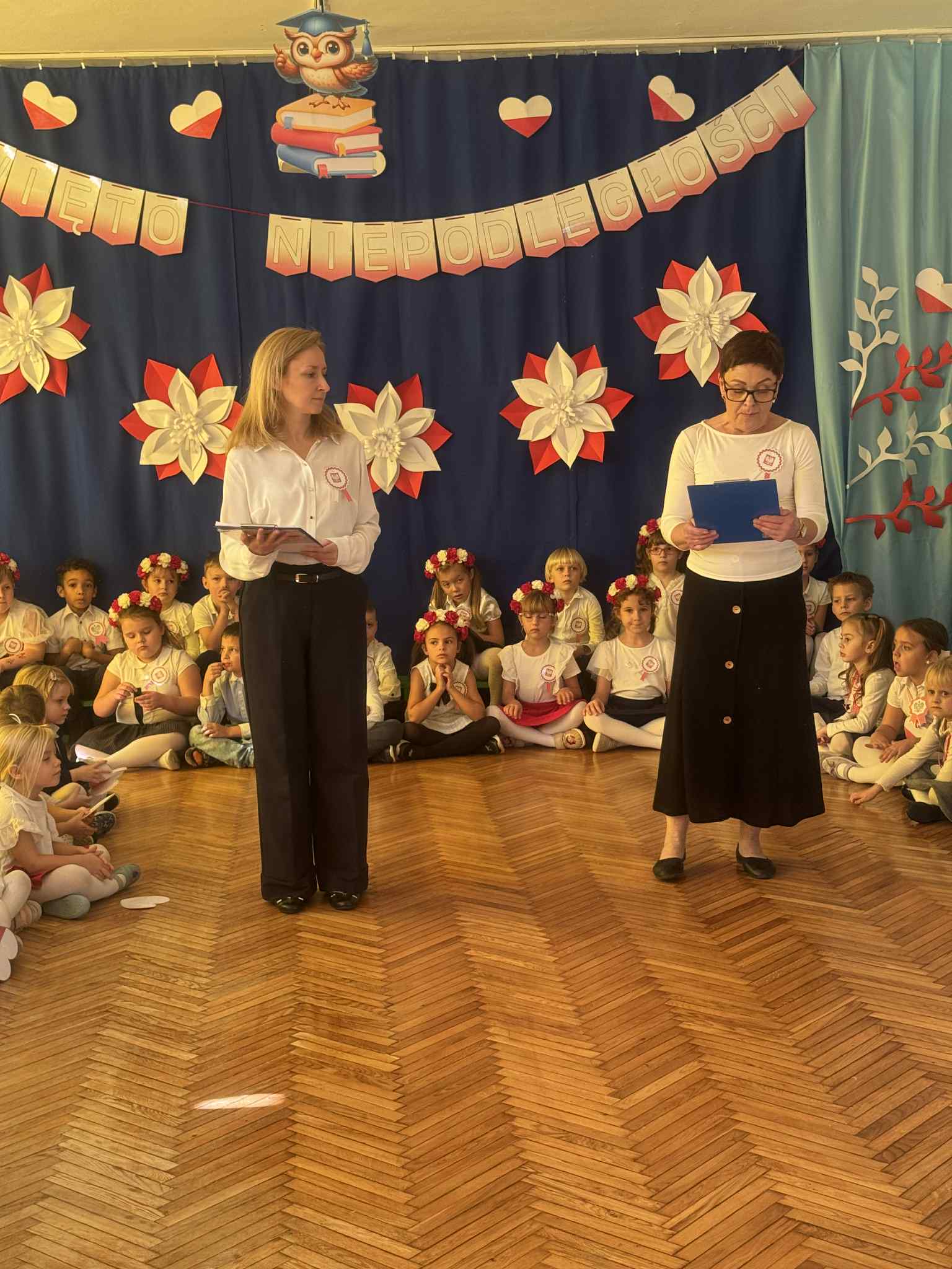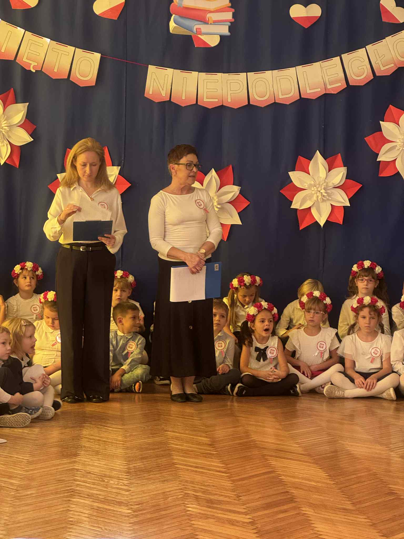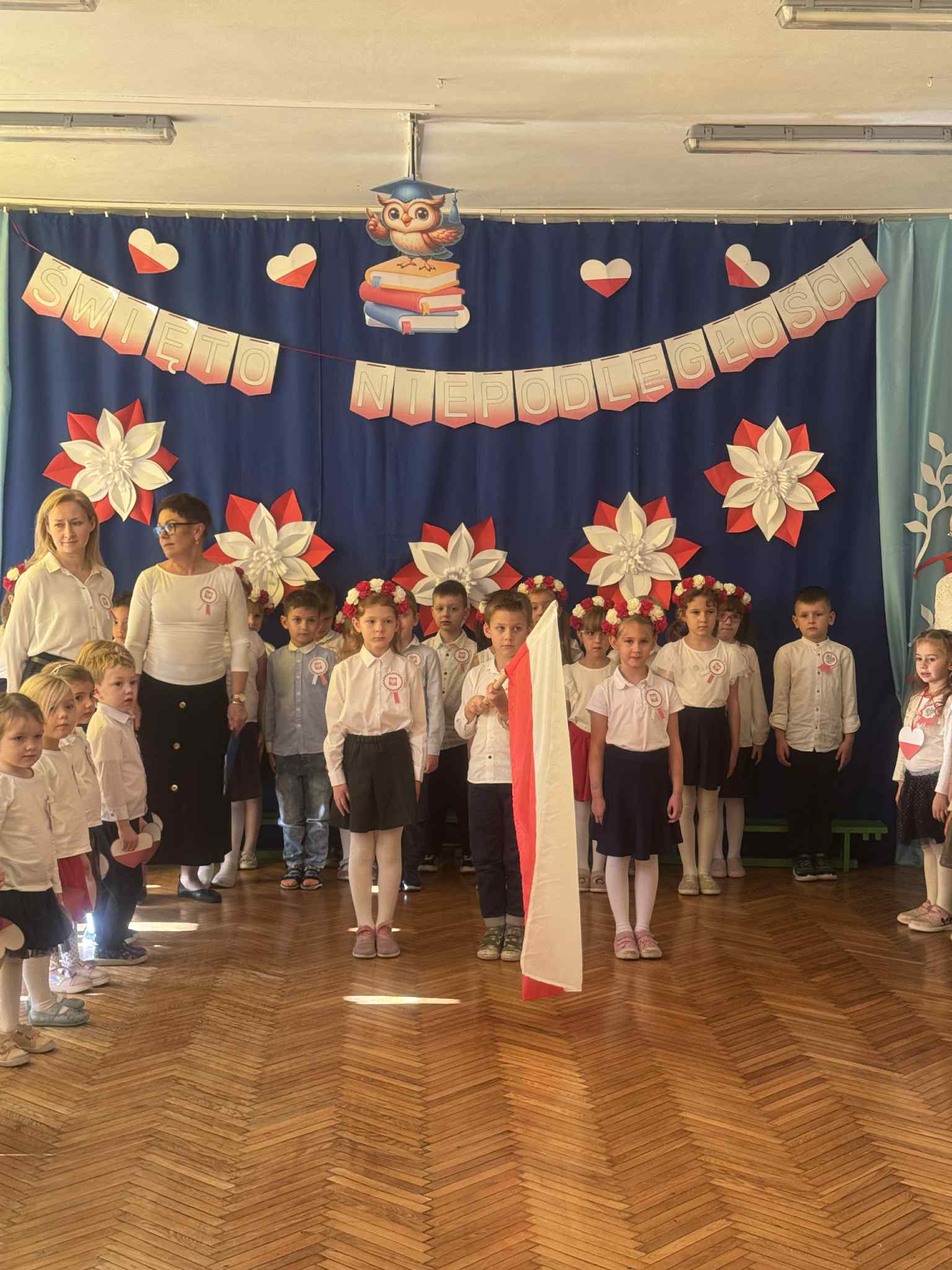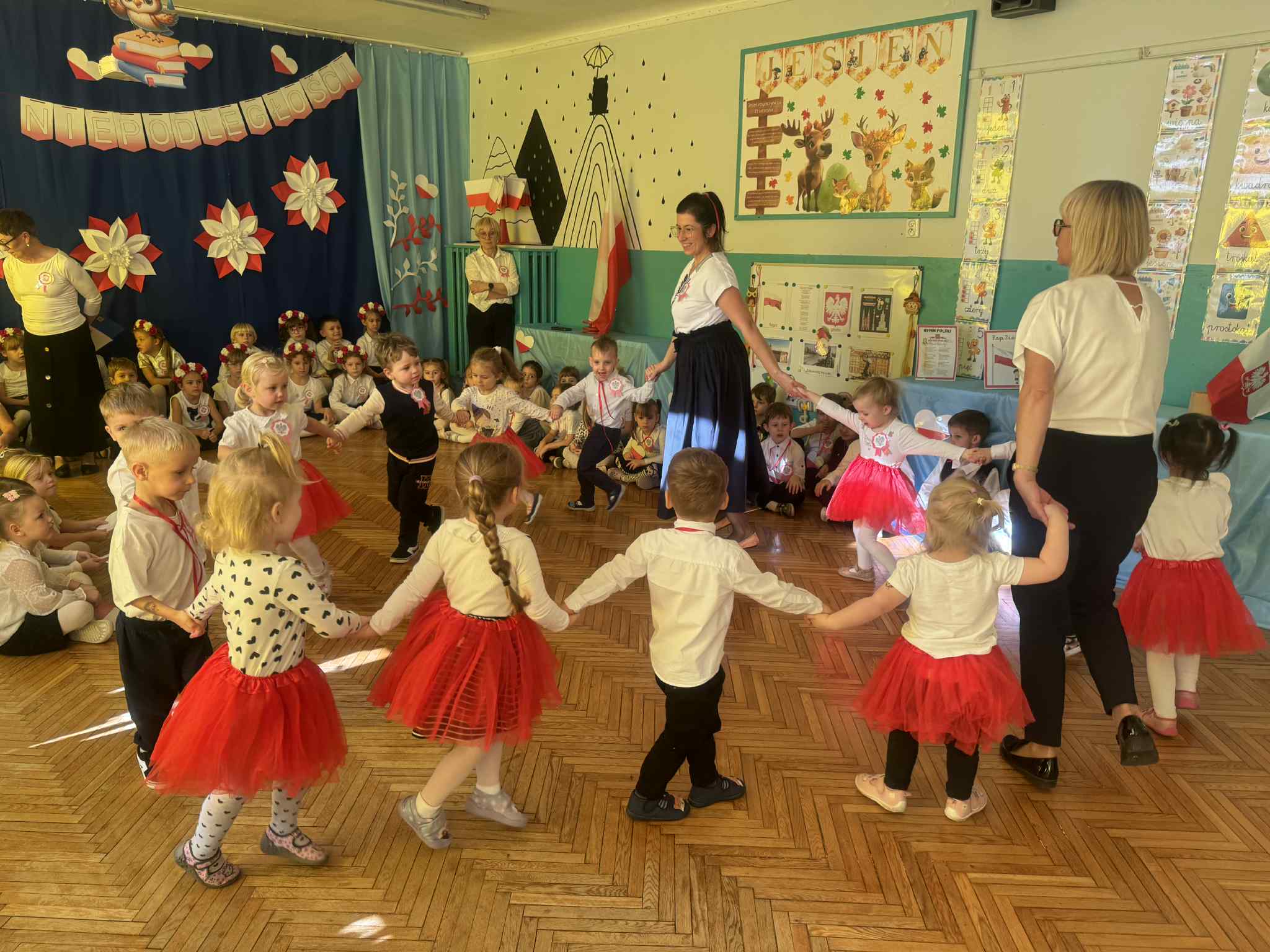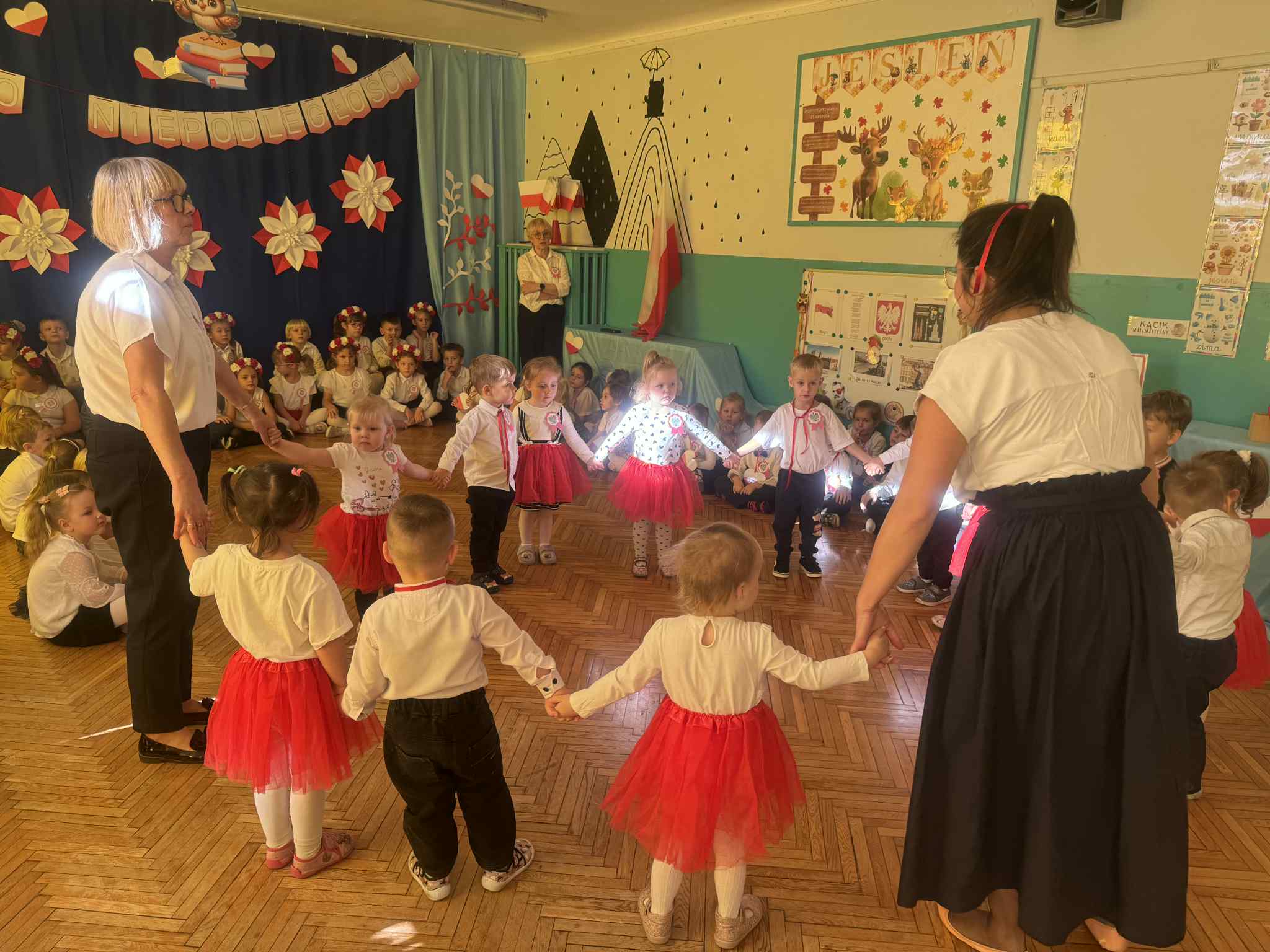07 listopada 2025r w naszym przedszkolu odbyła się uroczystość upamiętniająca 107 rocznicę odzyskania niepodległości przez Polskę. Z tej okazji dzieci ze wszystkich grup oraz pracownicy przedszkola zebrali się, aby uroczyście świętować ten wyjątkowy dla Polaków czas. Wszyscy z powagą i w dużym skupieniu oglądali program artystyczny przygotowany przez dzieci ze starszych i młodszych grup przedszkolnych.