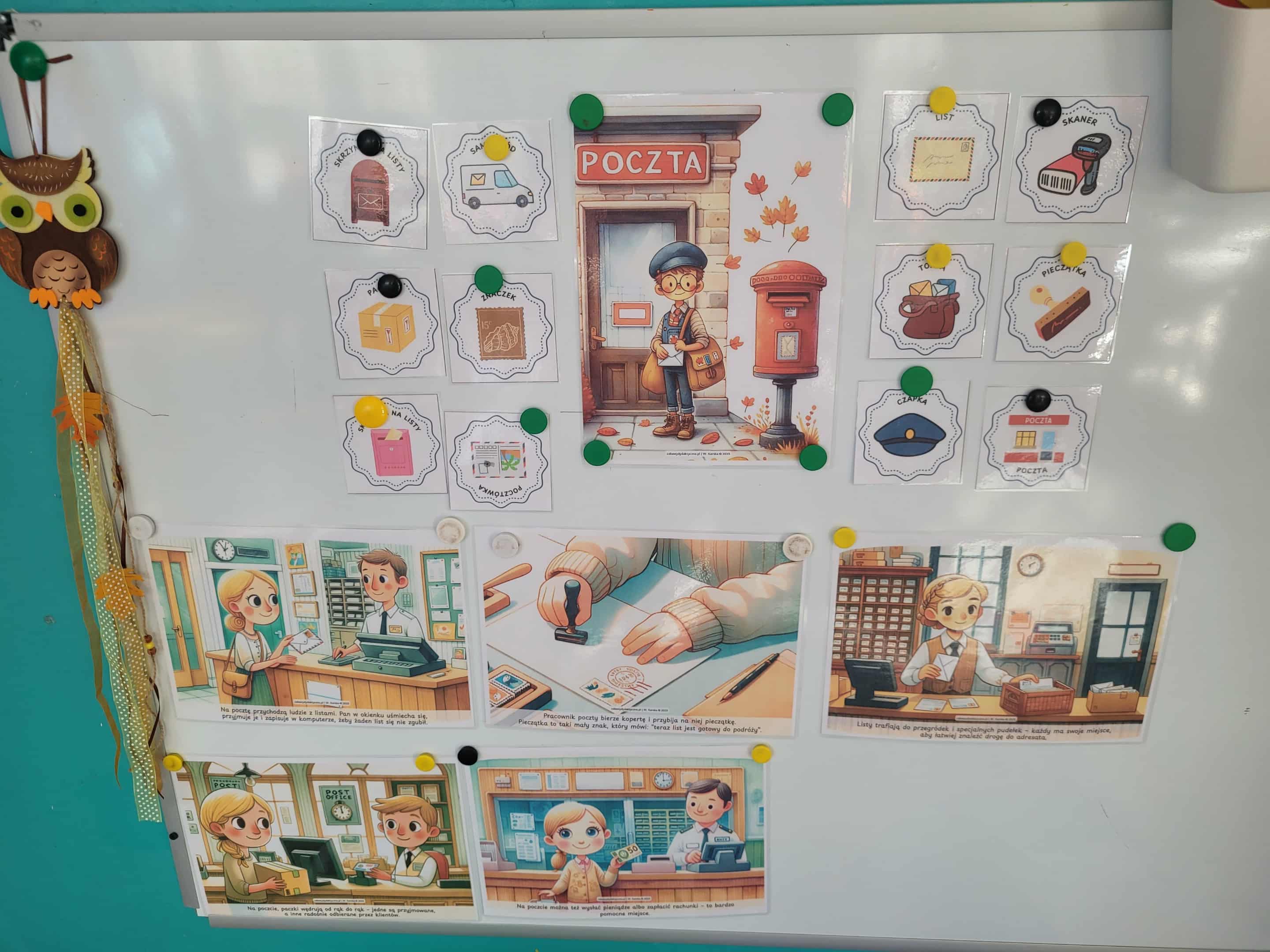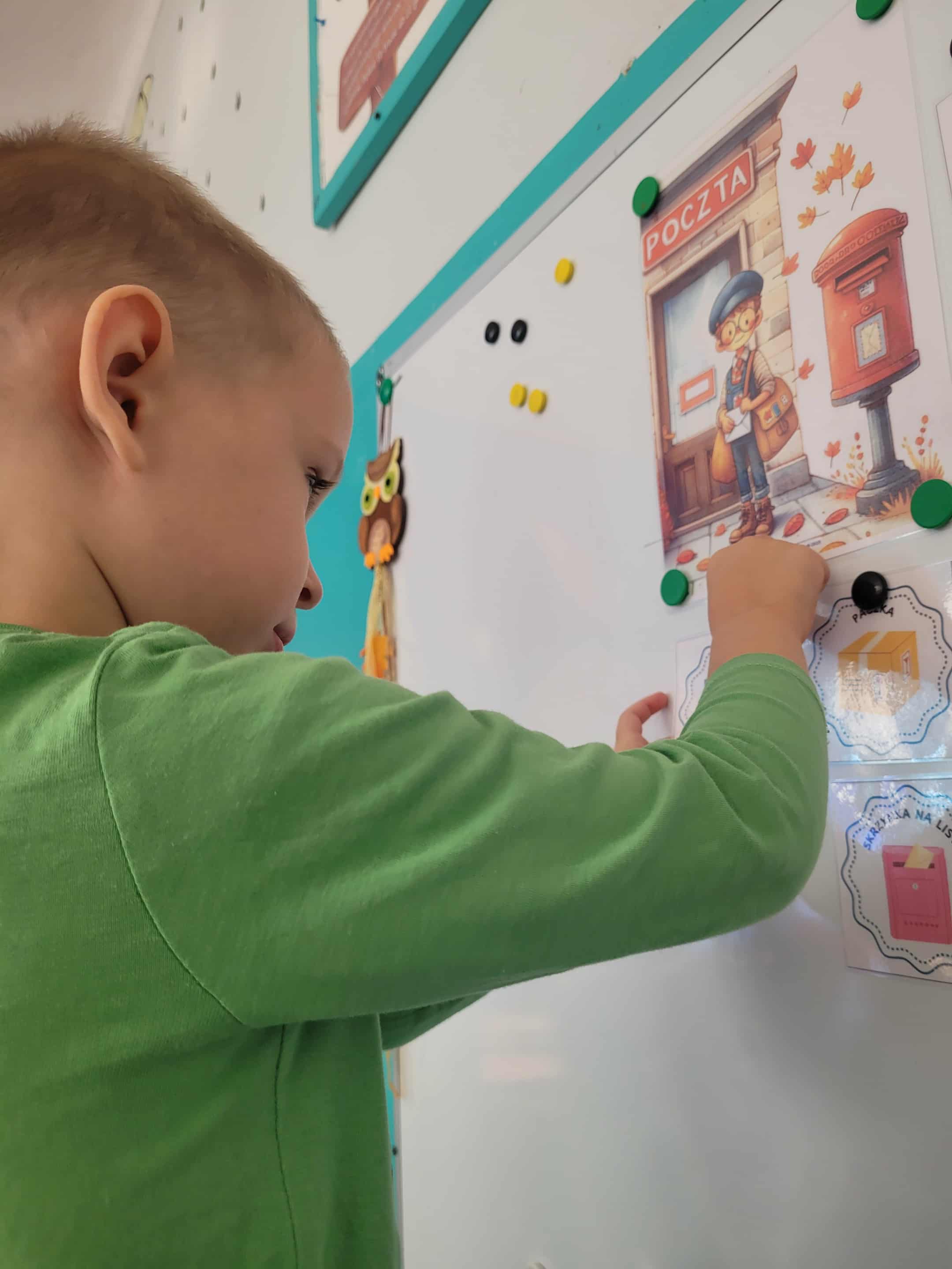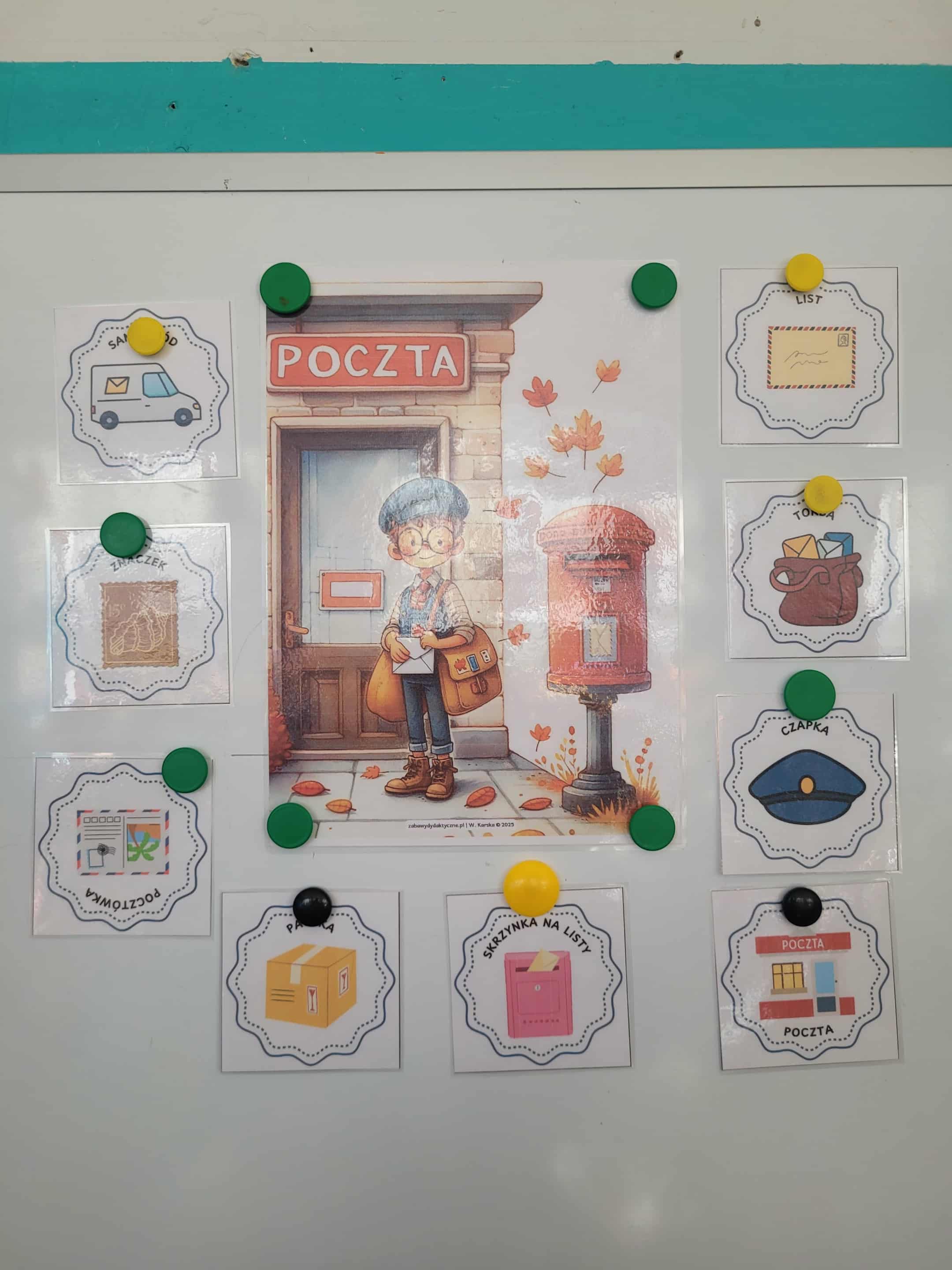 17 października obchodzimy dzień Poczty Polskiej i Listonosza. Dzieci dowiedziały się czym zajmuje się pan listonosz, jak jest ubrany, gdzie pracuje i jakie są jego atrybuty. Na podstawie hisotryjki obrazkowej wiedzą czym jest Urząd Pocztowy i co można w nim zrobić i kupić. Dzieci starały sie połączyć ze soba kropki w celu odszyfrowania obrazka. Jak zawsze wszystkie nasze katywności przeplatają się z zabawami muzyczno-ruchowymi.