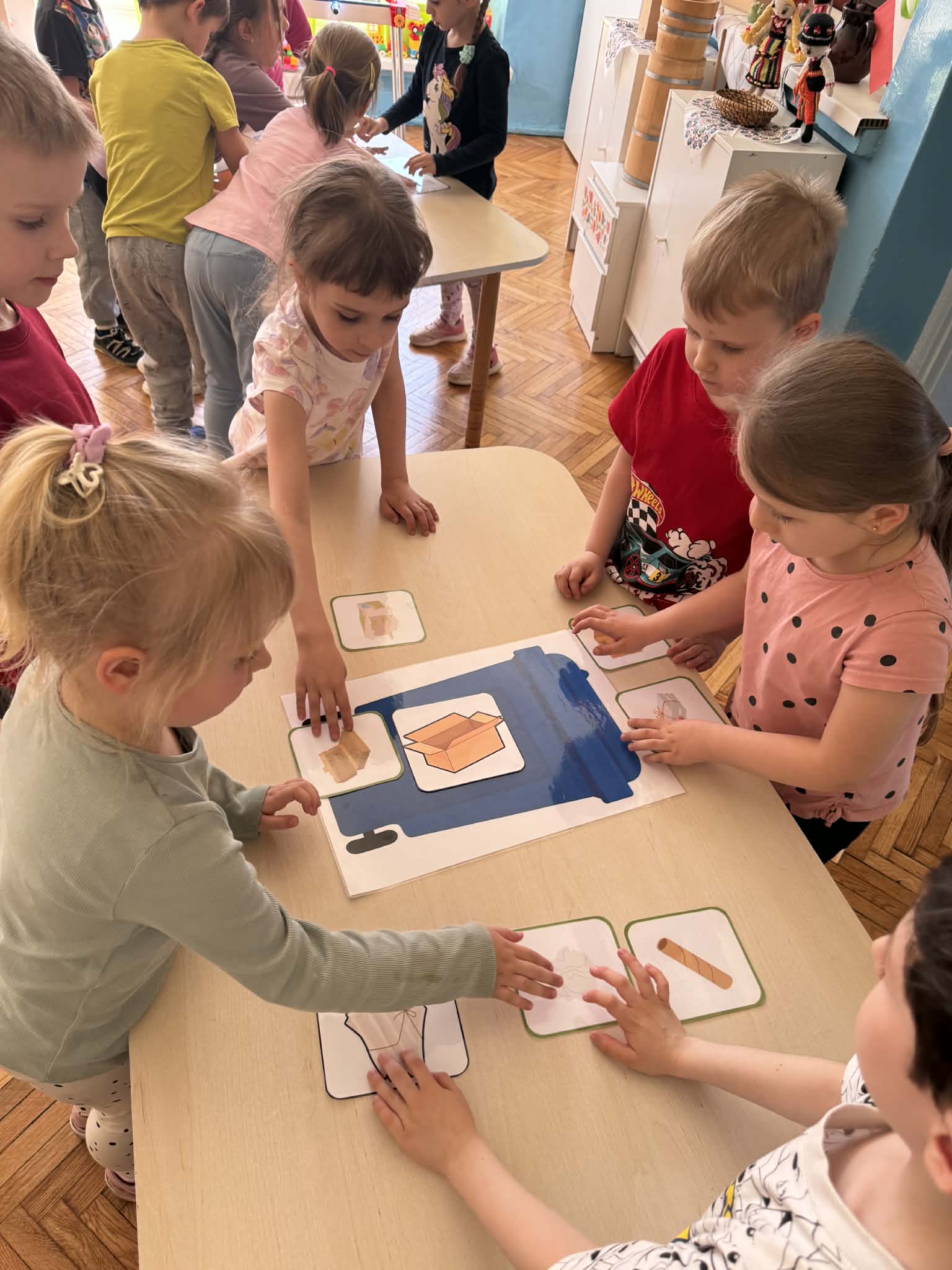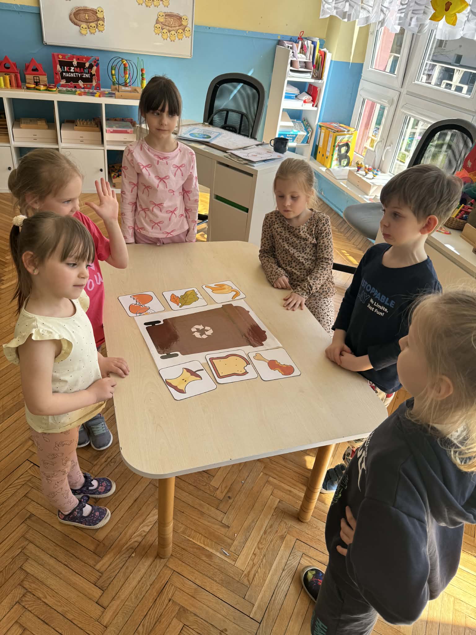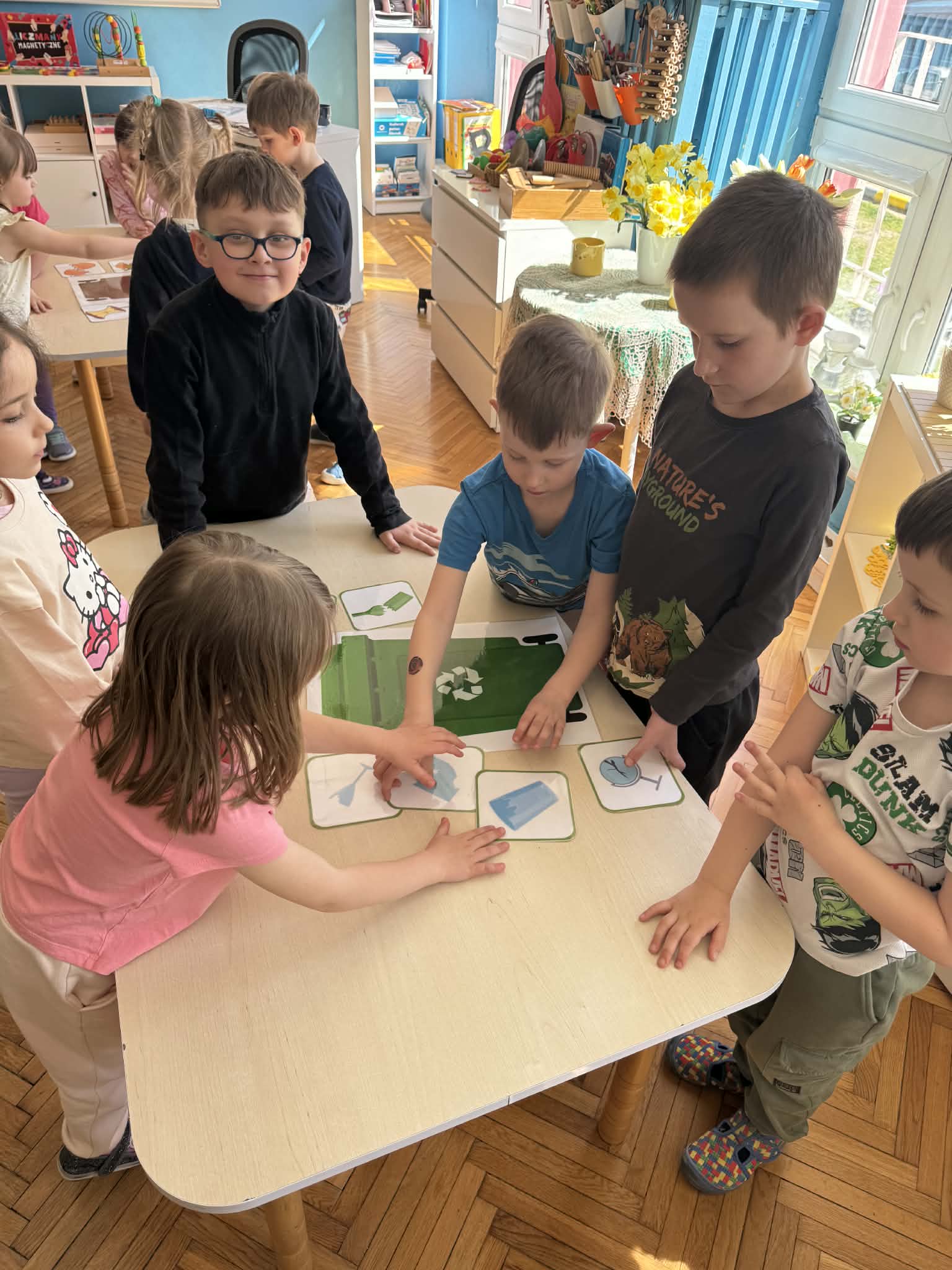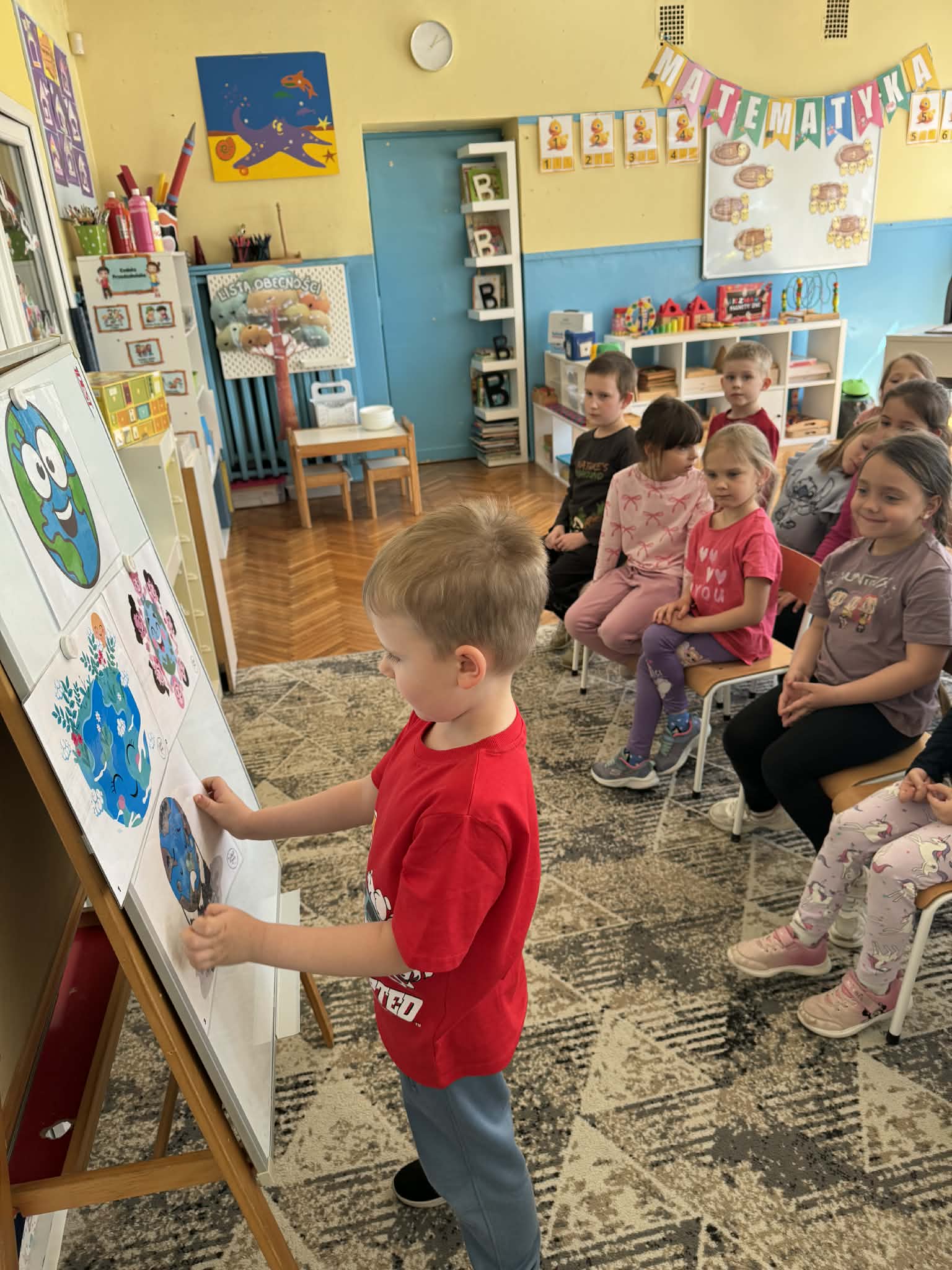 Dzieci rozpoczęły zajęcia od wysłuchania historyjki obrazkowej dotyczącej naszej planety. Następnie układały ilustracje w odpowiedniej kolejności, tworząc spójną opowieść o Ziemi i ucząc się, jak należy o nią dbać. Kolejnym etapem była zabawa edukacyjna związana z ekologią. Przedszkolaki segregowały obrazki odpadów, dopasowując je do właściwych koszy. Dzięki temu utrwalały wiedzę na temat recyklingu i zasad prawidłowej segregacji śmieci. Na zakończenie, korzystając z pięknej, słonecznej pogody, dzieci spędziły czas na świeżym powietrzu, bawiąc się w ogrodzie przedszkolnym. Radosna zabawa była doskonałym podsumowaniem dnia pełnego nauki i nowych doświadczeń.
