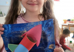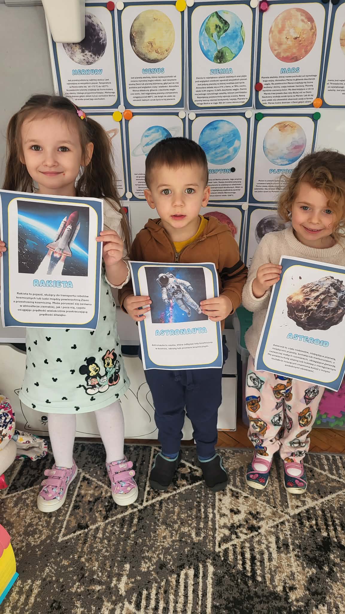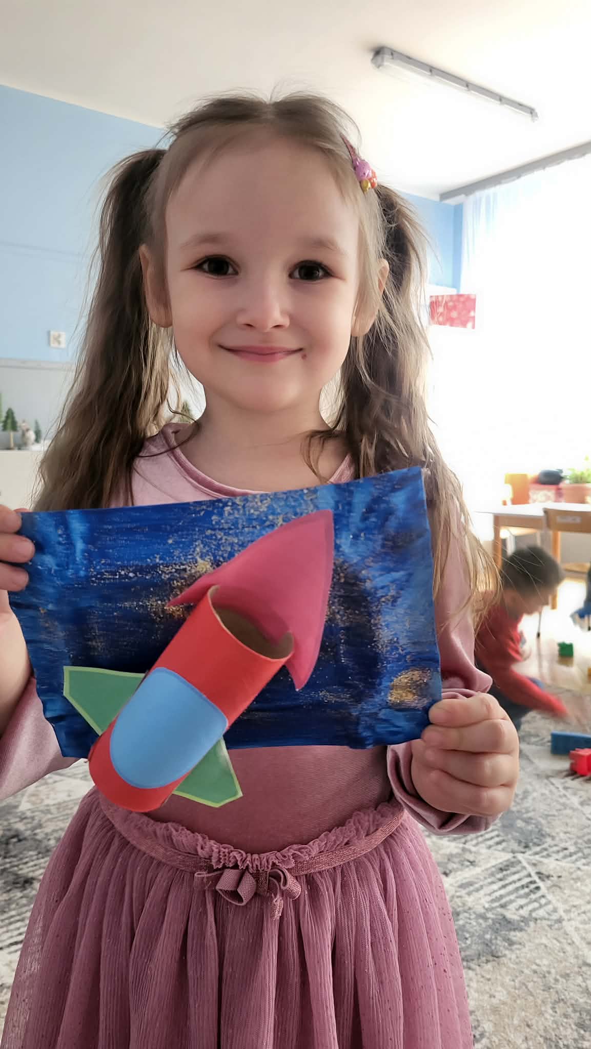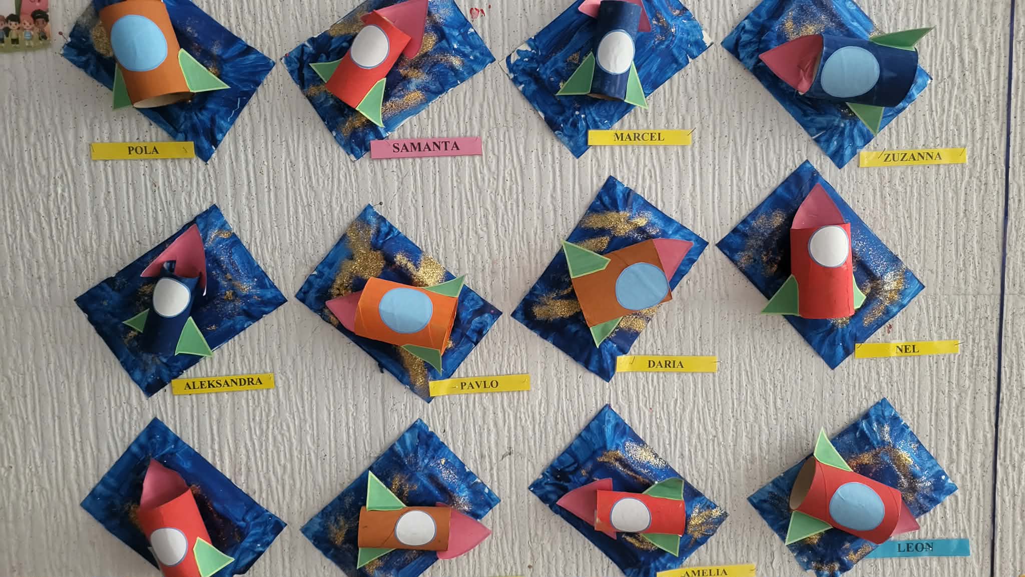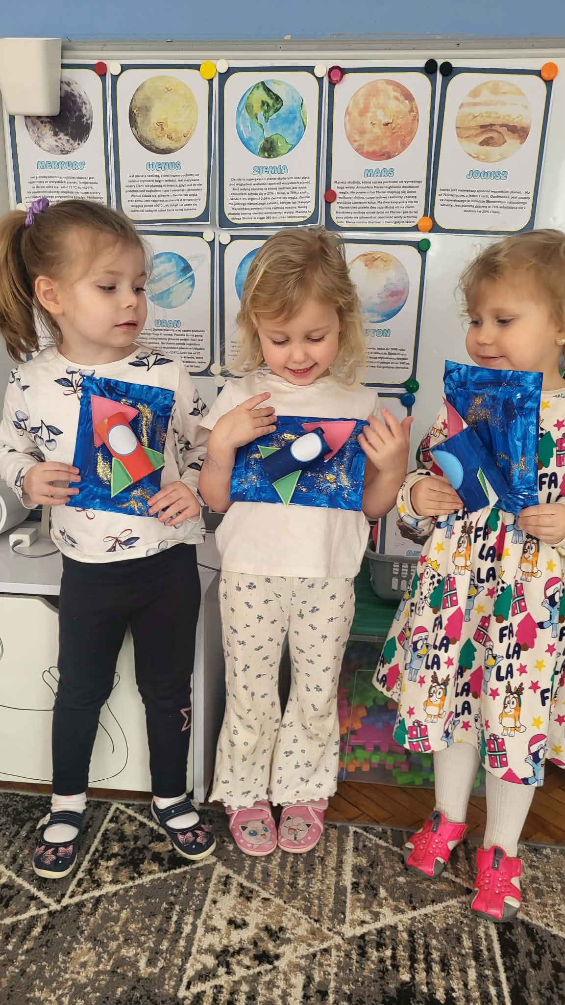 Nasze Maluszki wybrały się właśnie w taką podróż, by poznać pracę Kosmonauty, wygląd rakiety kosmicznej oraz planet. Zgodnie przyznały, że nasza Ziemia wygląda najlepiej. Wykonały swoje rakiety przy użyciu rolek i farb. Korzystając z pięknej pogody, w oczekiwaniu na wiosnę, wybrały się również na spacer do Parku, by obserwować zmiany zachodzące w najbliższym otoczeniu.