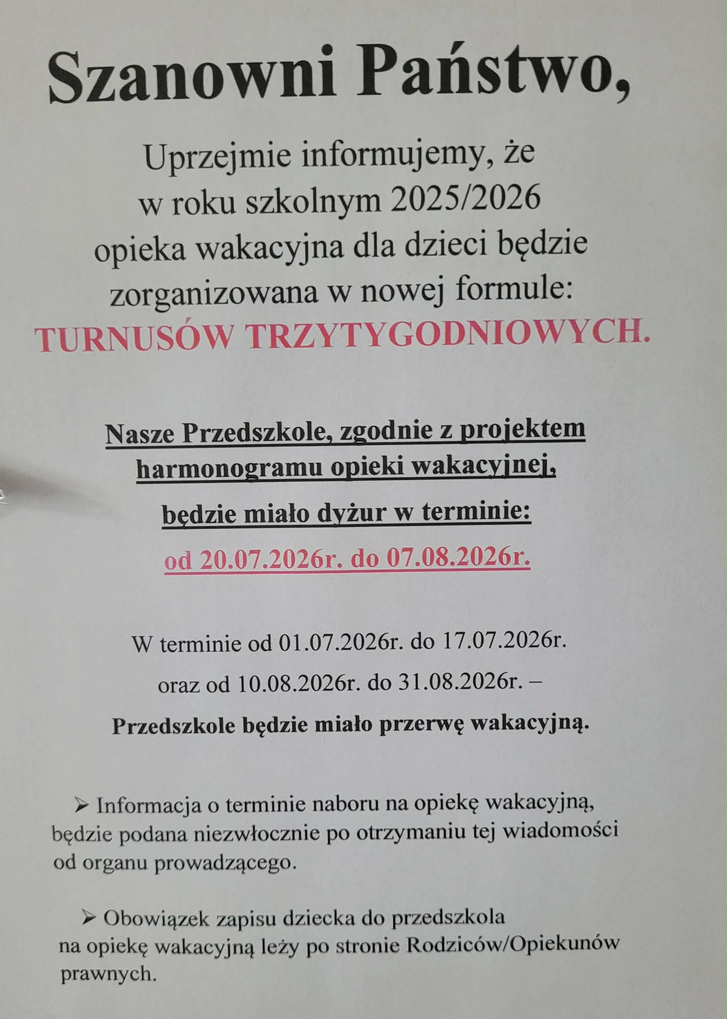 Szanowni Państwo, informujemy, że w roku szkolnym 2025/2026 opieka wakacyjna dla dzieci będzie zorganizowana w nowej formule TURNUSÓW TRZYTYGODNIOWYCH. Nasze przedszkole, zgodnie z projektem harmonogramu opieki wakacyjnej będzie miało dyżur w terminieod 20.07.2026r. do 07.08.2026r. W terminie od 01.07.2026r. do 17.07.2026r. oraz od 10.08.2026r. do 31.08.2026r. Przedszkole będzie miało przerwę wakacyjną.