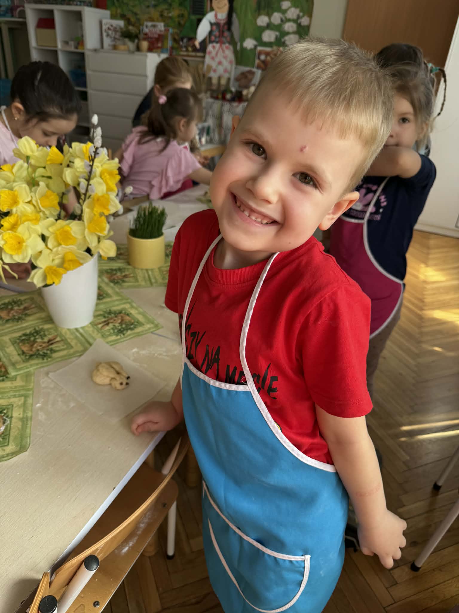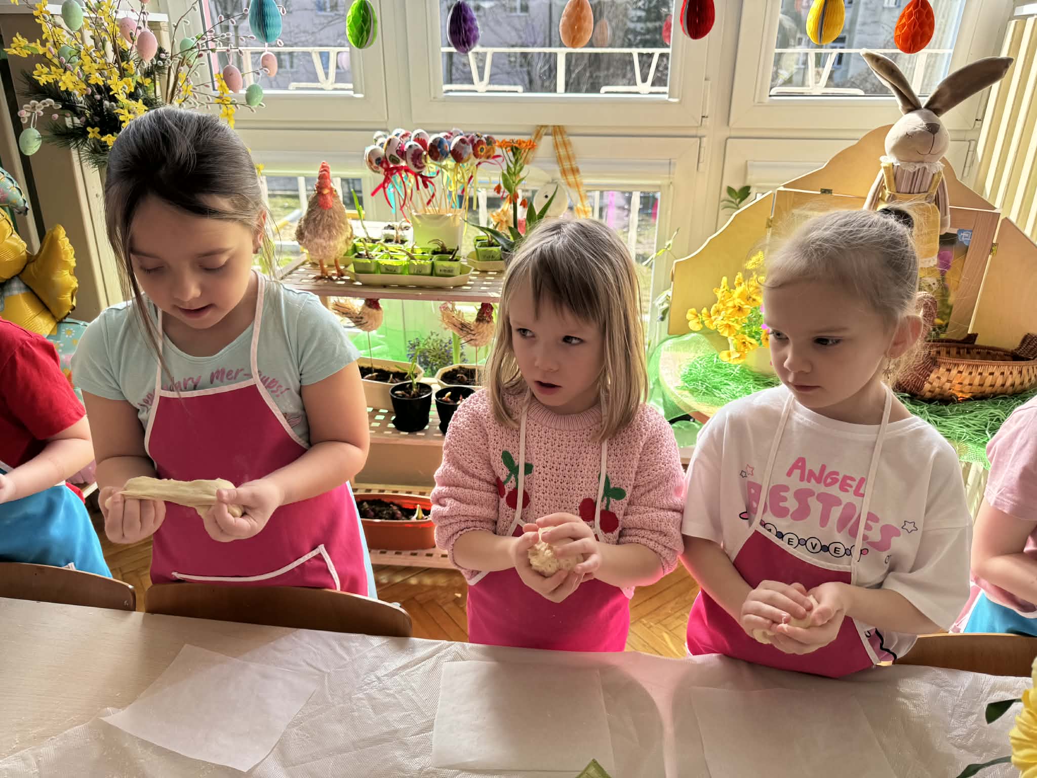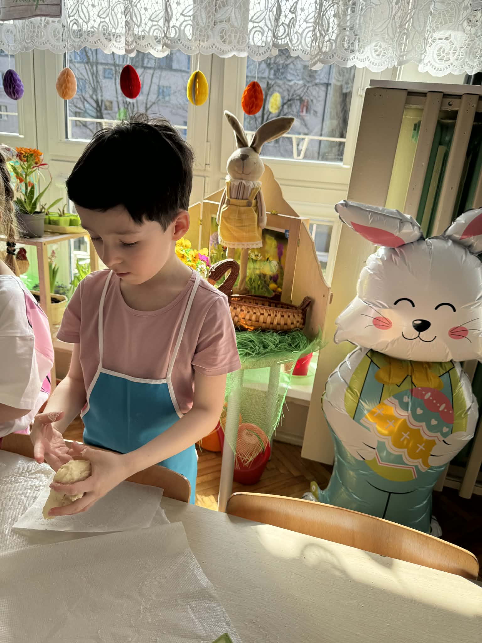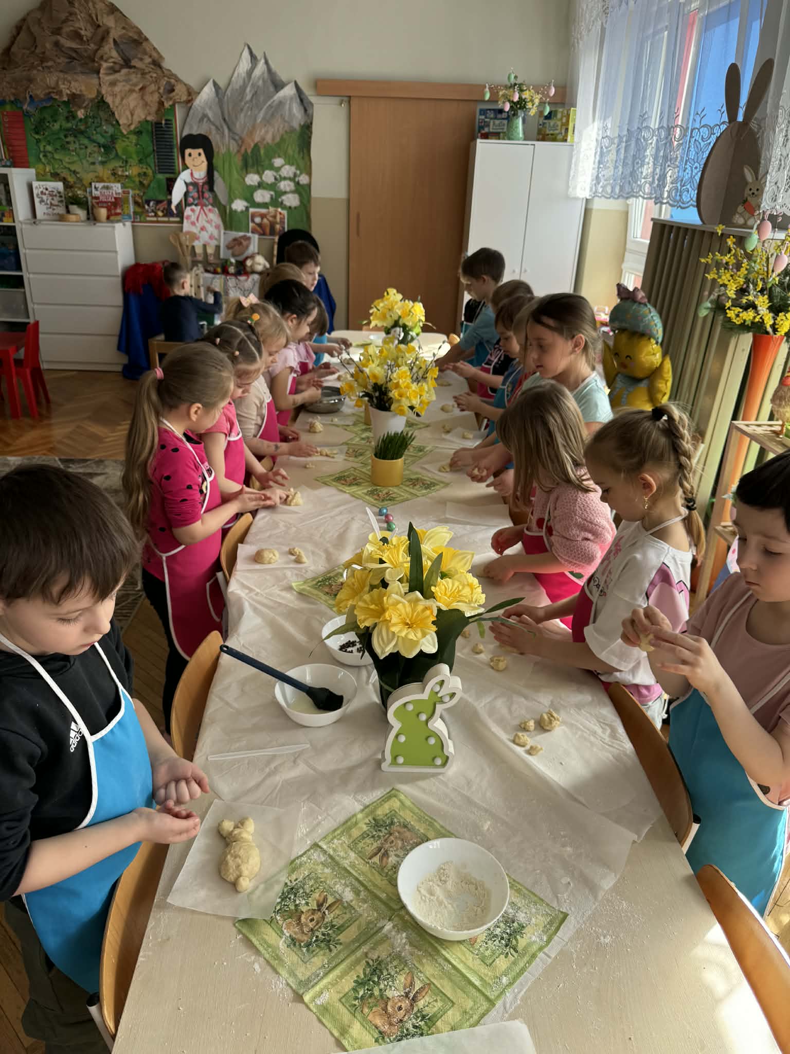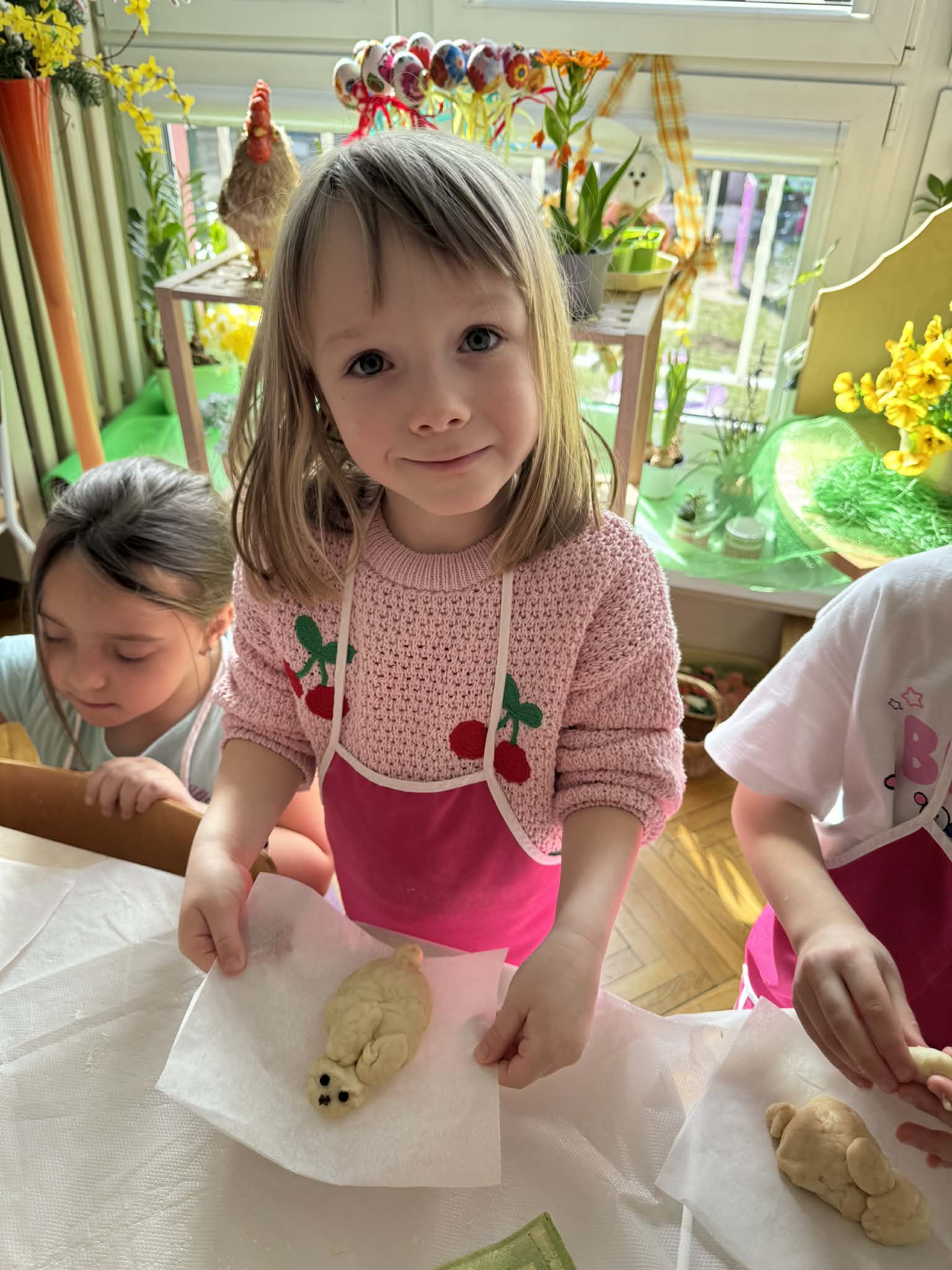 Dzieci z zaangażowaniem uczestniczyły w przygotowaniach do Świąt Wielkanocnych. Najpierw wykonały piękne prace plastyczne przedstawiające zajączki wielkanocne, rozwijając swoją kreatywność i zdolności manualne. Następnie przedszkolaki przystąpiły do pieczenia – z wielką radością formowały z ciasta własne zajączki, które później zostały przeznaczone na kiermasz wielkanocny. Nie zabrakło także aktywności na świeżym powietrzu – dzieci chętnie spędzały czas w ogródku przedszkolnym, bawiąc się i korzystając z wiosennej pogody.