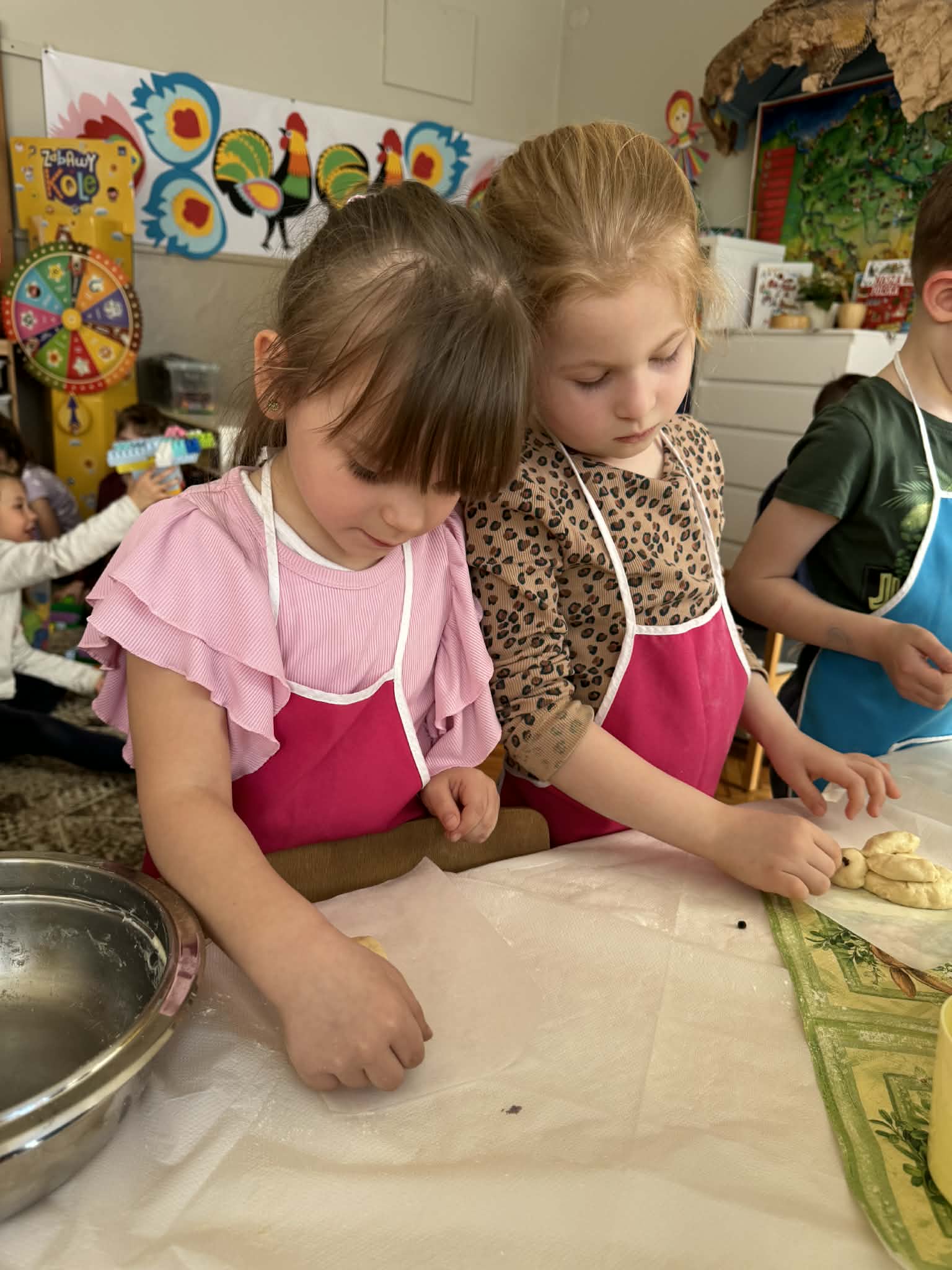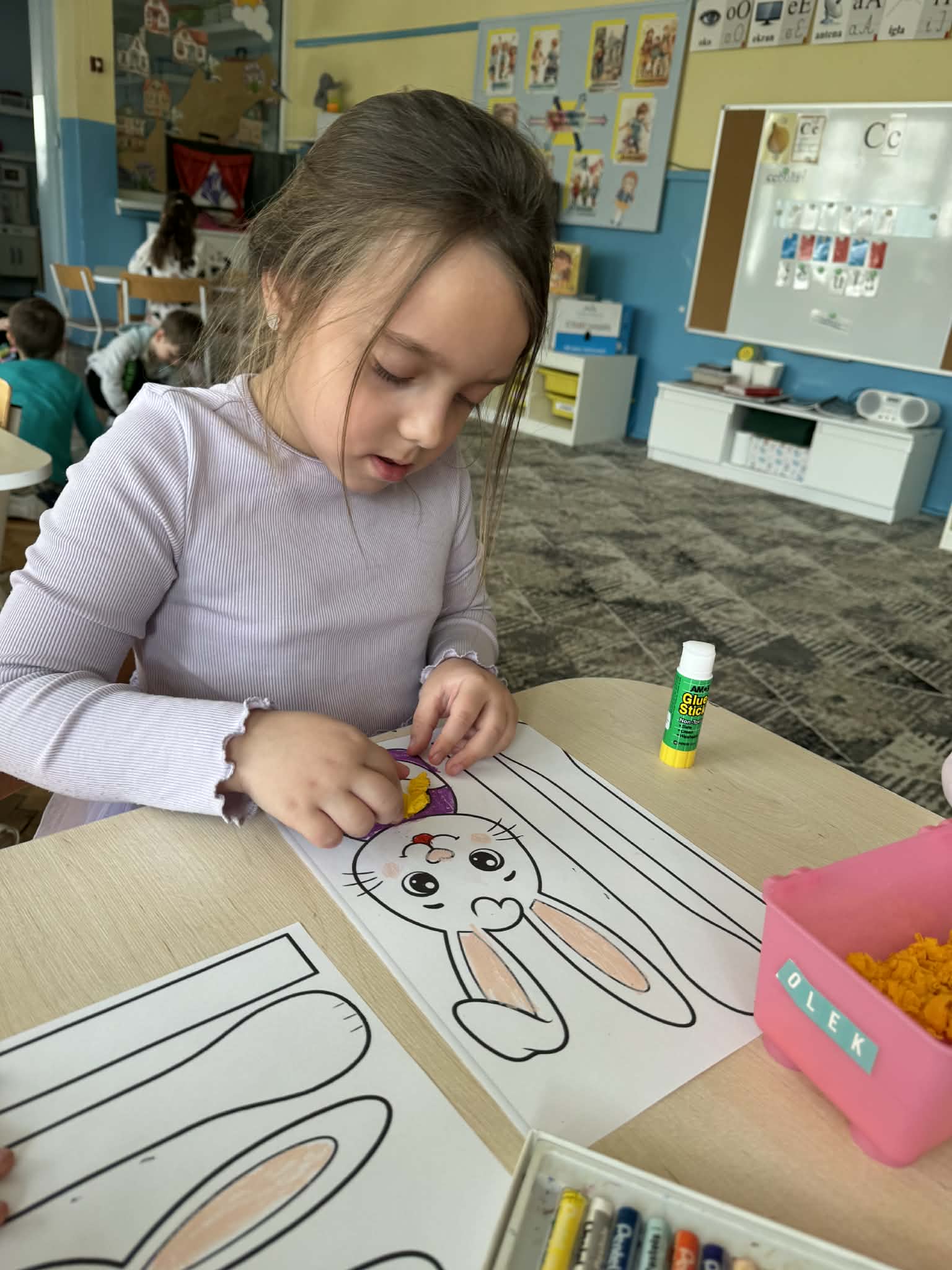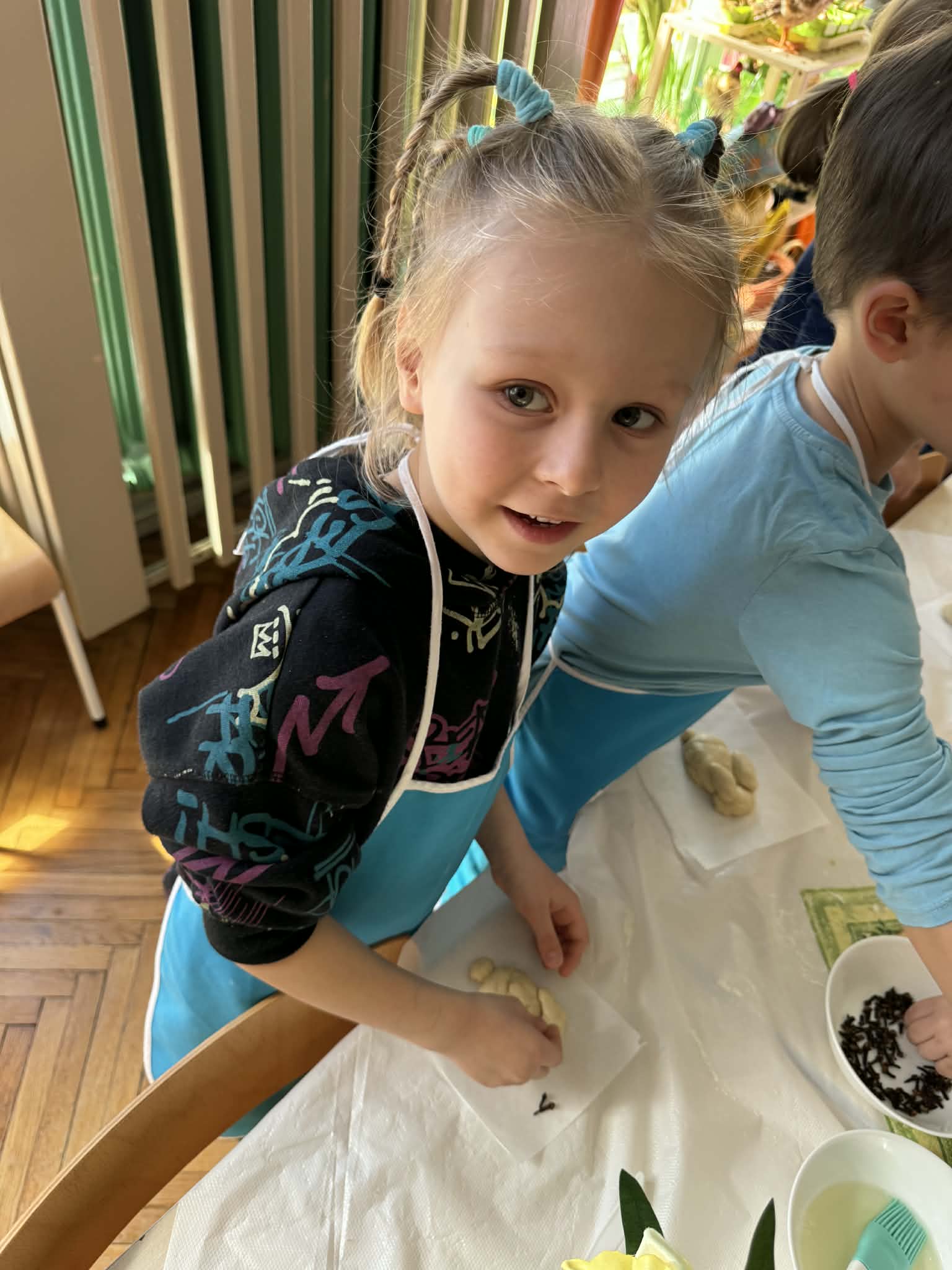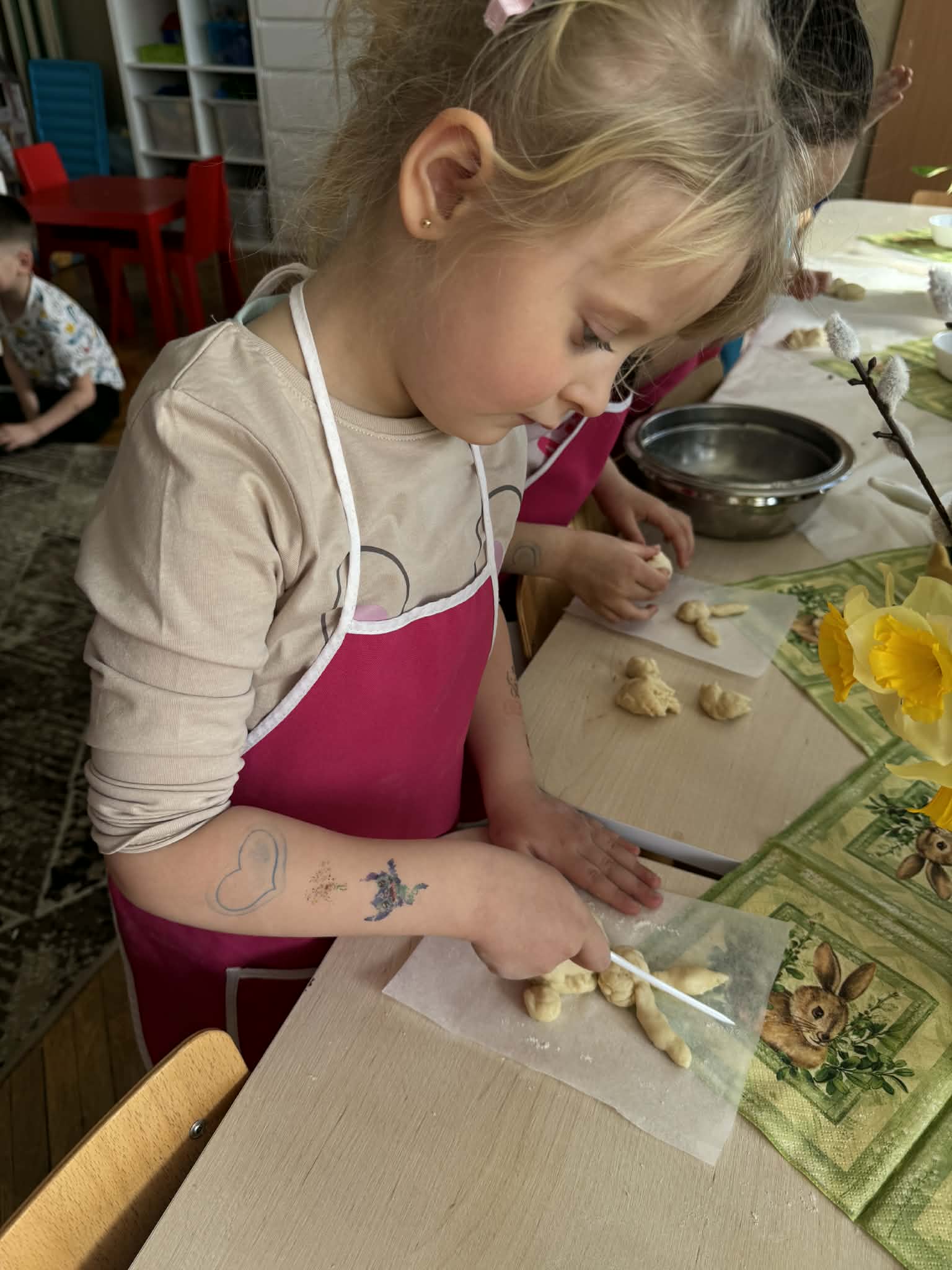Dzieci z zaangażowaniem uczestniczyły w przygotowaniach do Świąt Wielkanocnych. Najpierw wykonały piękne prace plastyczne przedstawiające zajączki wielkanocne, rozwijając swoją kreatywność i zdolności manualne. Następnie przedszkolaki przystąpiły do pieczenia – z wielką radością formowały z ciasta własne zajączki, które później zostały przeznaczone na kiermasz wielkanocny. Nie zabrakło także aktywności na świeżym powietrzu – dzieci chętnie spędzały czas w ogródku przedszkolnym, bawiąc się i korzystając z wiosennej pogody.