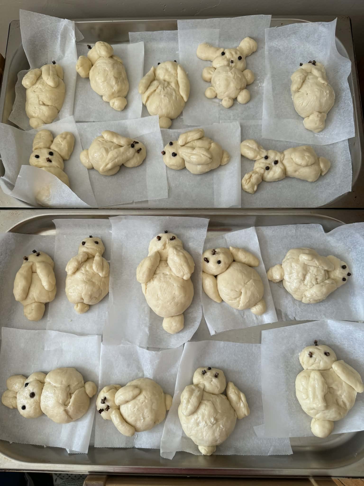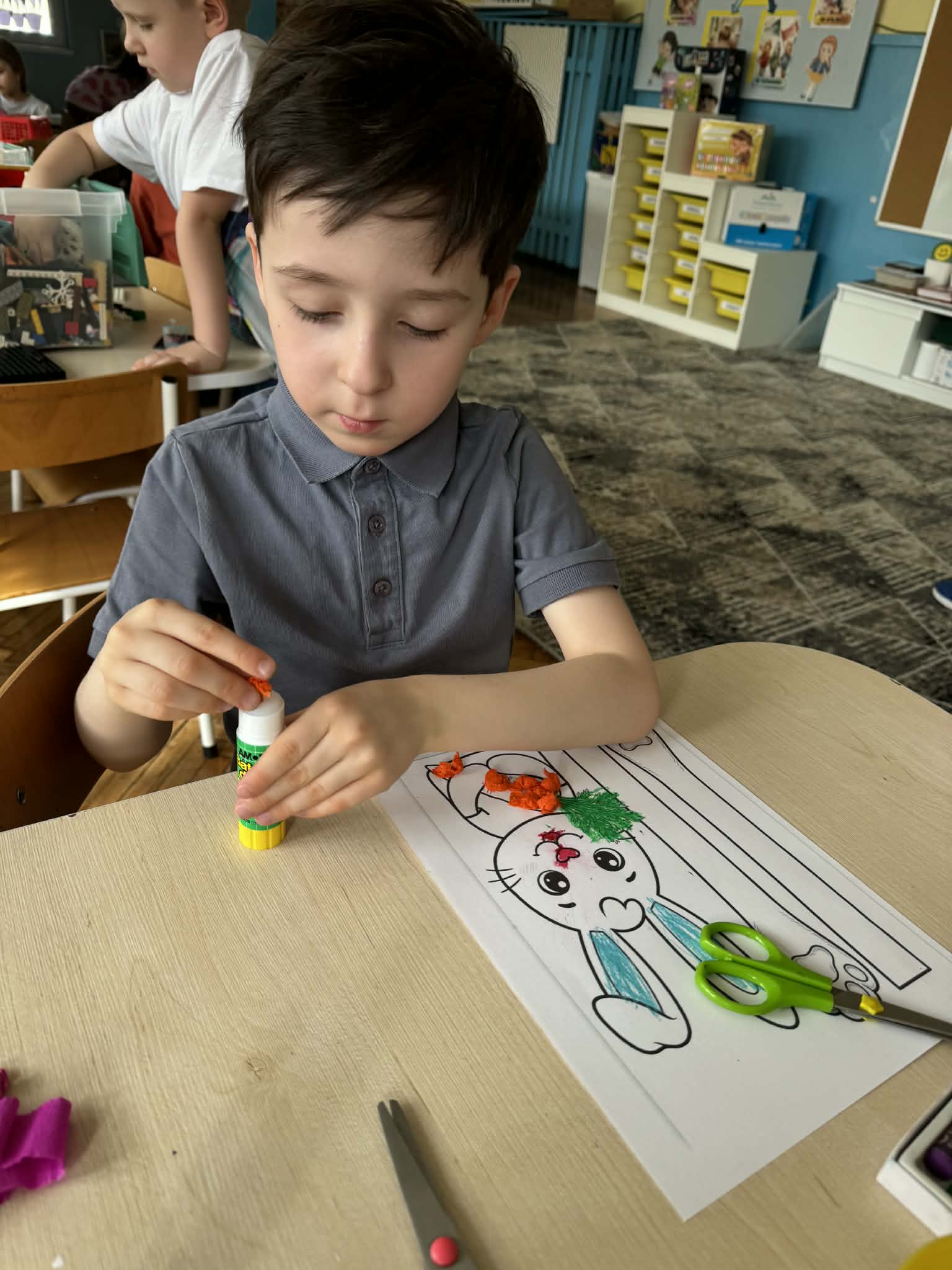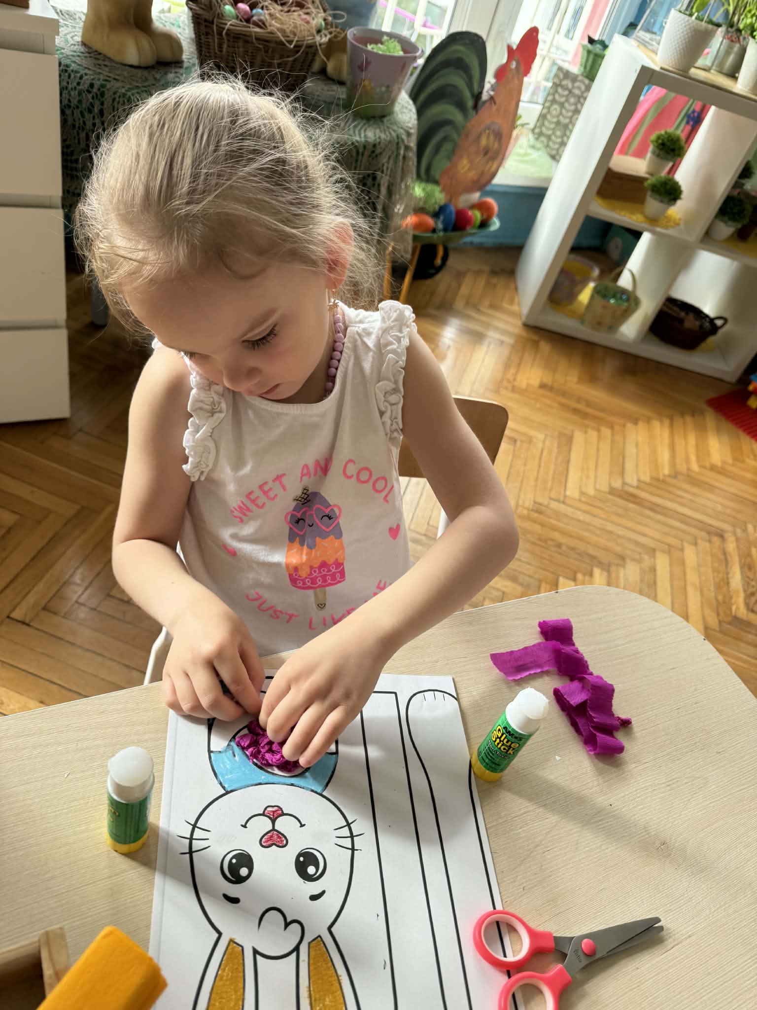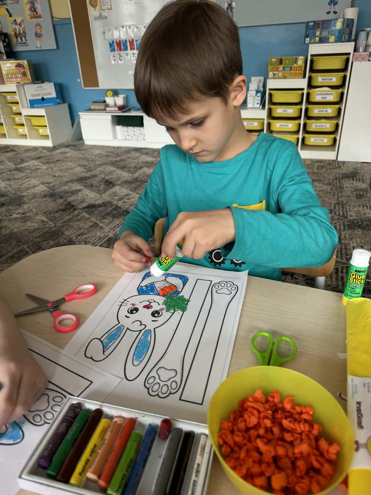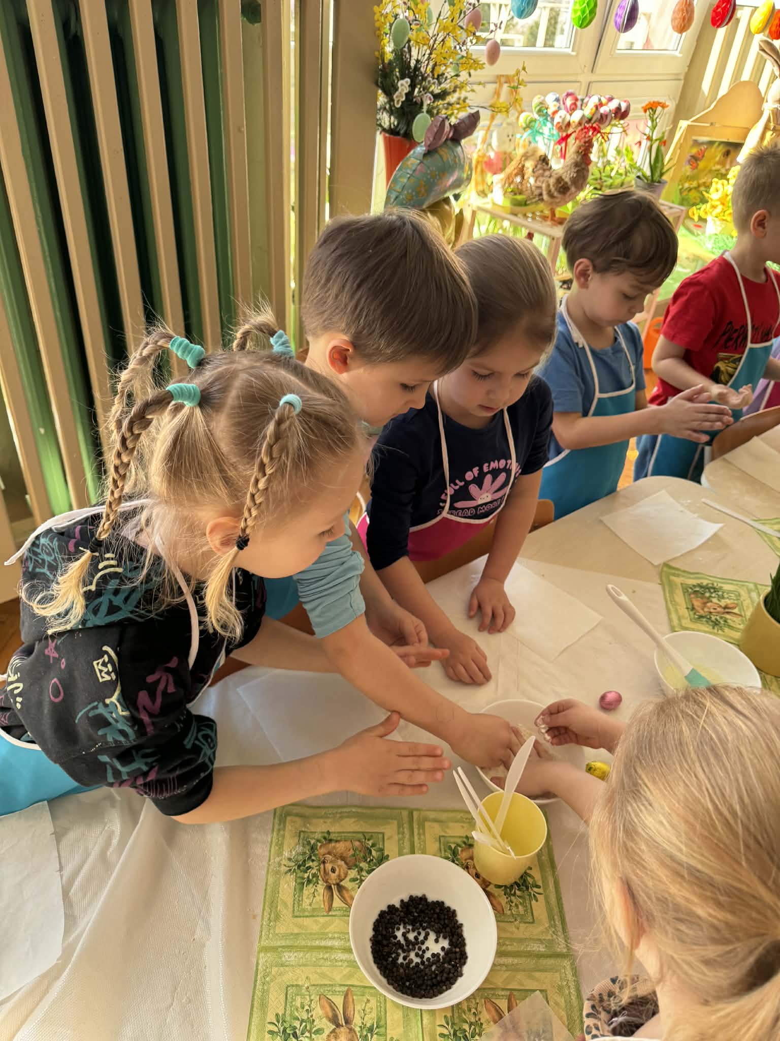 Dzieci z zaangażowaniem uczestniczyły w przygotowaniach do Świąt Wielkanocnych. Najpierw wykonały piękne prace plastyczne przedstawiające zajączki wielkanocne, rozwijając swoją kreatywność i zdolności manualne. Następnie przedszkolaki przystąpiły do pieczenia – z wielką radością formowały z ciasta własne zajączki, które później zostały przeznaczone na kiermasz wielkanocny. Nie zabrakło także aktywności na świeżym powietrzu – dzieci chętnie spędzały czas w ogródku przedszkolnym, bawiąc się i korzystając z wiosennej pogody.