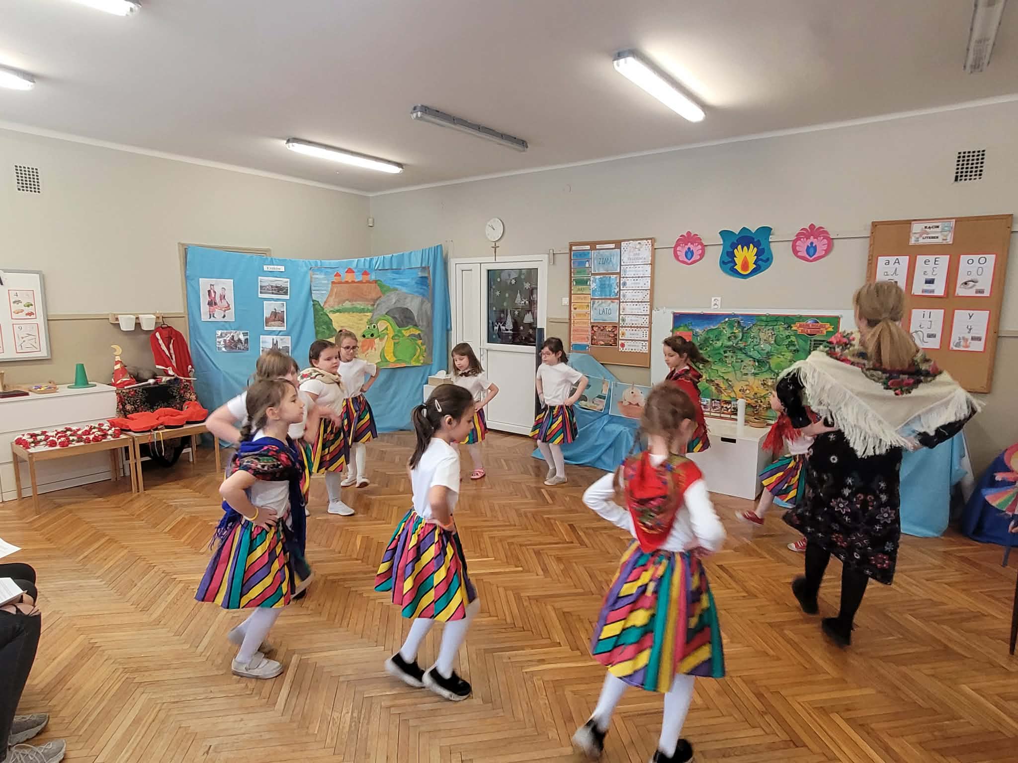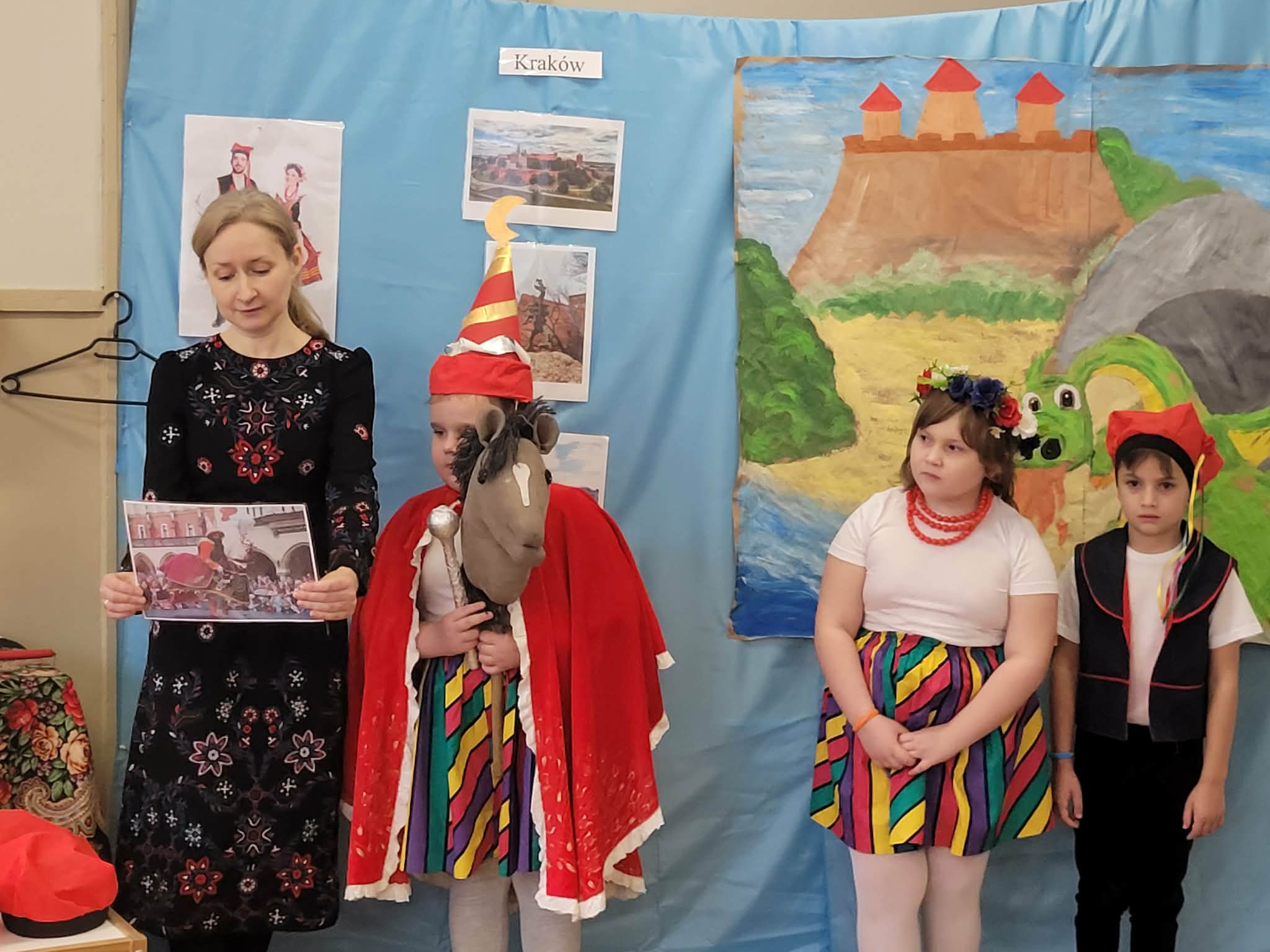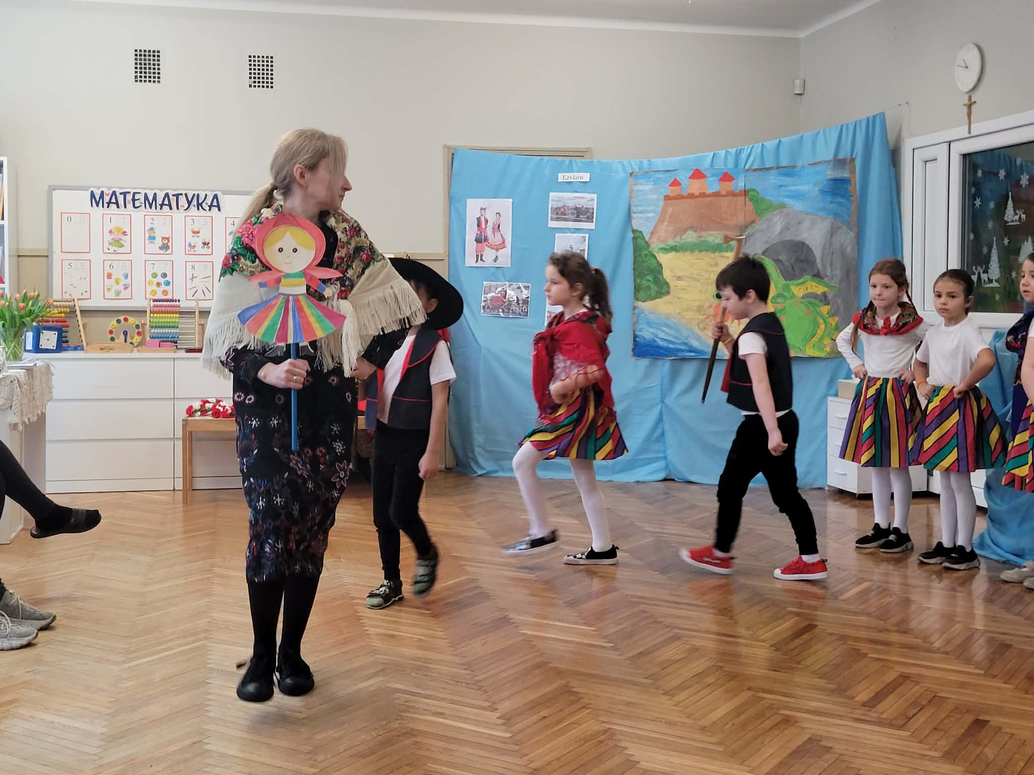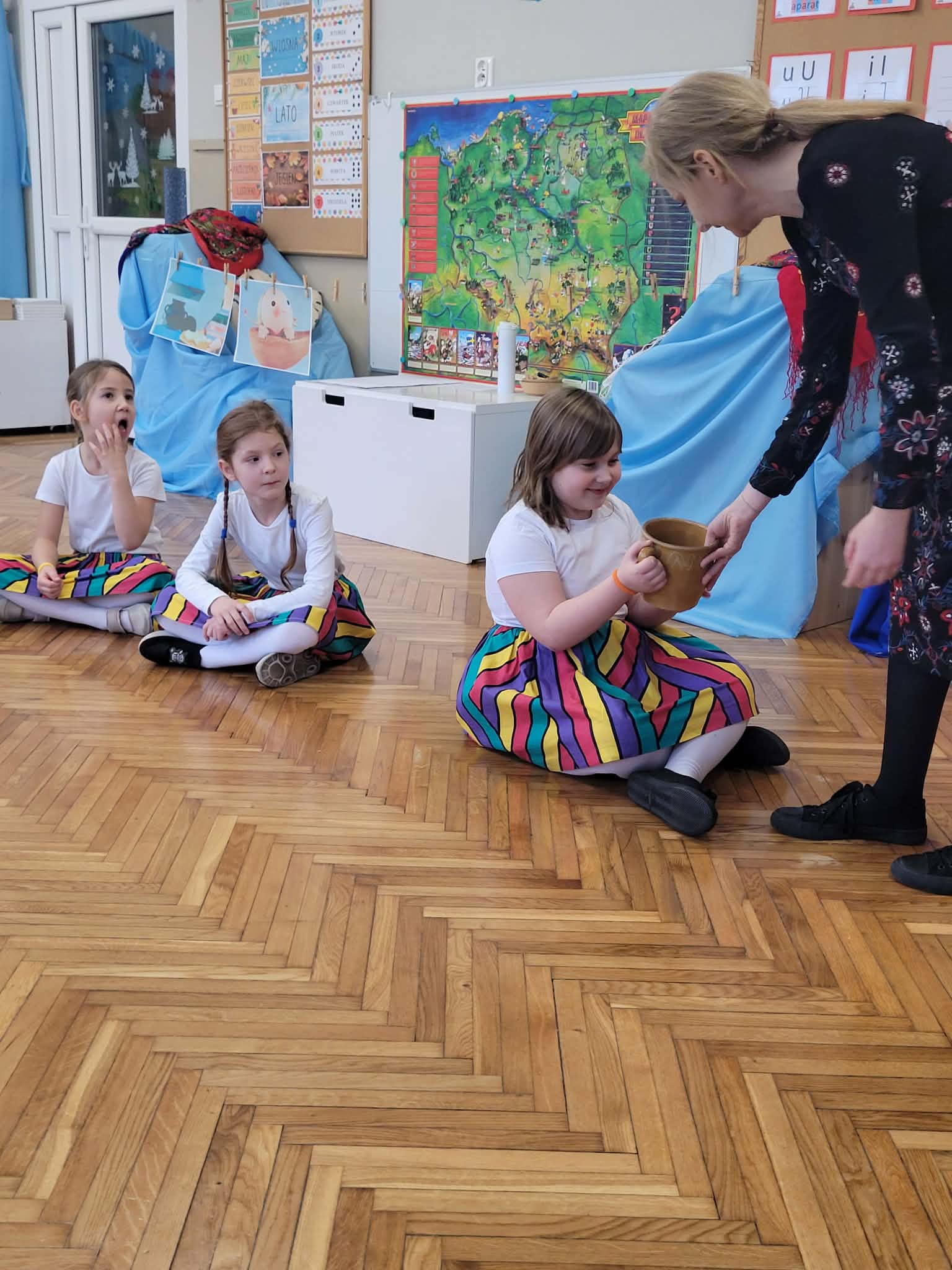 Dzieci z grupy 4 wybrały się na wycieczkę z Pyzą. Zwiedziły region łowicki, gdzie oglądały stara wiejską chatę, przybory drewniane i gliniane dzbany oraz prawdziwy strój łowiczanki. W Krakowie zatańczyły z Lajkonikiem krakowiaka a wgórach zbójnickiego. Dzieci wiedzą jak wyglądają stroje ludowe z tych regionów oraz mogły spróbowac wyrobów takich jak oscypek. Na zakończenie ułożyły i opwiedziały hisoryjkę obrazkową o przygodach Pyzy. W zajęciu modelowym prowadzonym przez panią Dominikę wzięły udział dwie rady pedagogiczne PM 50 oraz Mały Domek. Dziękujemy pani oraz dzieciom za zaproszenie. Było pięknie.