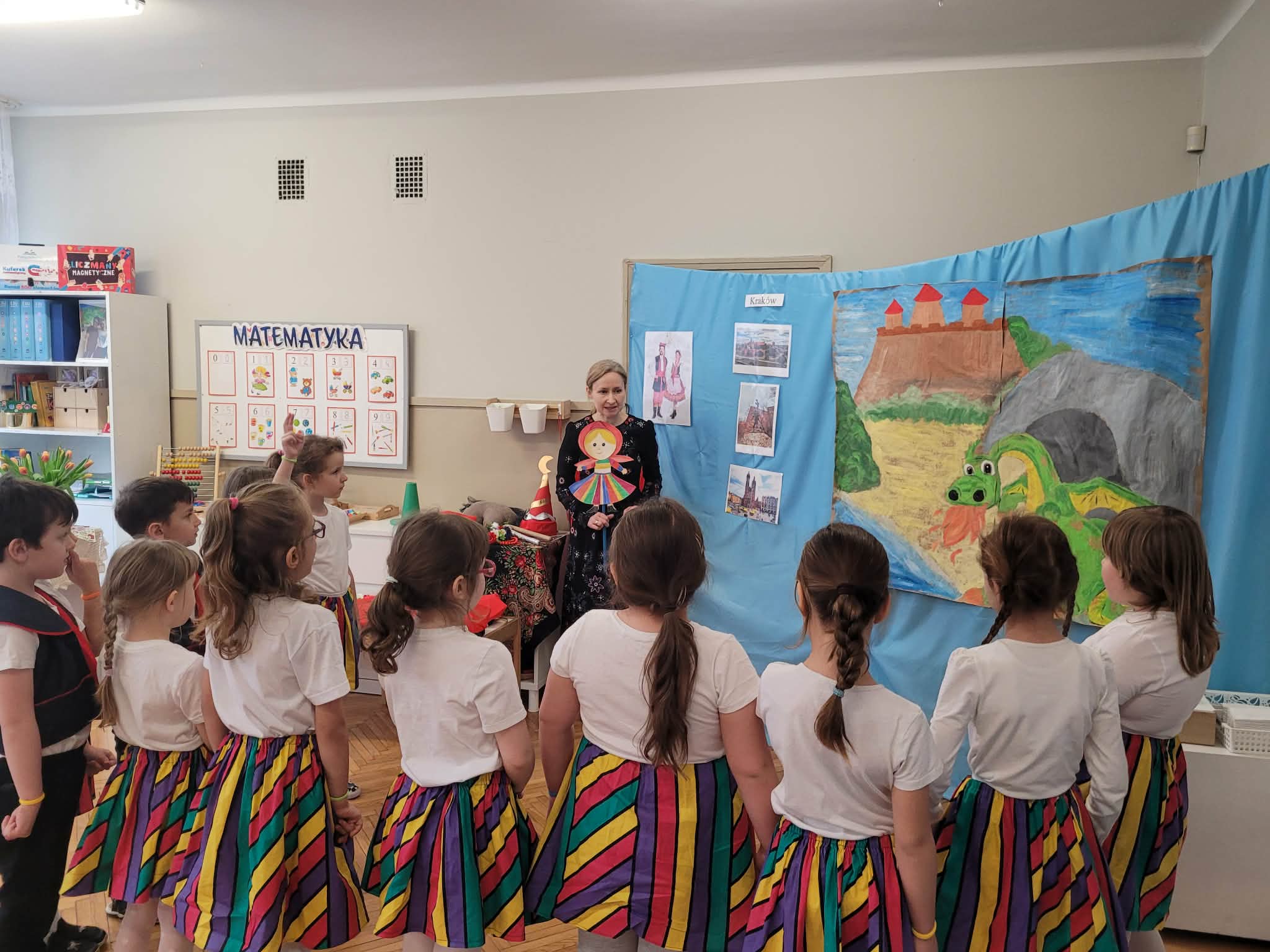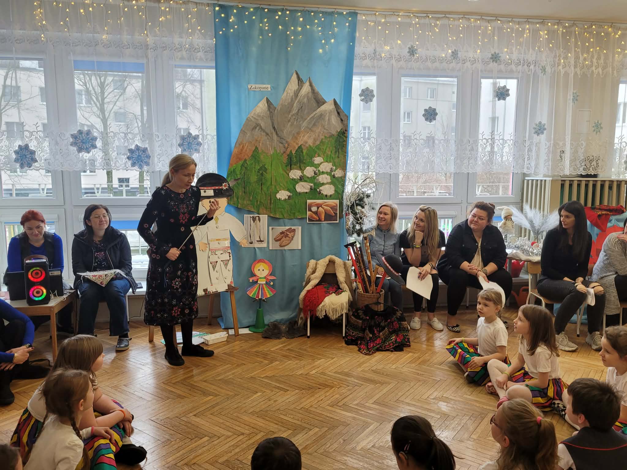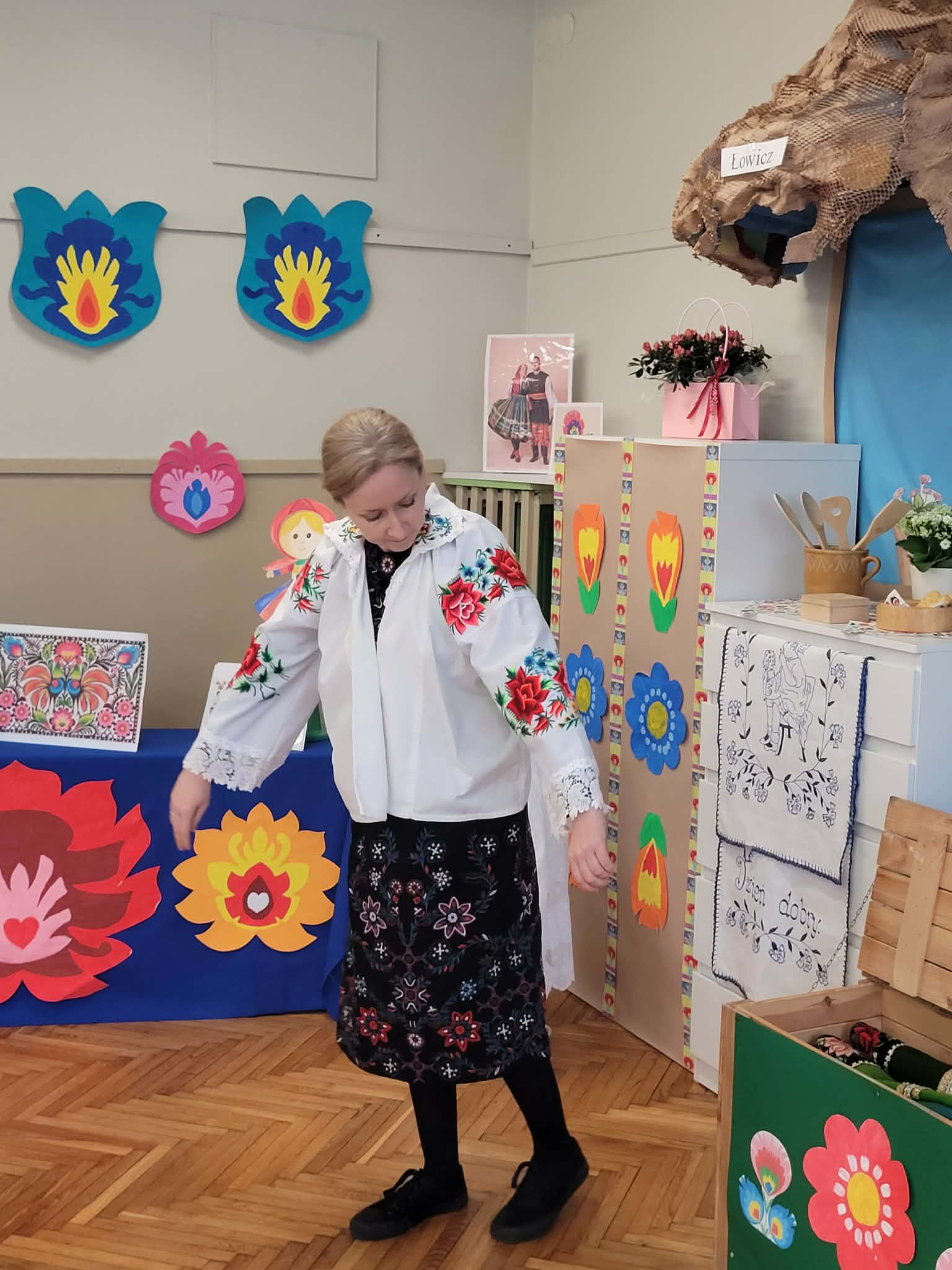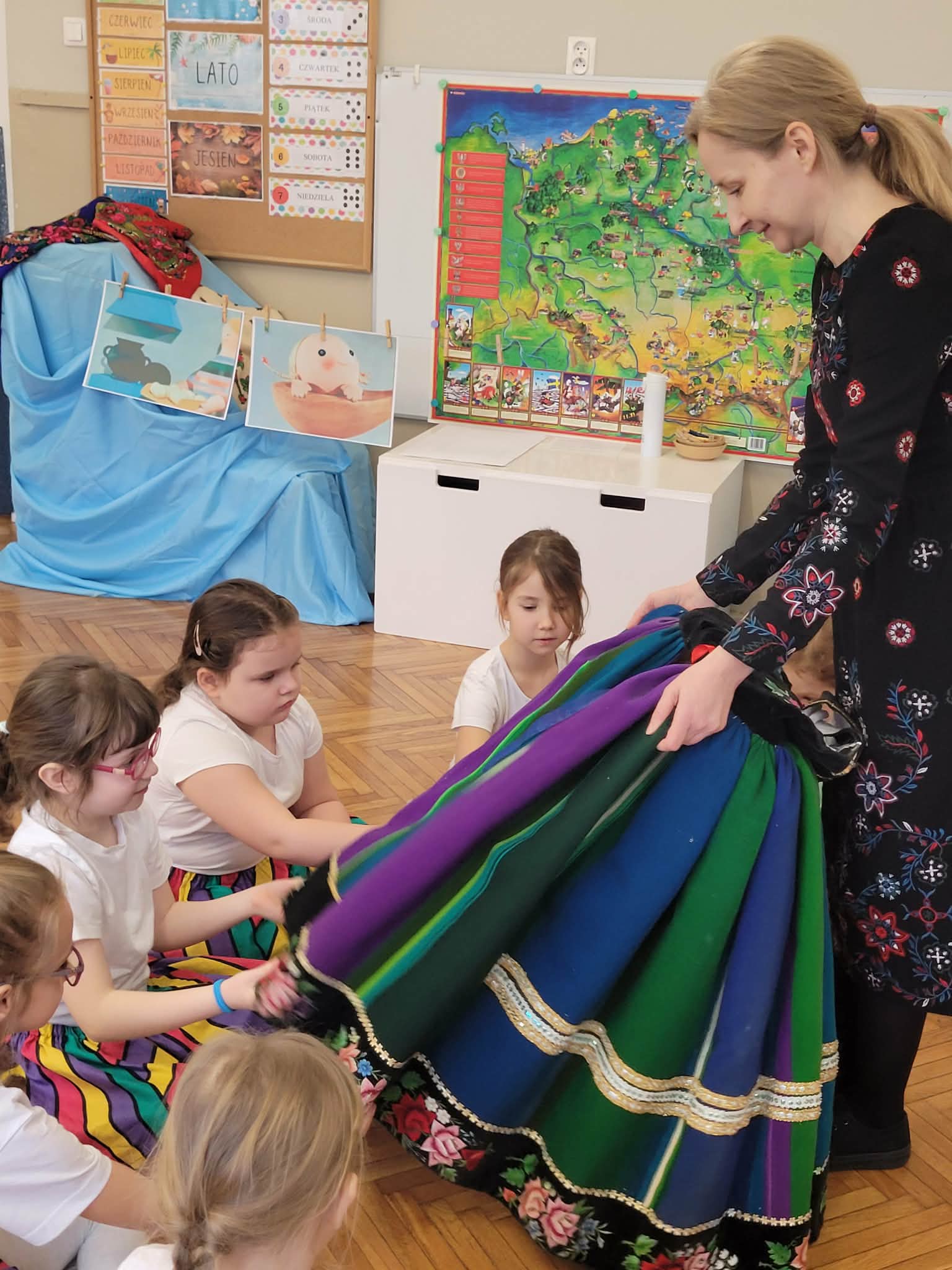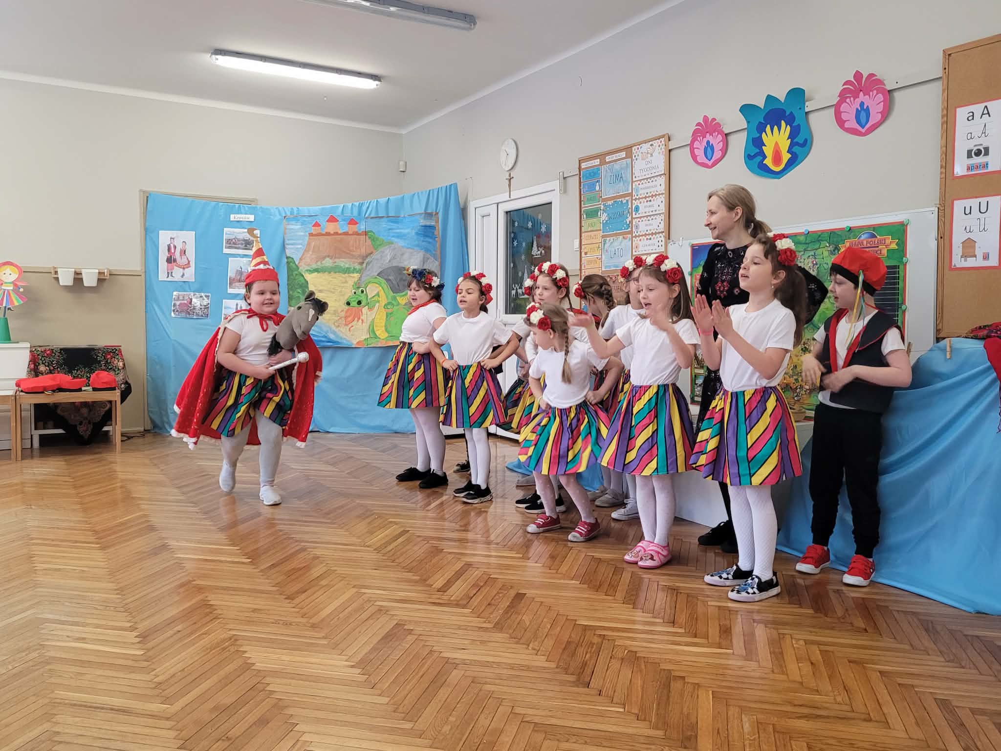 Dzieci z grupy 4 wybrały się na wycieczkę z Pyzą. Zwiedziły region łowicki, gdzie oglądały stara wiejską chatę, przybory drewniane i gliniane dzbany oraz prawdziwy strój łowiczanki. W Krakowie zatańczyły z Lajkonikiem krakowiaka a wgórach zbójnickiego. Dzieci wiedzą jak wyglądają stroje ludowe z tych regionów oraz mogły spróbowac wyrobów takich jak oscypek. Na zakończenie ułożyły i opwiedziały hisoryjkę obrazkową o przygodach Pyzy. W zajęciu modelowym prowadzonym przez panią Dominikę wzięły udział dwie rady pedagogiczne PM 50 oraz Mały Domek. Dziękujemy pani oraz dzieciom za zaproszenie. Było pięknie.
