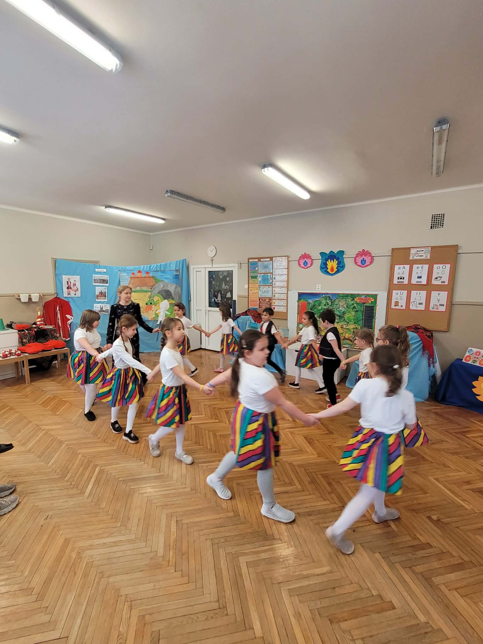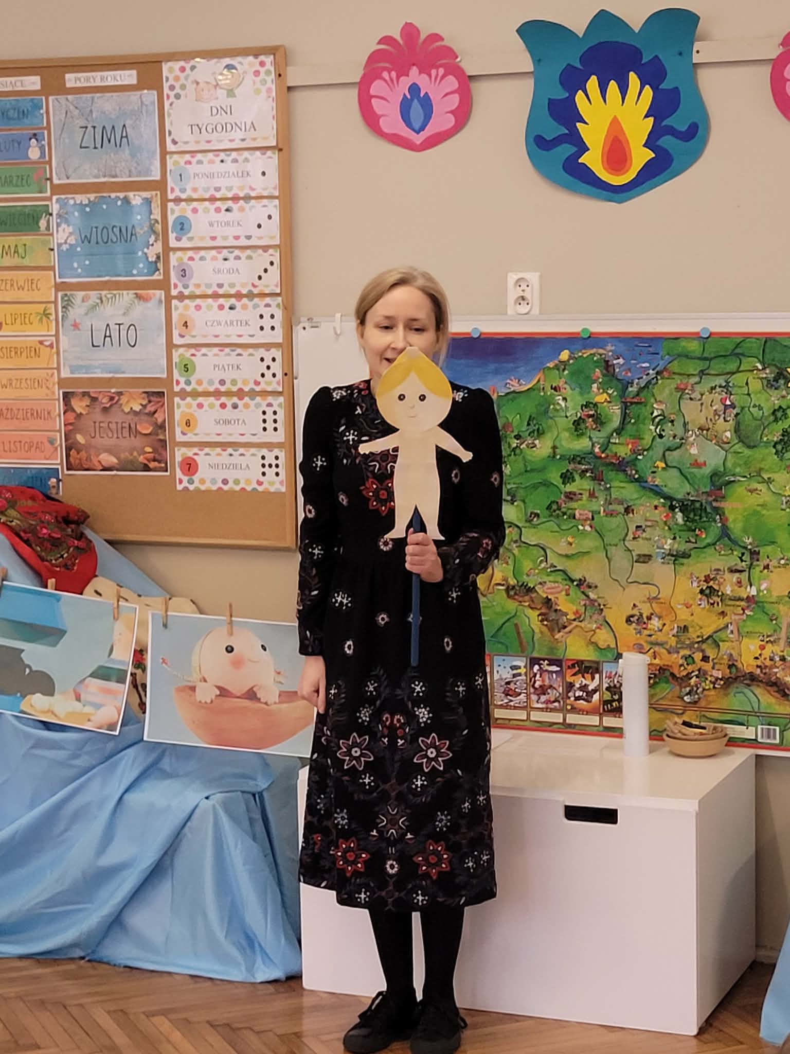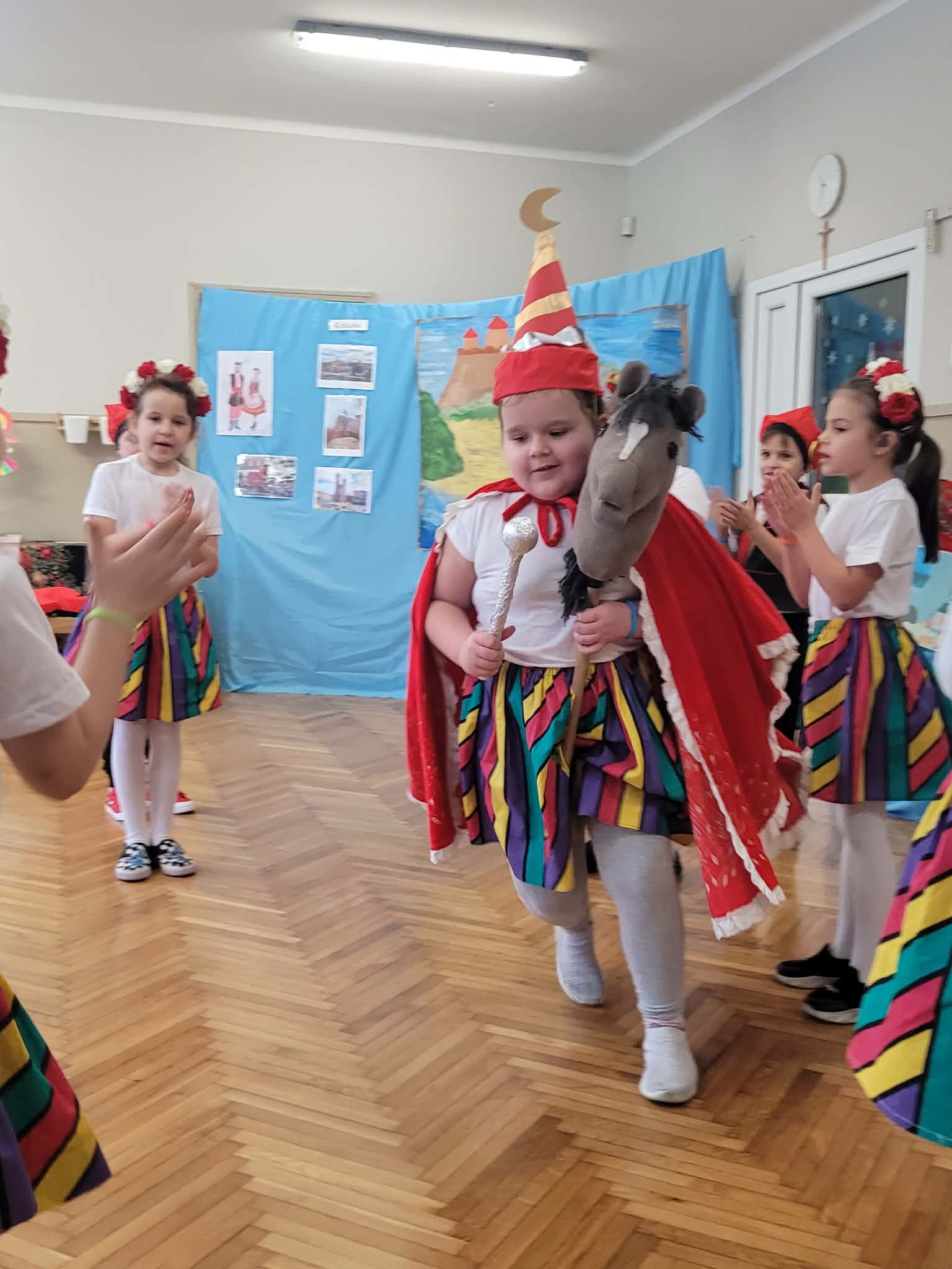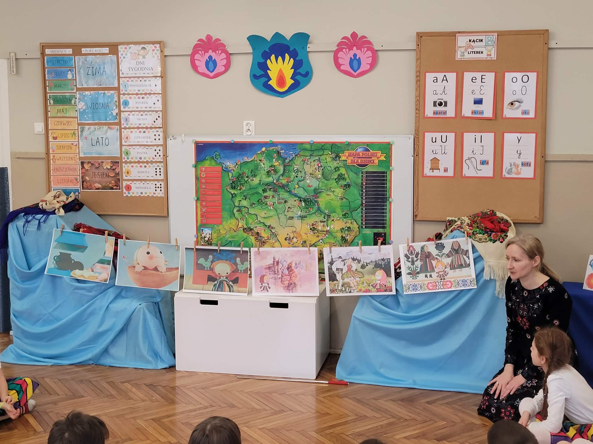 Dzieci z grupy 4 wybrały się na wycieczkę z Pyzą. Zwiedziły region łowicki, gdzie oglądały stara wiejską chatę, przybory drewniane i gliniane dzbany oraz prawdziwy strój łowiczanki. W Krakowie zatańczyły z Lajkonikiem krakowiaka a wgórach zbójnickiego. Dzieci wiedzą jak wyglądają stroje ludowe z tych regionów oraz mogły spróbowac wyrobów takich jak oscypek. Na zakończenie ułożyły i opwiedziały hisoryjkę obrazkową o przygodach Pyzy. W zajęciu modelowym prowadzonym przez panią Dominikę wzięły udział dwie rady pedagogiczne PM 50 oraz Mały Domek. Dziękujemy pani oraz dzieciom za zaproszenie. Było pięknie.