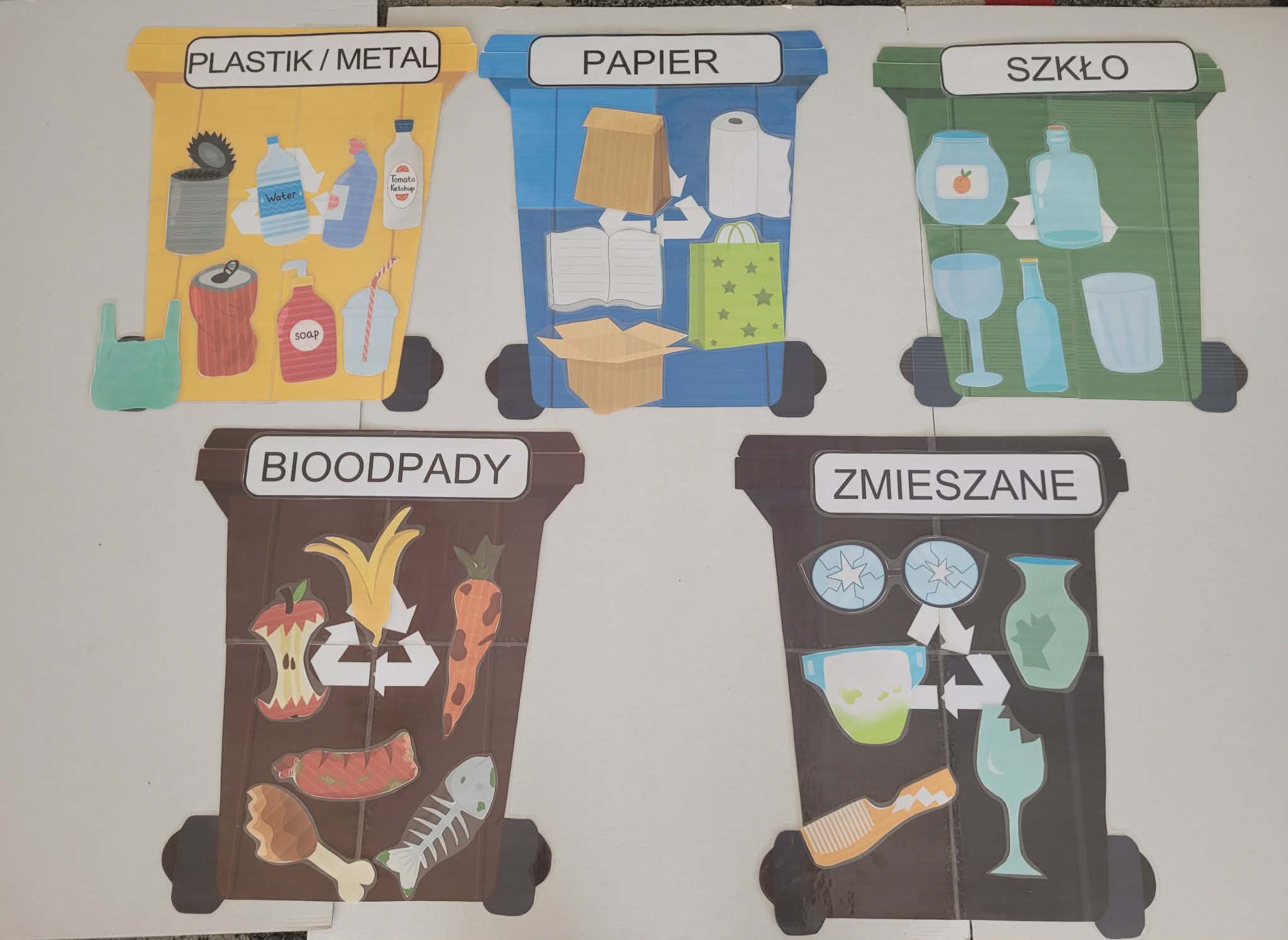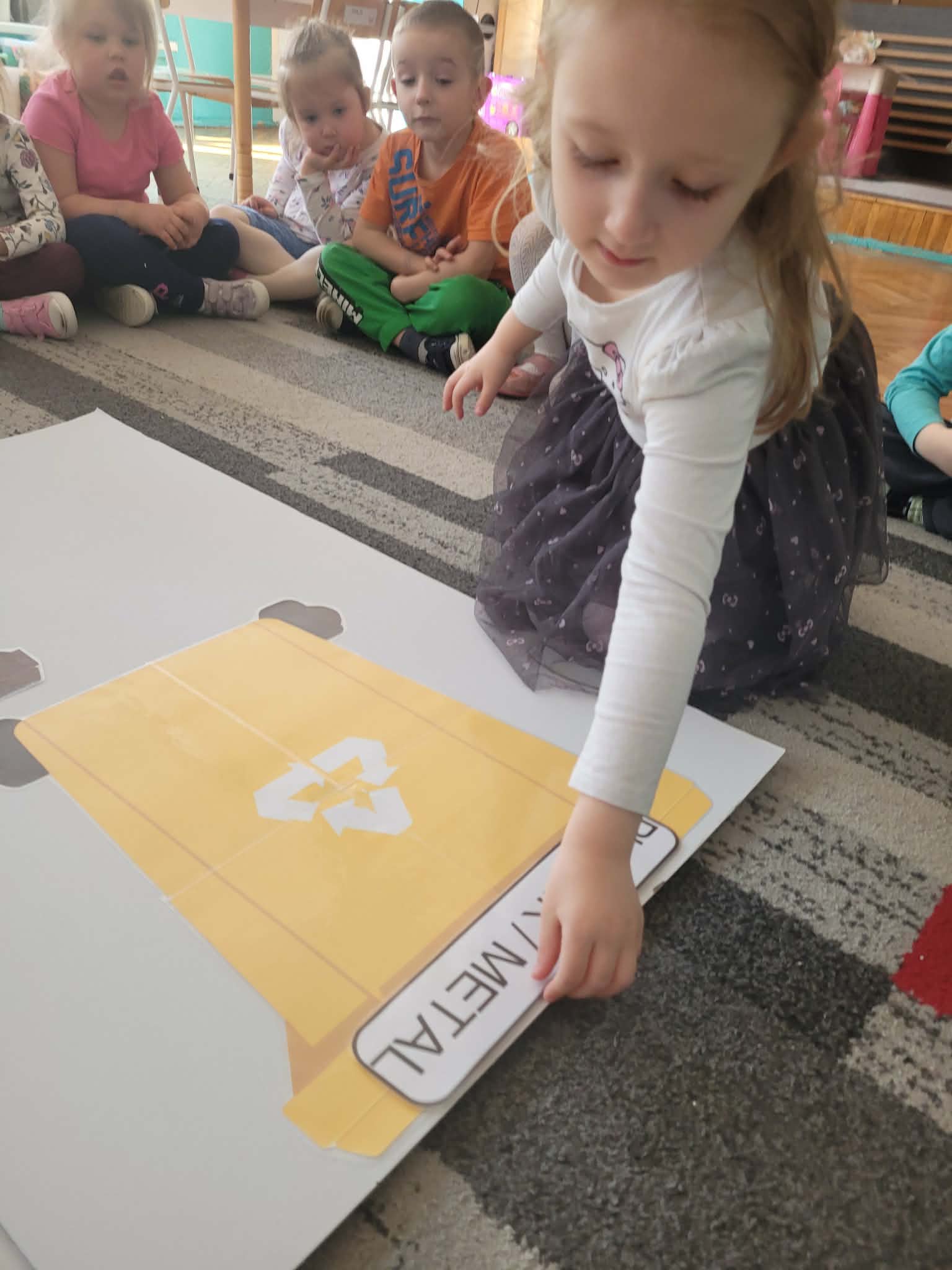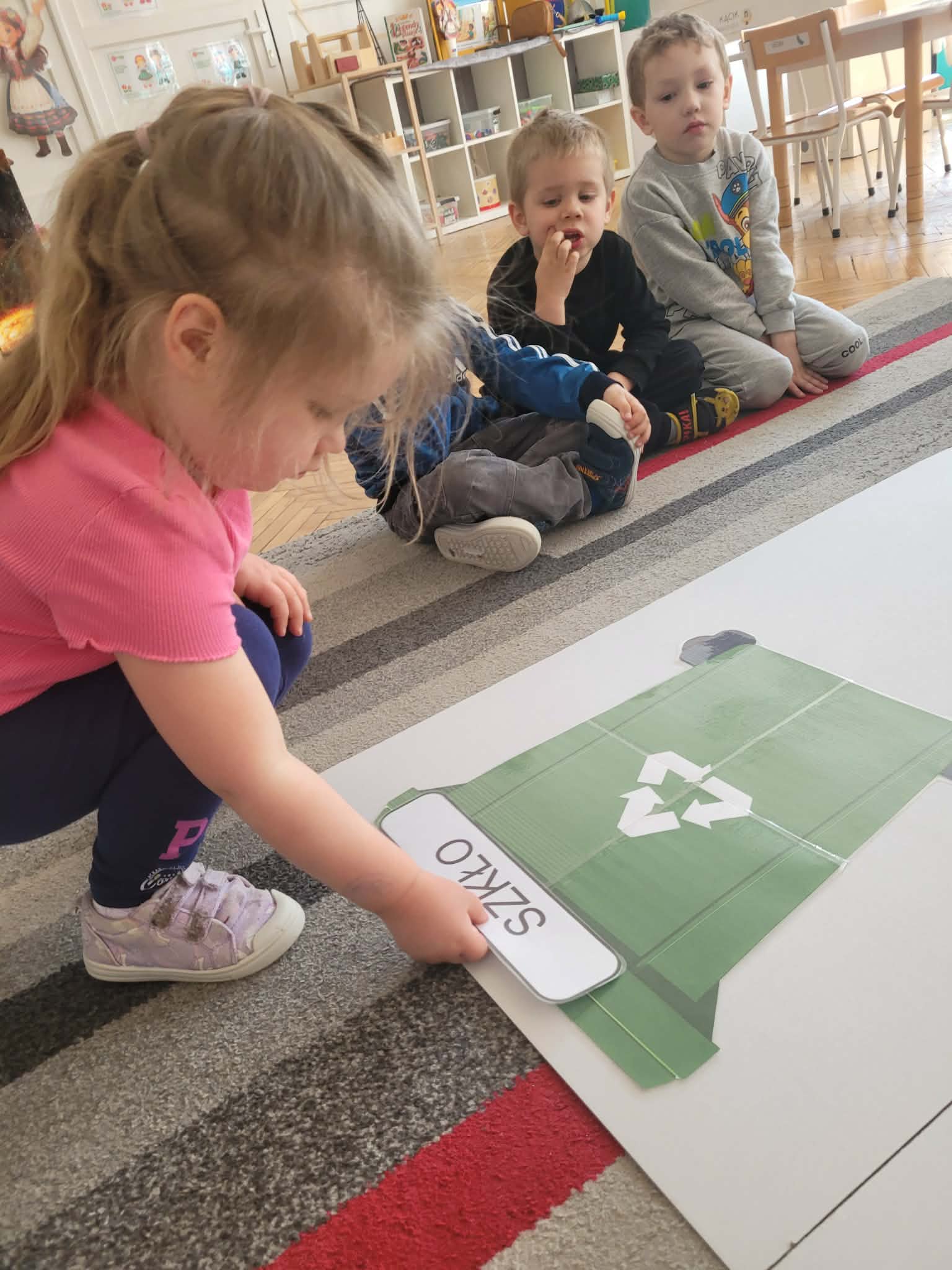 Recykling w przedszkolu to kluczowy element edukacji ekologicznej, uczący dzieci segregacji odpadów, dbania o środowisko oraz kreatywnego powtórnego wykorzystania materiałów. Dzieci rozpoznają kolorypojemników (niebieski – papier, żółty – plastik/metal, zielony – szkło) poprzez wrzucanie odpadków do odpowiednich koszy. Zajęcia dydaktyczne pokazują dzieciom, jak wygląda znak recyklingu i co oznacza. Dzieci wykonaly również kodeks małego ekologa oraz wykonały prace plastyczną "Czyste powietrze wokół nas"