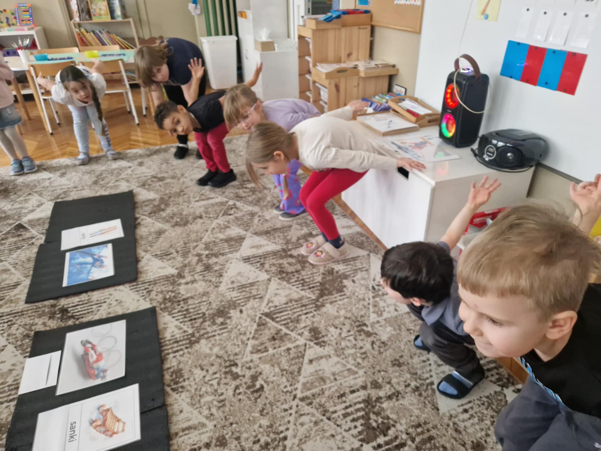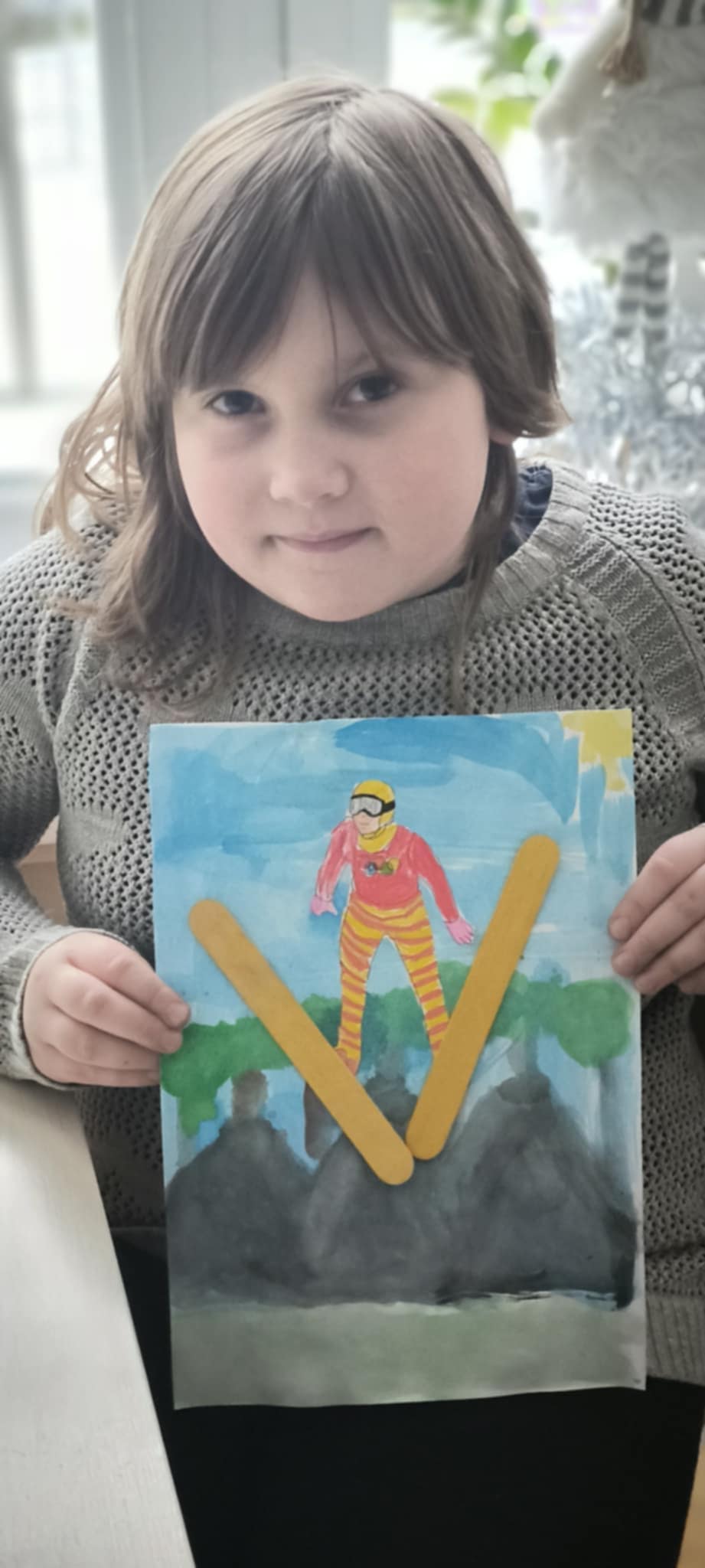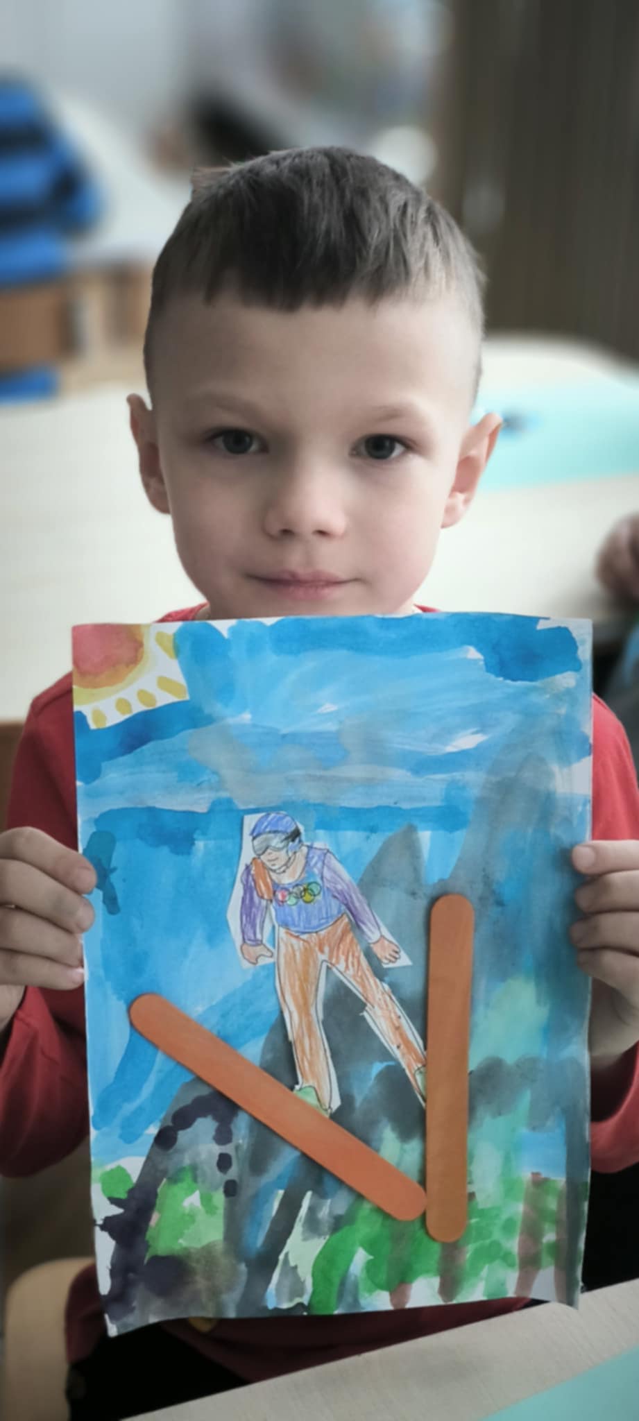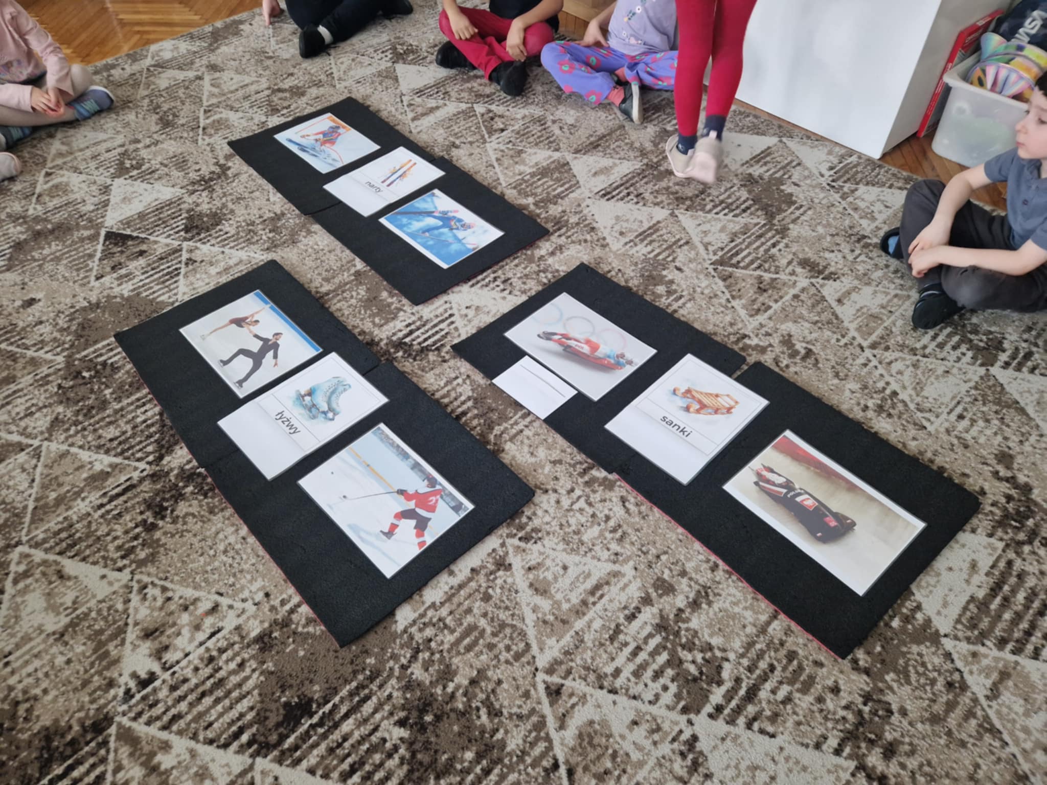 Dzieci z grupy 3 i 4 poznawały sporty zimowe, w których wykorzystywane są sanki, łyżwy i narty. Mówiliśmy o dyscyplinach sportowych takich jak saneczkarstwo, skoki narciarskie czy jazda figurowa na lodzie. Była zabawa w saneczki i skoczków narciarskich. Następnie dzieci wykonały pracę plastyczne utrwalając poznane sporty zimowe.